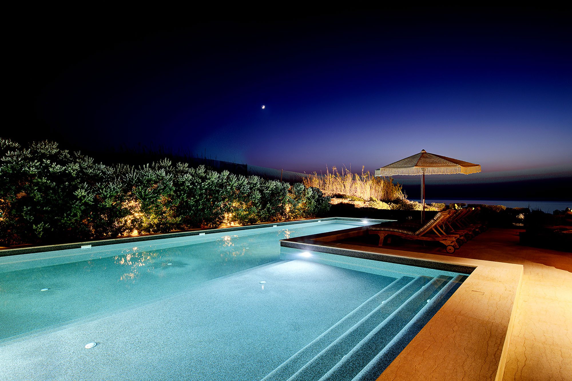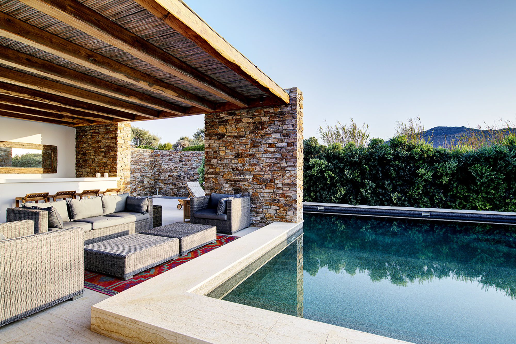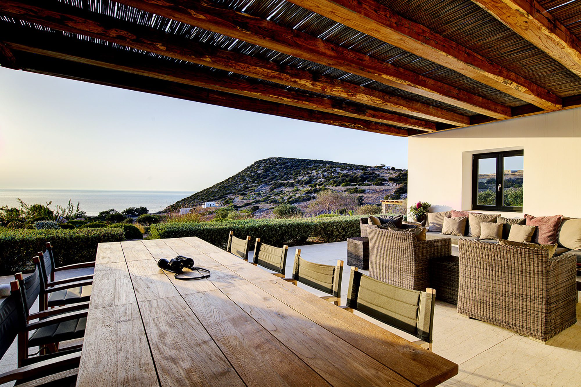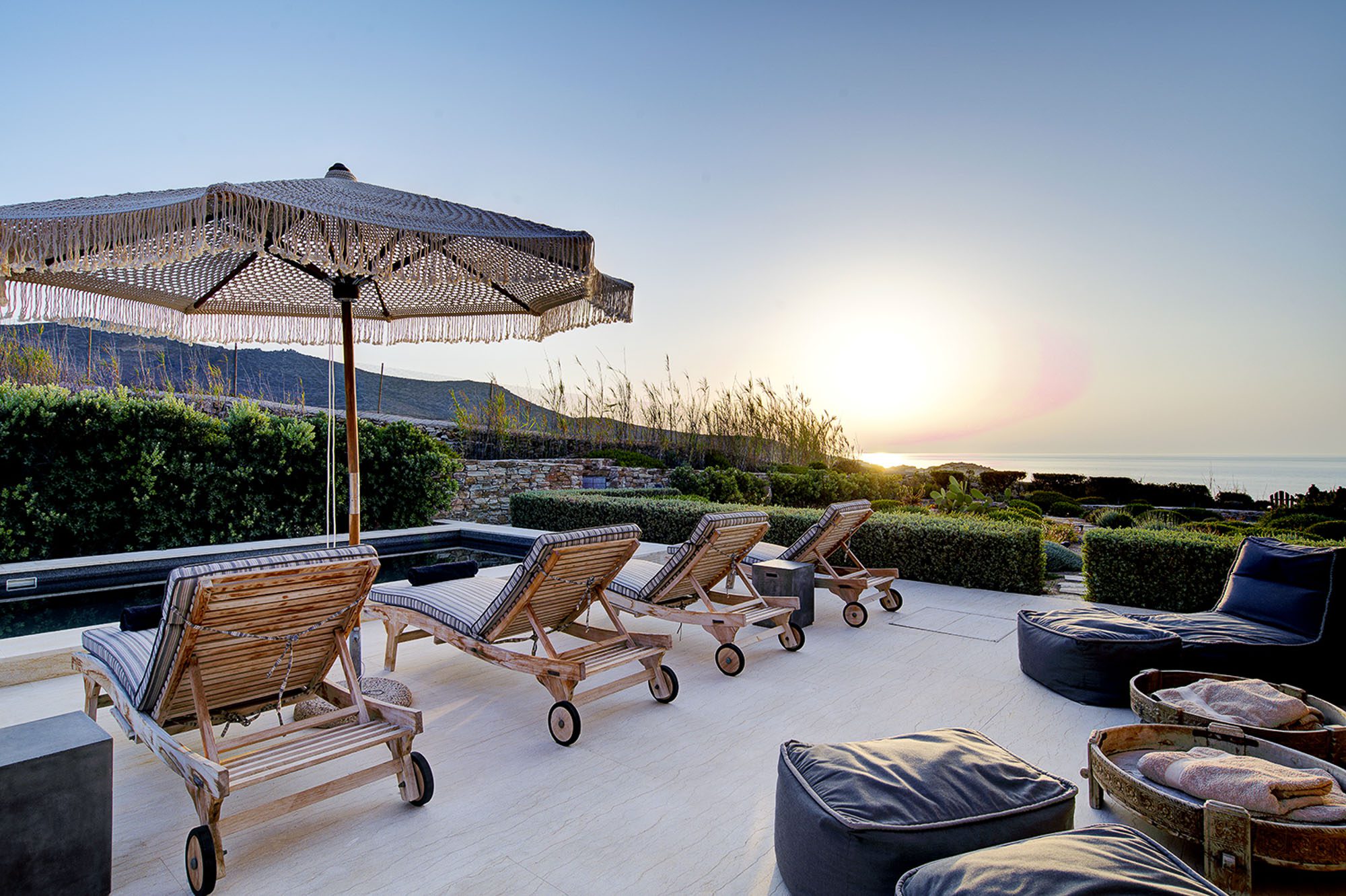 A large covered area provides shade for dining and sitting, with views out to sea and great sunsets. There are two further lounging areas with a variety of seating options, an outdoor bar and a barbecue. The pool with a view is wonderful and has underwater lighting for those evening dips.