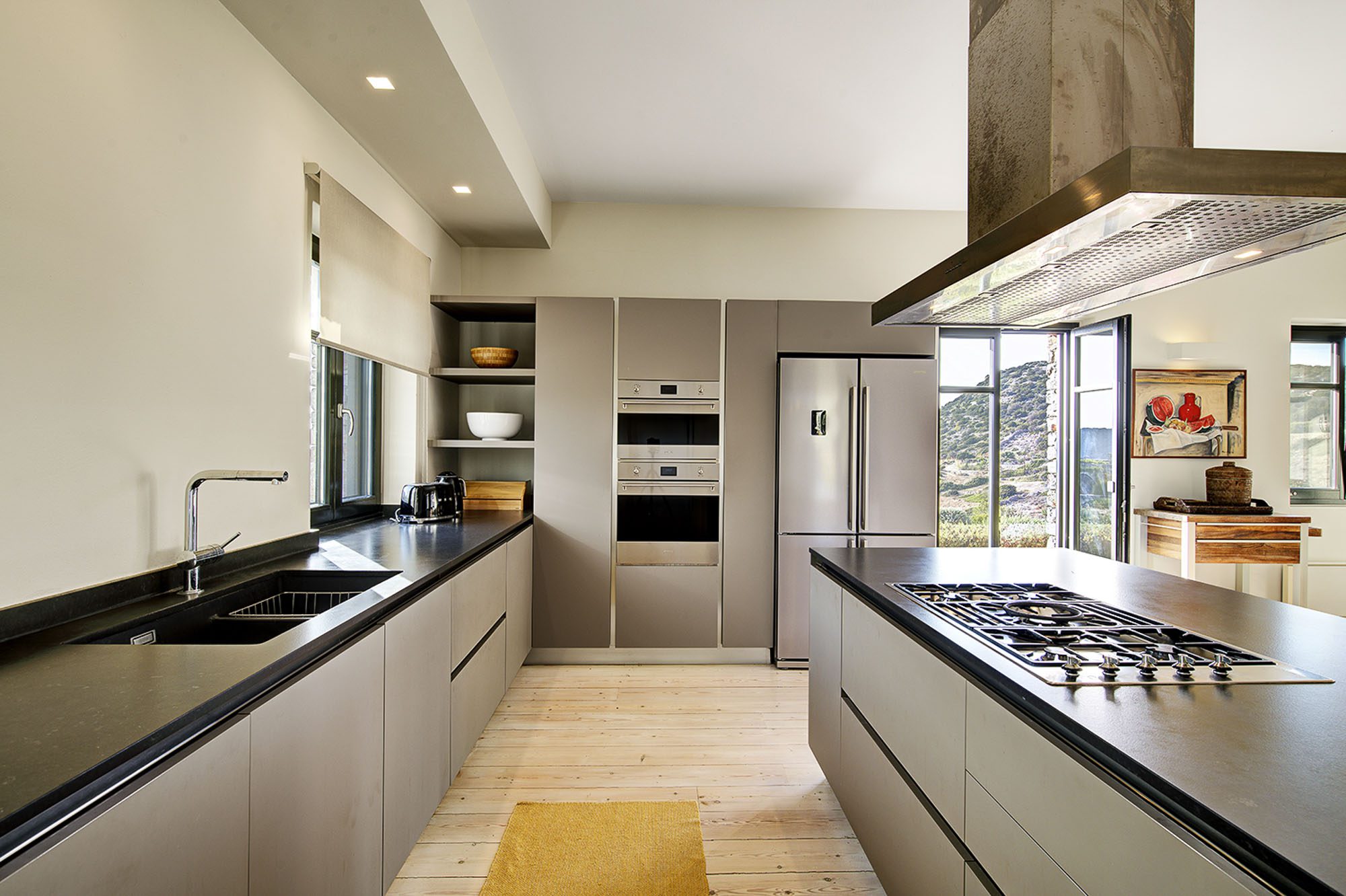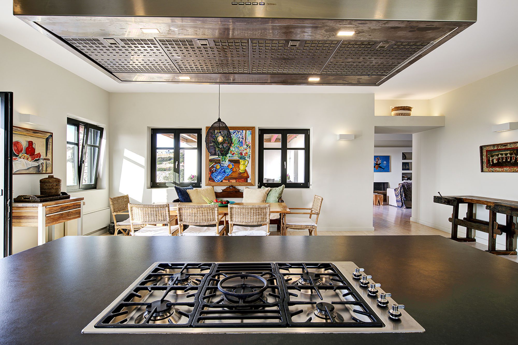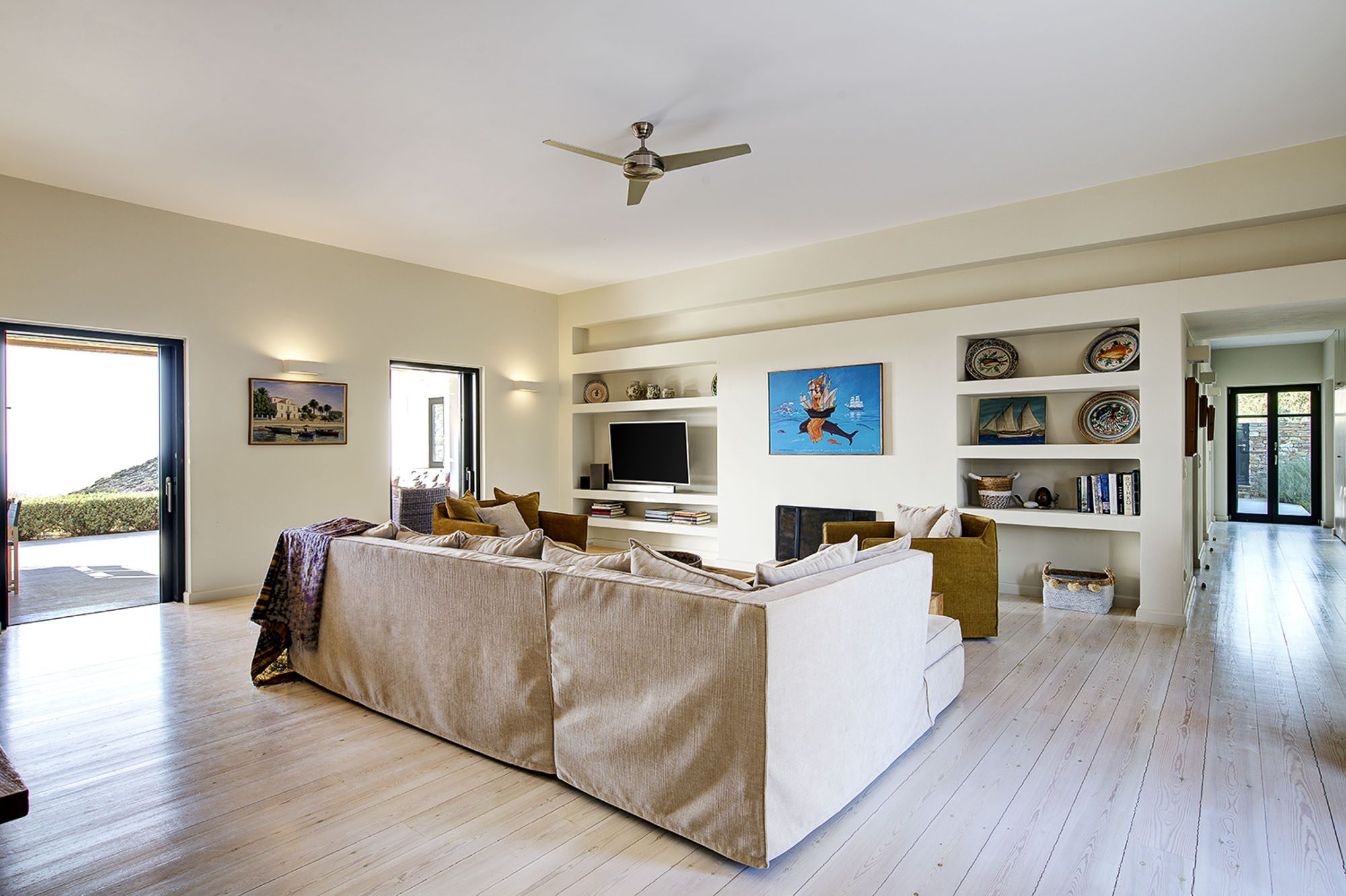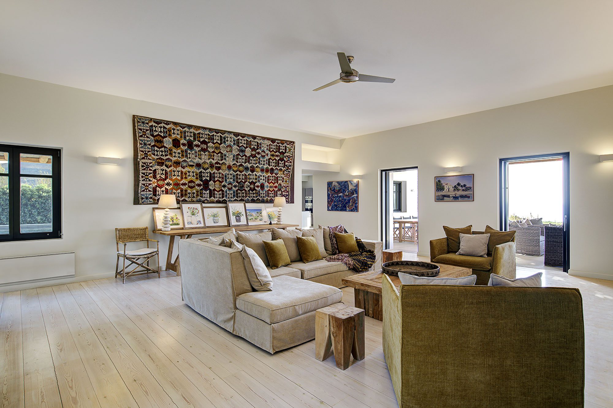 It's a great choice for a group of friends or a couple of families. Interiors have a relaxed, contemporary vibe with lots of artwork, set against a backdrop of pale walls and floors creating an atmosphere of space and light. There's a well-equipped modern kitchen and large dining and living space with views of the sea.