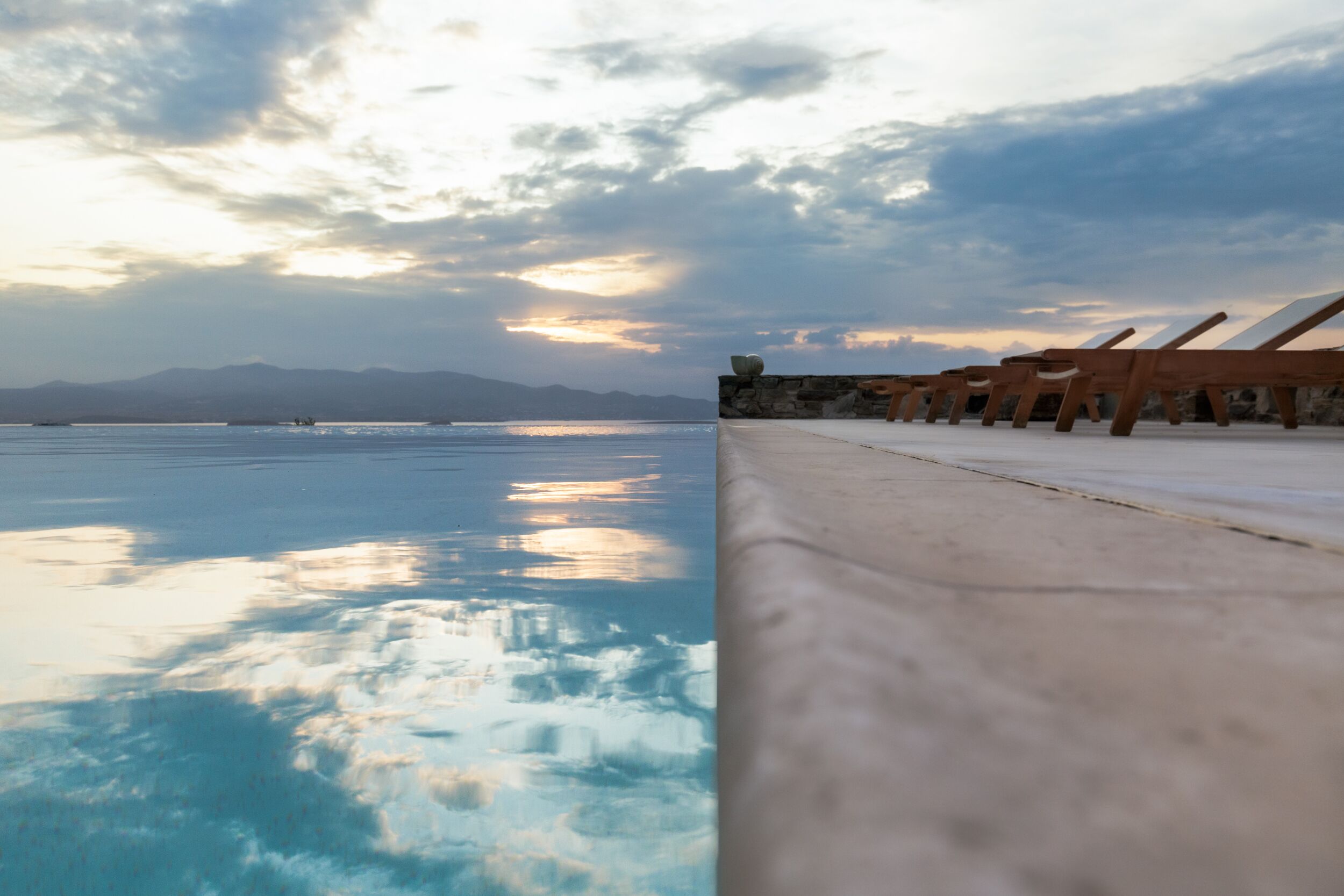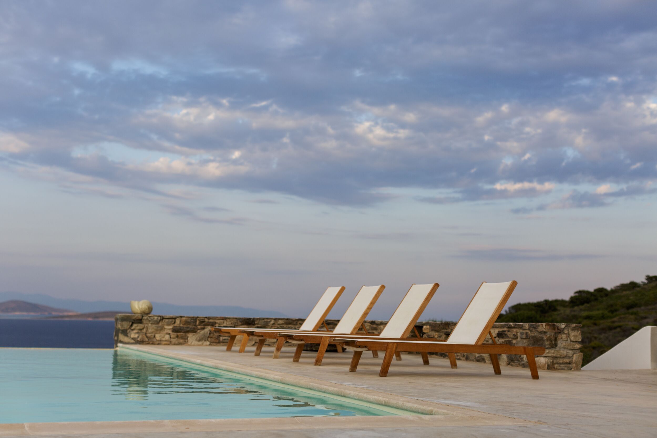 Outdoor sofas, armchairs, and eating spots are spaced around the terrace under pergolas. Adjacent to the main house, there’s a 75-meter seawater swimming pool surrounded by an anti-slip marble surface and plenty of sunbeds for relaxing and taking in the vista.