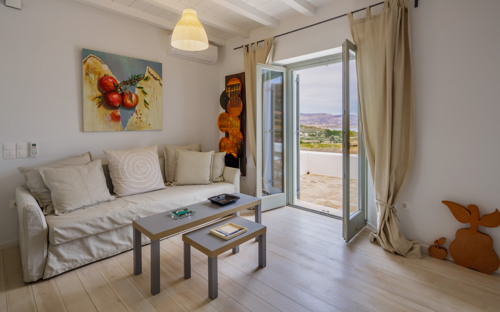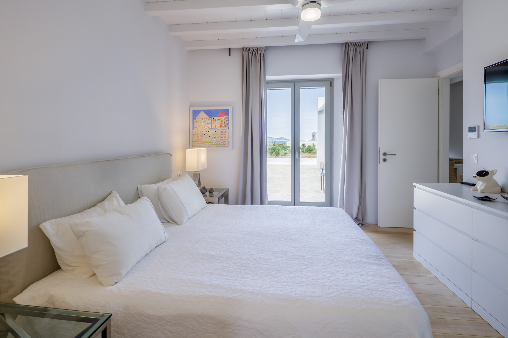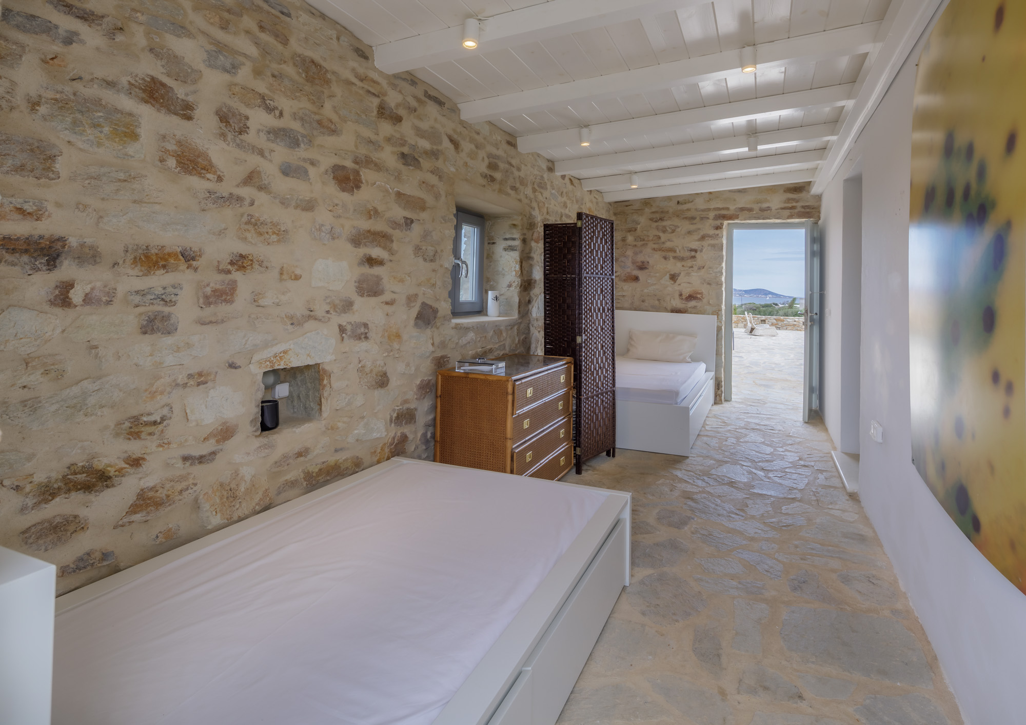 The closest beach on the eastern coast, Glyfa, is just 900m away, with crystal-clear waters and rugged, rocky hills all around, a wonderfully peaceful spot. The nearest taverna, Taverna Peramataki, is a short drive away near Soros beach. The busier port town of Antiparos is 4.5km away, just 10 minutes by car, offering a selection of eateries, a small marketplace, and a regular ferry service in the summer months to the nearby island of Paros.