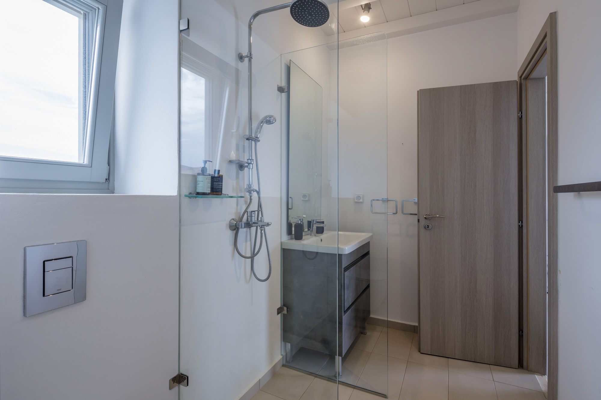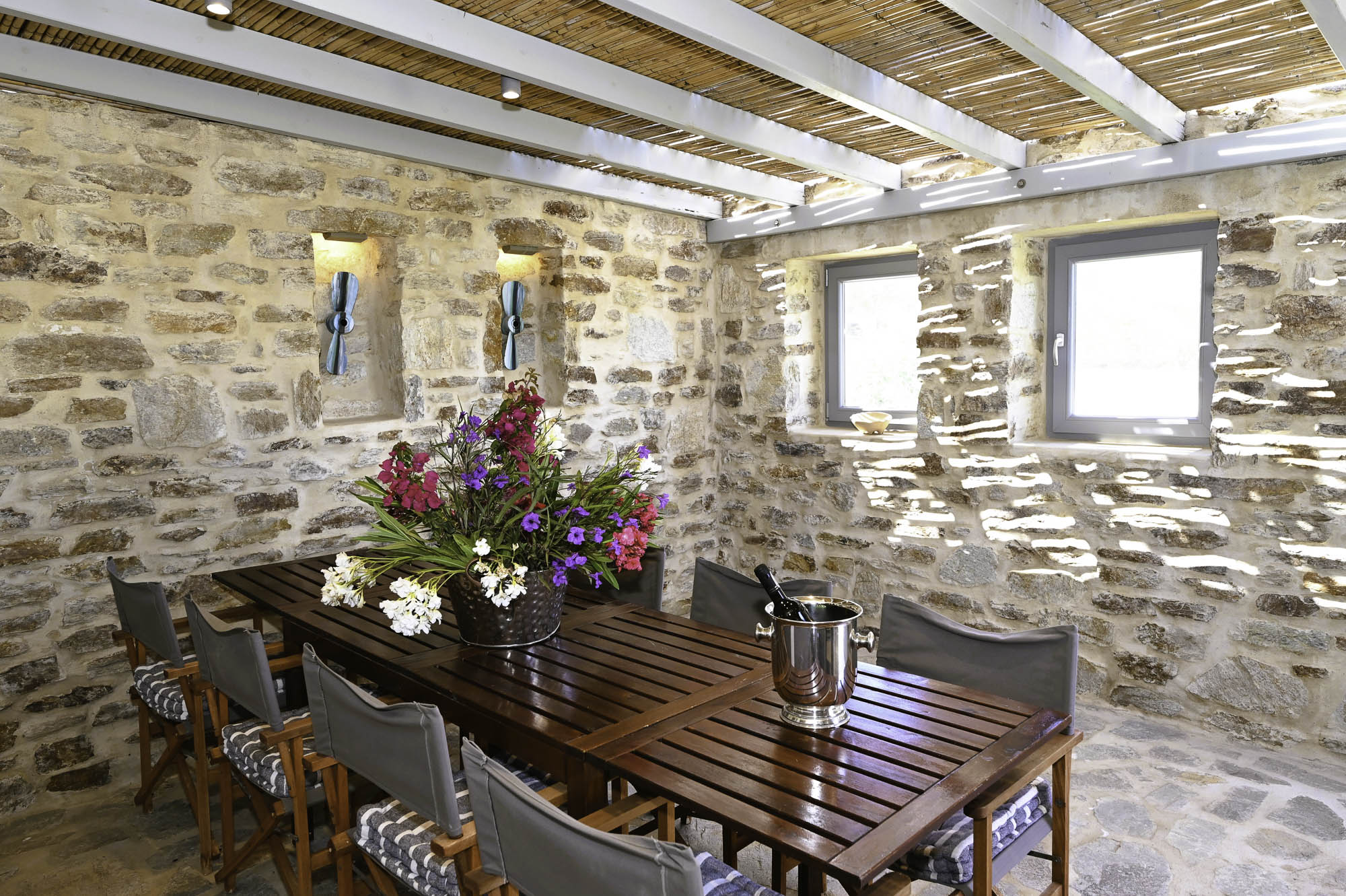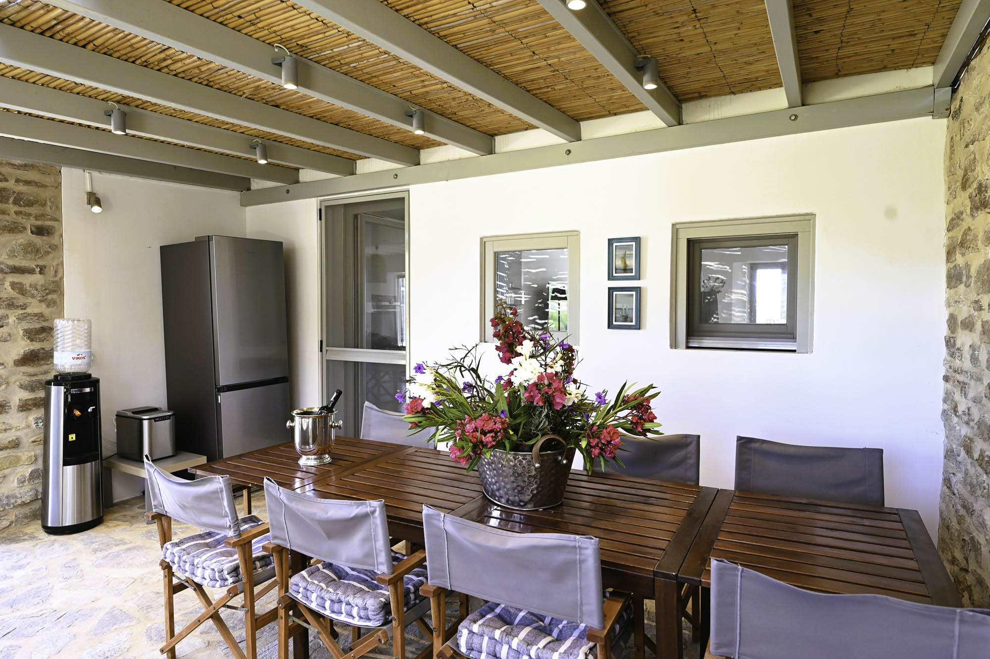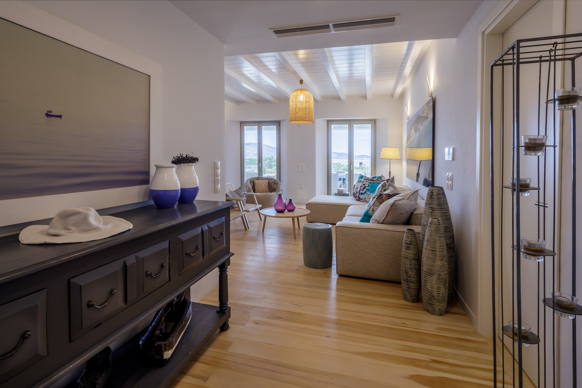 The closest beach on the eastern coast, Glyfa, is just 900m away, with crystal-clear waters and rugged, rocky hills all around, a wonderfully peaceful spot. The nearest taverna, Taverna Peramataki, is a short drive away near Soros beach. The busier port town of Antiparos is 4.5km away, just 10 minutes by car, offering a selection of eateries, a small marketplace, and a regular ferry service in the summer months to the nearby island of Paros.