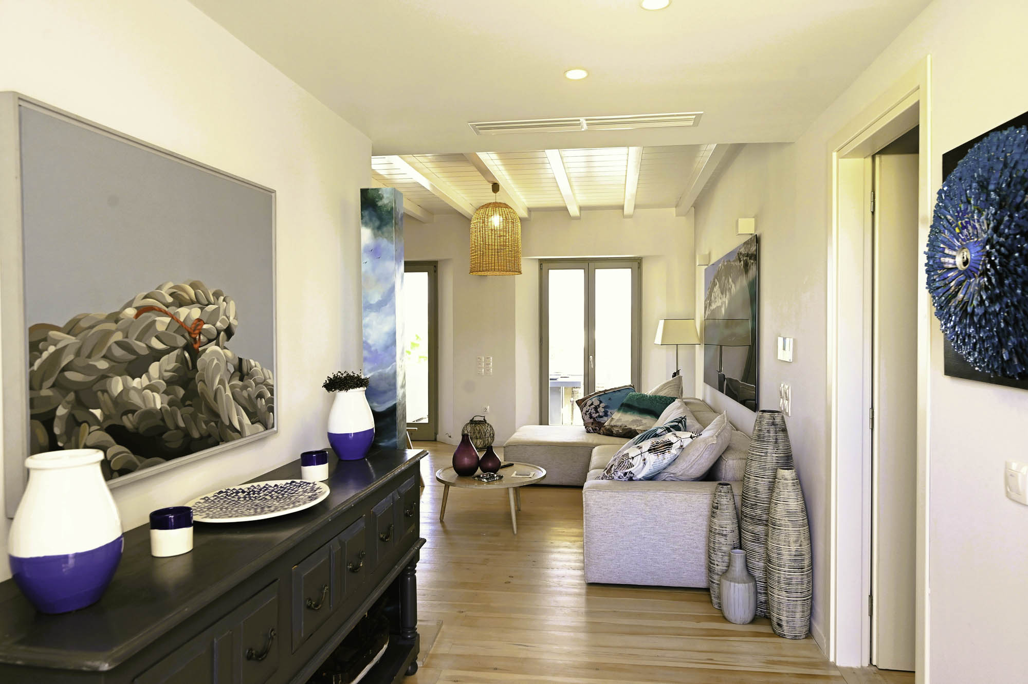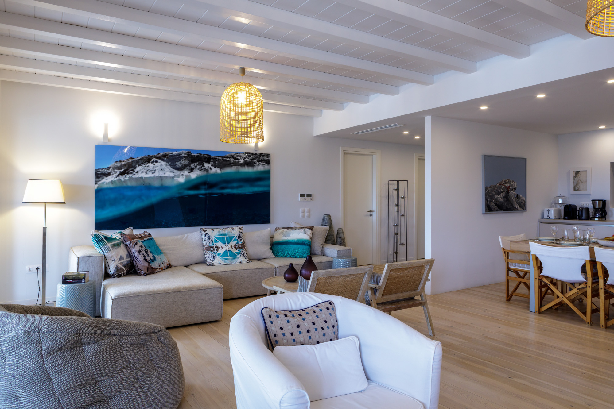There is ample space for up to ten guests in four beautifully imagined bedrooms, one of which has its own sitting room with a fold-out sofa bed, kitchen and balcony. Each room is decorated with a piece of local artwork, breathing colour into an otherwise neutral space. The bedrooms are all ensuite and equipped with a television, air conditioning, and a silent ceiling fan. There is a large, open-plan living and dining area with a variety of seating choices and floor-to-ceiling windows that bathe the space in sunshine.