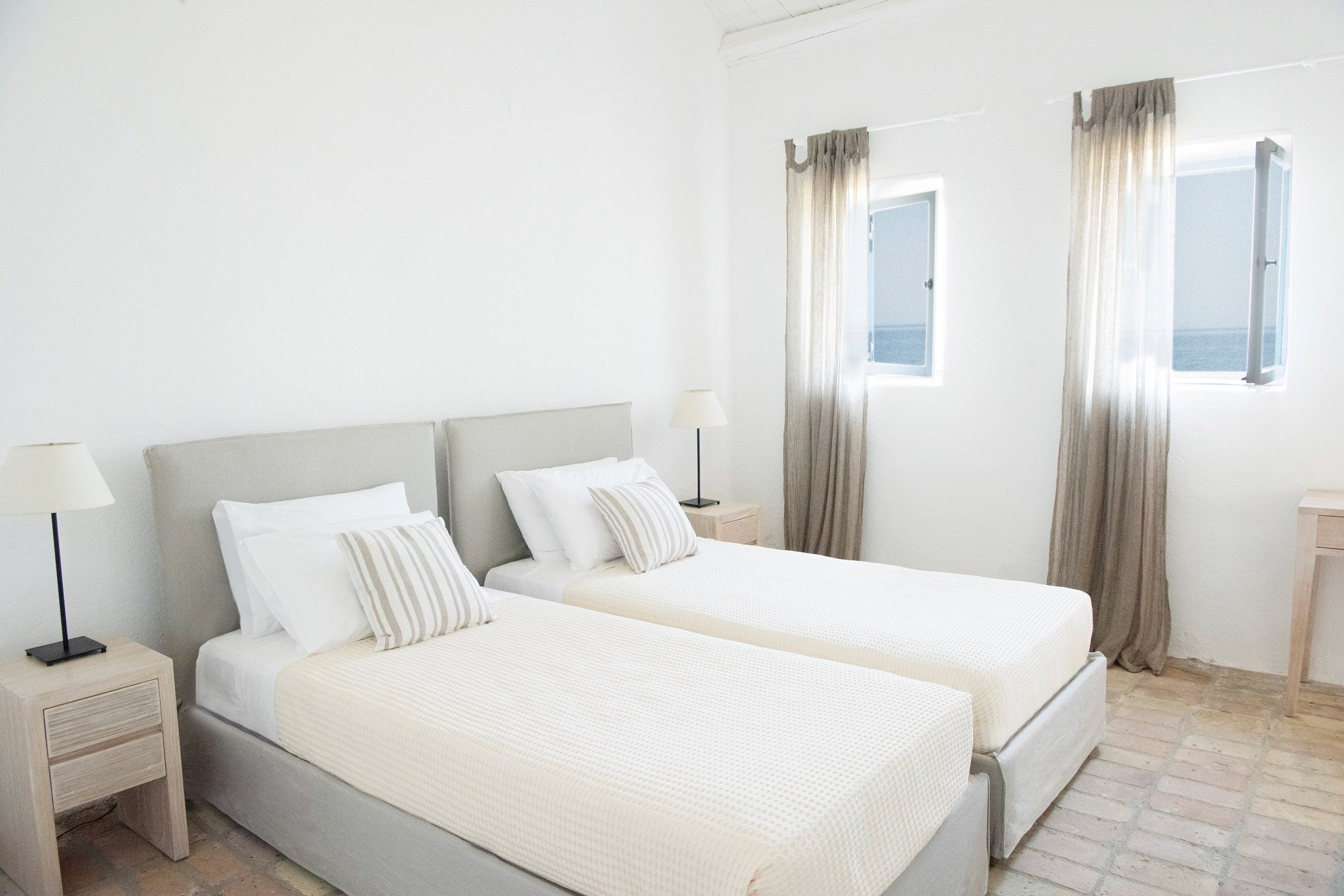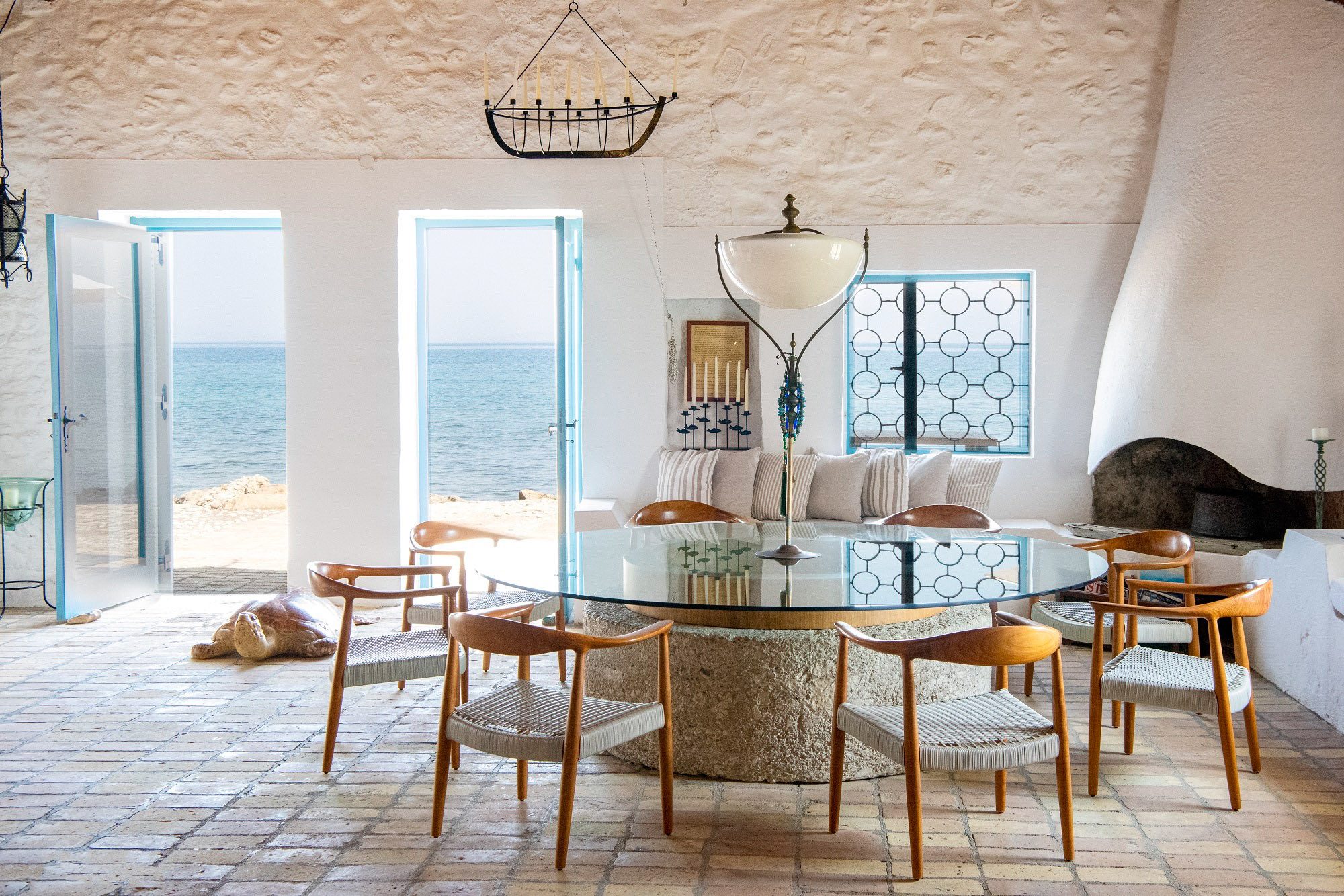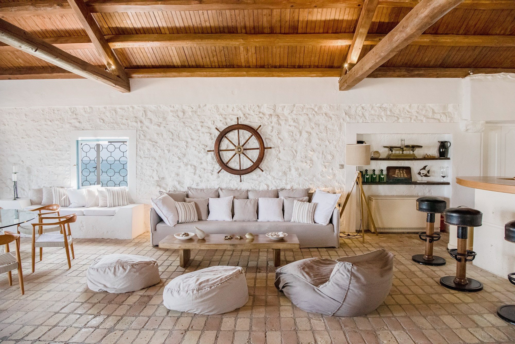 The interiors are furnished in a traditional coastal style, blending natural materials, neutral colours and fresh sea blues throughout, complementing the surrounding seascape vistas. There’s an incredible circular dining table made from an original grinding stone topped with a sheet of glass, a bar, rustic brick flooring and both indoor and outdoor home cinema.
