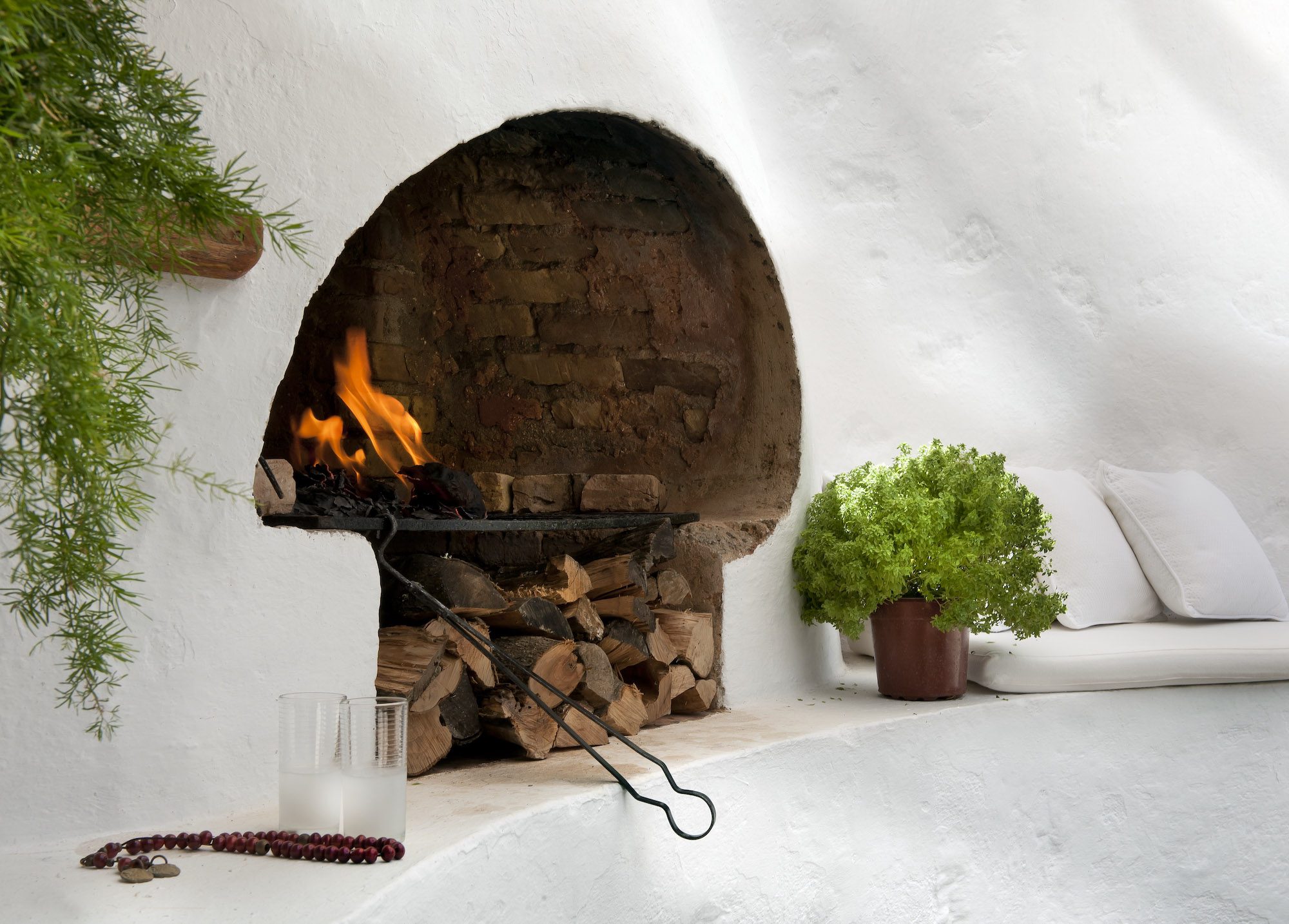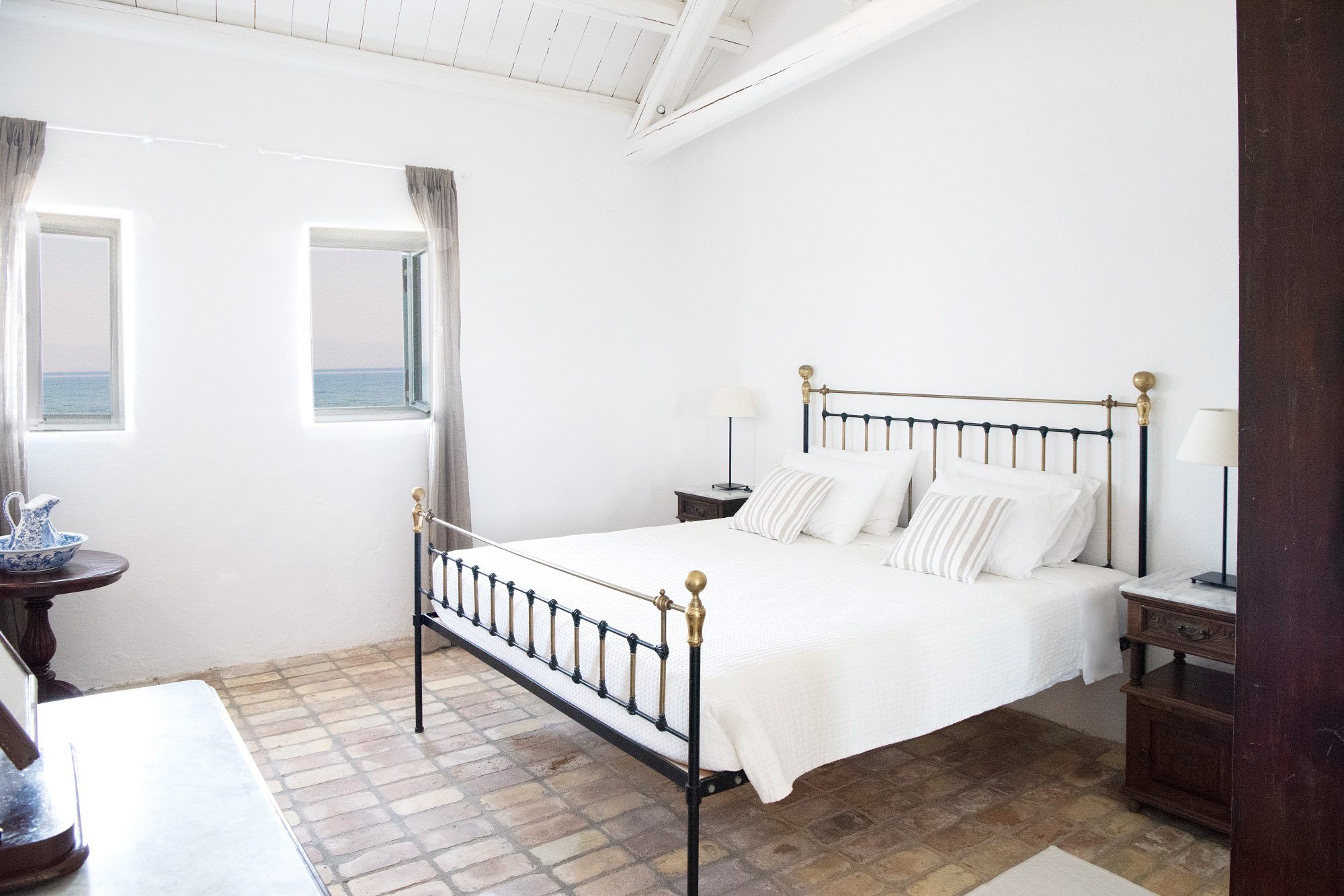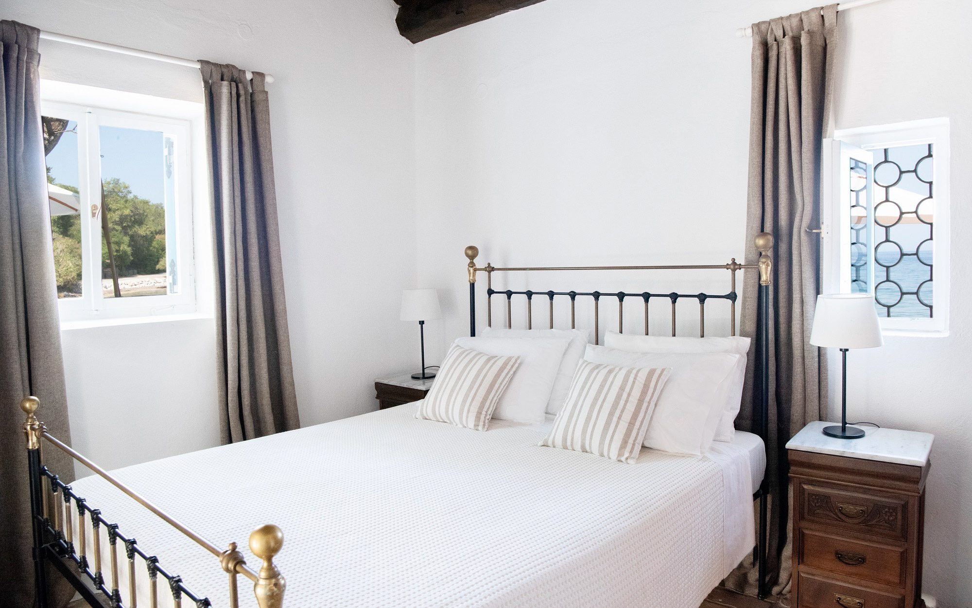 The interiors are furnished in a traditional coastal style, blending natural materials, neutral colours and fresh sea blues throughout, complementing the surrounding seascape vistas. There’s an incredible circular dining table made from an original grinding stone topped with a sheet of glass, a bar, rustic brick flooring and both indoor and outdoor home cinema.
