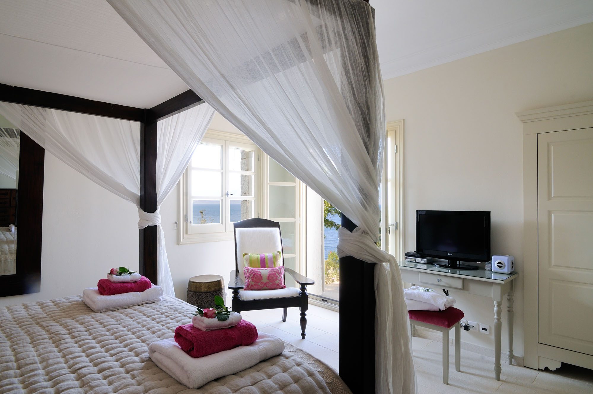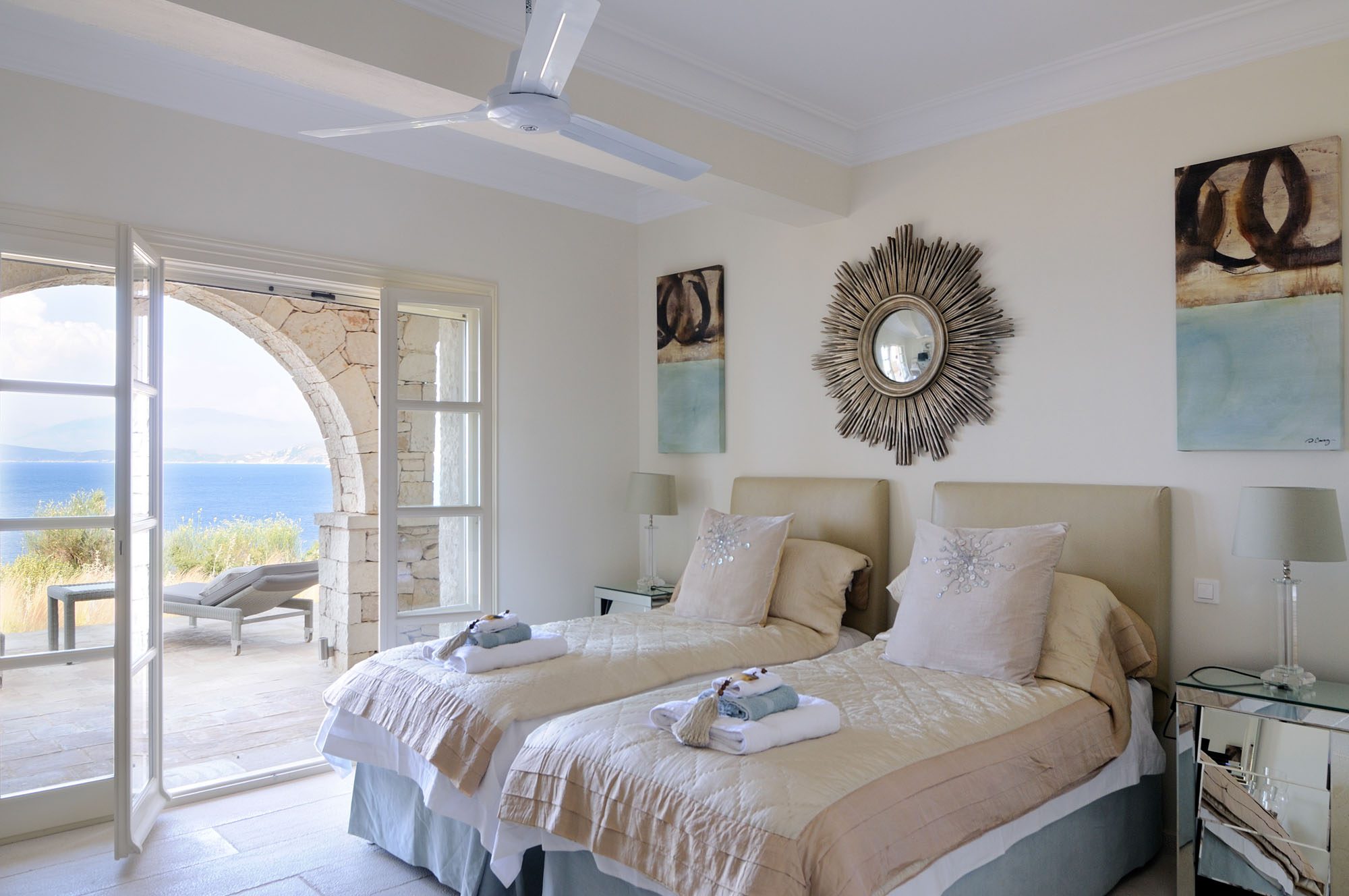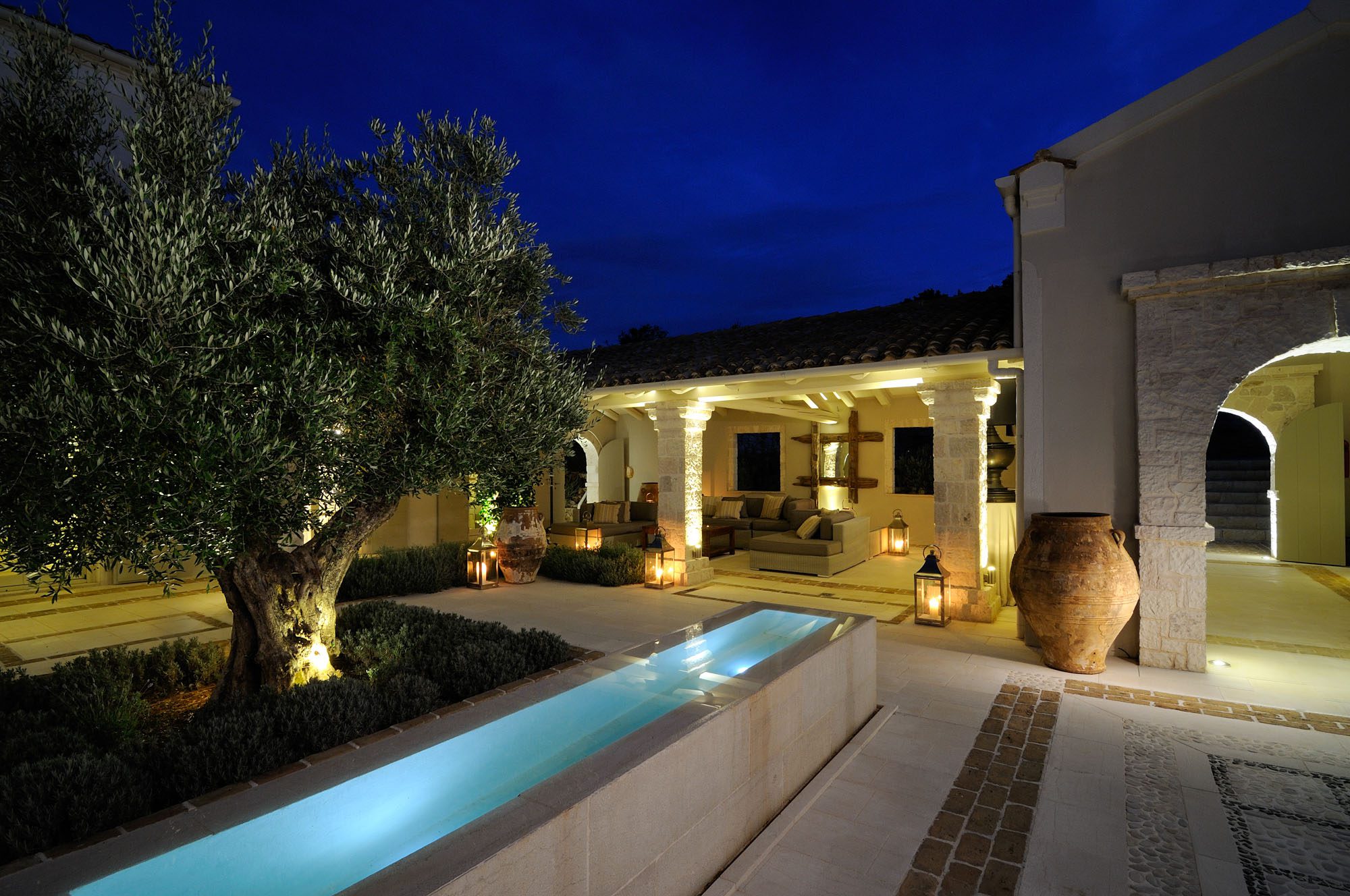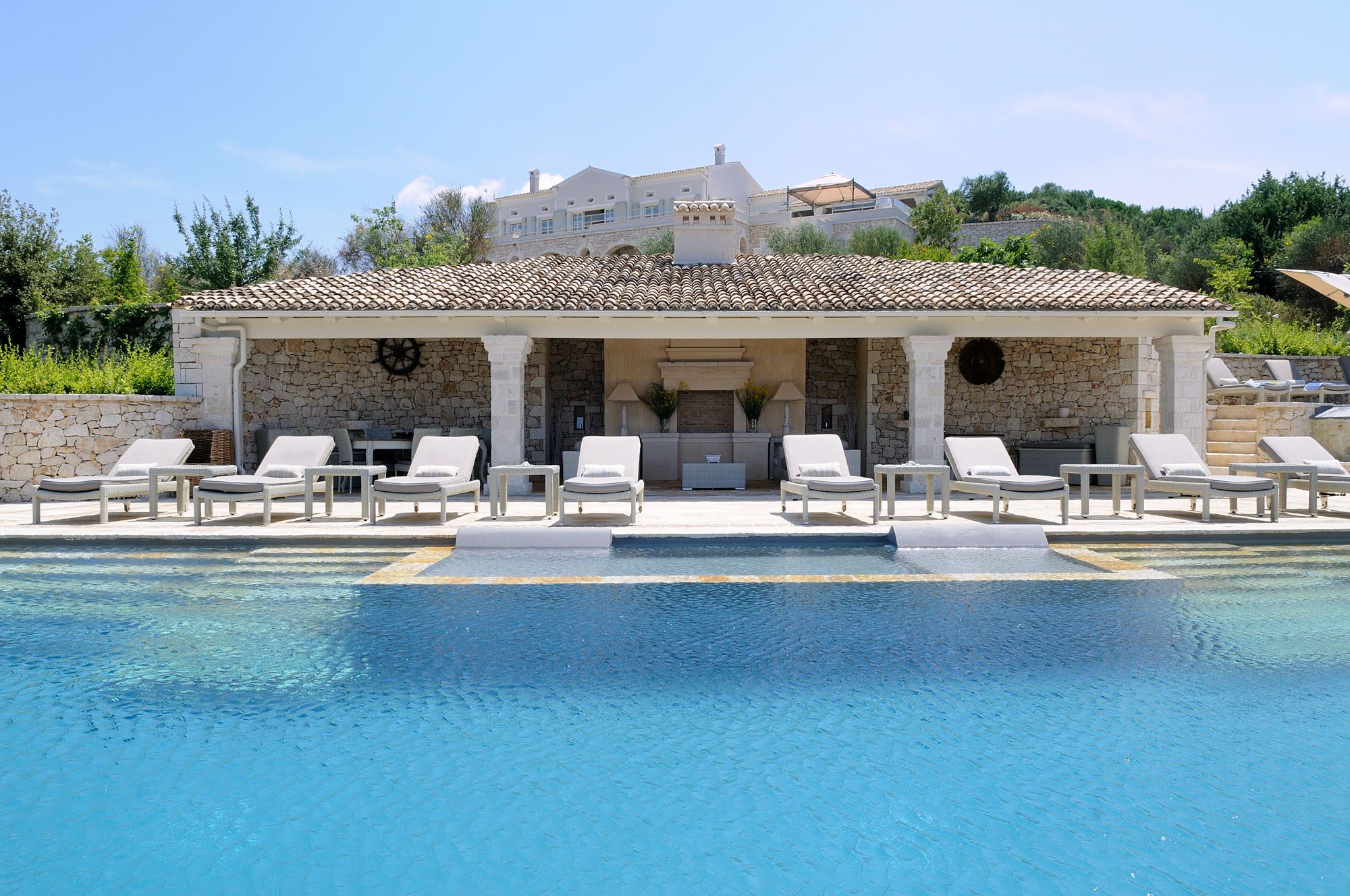 The bedrooms are spread over two floors, with the master suite having a private terrace. The large, open-plan sitting room has stone floors, open stone Corfiot fireplaces at either end, comfortable white sofas, and nine sets of French doors to maximise light. There's also a cinema room, a small gym, table tennis, and a sauna.