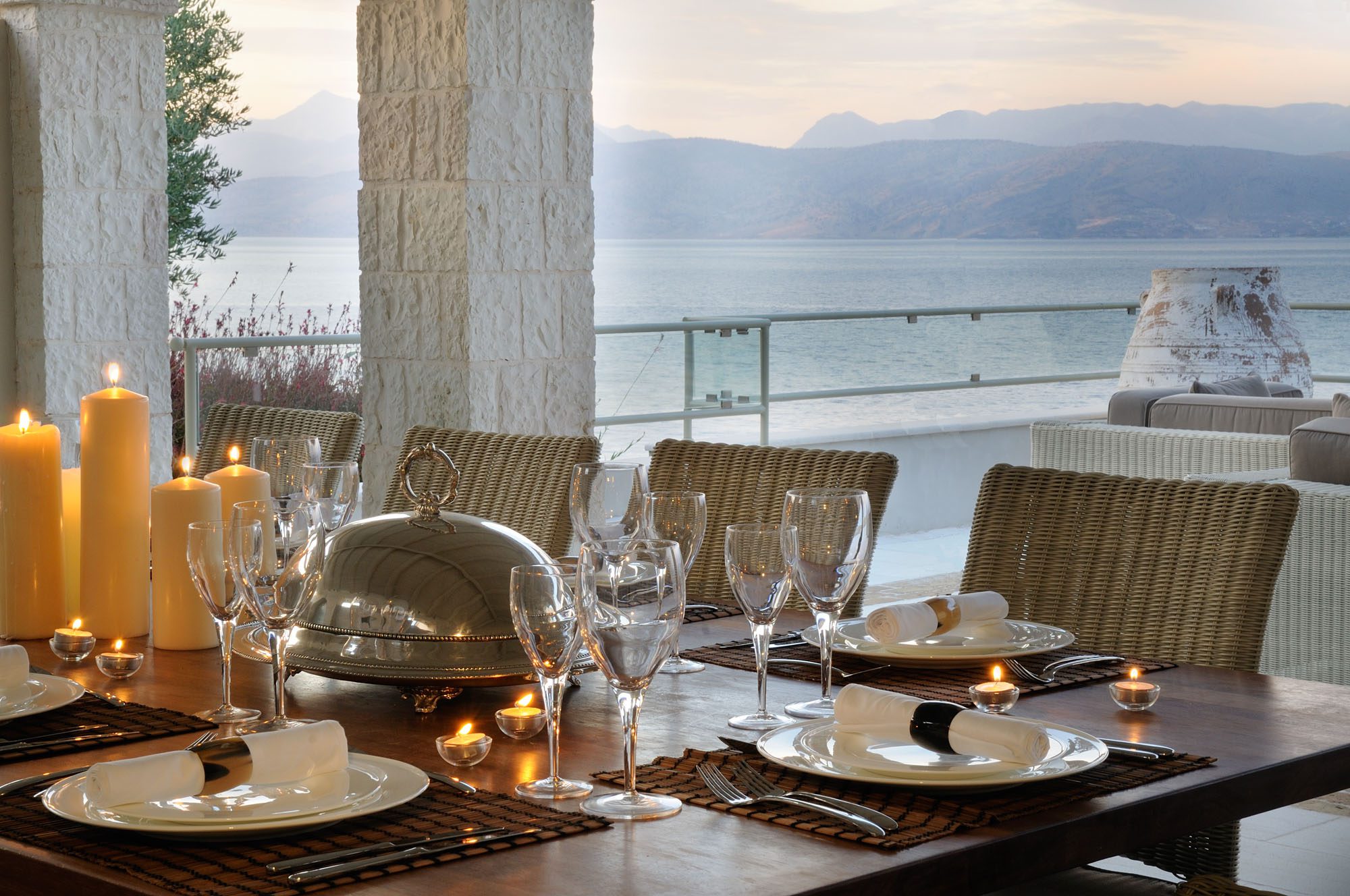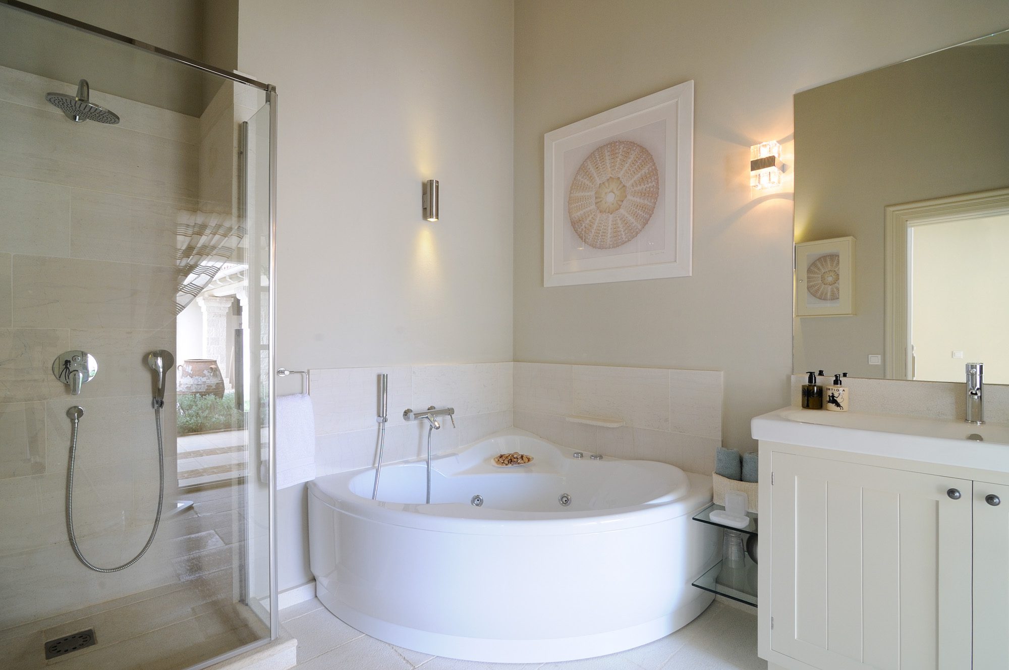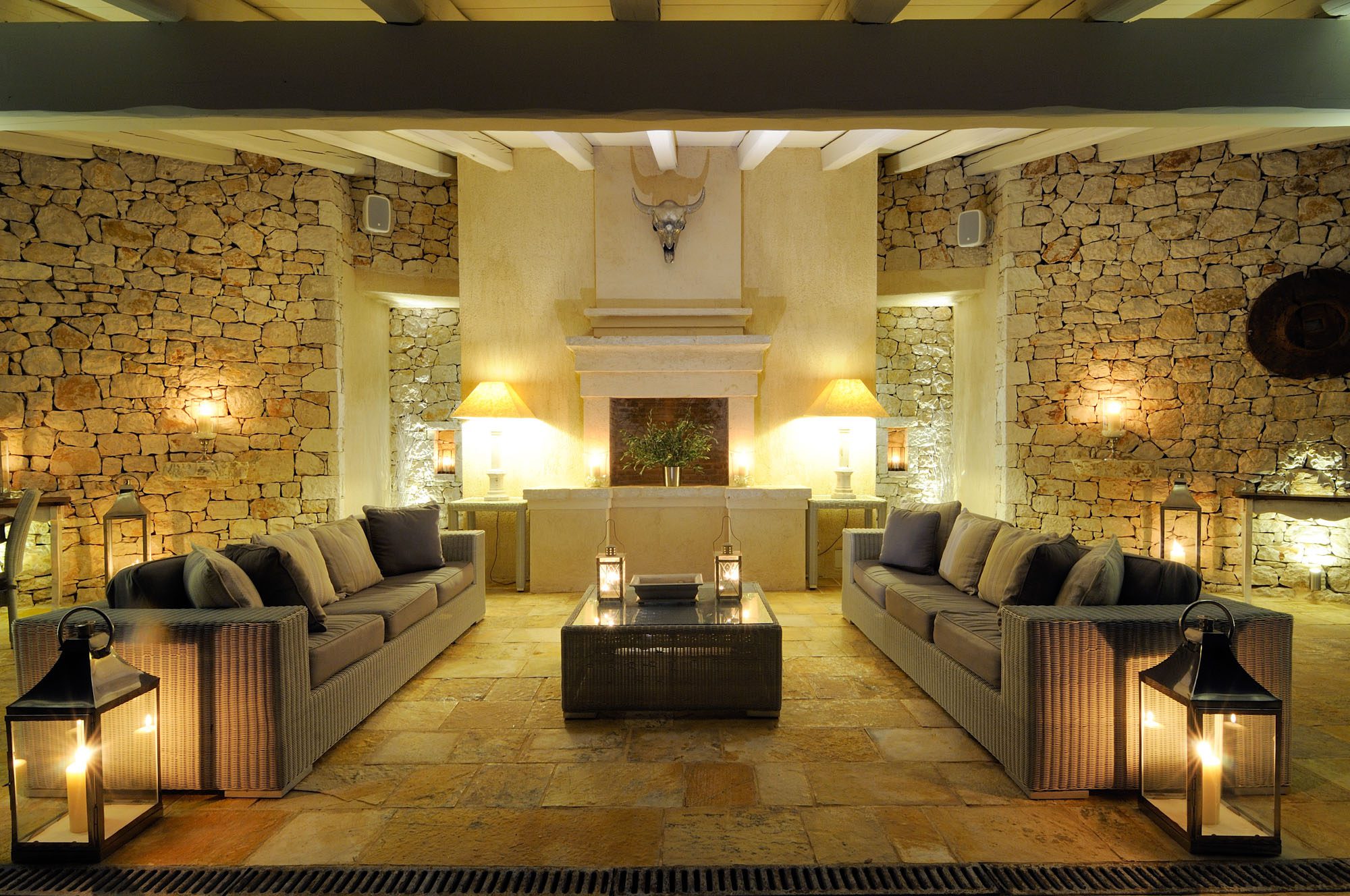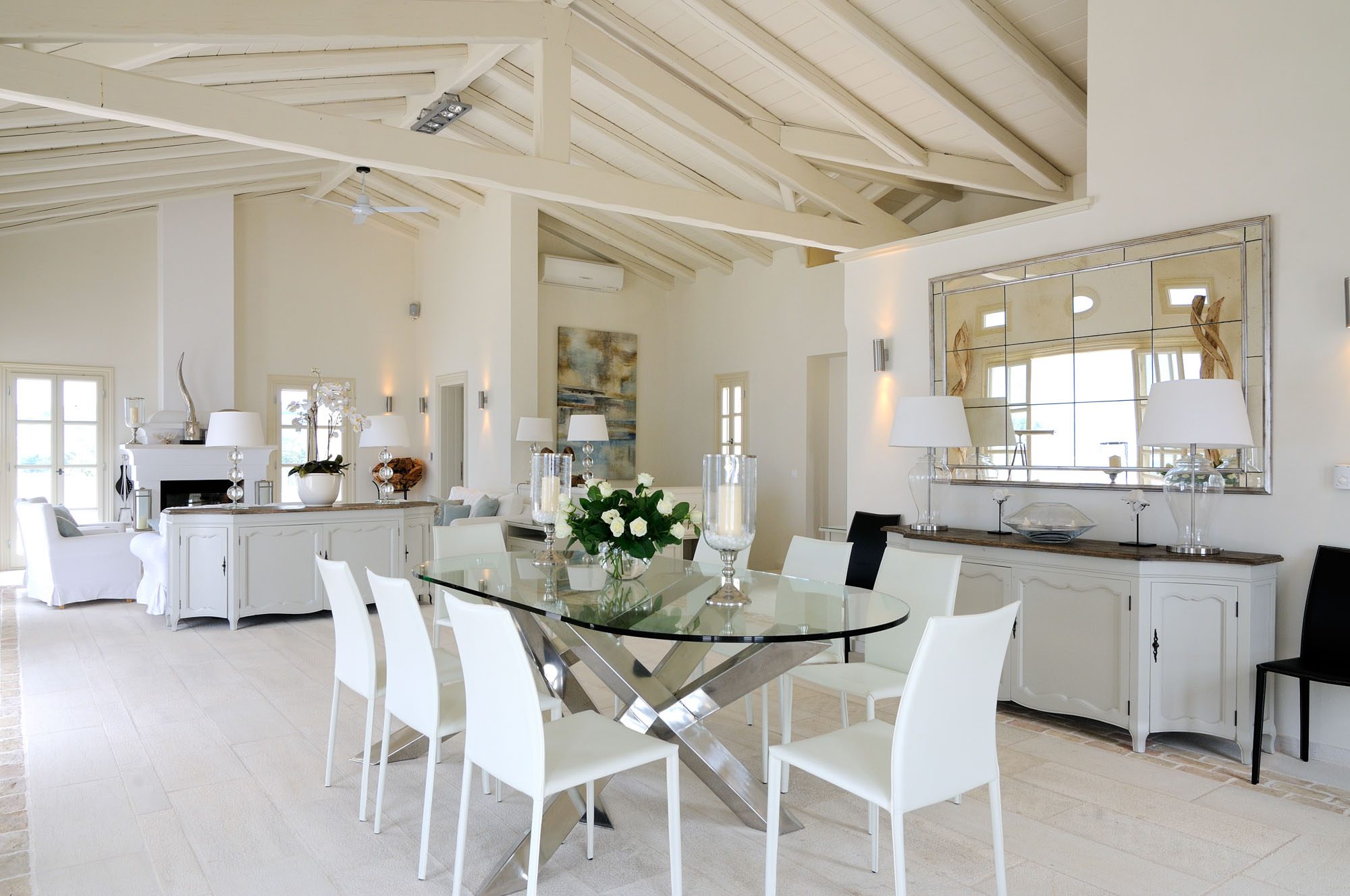 The bedrooms are spread over two floors, with the master suite having a private terrace. The large, open-plan sitting room has stone floors, open stone Corfiot fireplaces at either end, comfortable white sofas, and nine sets of French doors to maximise light. There's also a cinema room, a small gym, table tennis, and a sauna.