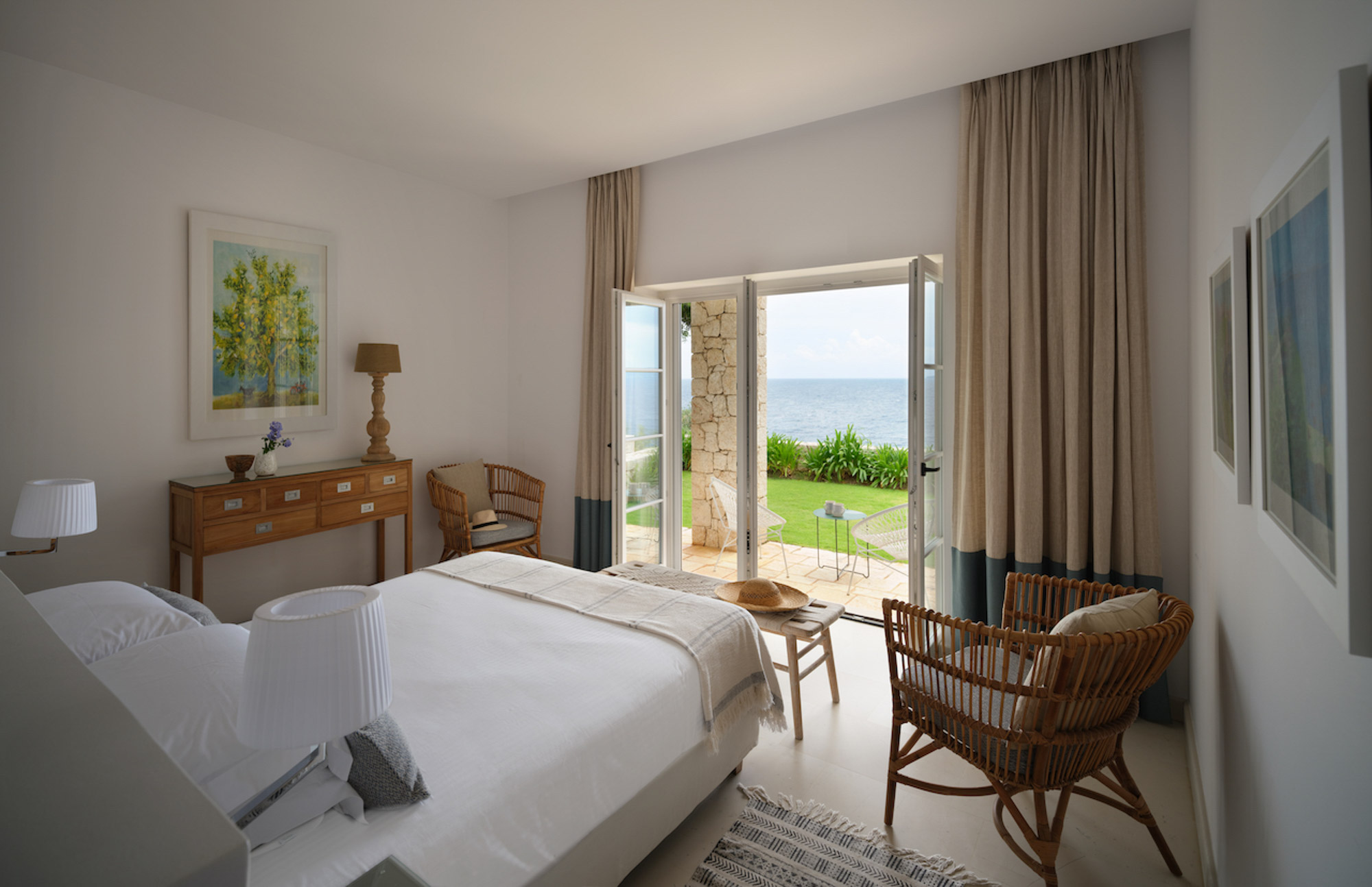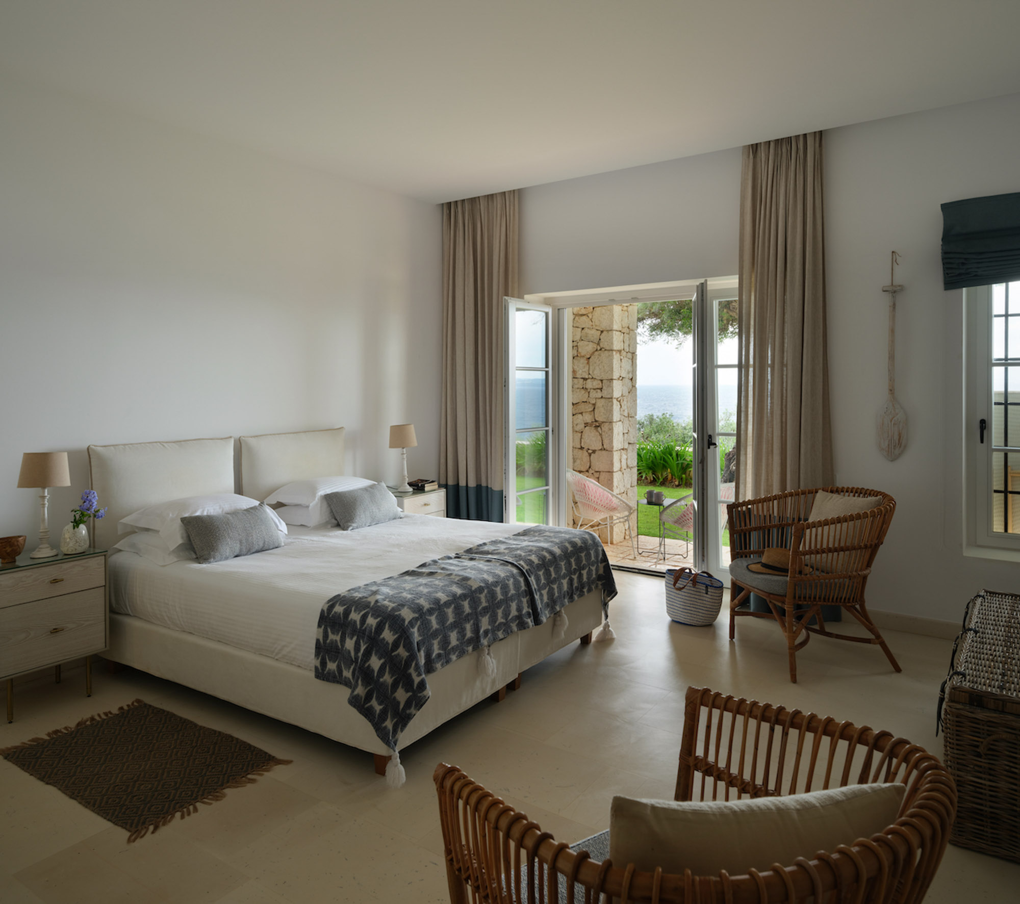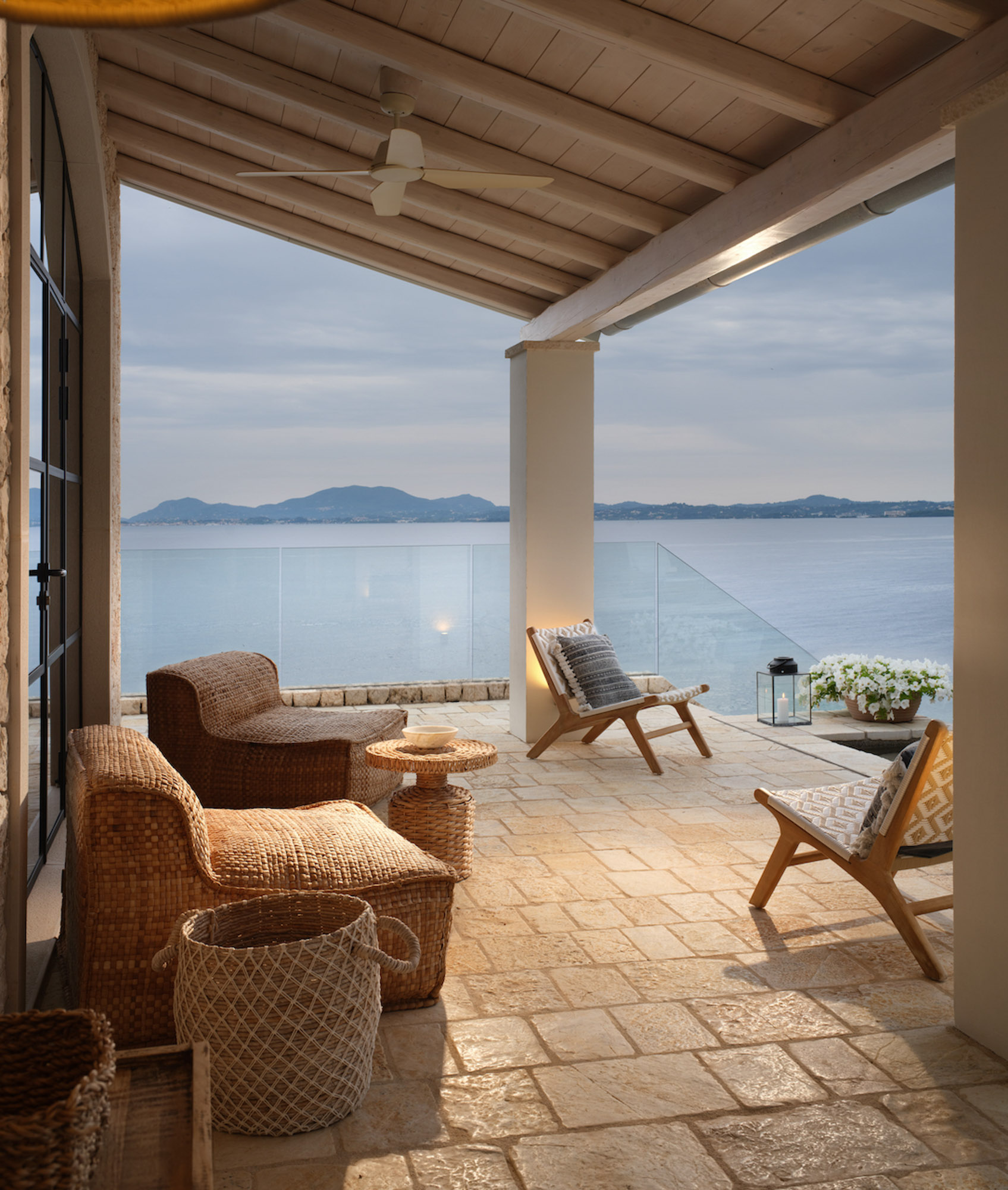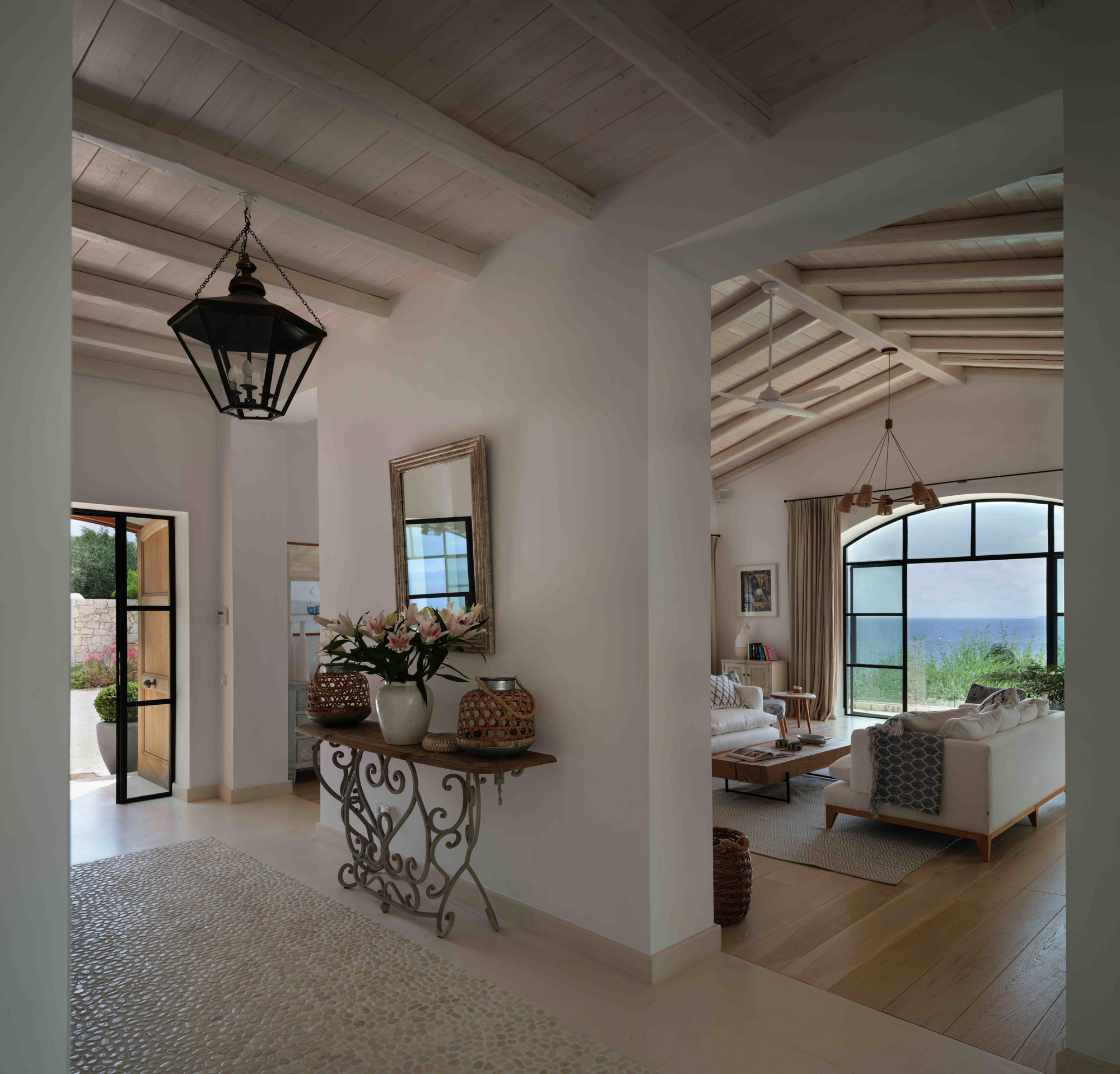 The master suite, occupying the entire first floor, boasts a balcony and a private terrace with an outdoor shower. The spacious living area has glass doors opening onto the pool terrace with glorious views of the Ionian Sea. The designer has used a palette of cool, fresh, neutral colours throughout, with a splash of traditional blue both inside and out to create a contemporary aesthetic whilst retaining the Greek atmosphere.
