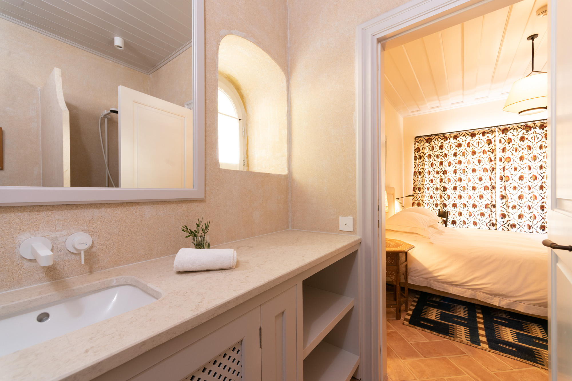Pale walls set off interesting pieces of furniture and decorative art, creating a tapestry of texture and pattern with a fresh, contemporary feel. A bright, modern kitchen has a double-height ceiling, walls adorned with colourful prints, and an airy indoor dining space. The large open-plan sitting room, with an open fireplace and eclectic mix of seating, has doors to the garden and terrace. The en-suite bedrooms are all air-conditioned and have access to the terrace. The beds are dressed in crisp white bed linen and beautiful fabric-covered headboards.