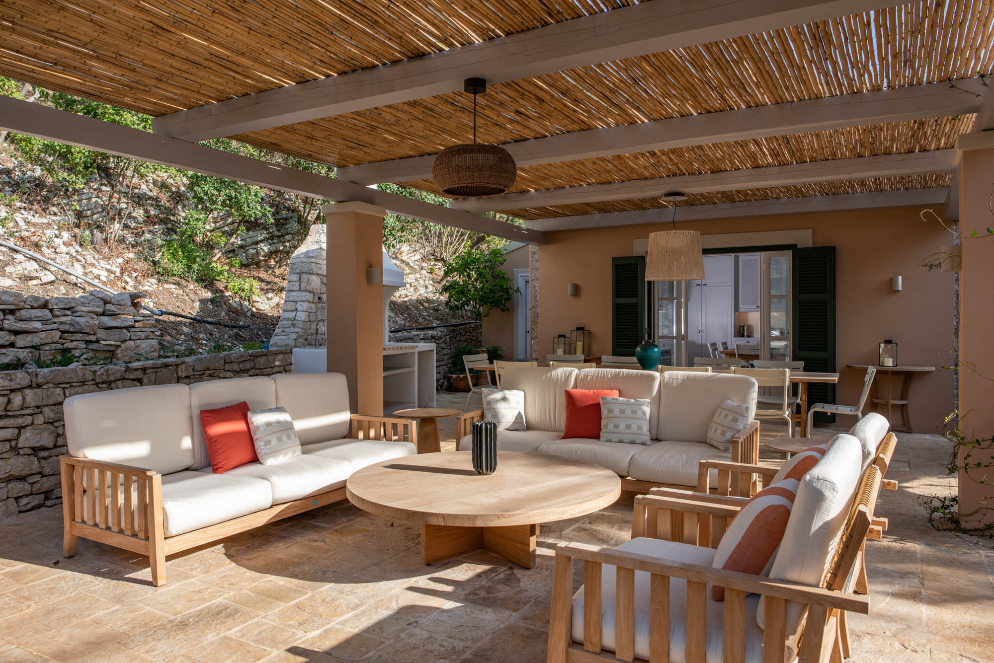 It houses an al fresco dining area and an outdoor lounge with a built-in coal BBQ. There’s plenty of outdoor space to set sunloungers in sun or shade, and this year, guests can cool off in the infinity pool, which has been raised so guests can enjoy the view.