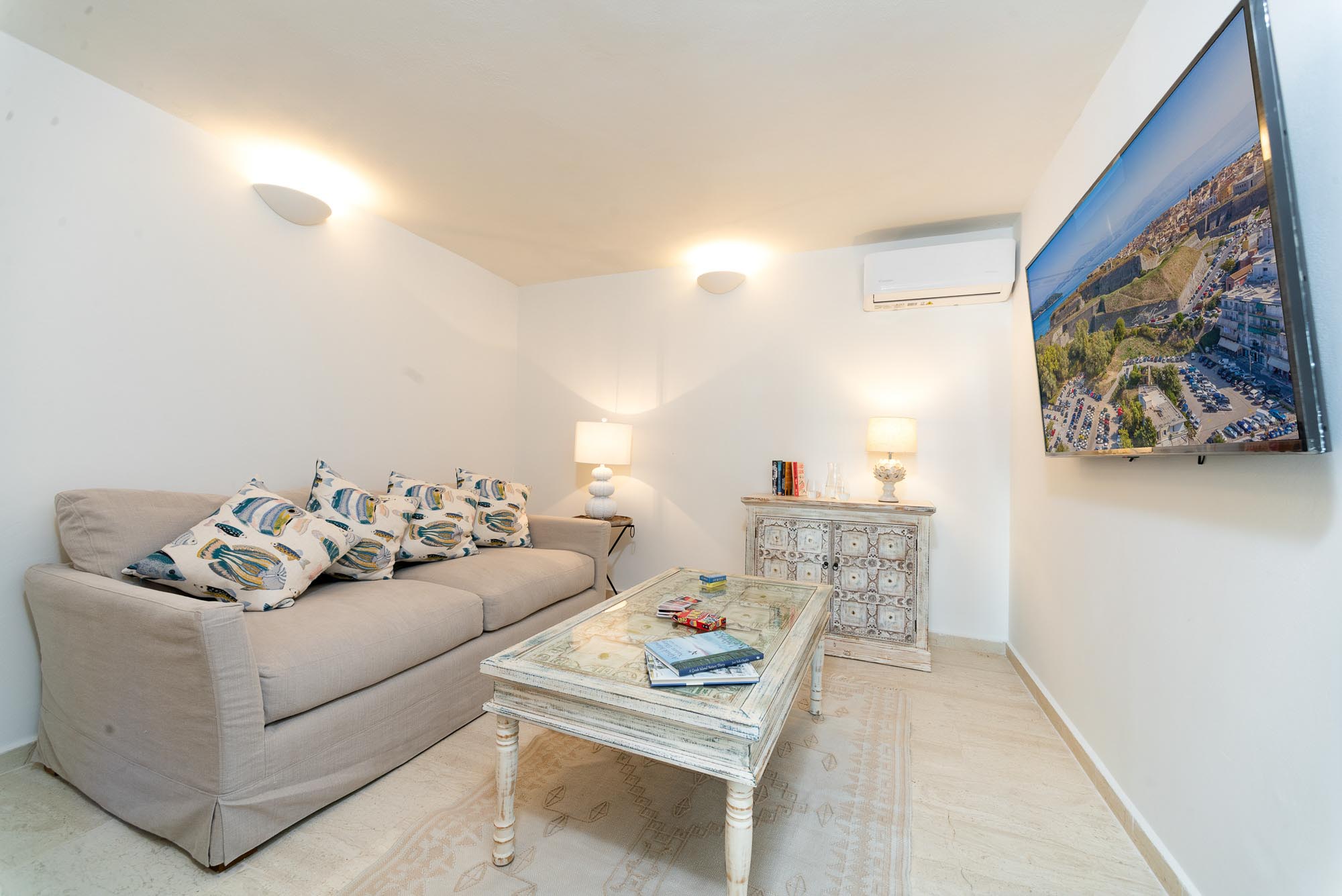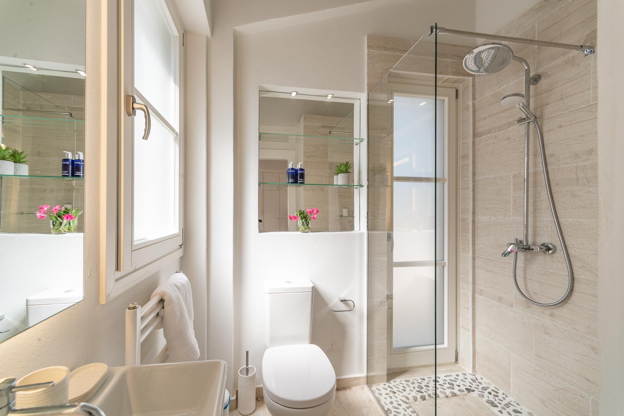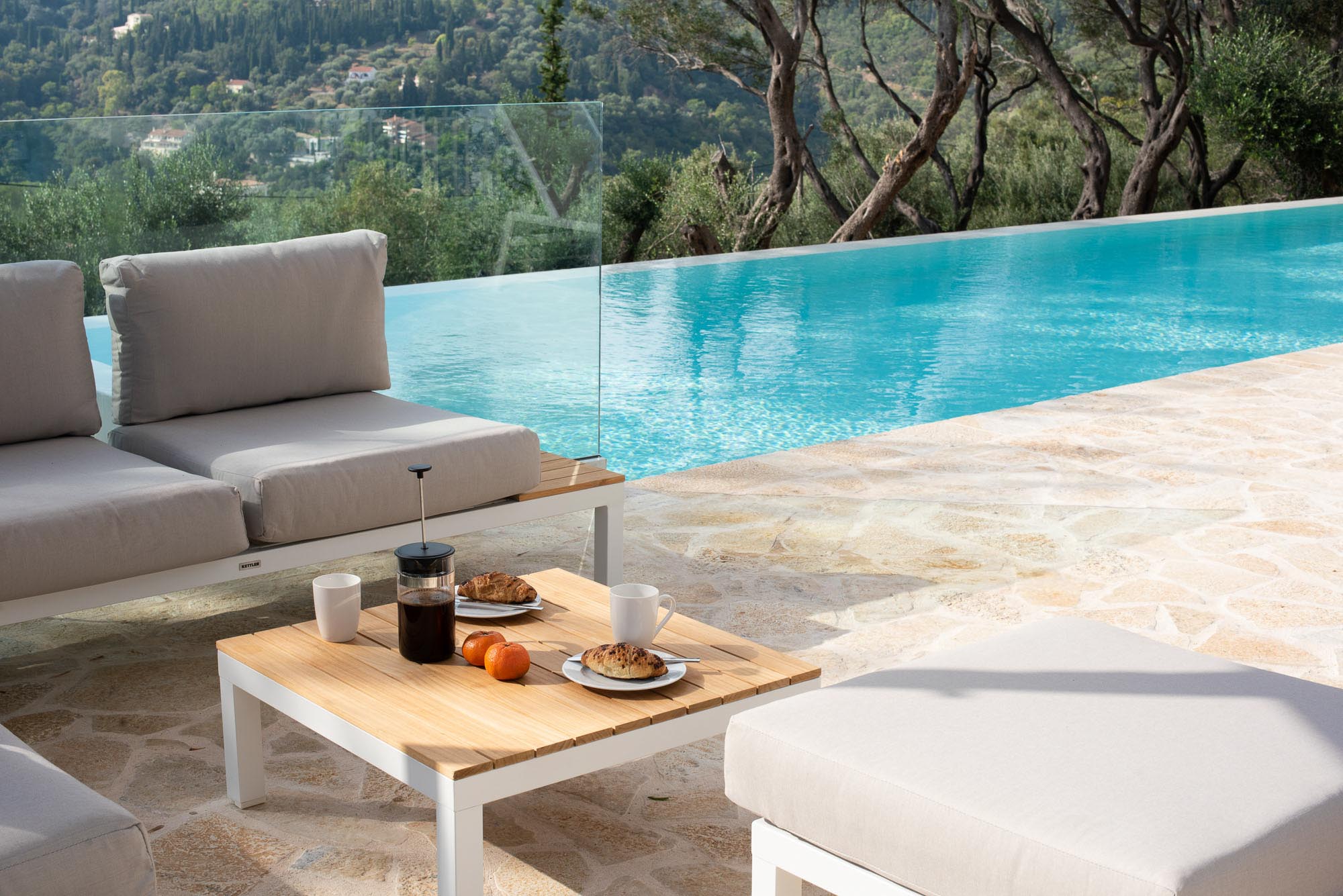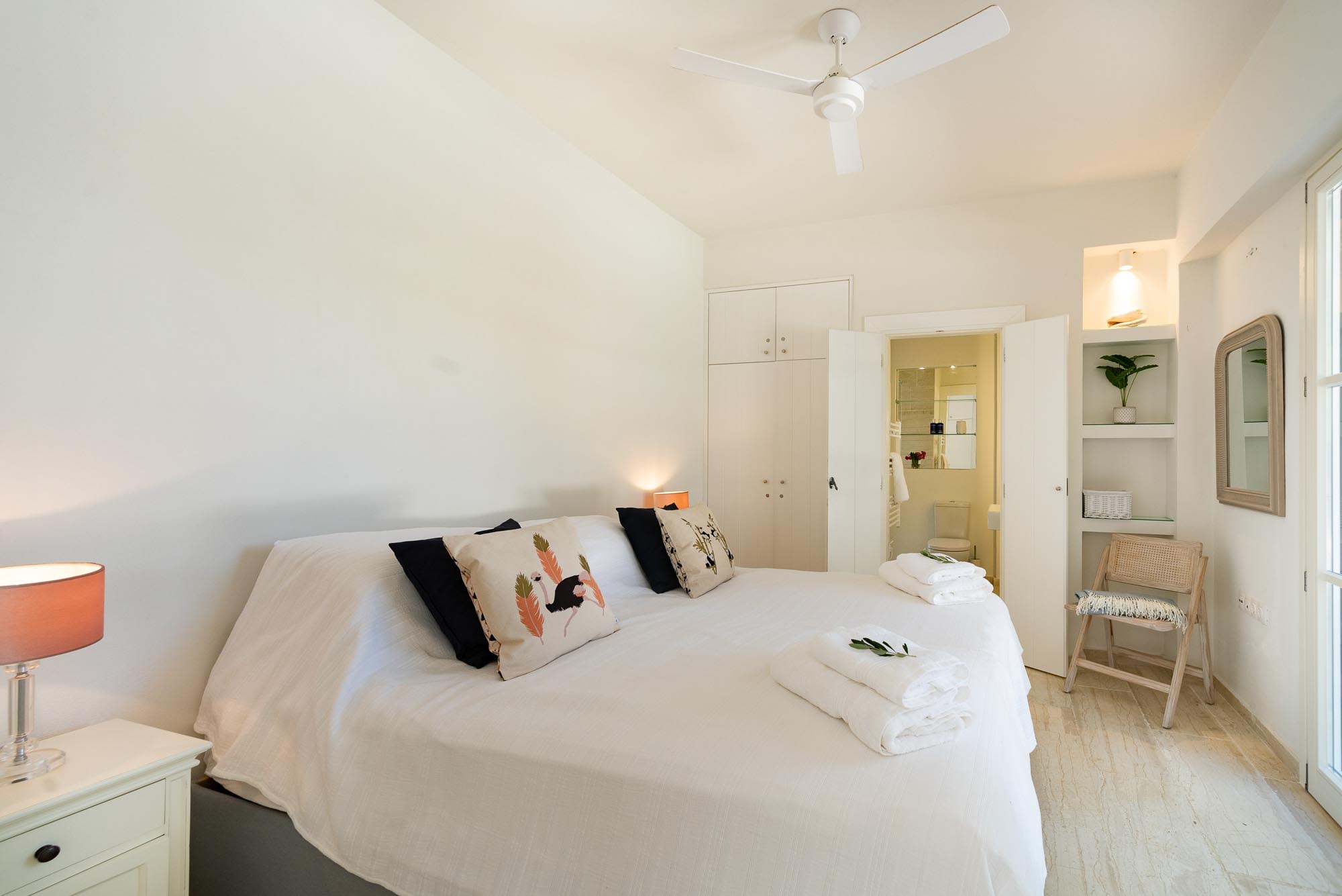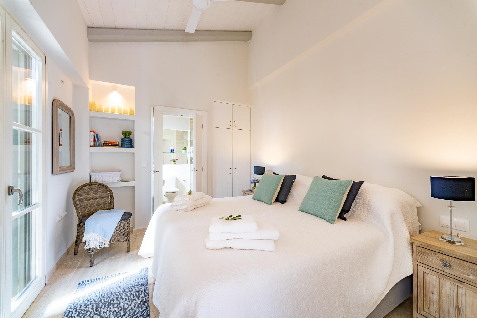 The large living space has doors that open onto the terrace, letting in lots of light and framing the stunning sea views. It contains a comfortable lounge area, breakfast bar, and dining area for eight. There are four airy bedrooms, all with super king-size beds; three are in the main house, and one is in a separate garden suite with a sitting room/TV area.