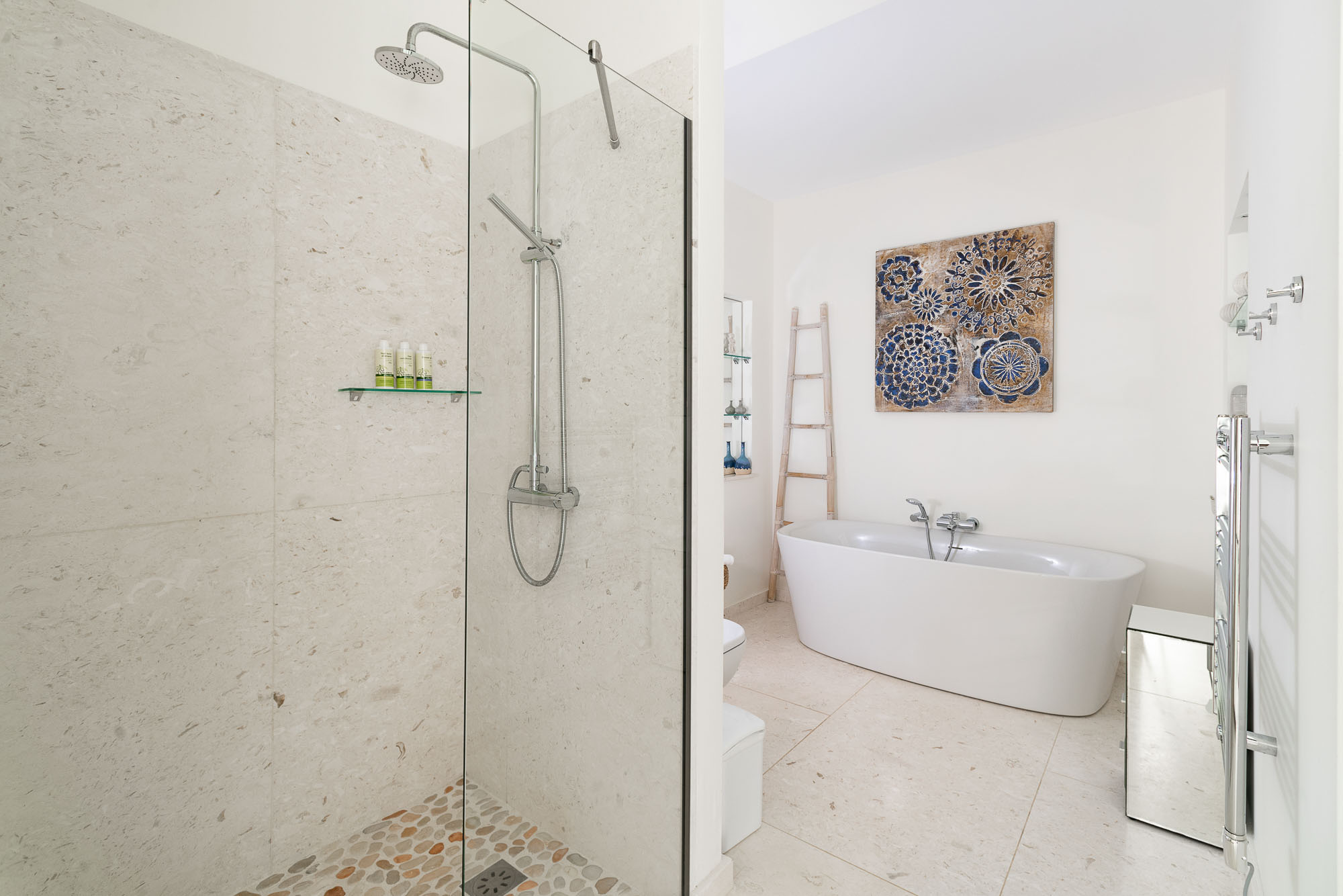 The airy reception room with a fireplace leads into a spacious dining area, while the fully equipped kitchen boasts an island and seamless access to generous terraces for indoor-outdoor living. Each of the six en suite bedrooms, including two master suites, offers tranquil garden or sea views, ensuring a restful retreat.