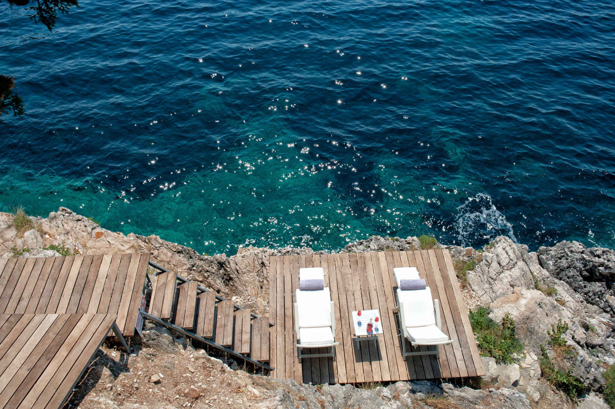 There are plenty of places to relax, including the shaded veranda, with hanging rattan egg chairs, comfy sofas, and an al fresco dining table, the teak pool terrace with sunbeds, the stepped infinity pool with a Jacuzzi and dramatic views, or some of the smaller secluded side terraces. Steps down to the sea lead to a bathing platform.