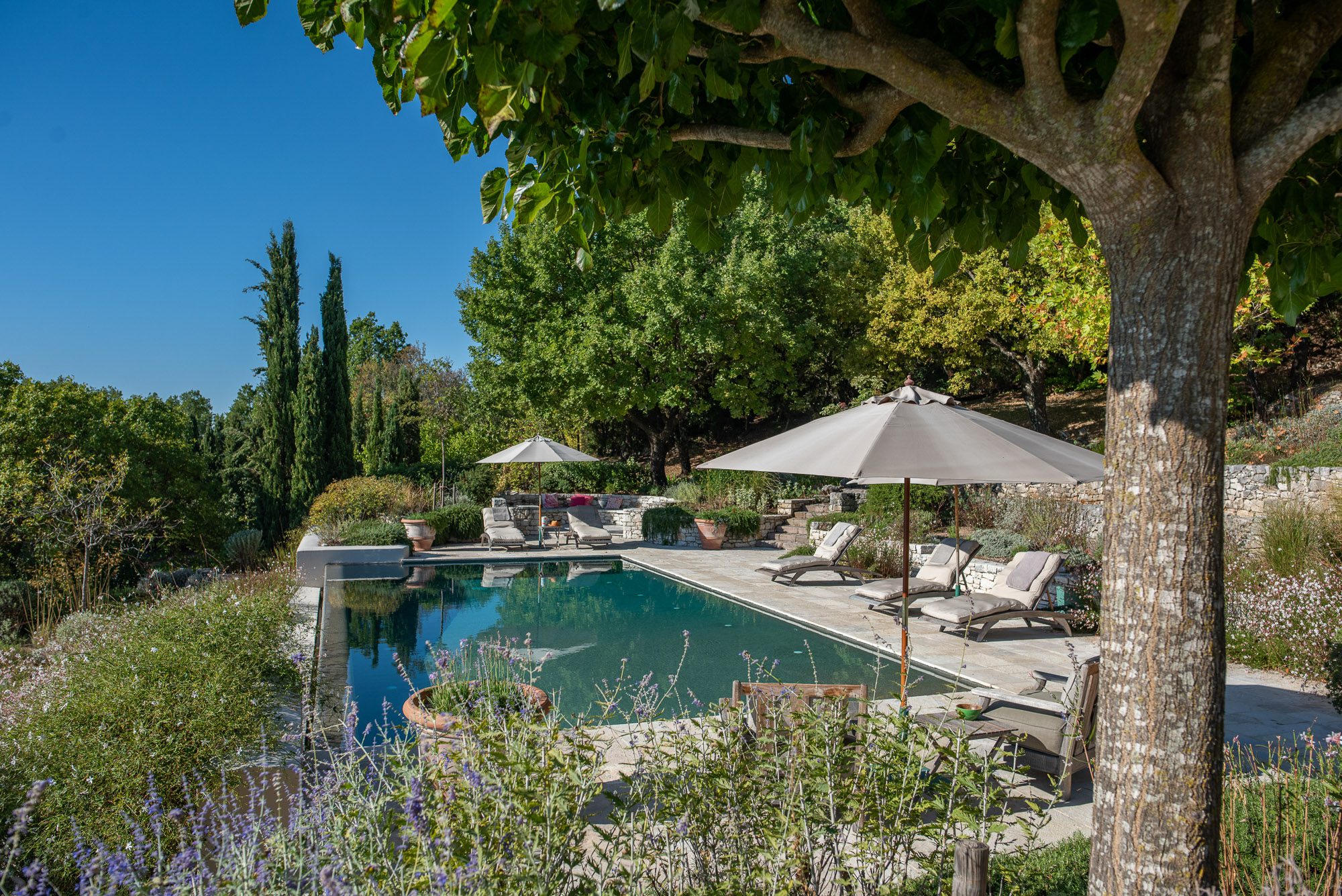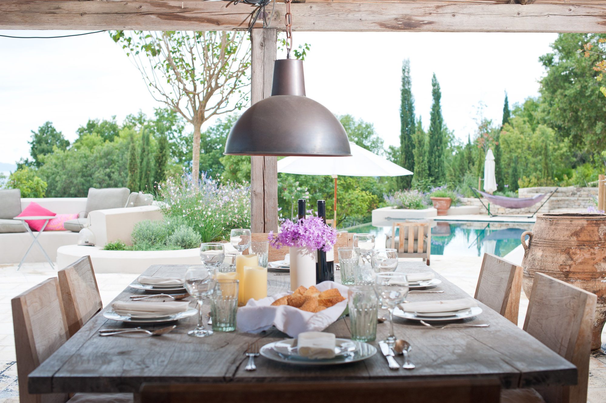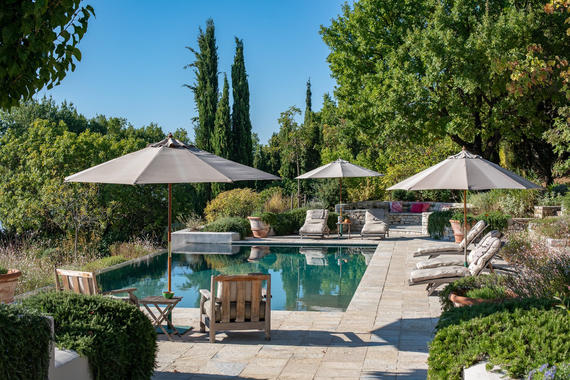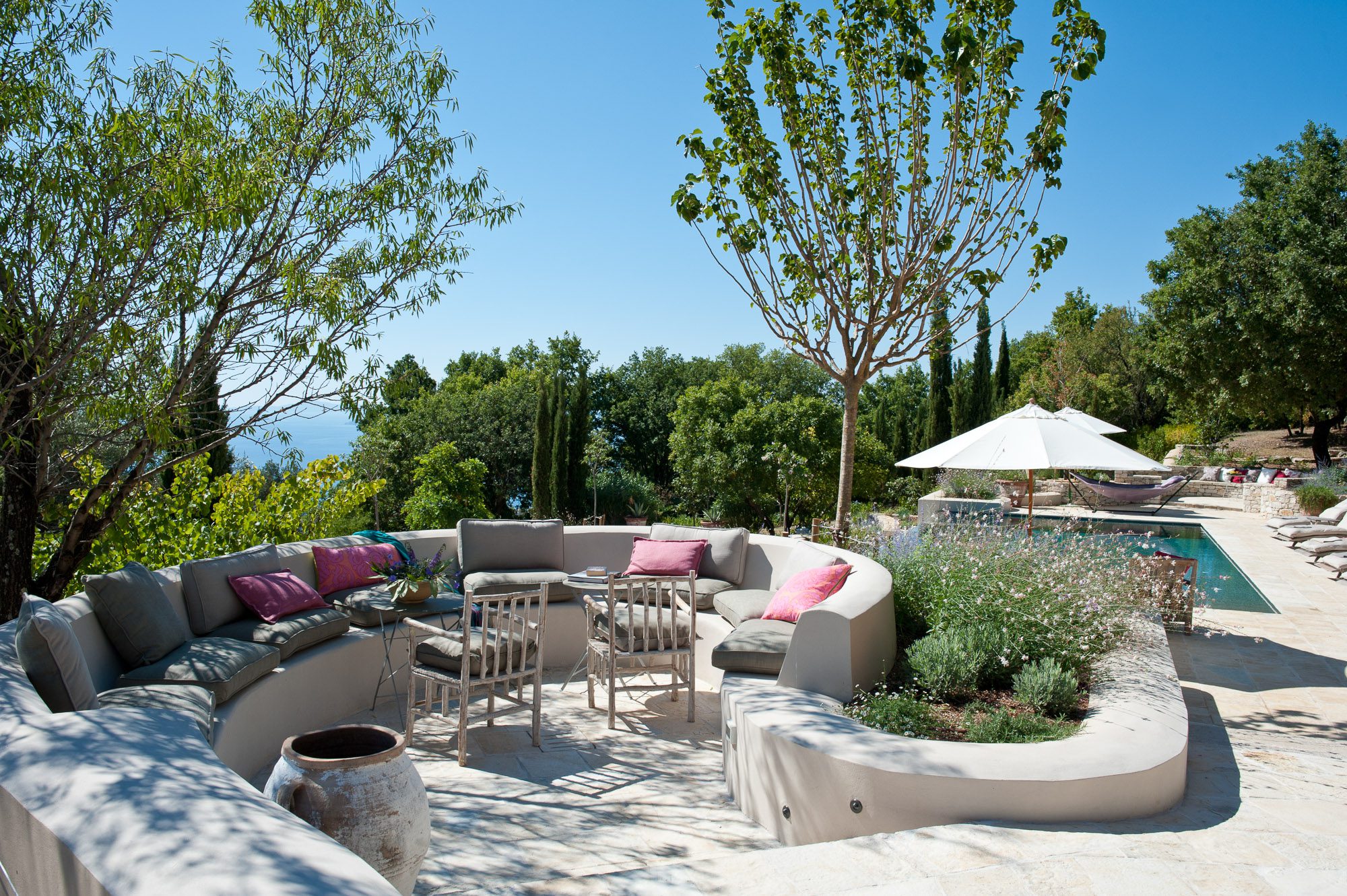 Professionally designed, they are laid out with statuesque cypresses, fruit trees, clipped Mediterranean shrubs, roses and many white and soft lavender flowering plants. There are winding paths, terraces and inviting places to sit, both in sun and shade. Three outdoor dining areas, seating up to 16, with wooden and stone tables, provide a great choice for al fresco meals. A large pool, nestled amongst the planting on a top terrace, is surrounded by inviting cushioned sun loungers, comfy armchairs, a hammock and large sun umbrellas. It really is an idyllic spot. And with the gardens lit up at night, the effect is enchanting.