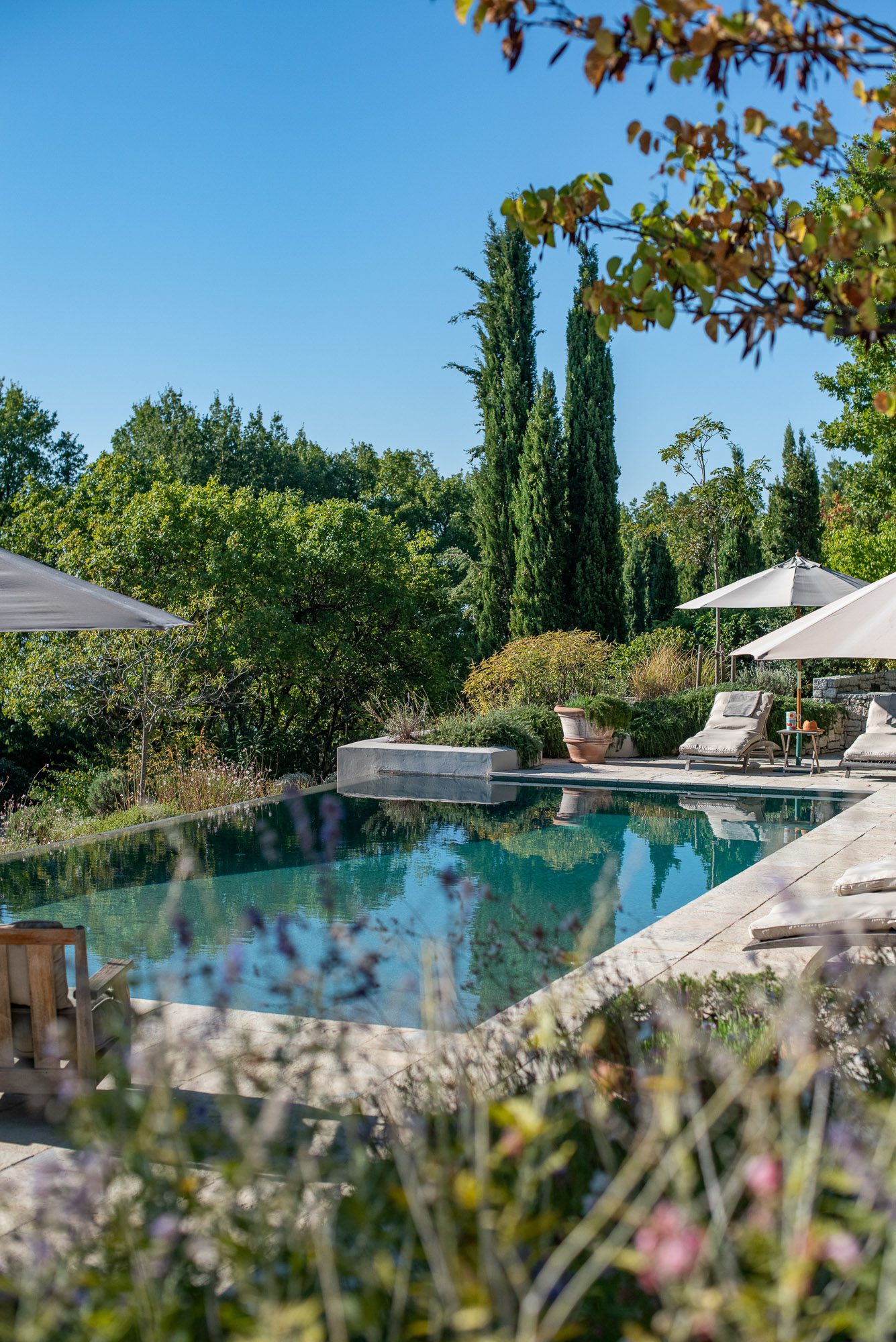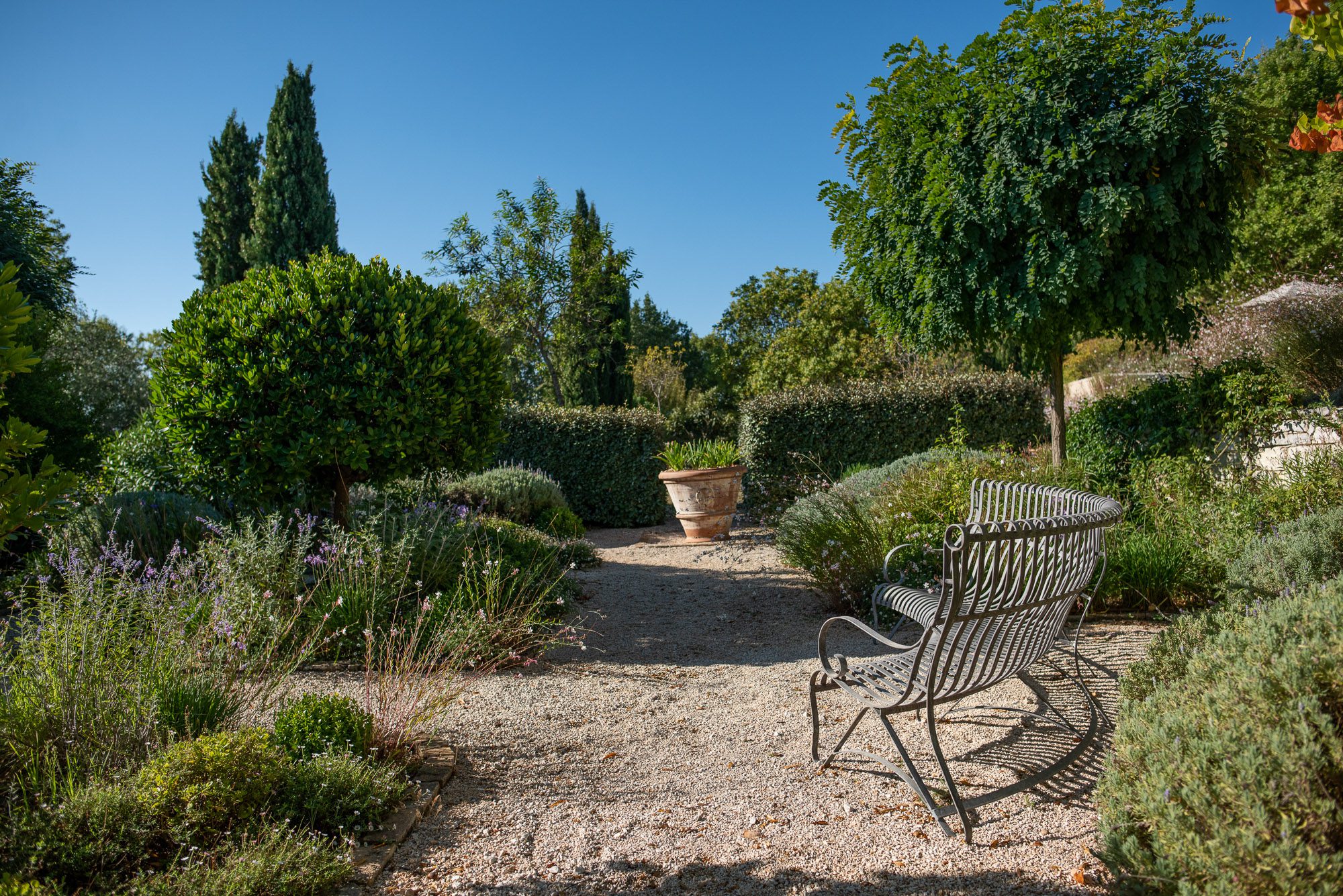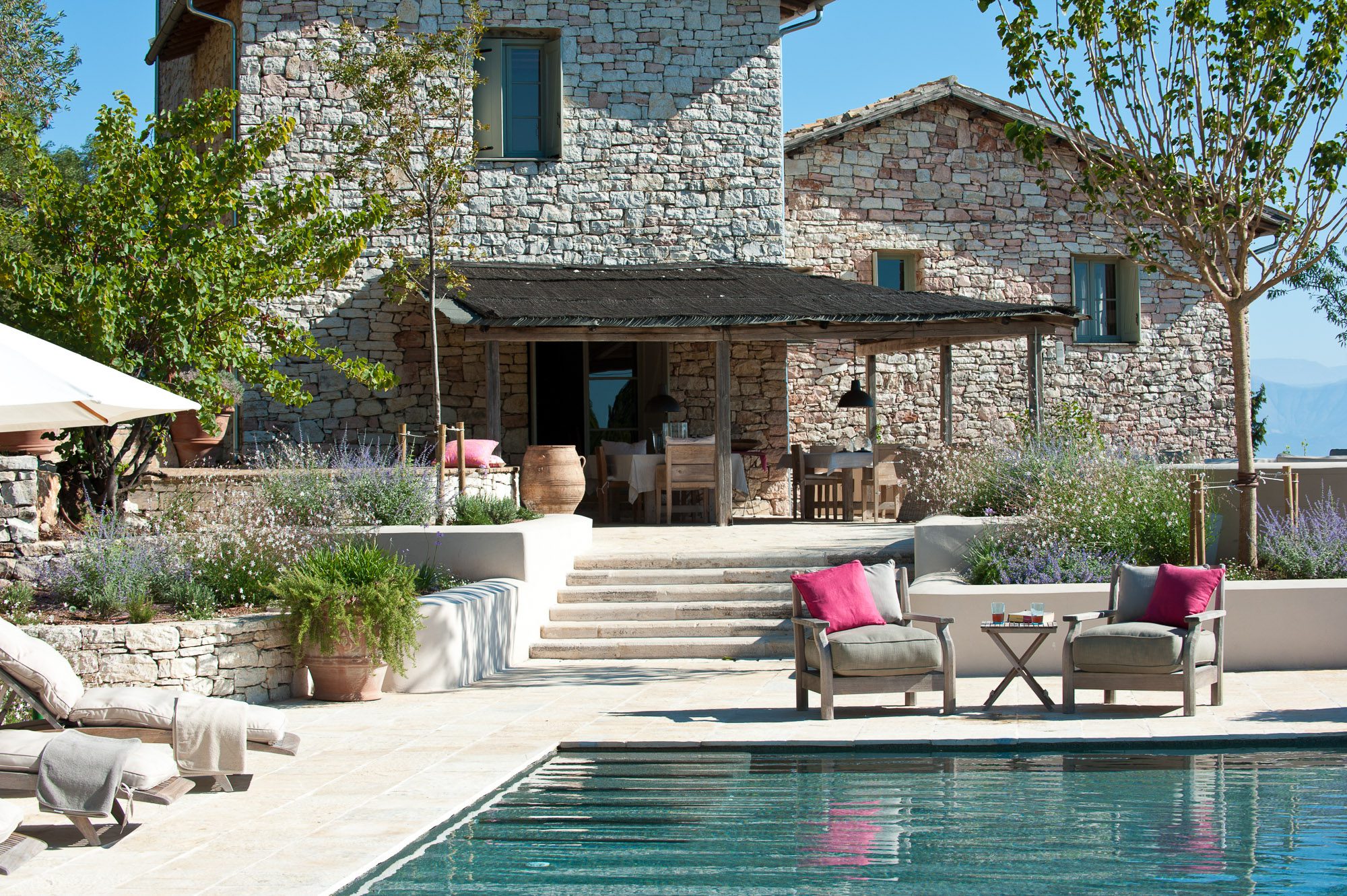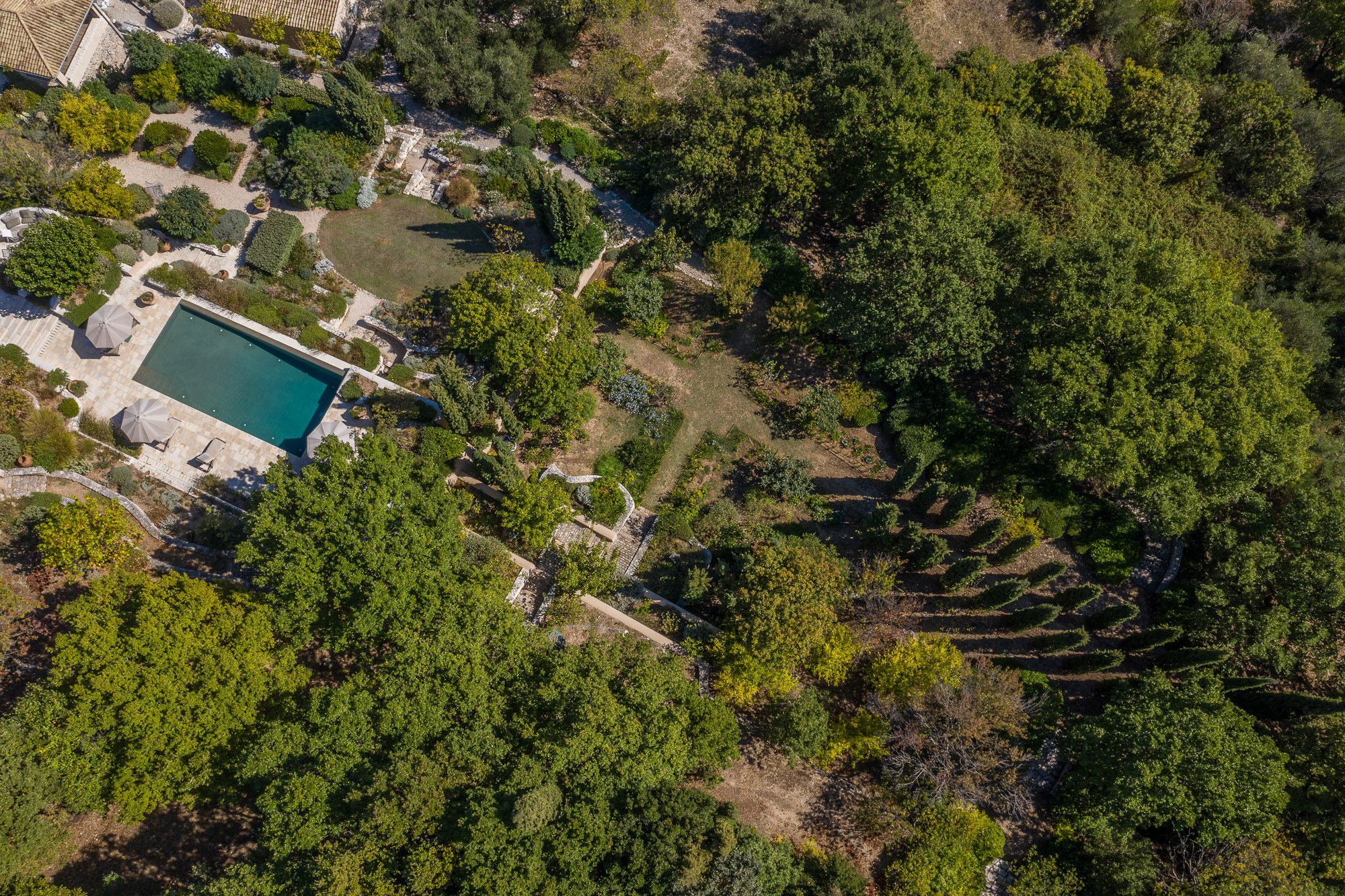 Professionally designed, they are laid out with statuesque cypresses, fruit trees, clipped Mediterranean shrubs, roses and many white and soft lavender flowering plants. There are winding paths, terraces and inviting places to sit, both in sun and shade. Three outdoor dining areas, seating up to 16, with wooden and stone tables, provide a great choice for al fresco meals. A large pool, nestled amongst the planting on a top terrace, is surrounded by inviting cushioned sun loungers, comfy armchairs, a hammock and large sun umbrellas. It really is an idyllic spot. And with the gardens lit up at night, the effect is enchanting.