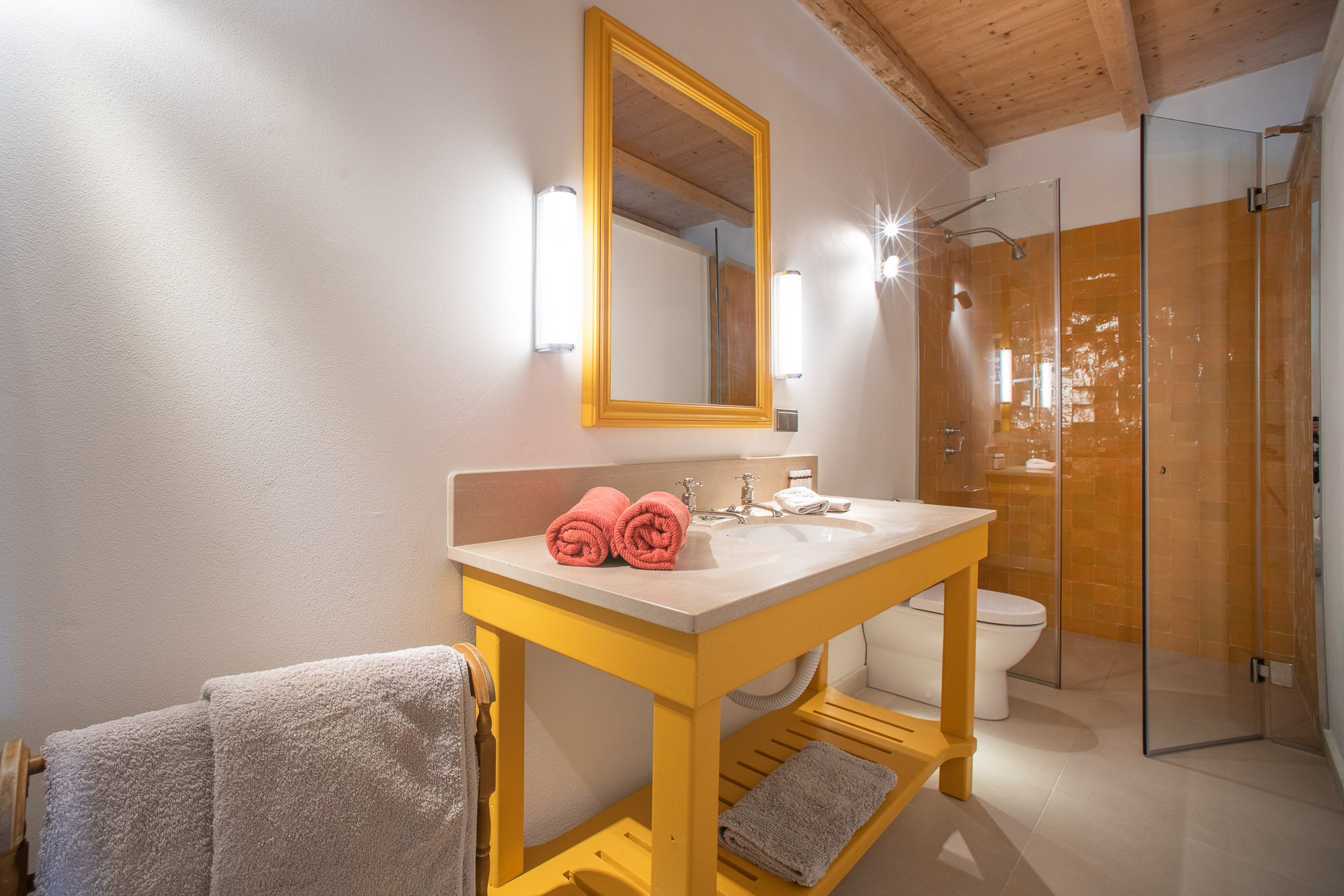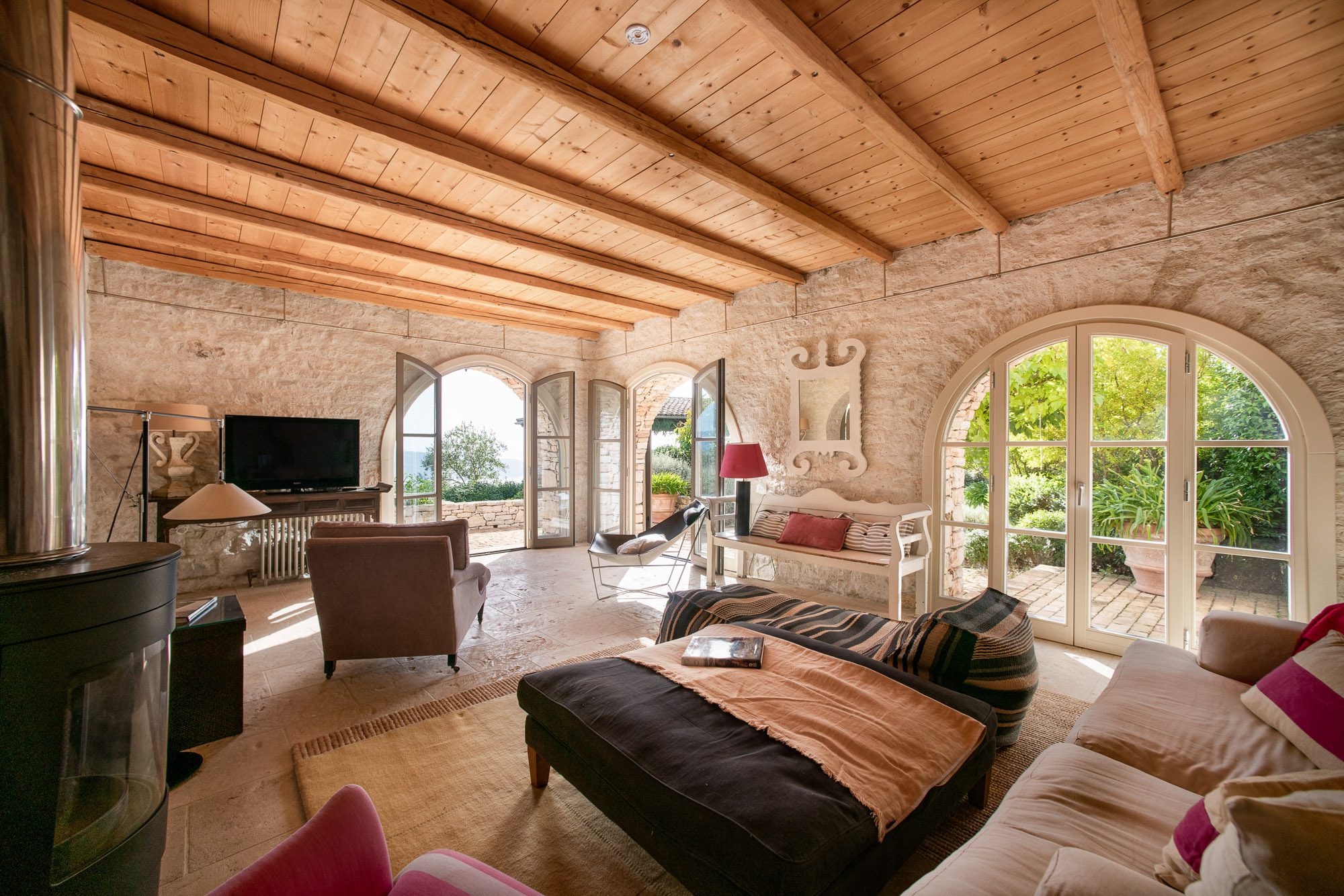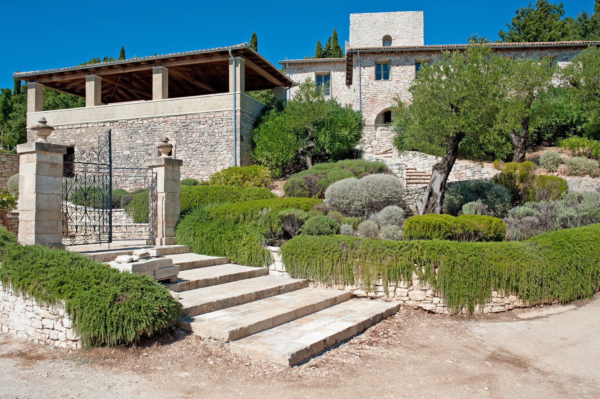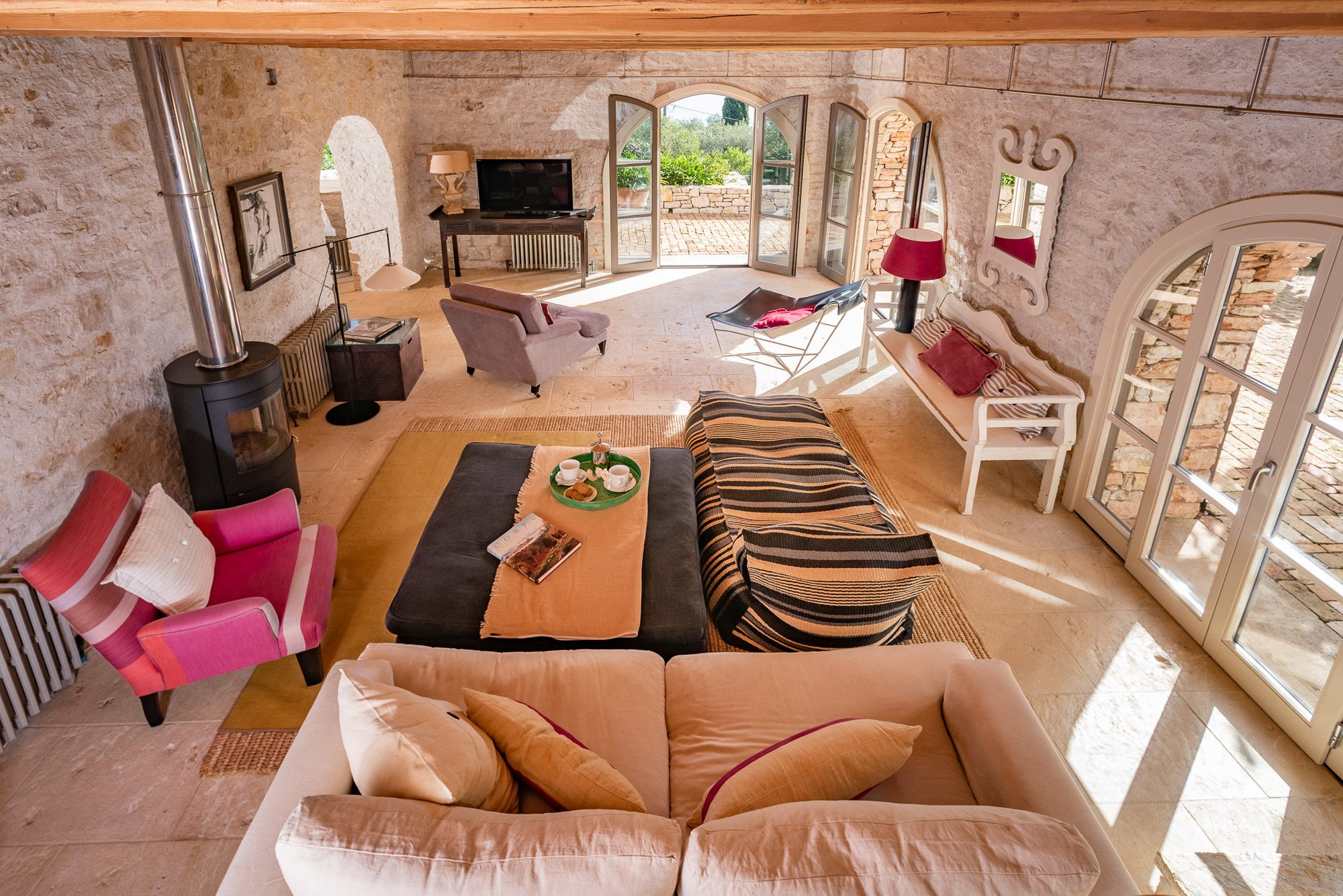 Professionally designed, they are laid out with statuesque cypresses, fruit trees, clipped Mediterranean shrubs, roses and many white and soft lavender flowering plants. There are winding paths, terraces and inviting places to sit, both in sun and shade. Three outdoor dining areas, seating up to 16, with wooden and stone tables, provide a great choice for al fresco meals. A large pool, nestled amongst the planting on a top terrace, is surrounded by inviting cushioned sun loungers, comfy armchairs, a hammock and large sun umbrellas. It really is an idyllic spot. And with the gardens lit up at night, the effect is enchanting.