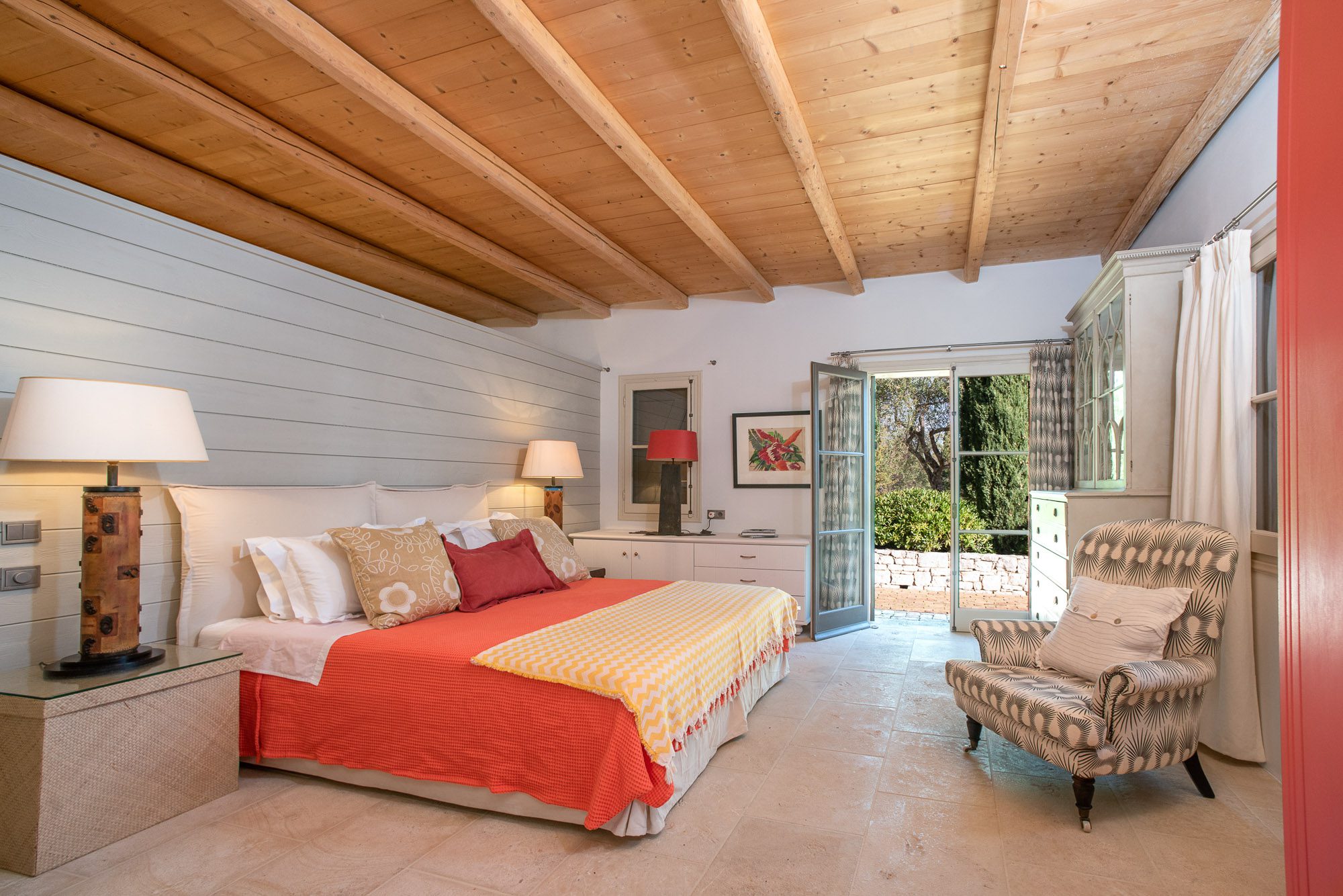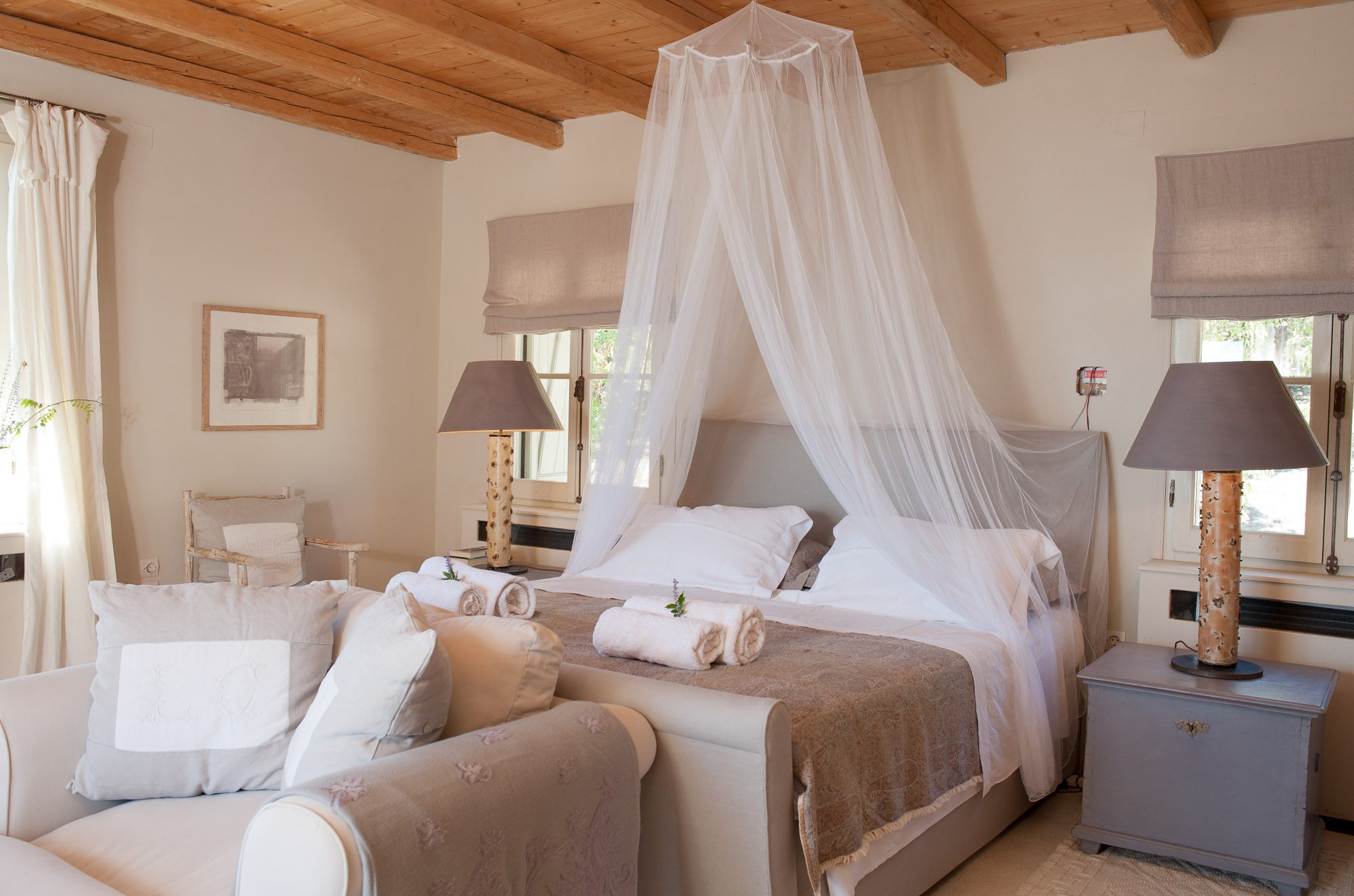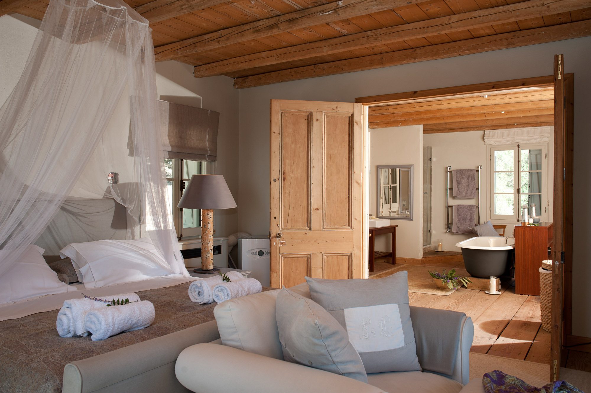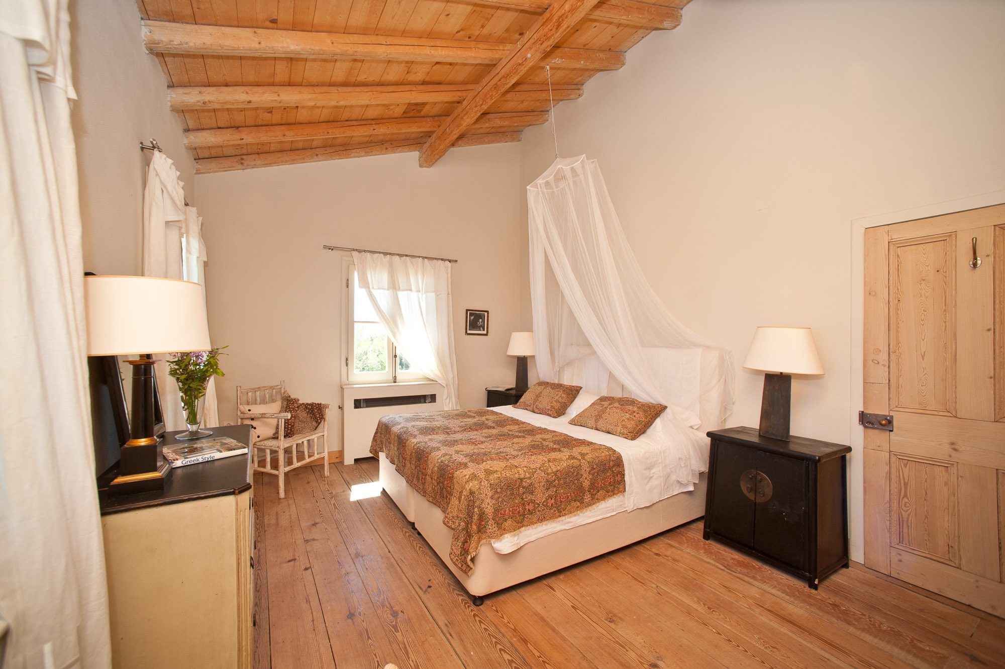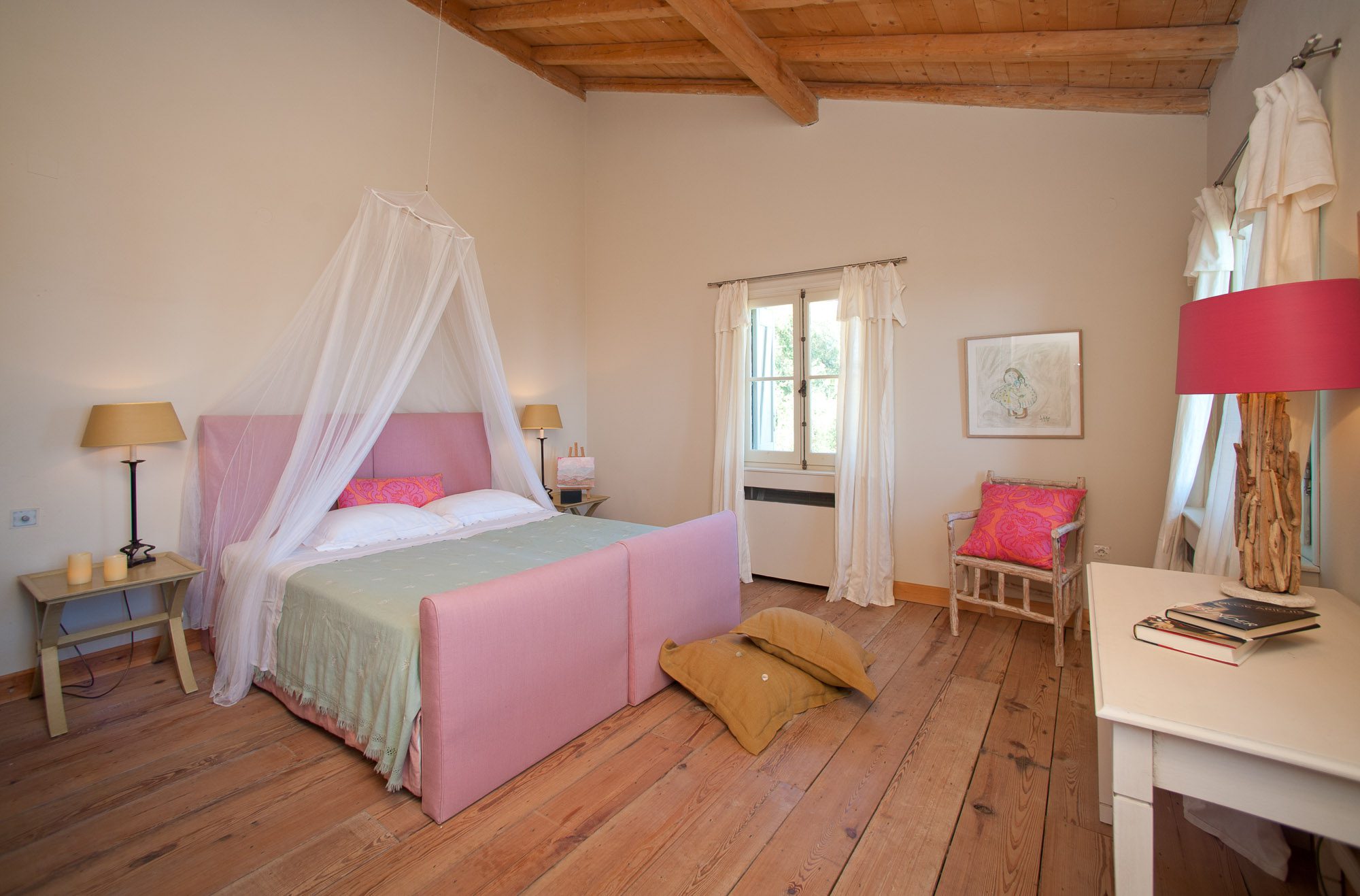 Both house and garden evoke English country style, mixed with Mediterranean warmth and colour. The furniture is classic but contemporary, there's an emphasis on comfort with style. The large bedrooms are air-conditioned, beds draped with mosquito nets, being practical and providing an air of romance. There's an open-plan country-style kitchen, dining room and drawing room with exposed stone walls and large glass doors opening to the gardens. In the tower, the guests can enjoy a library. The self-contained cottage has both indoor and outdoor dining spots and a garden area.