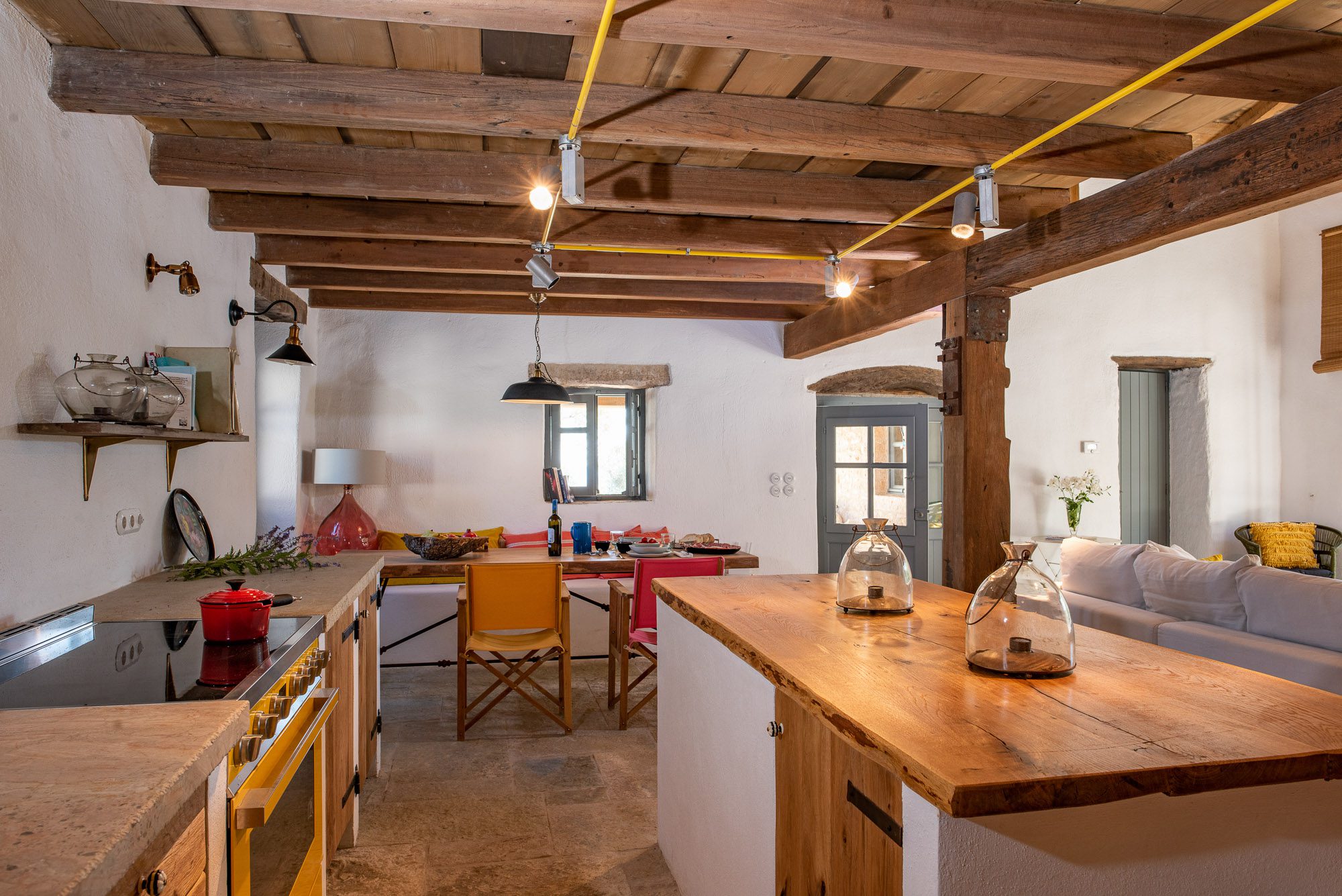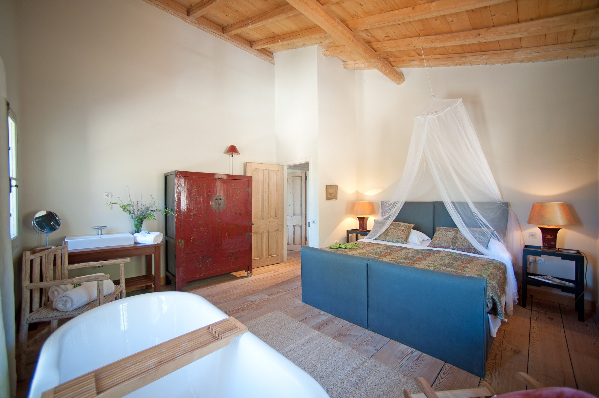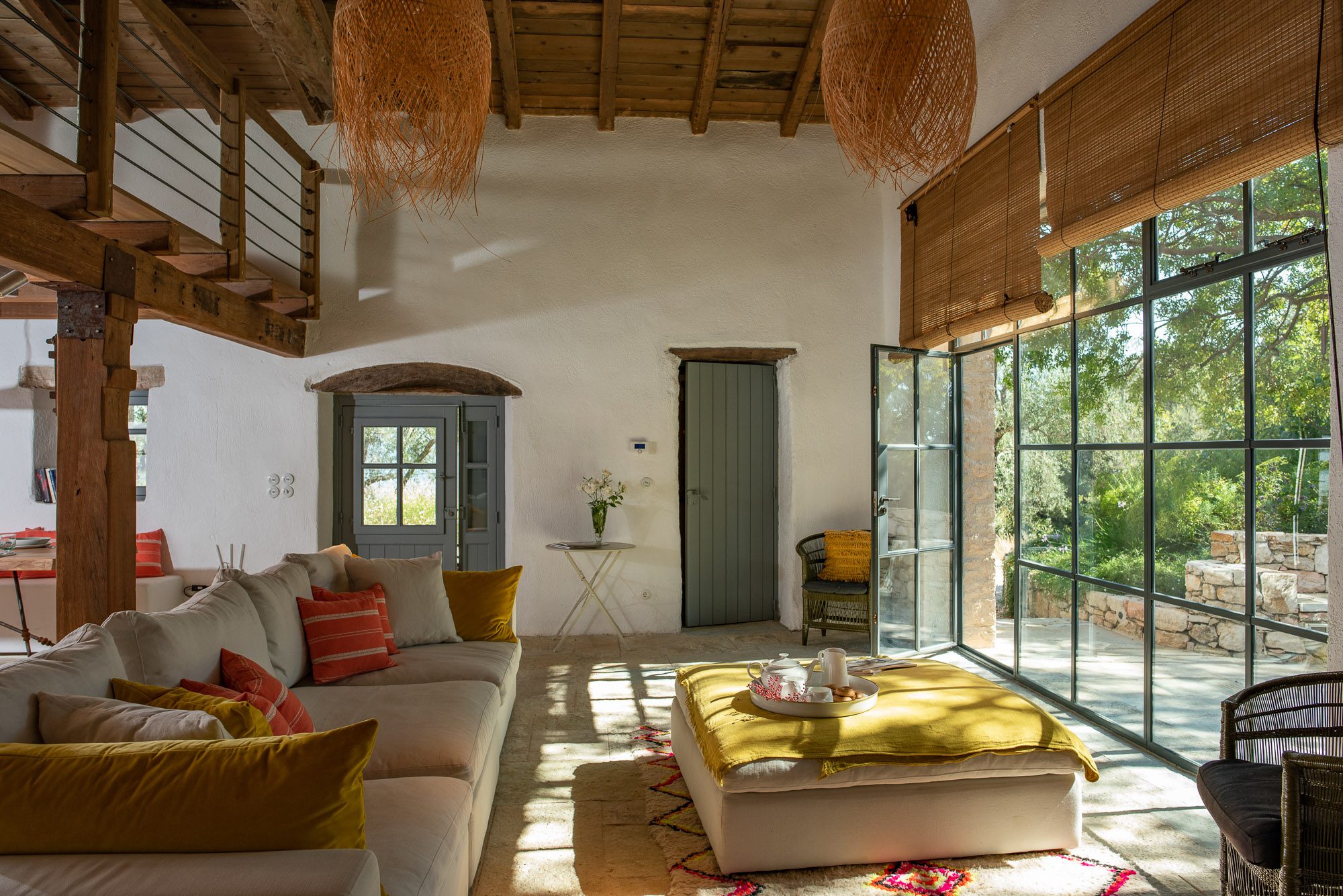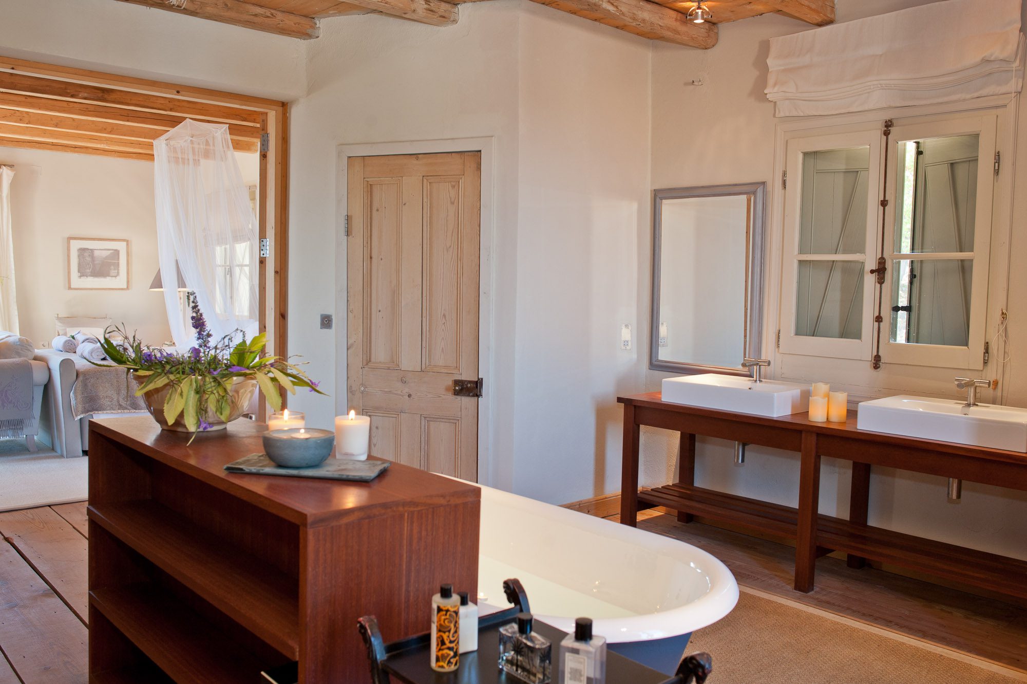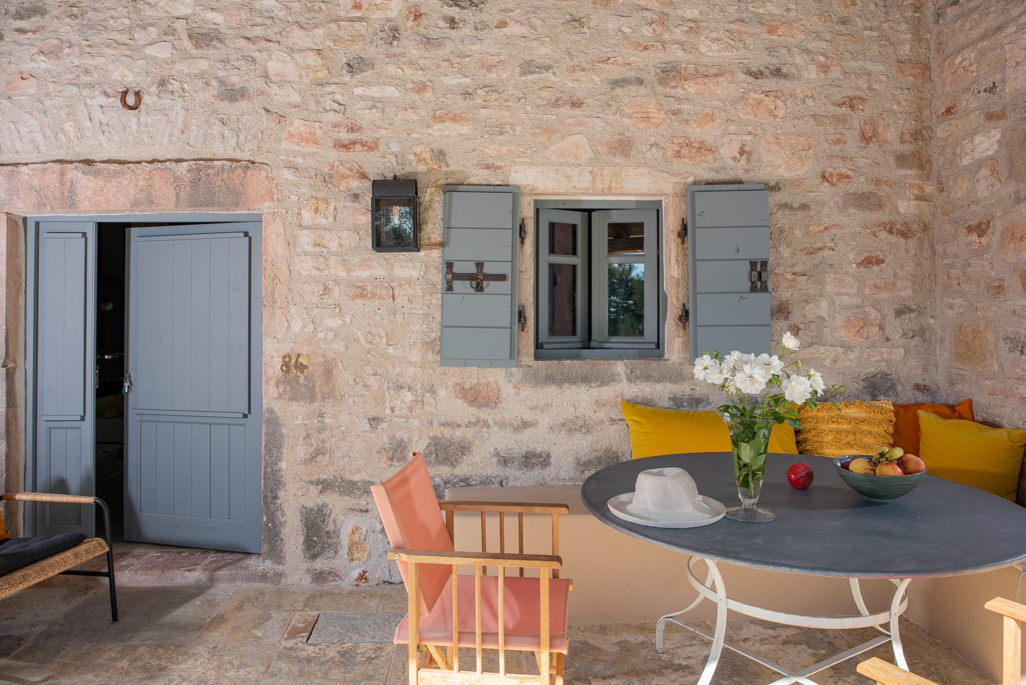 Both house and garden evoke English country style, mixed with Mediterranean warmth and colour. The furniture is classic but contemporary, there's an emphasis on comfort with style. The large bedrooms are air-conditioned, beds draped with mosquito nets, being practical and providing an air of romance. There's an open-plan country-style kitchen, dining room and drawing room with exposed stone walls and large glass doors opening to the gardens. In the tower, the guests can enjoy a library. The self-contained cottage has both indoor and outdoor dining spots and a garden area.