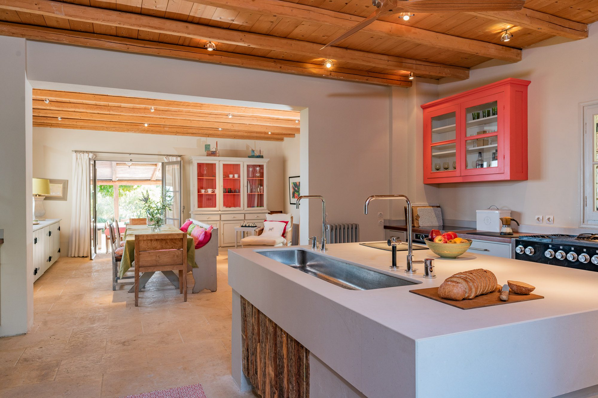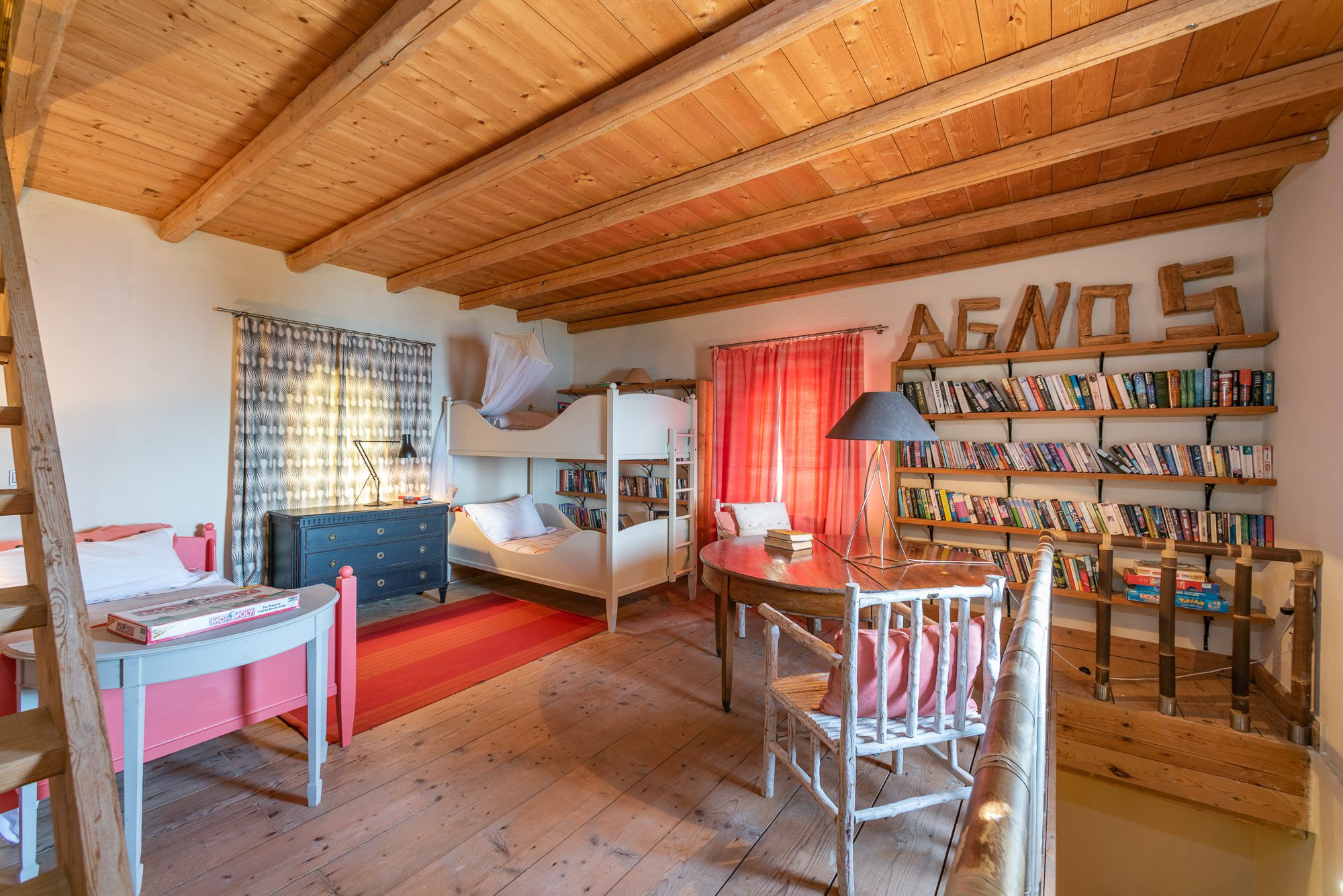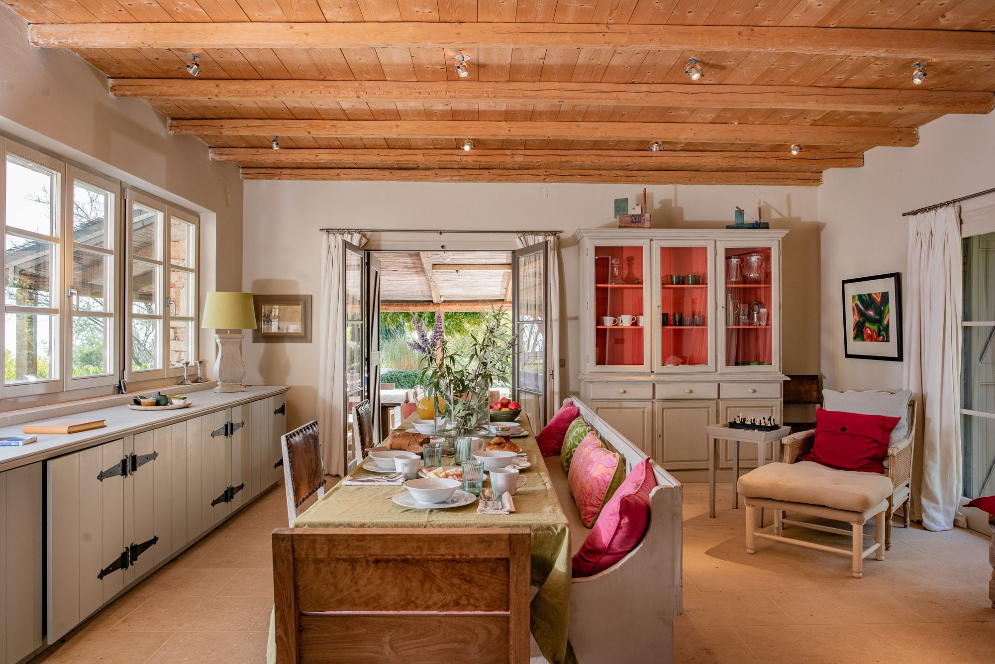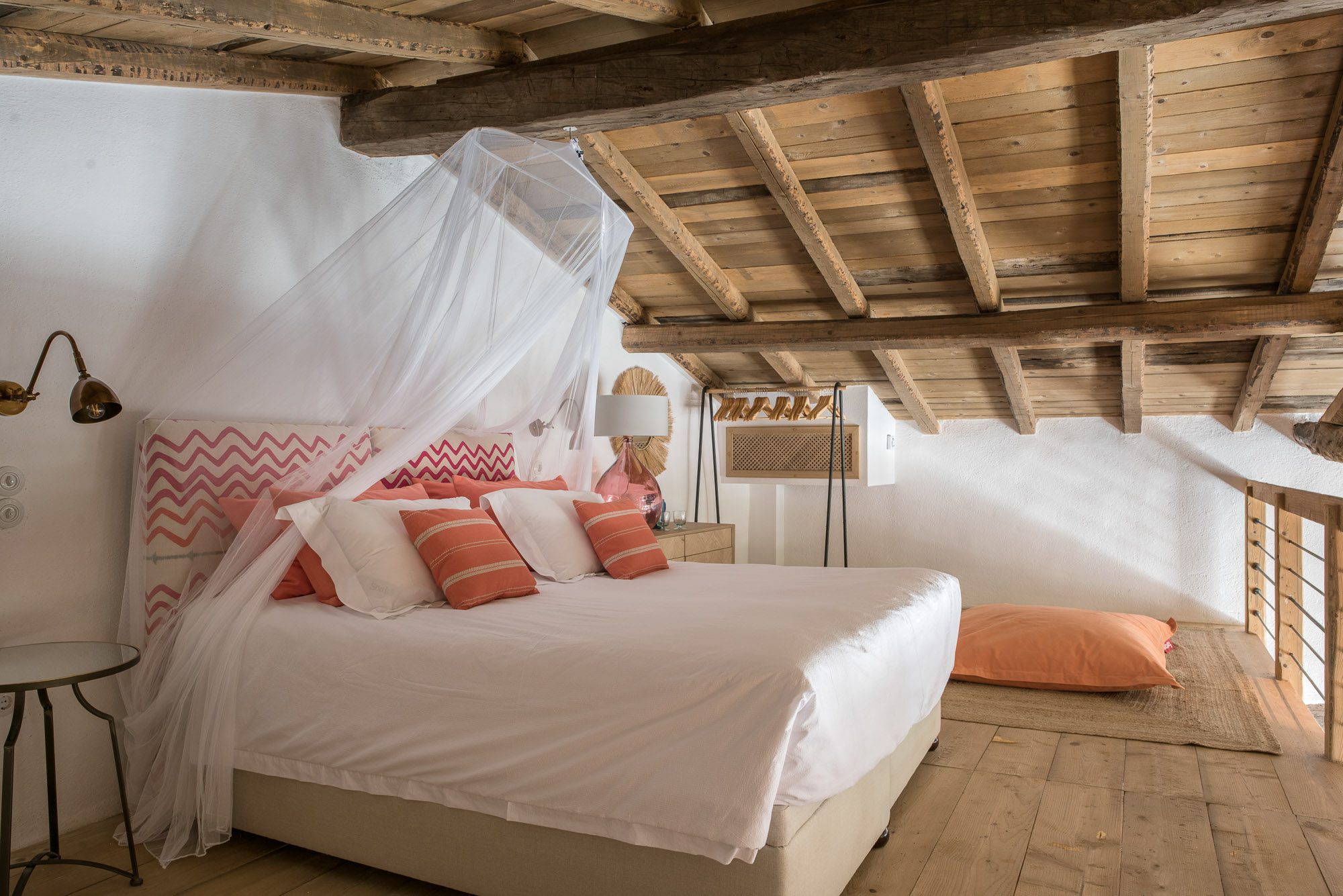 Both house and garden evoke English country style, mixed with Mediterranean warmth and colour. The furniture is classic but contemporary, there's an emphasis on comfort with style. The large bedrooms are air-conditioned, beds draped with mosquito nets, being practical and providing an air of romance. There's an open-plan country-style kitchen, dining room and drawing room with exposed stone walls and large glass doors opening to the gardens. In the tower, the guests can enjoy a library. The self-contained cottage has both indoor and outdoor dining spots and a garden area.