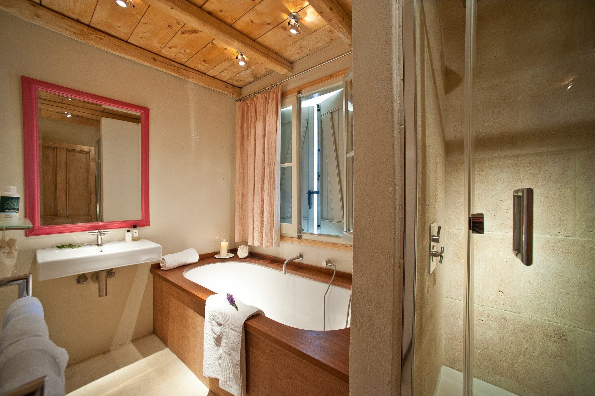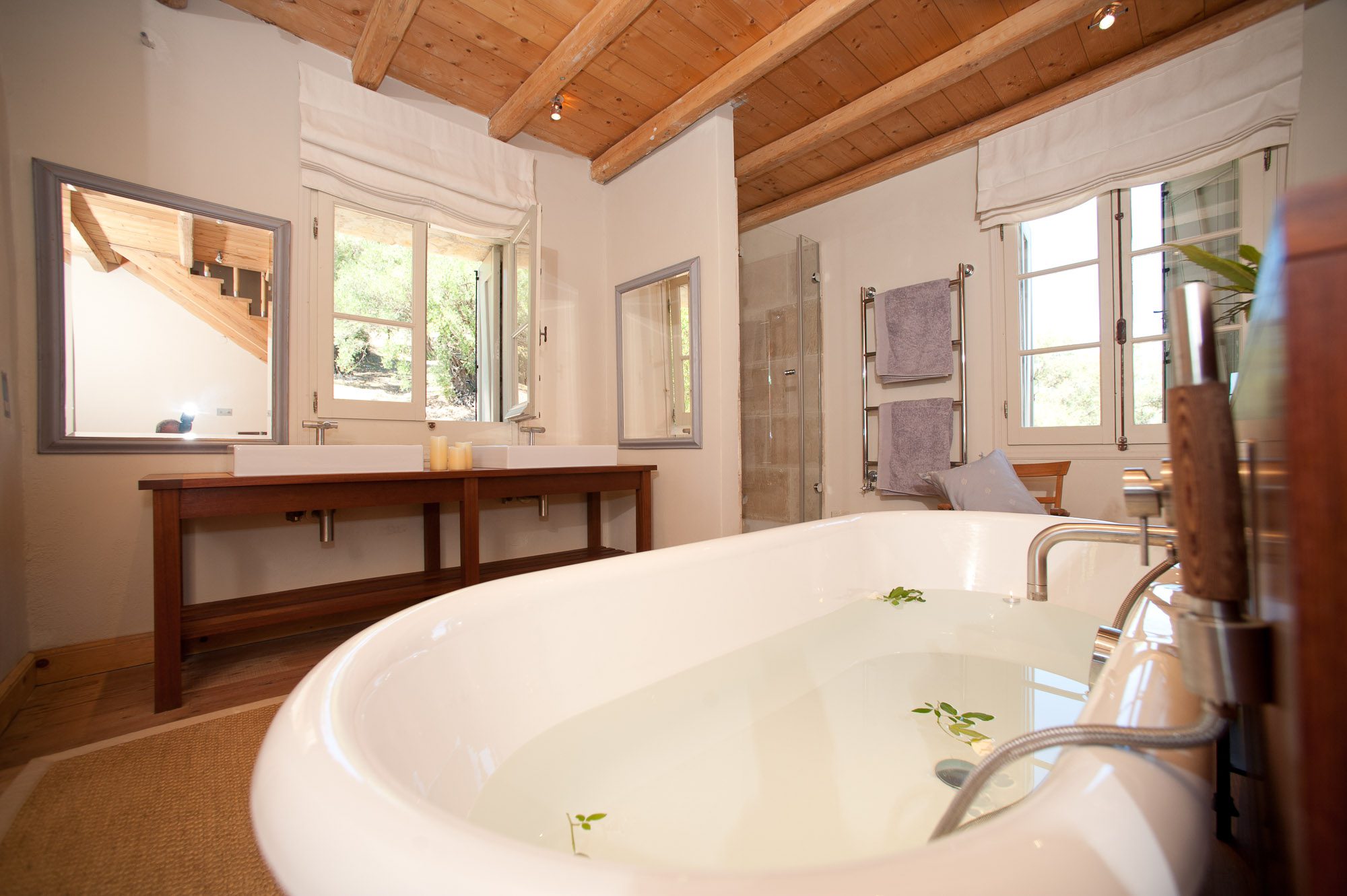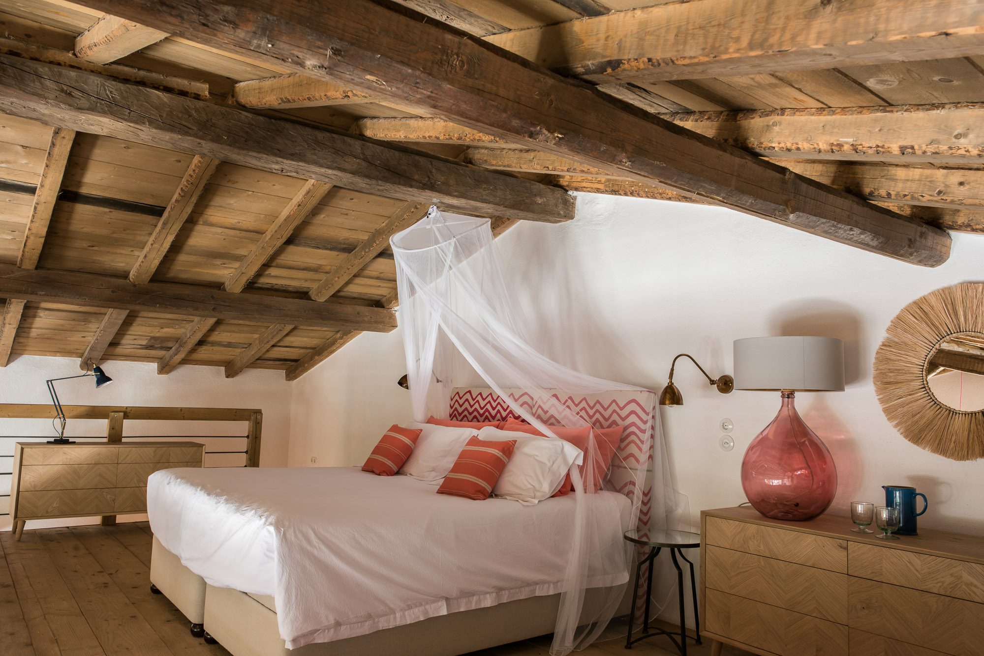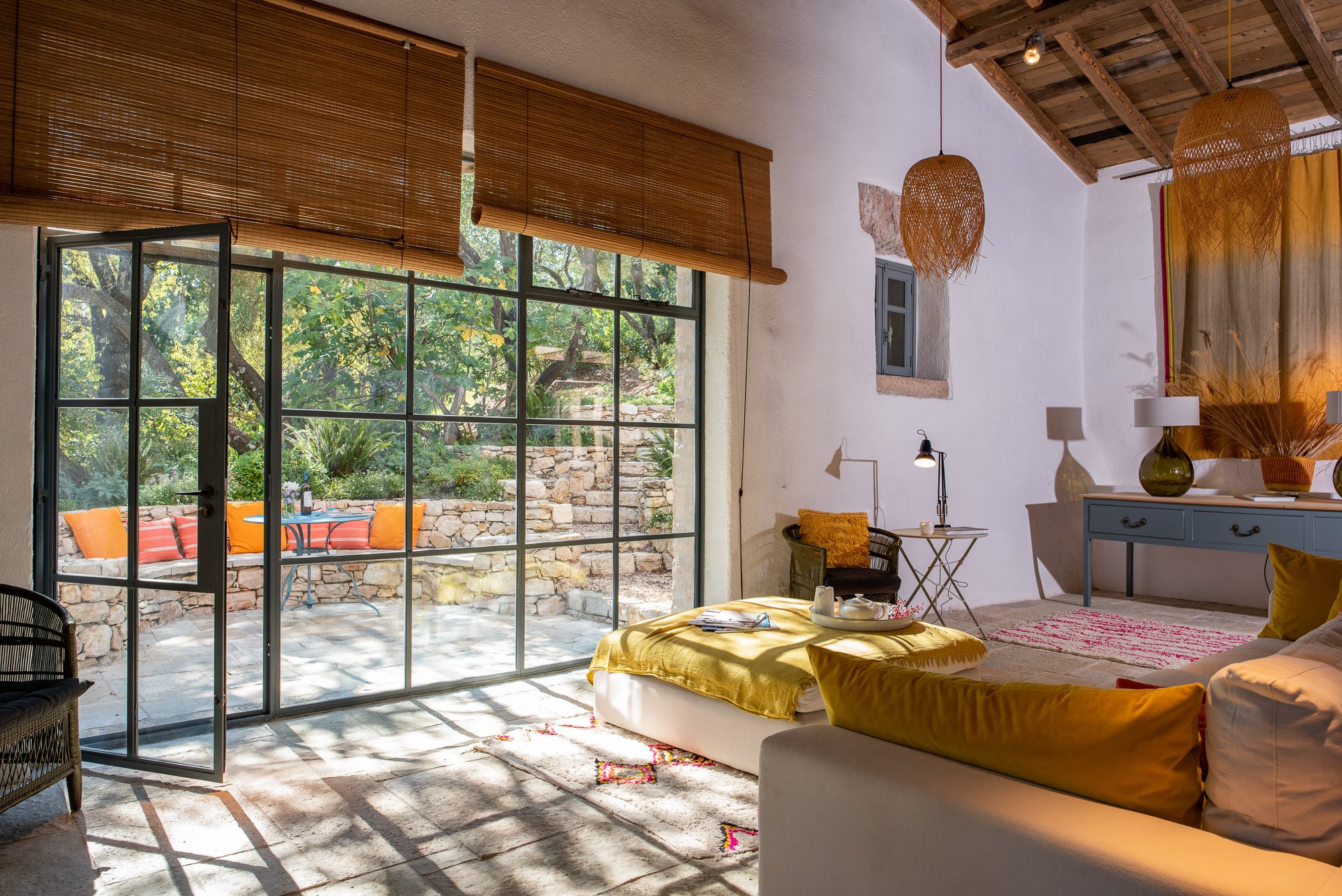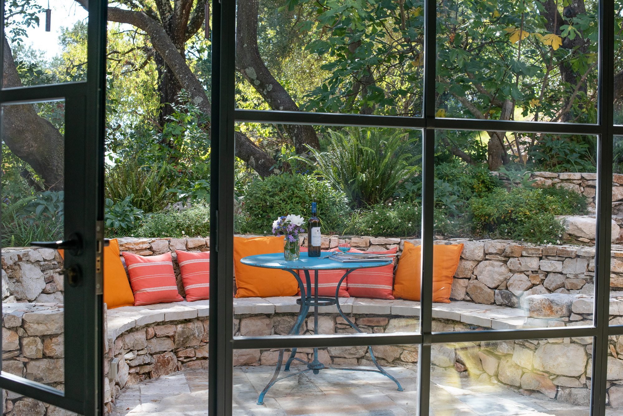 Both house and garden evoke English country style, mixed with Mediterranean warmth and colour. The furniture is classic but contemporary, there's an emphasis on comfort with style. The large bedrooms are air-conditioned, beds draped with mosquito nets, being practical and providing an air of romance. There's an open-plan country-style kitchen, dining room and drawing room with exposed stone walls and large glass doors opening to the gardens. In the tower, the guests can enjoy a library. The self-contained cottage has both indoor and outdoor dining spots and a garden area.