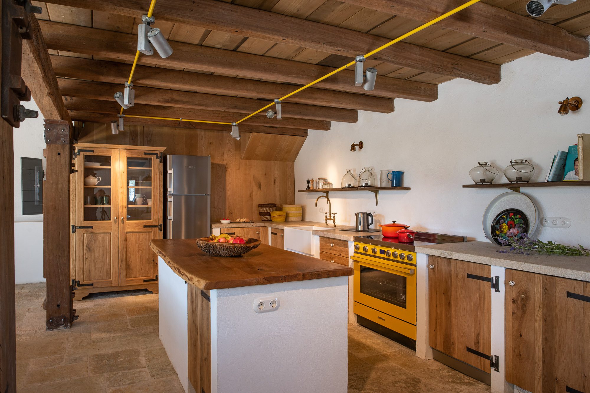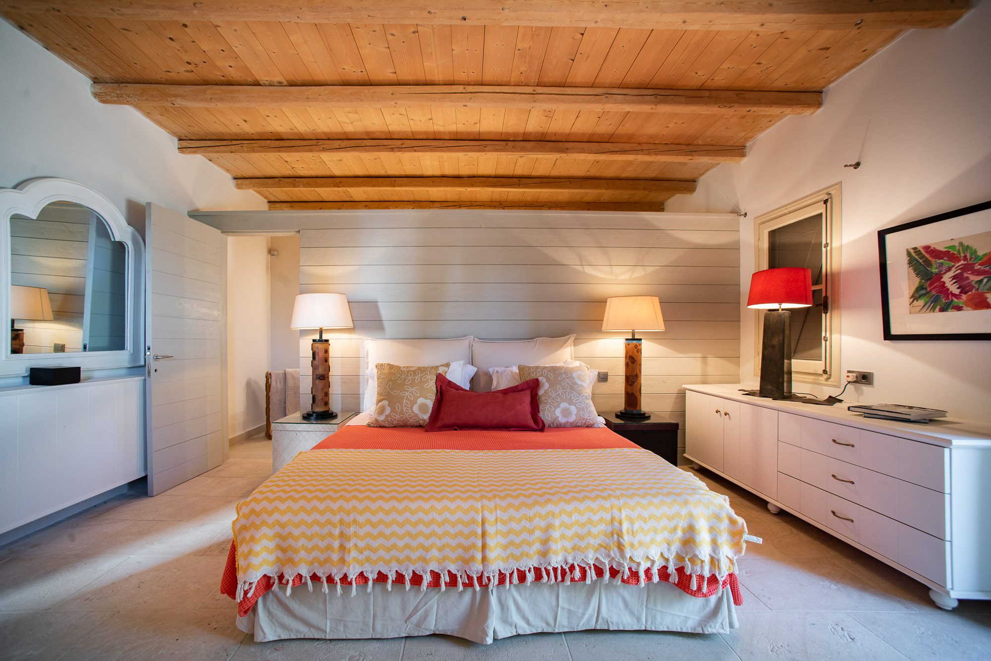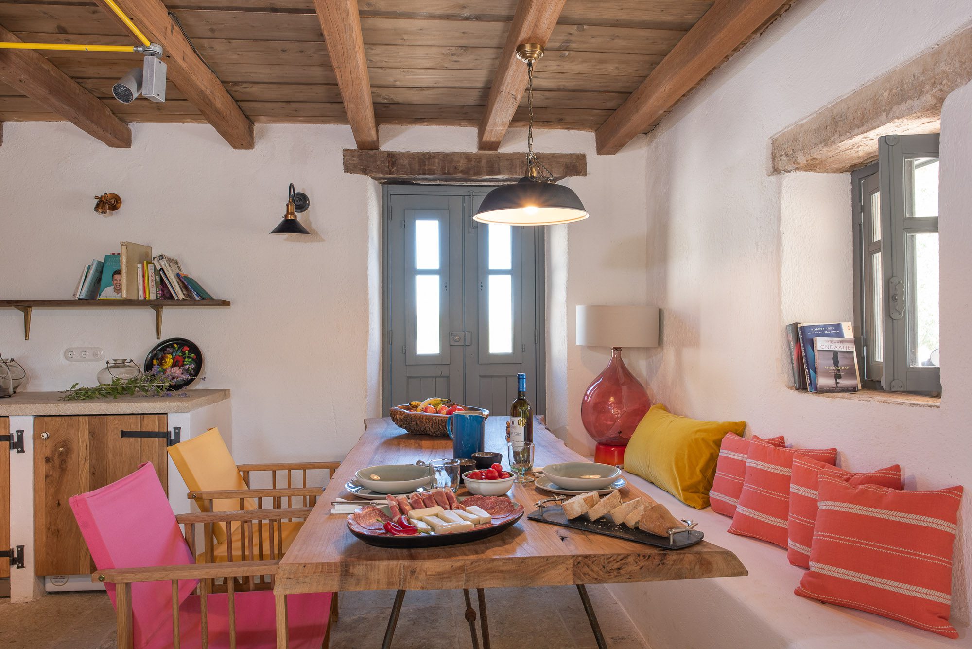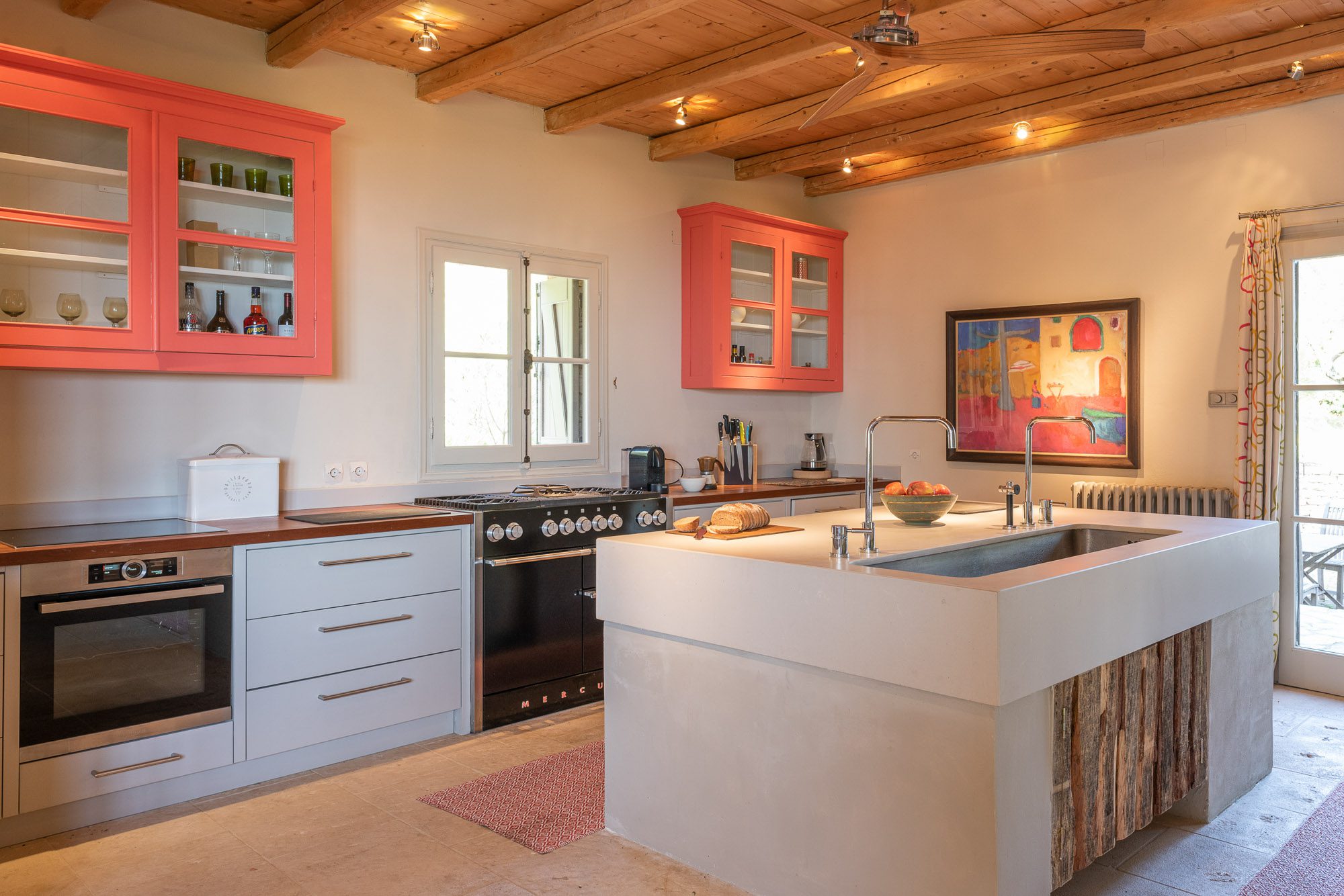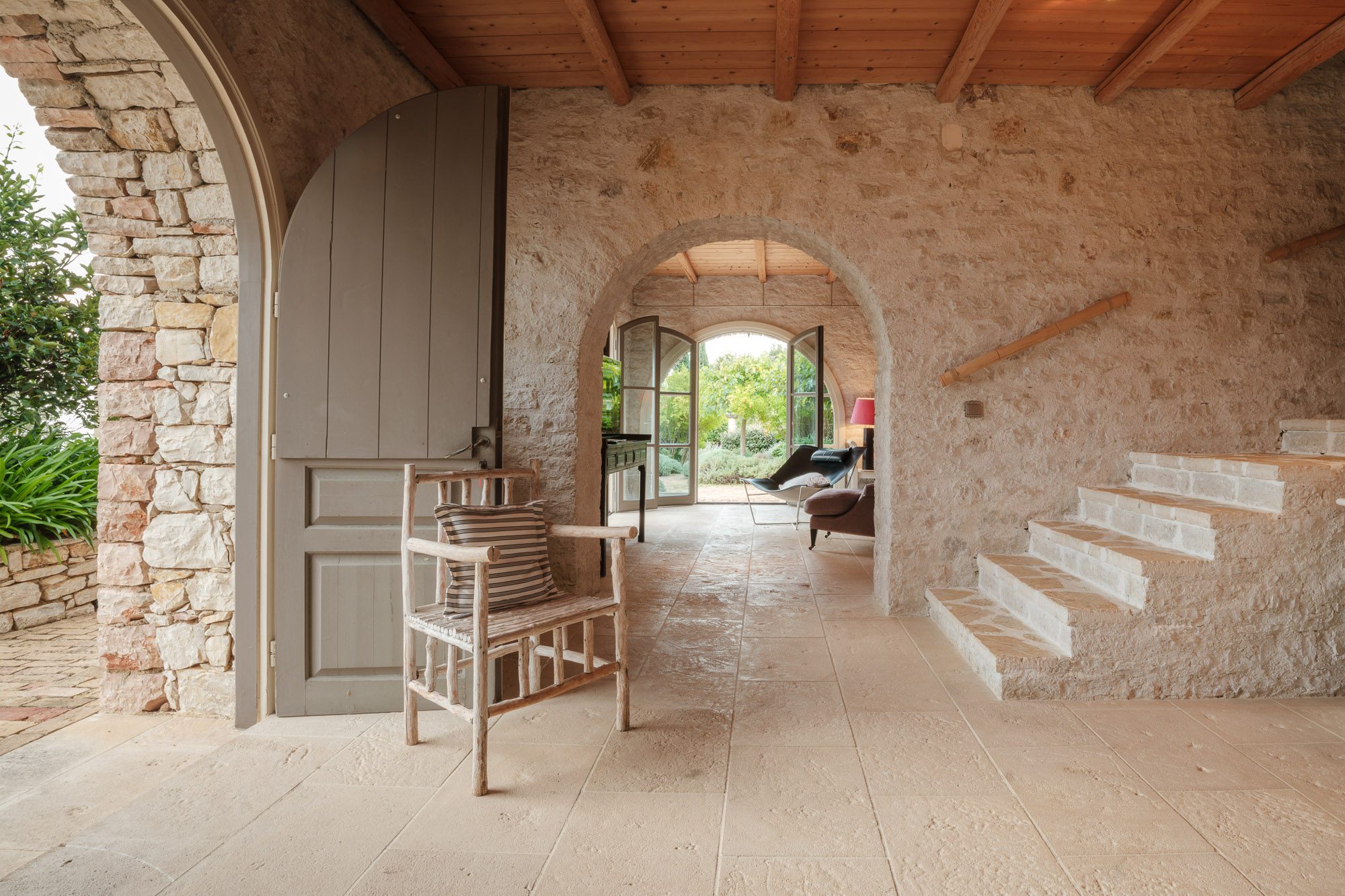 Both house and garden evoke English country style, mixed with Mediterranean warmth and colour. The furniture is classic but contemporary, there's an emphasis on comfort with style. The large bedrooms are air-conditioned, beds draped with mosquito nets, being practical and providing an air of romance. There's an open-plan country-style kitchen, dining room and drawing room with exposed stone walls and large glass doors opening to the gardens. In the tower, the guests can enjoy a library. The self-contained cottage has both indoor and outdoor dining spots and a garden area.