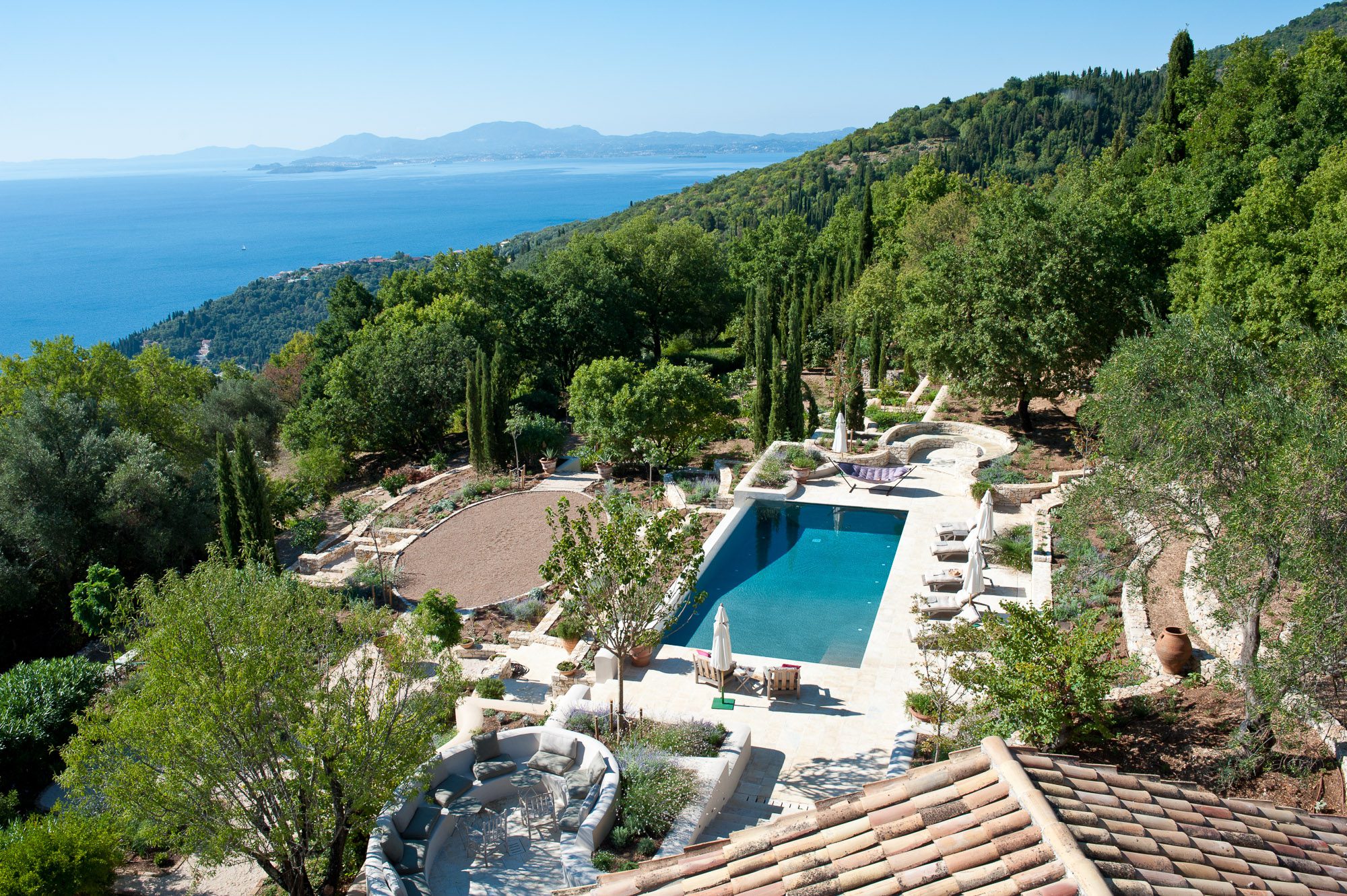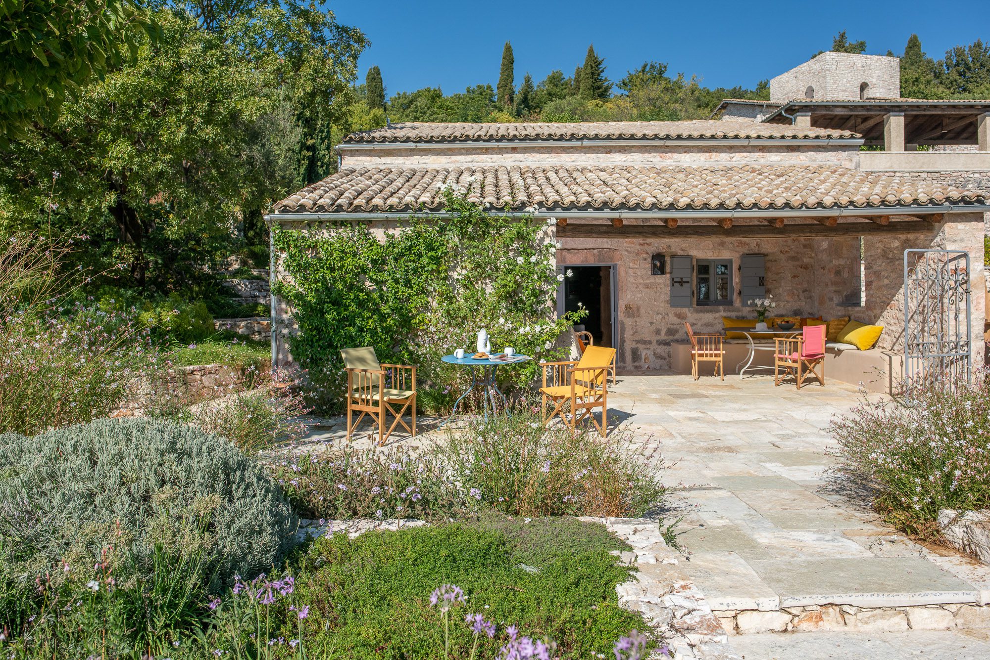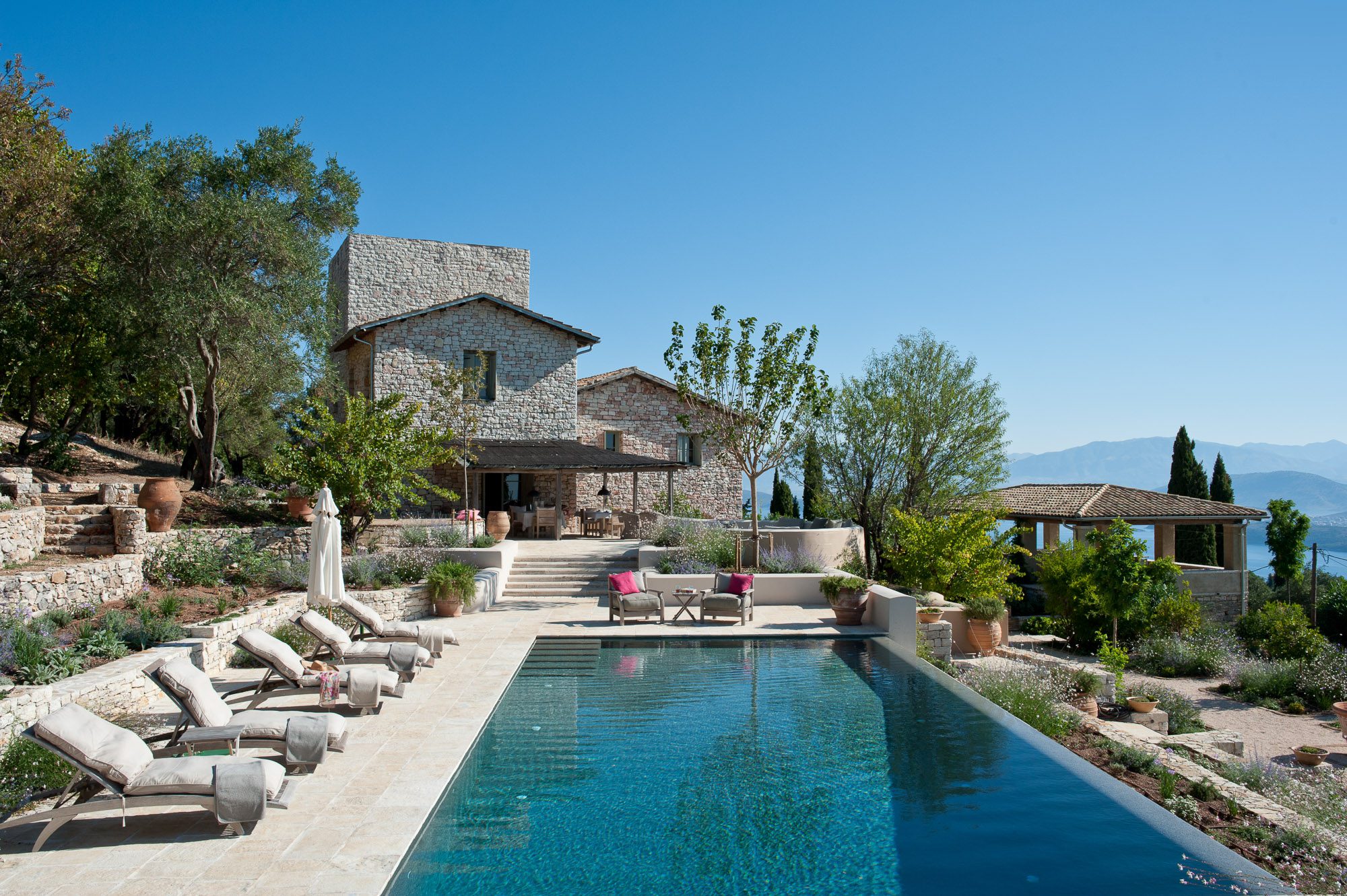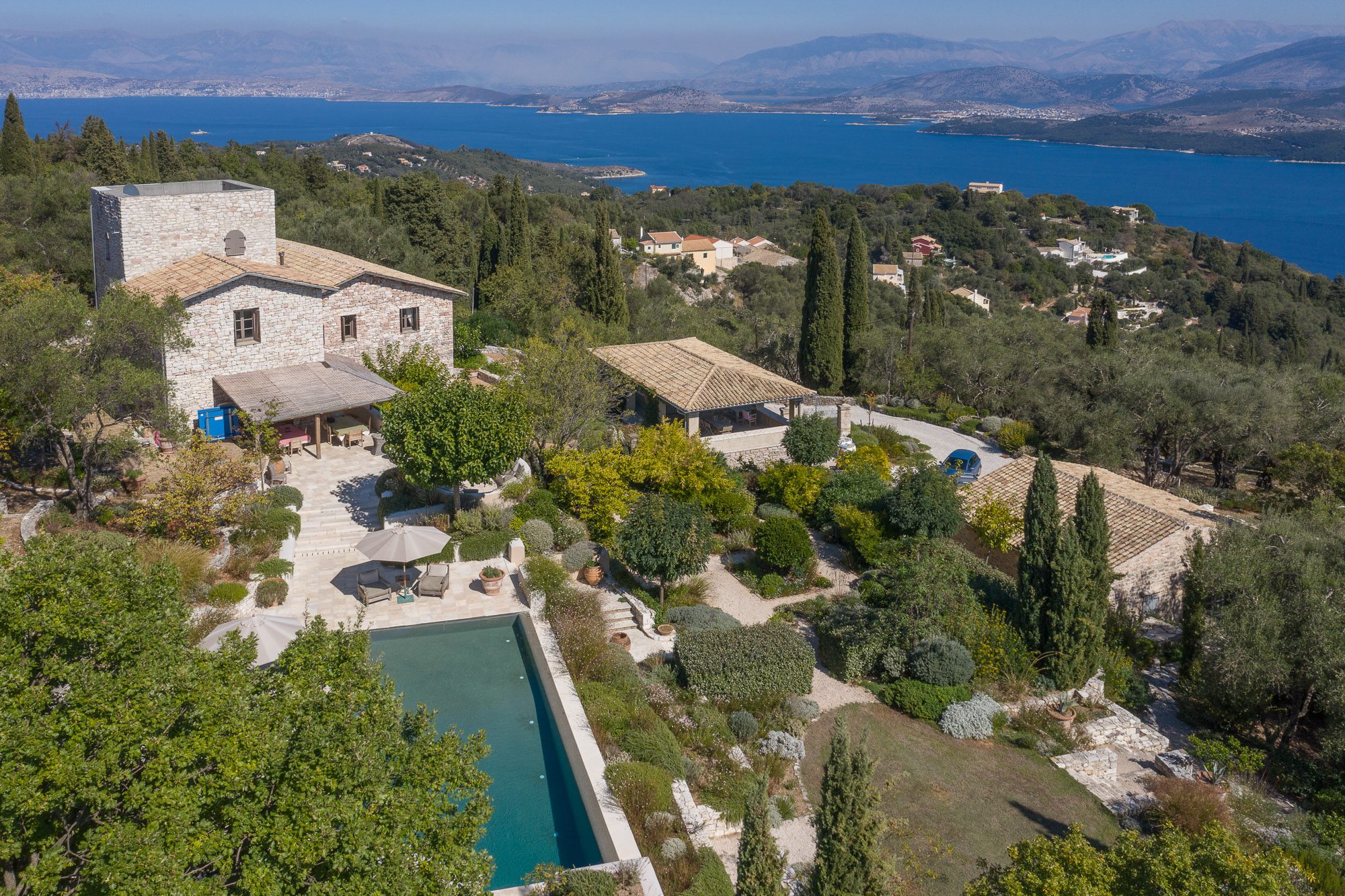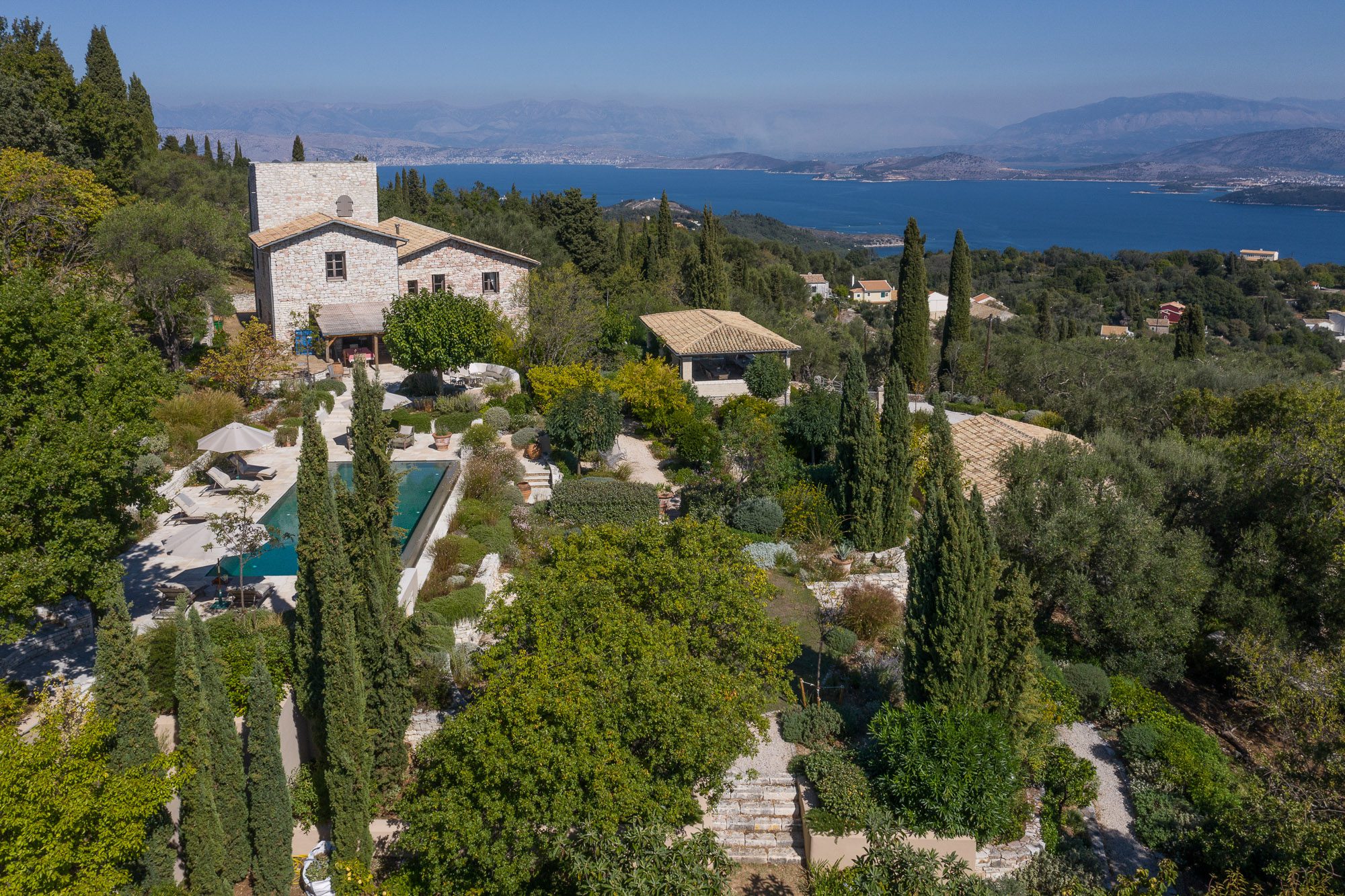 Featured in House & Garden in 2023, this artfully renovated stone house, complete with a tower, stands within 6.5 acres of ancient olive groves, surrounded by the most beautiful gardens. There's a good-sized pool with magnificent views across the Corfu straits to Albania.