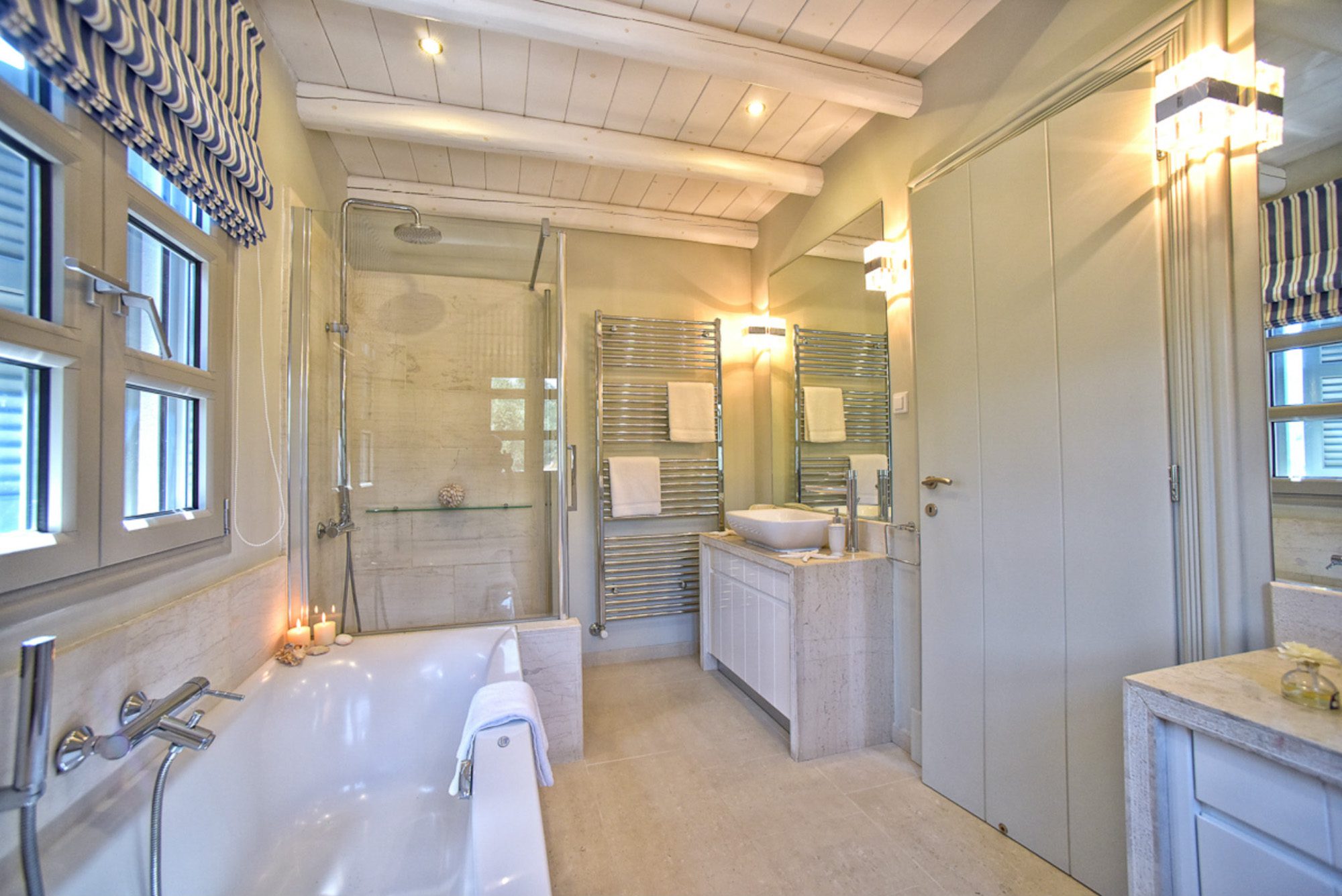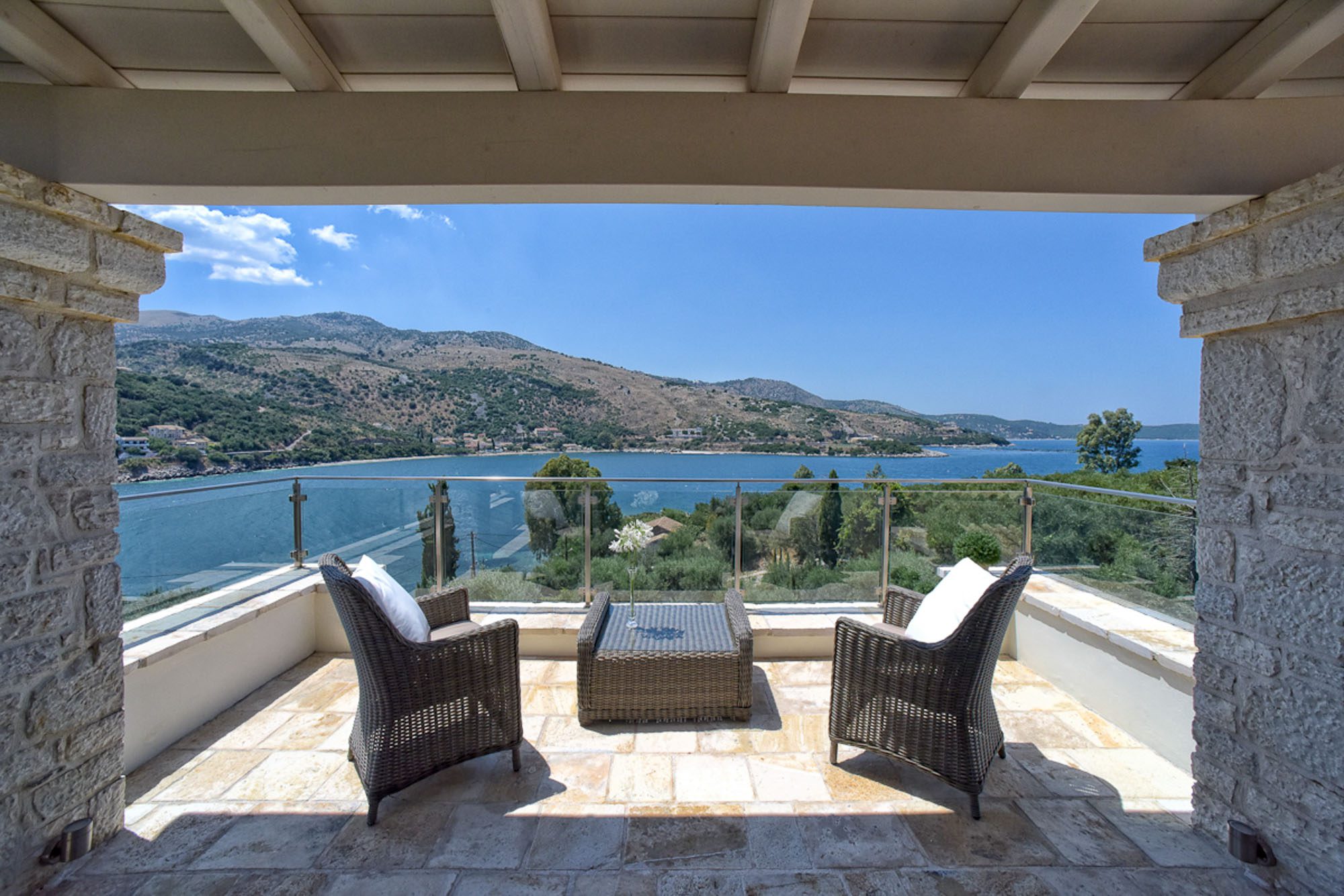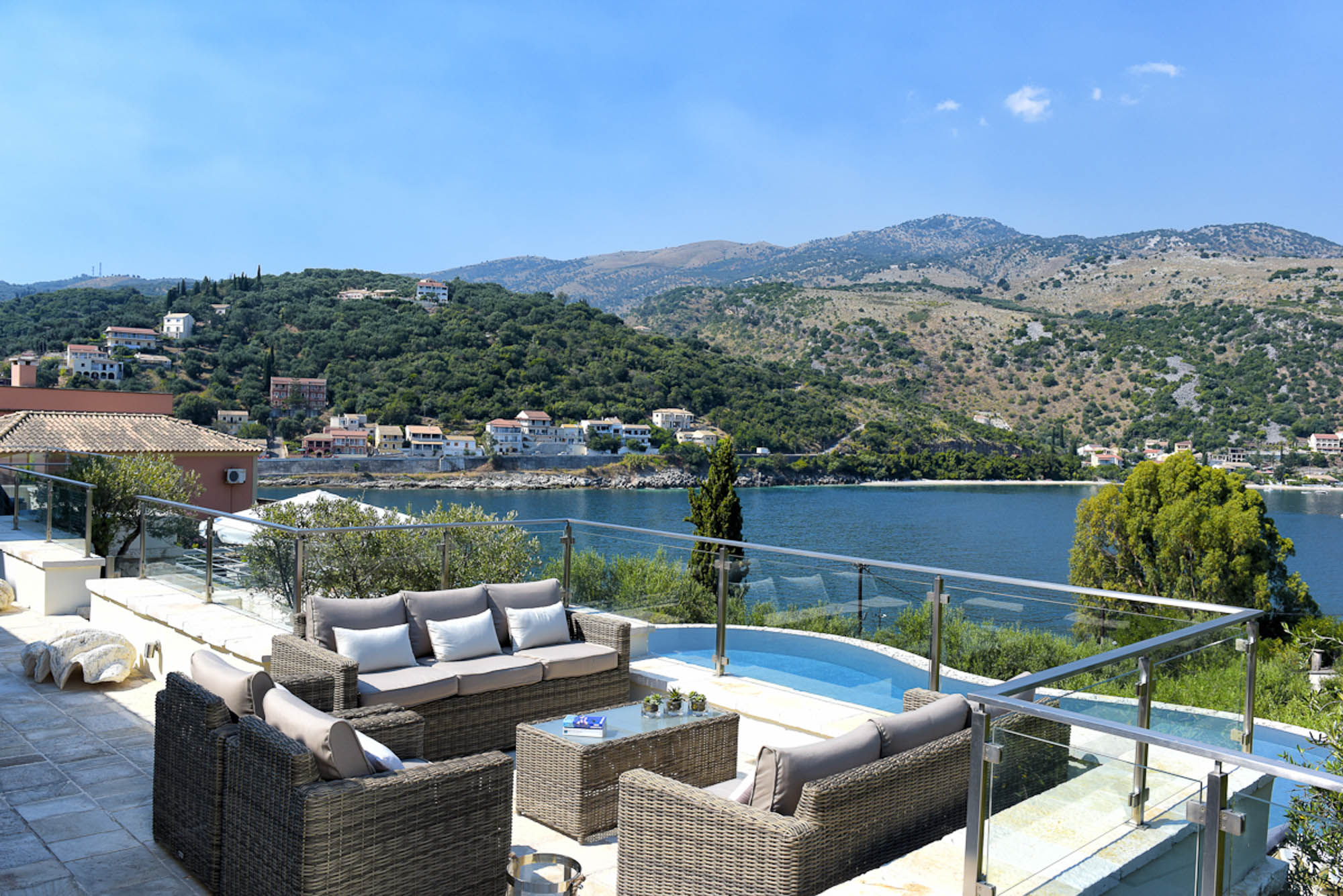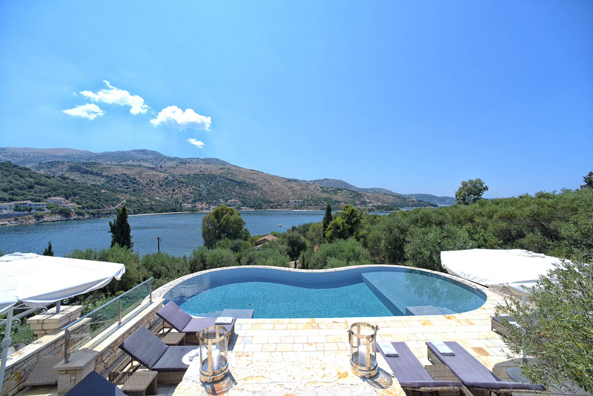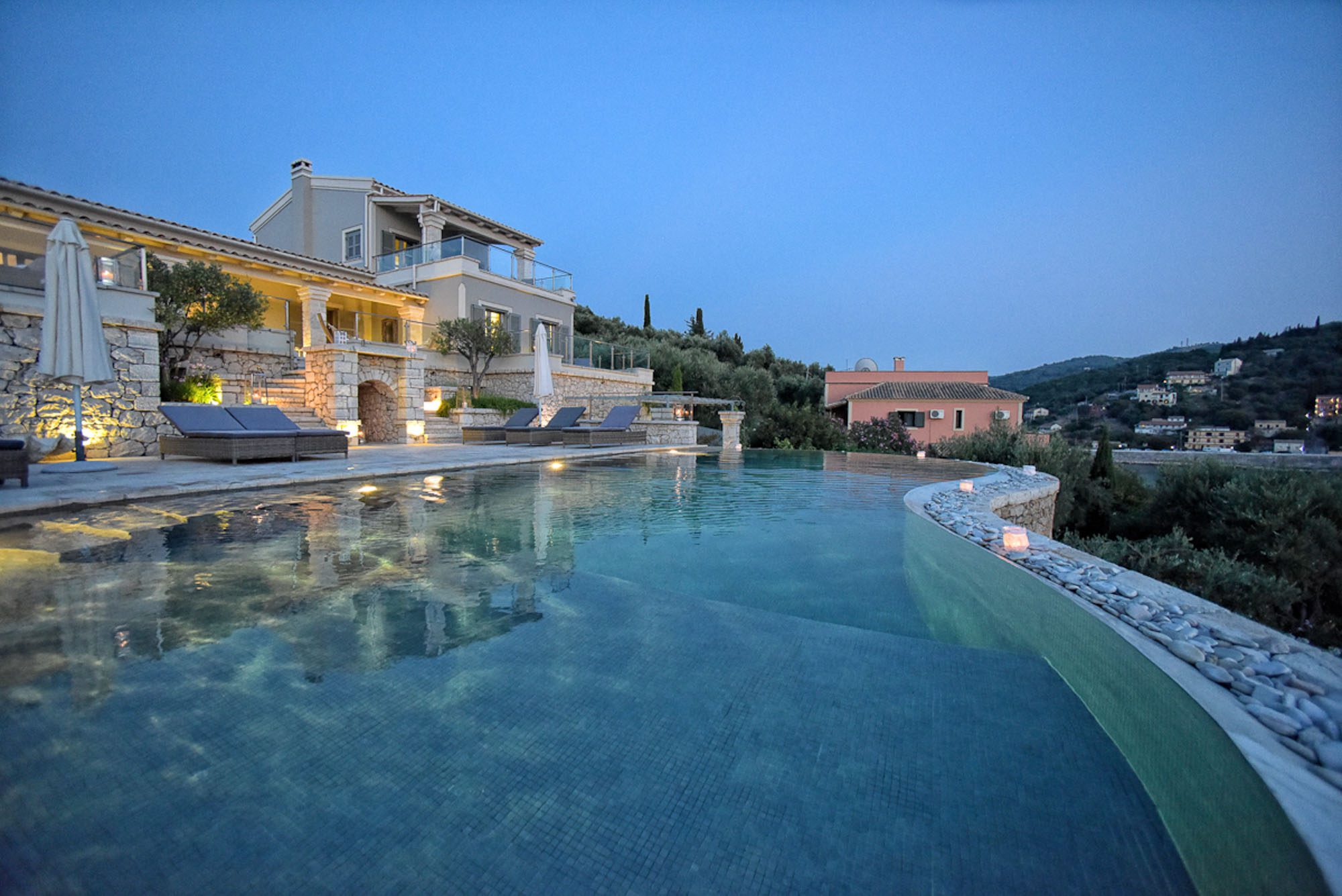 It has all the essential amenities, including a good choice of places to eat, as well as lots of souvenir shops, supermarkets, bakeries, and pharmacies. You could hire a boat here to keep moored at the villa's jetty and explore the island with ease. The pretty little fishing village of San Stephano is a 15 drive, and Agni is 20 minutes by car. You could also visit Corfu Town, only half an hour, with a fast boat. There is much to see, from the UNESCO-registered Old Town with its Venetian fortress and narrow streets to the wealth of restaurants and shops both here and in the new town.