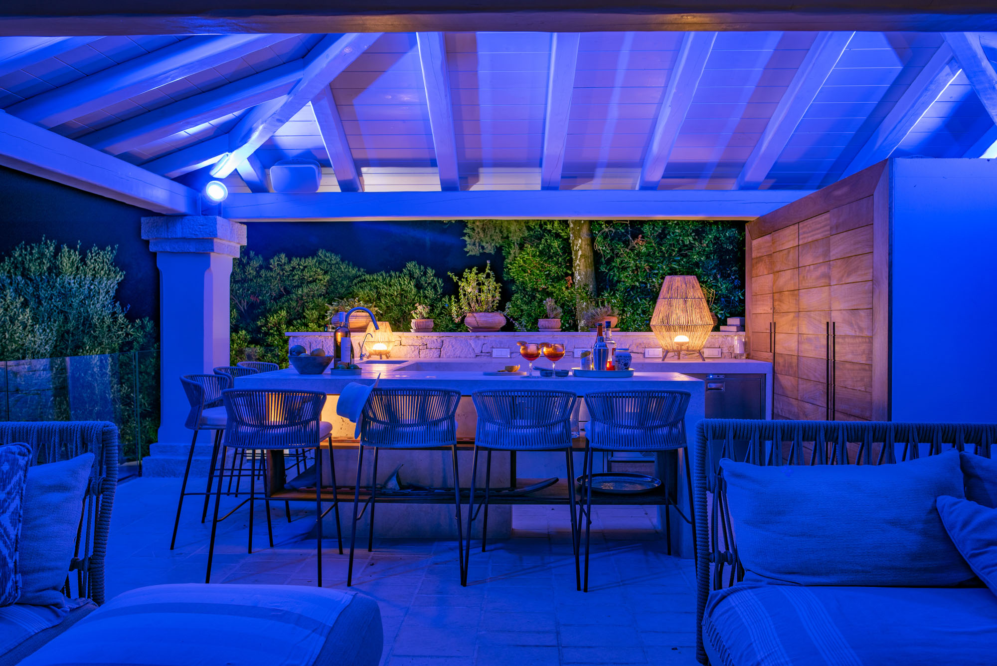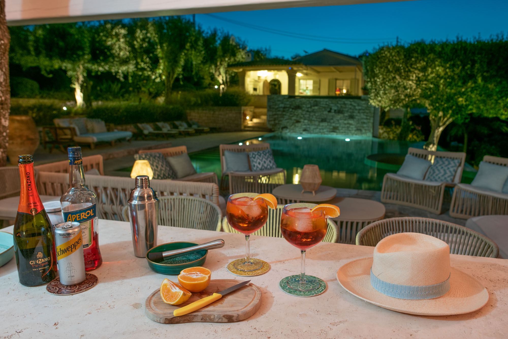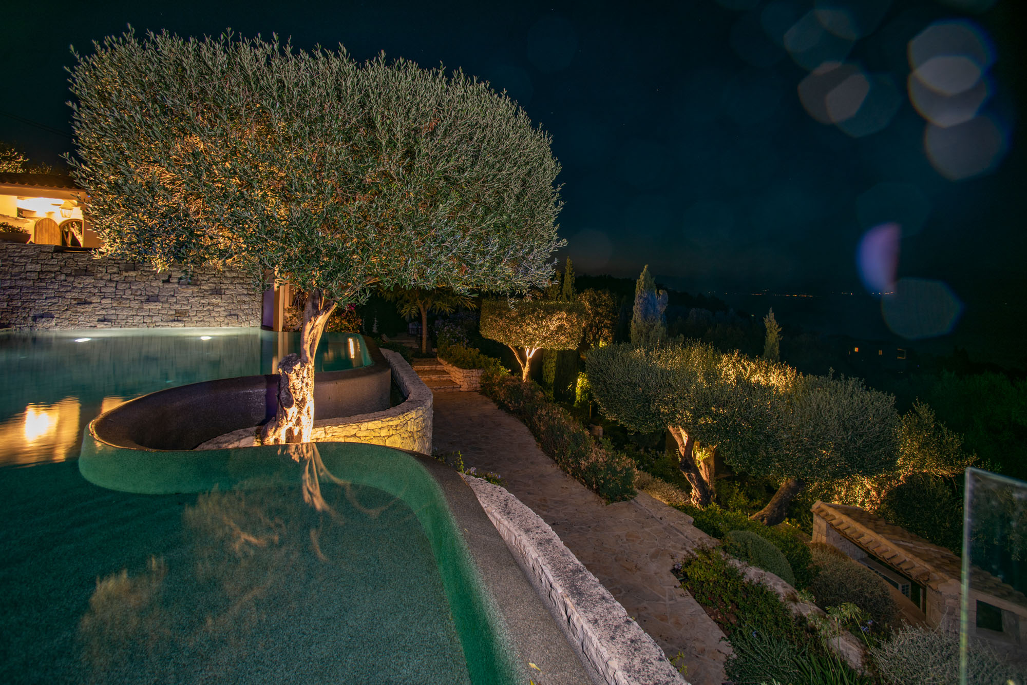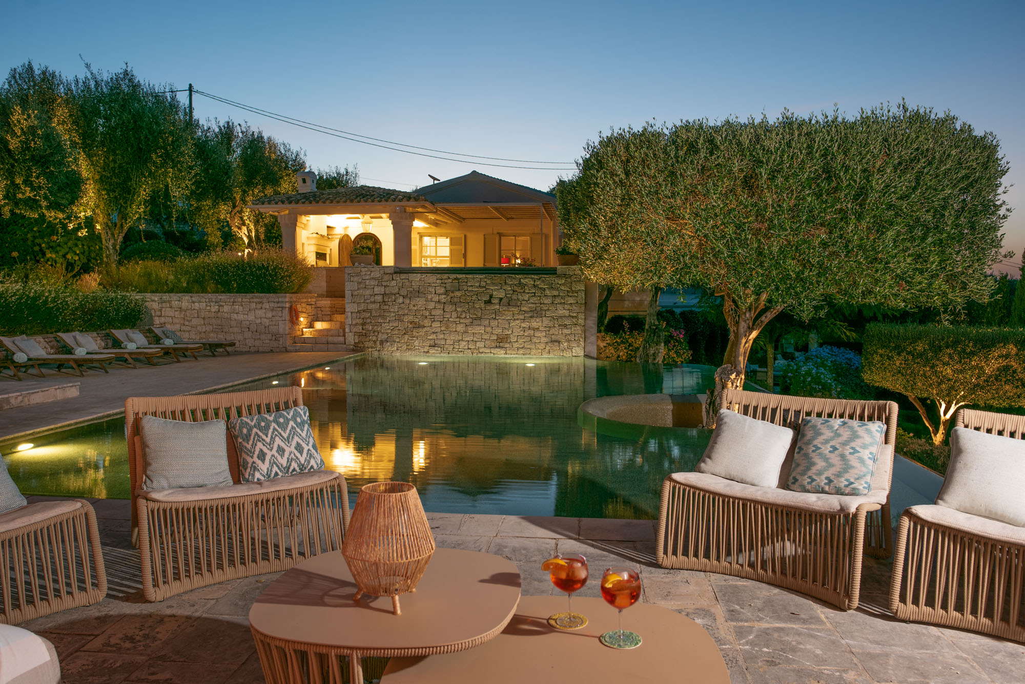 The eye-catching infinity pool sinuously curves around two mature olive trees and is a real focal point. On the surrounding terraces are sun loungers, day-bed, hammock plus a fully equipped and covered outdoor bar area. Within the garden there is a table tennis table and pétanque court for boules and other garden games.