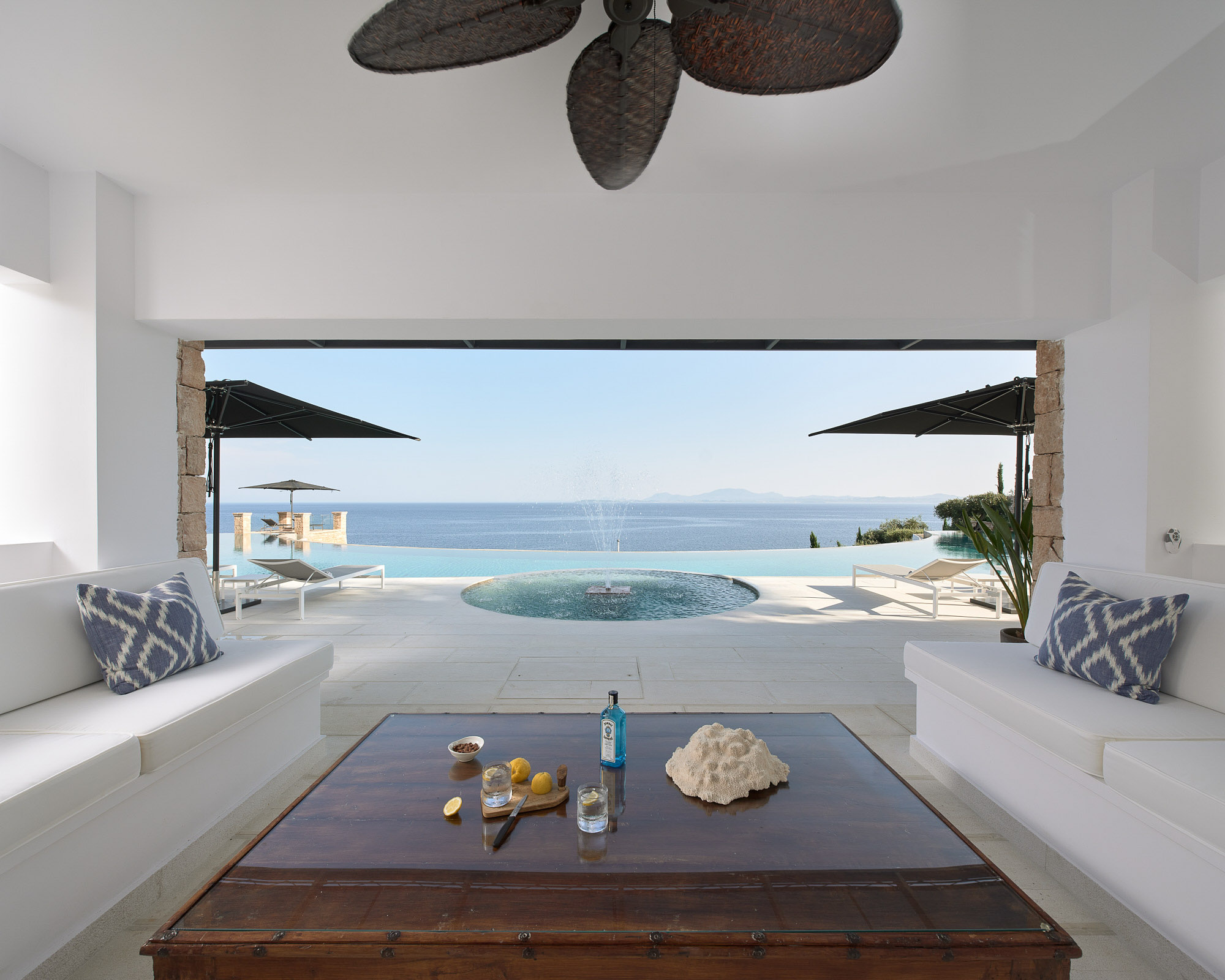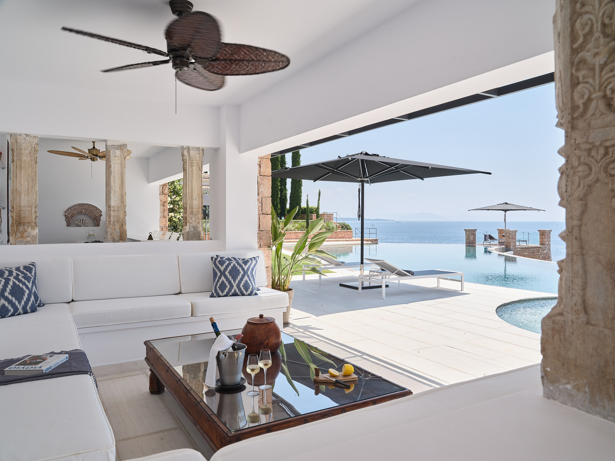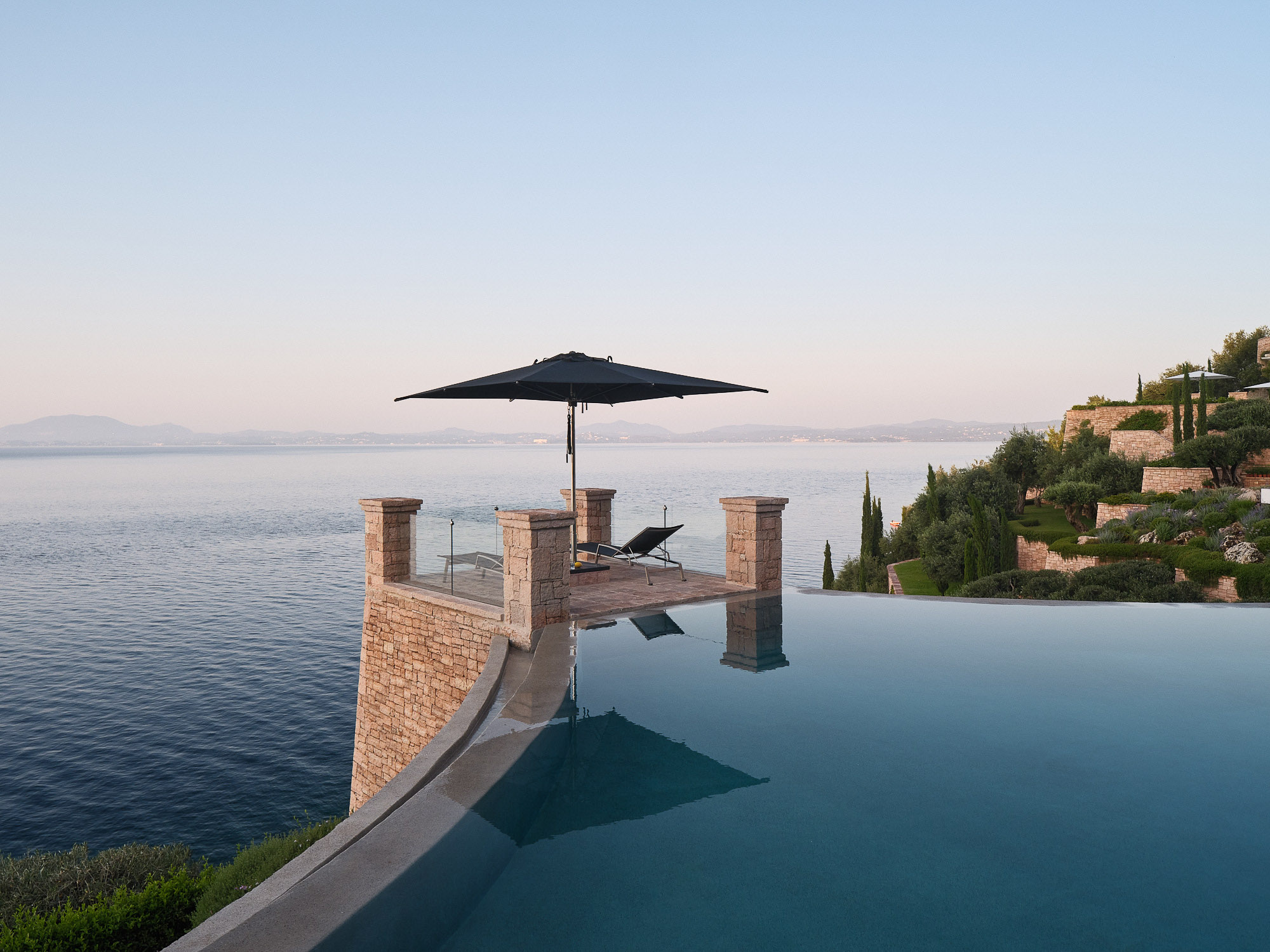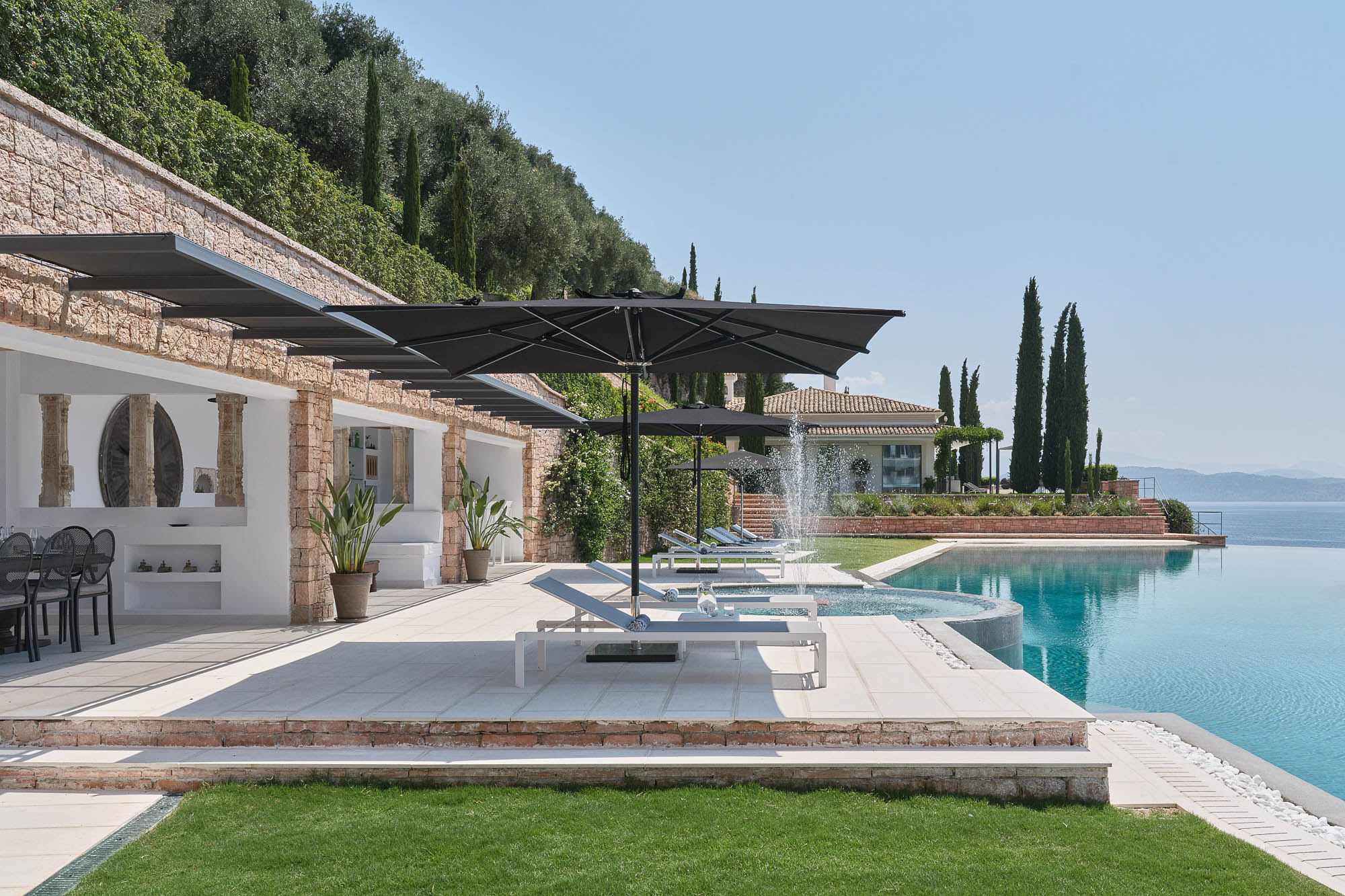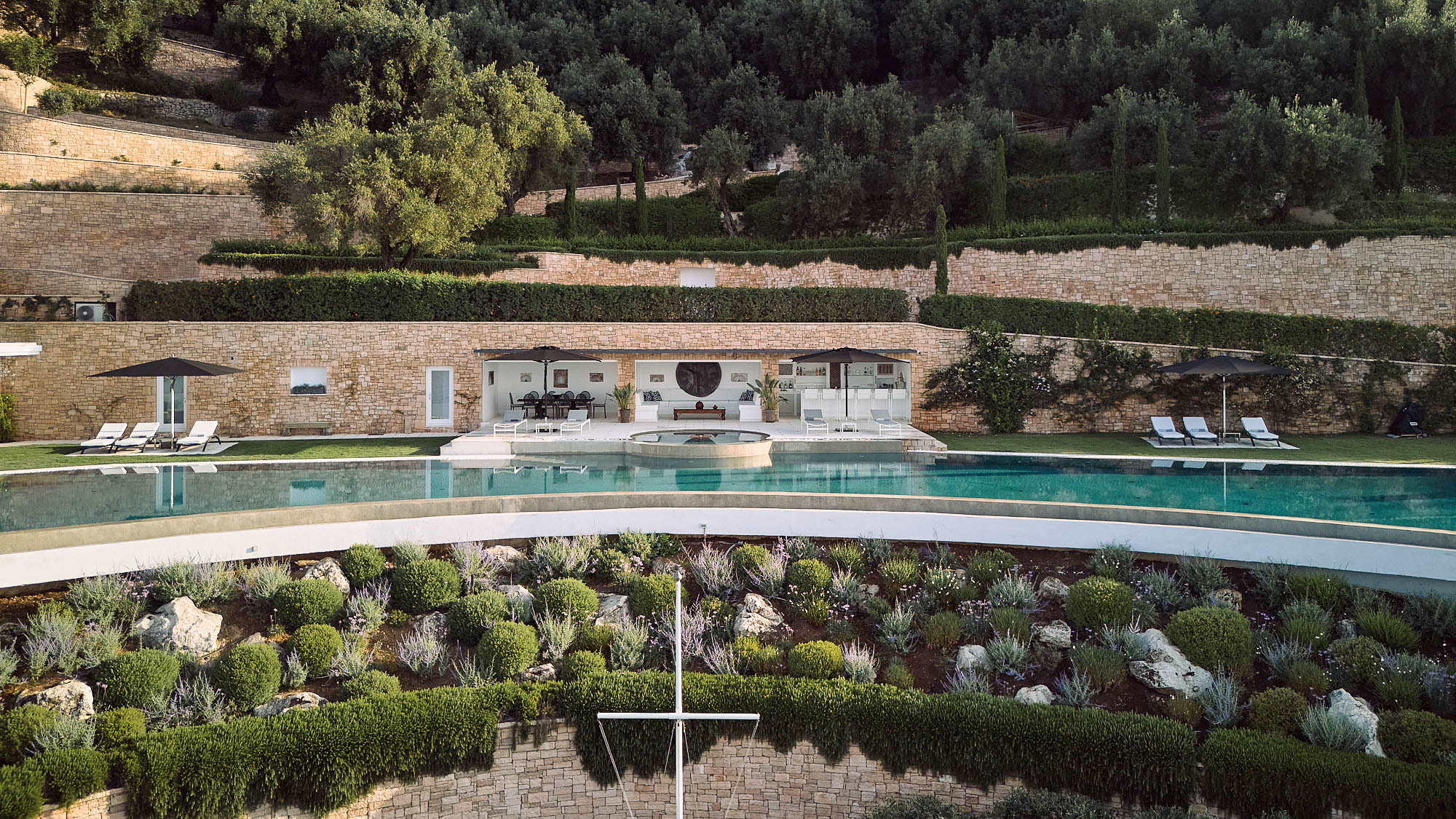 A series of landscaped terraces cascade down to the private seafront and jetty, offering multiple sunbathing decks and peaceful seating nooks. The show-stopping 65m infinity pool faces south, with uninterrupted 180-degree sea views. Above it, an elevated circular plunge pool with built-in seating and a cascading waterfall creates a striking focal point. The pool cabana offers generous alfresco dining, a lounge area, and a well-appointed bar — the perfect setting for long summer lunches or sunset cocktails. Shaded pergolas with plush sunbeds are dotted throughout the estate, ensuring every guest finds their own tranquil corner to unwind.
