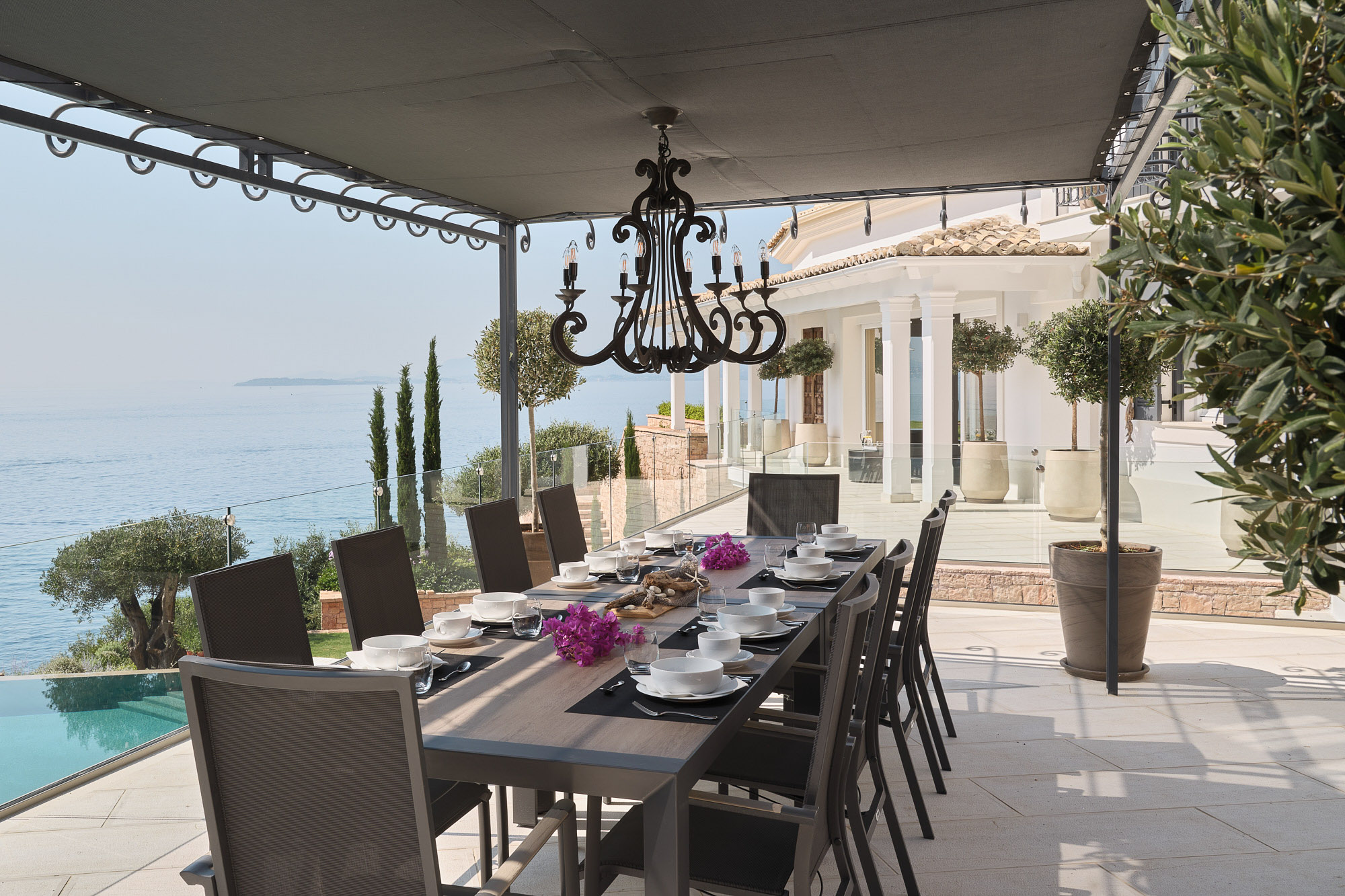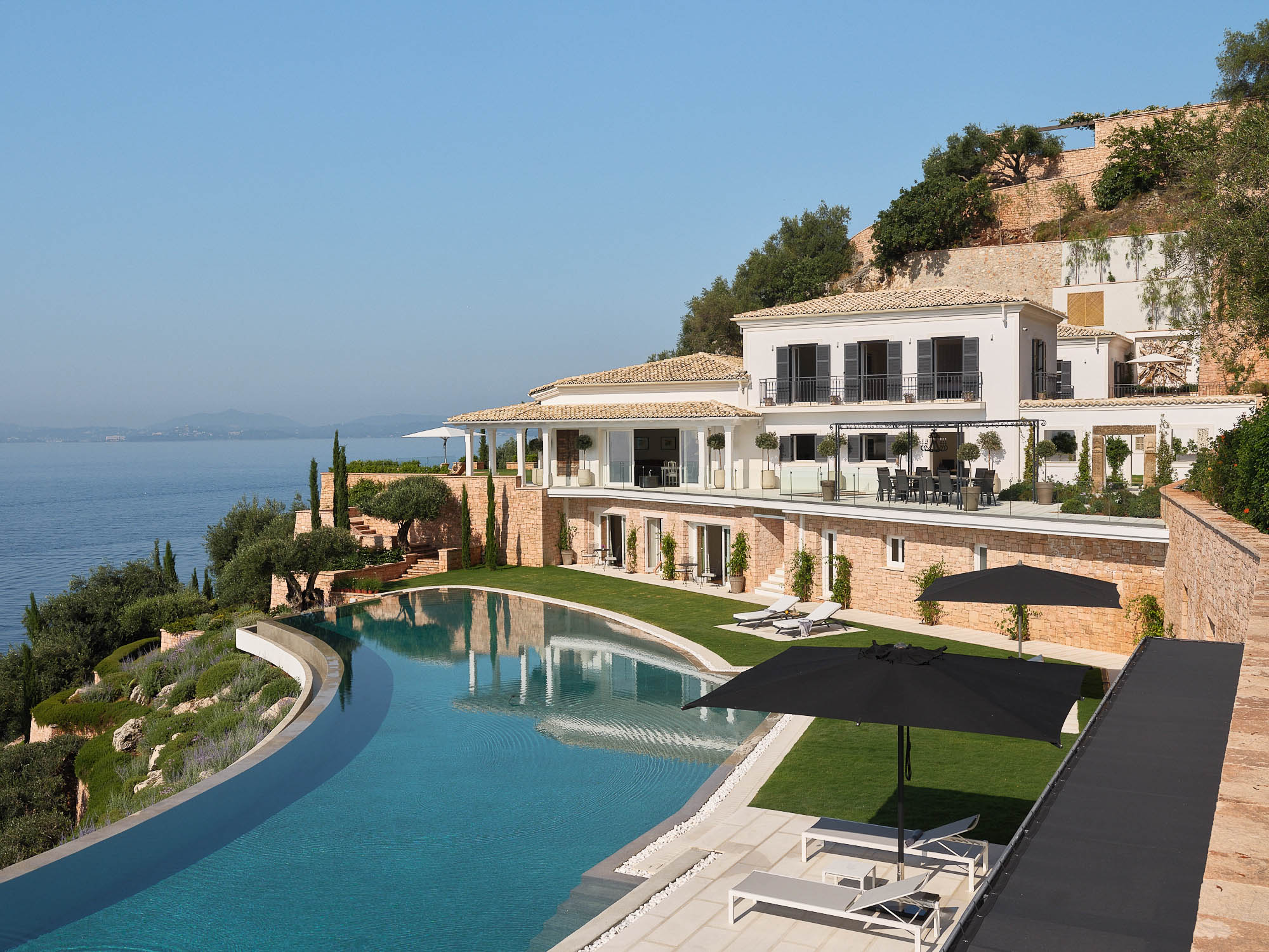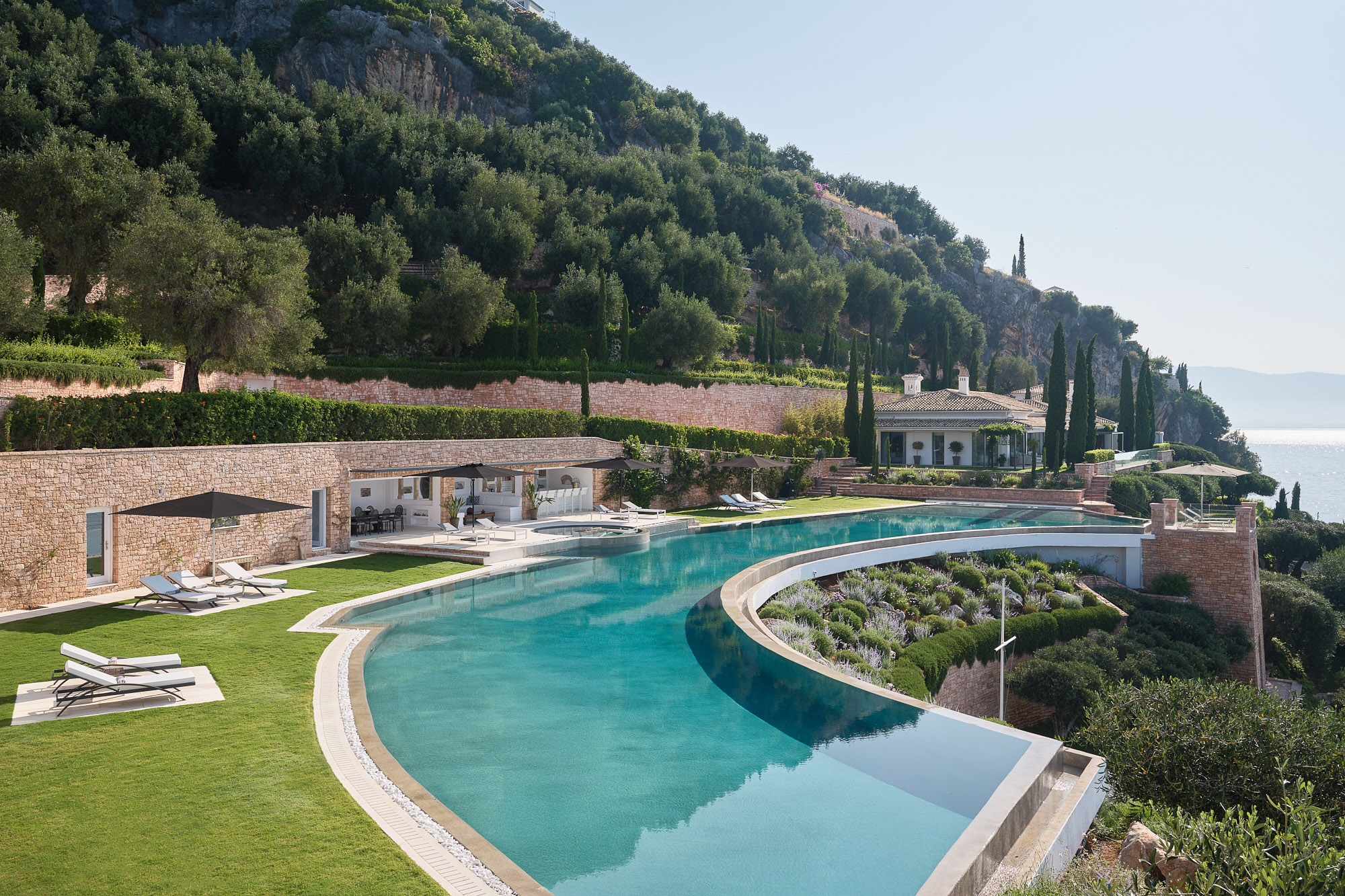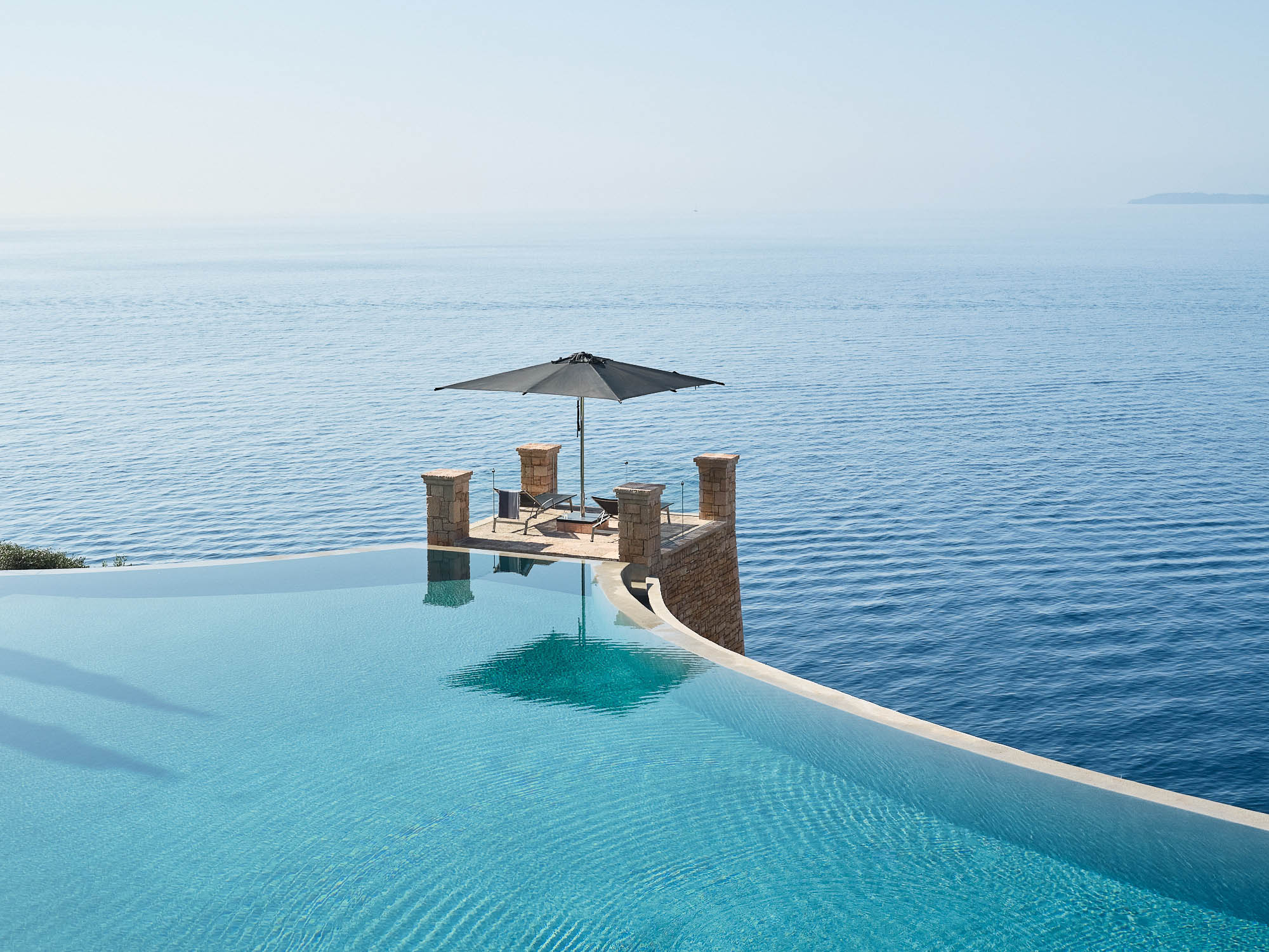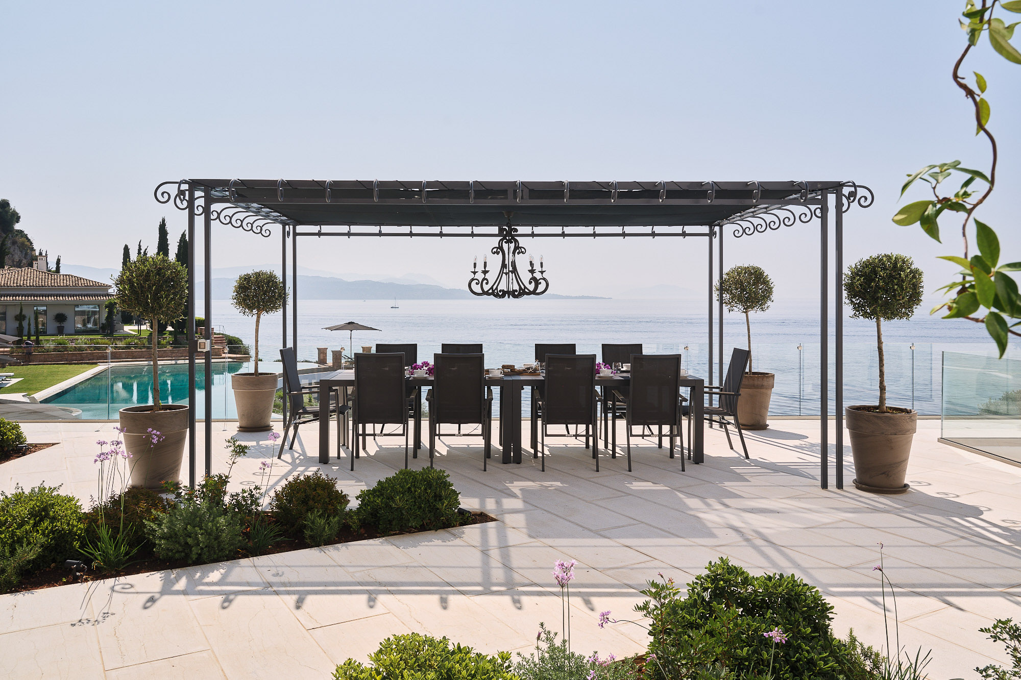 A series of landscaped terraces cascade down to the private seafront and jetty, offering multiple sunbathing decks and peaceful seating nooks. The show-stopping 65m infinity pool faces south, with uninterrupted 180-degree sea views. Above it, an elevated circular plunge pool with built-in seating and a cascading waterfall creates a striking focal point. The pool cabana offers generous alfresco dining, a lounge area, and a well-appointed bar — the perfect setting for long summer lunches or sunset cocktails. Shaded pergolas with plush sunbeds are dotted throughout the estate, ensuring every guest finds their own tranquil corner to unwind.