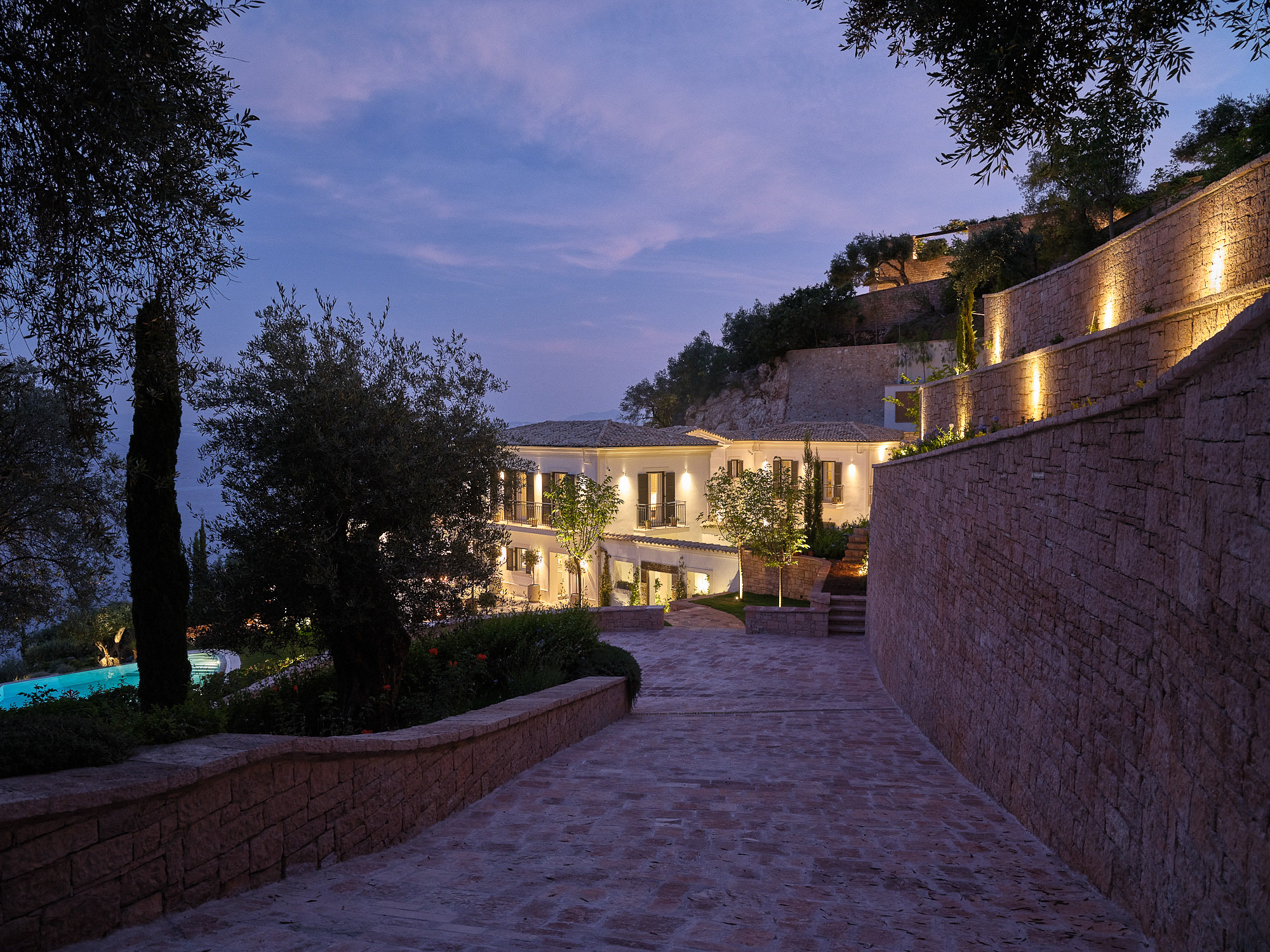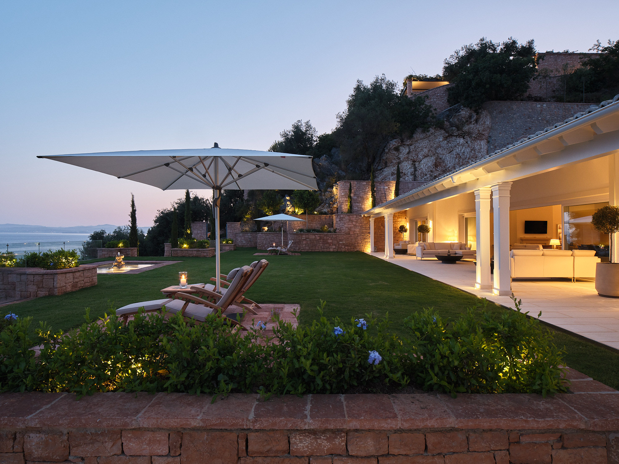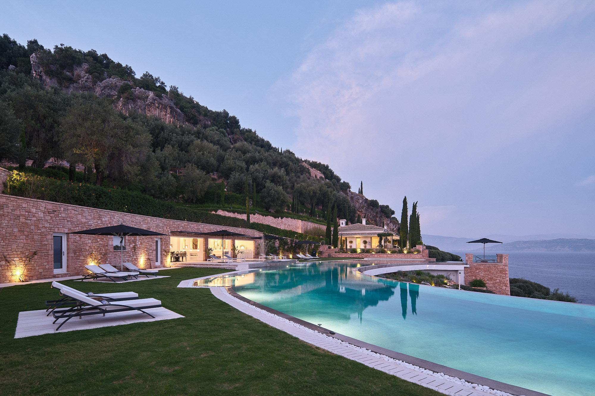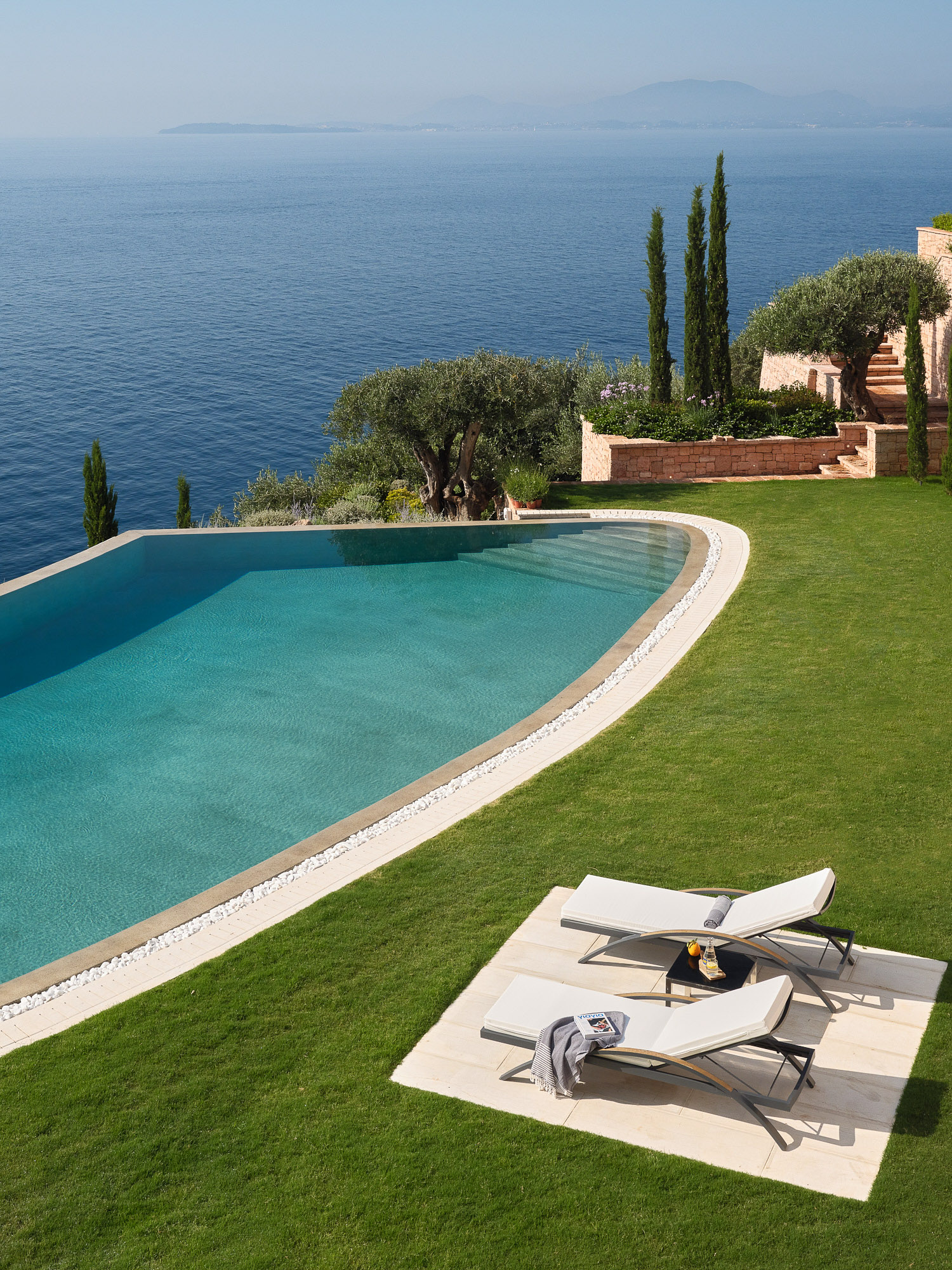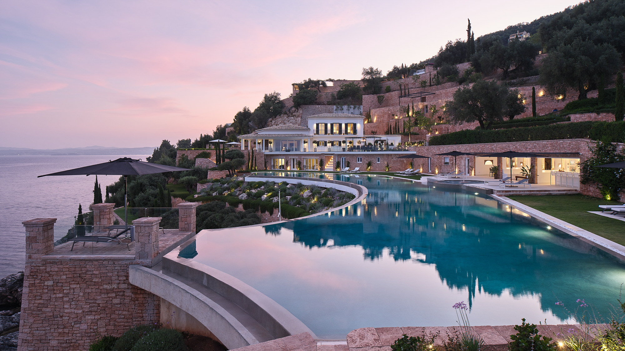 A series of landscaped terraces cascade down to the private seafront and jetty, offering multiple sunbathing decks and peaceful seating nooks. The show-stopping 65m infinity pool faces south, with uninterrupted 180-degree sea views. Above it, an elevated circular plunge pool with built-in seating and a cascading waterfall creates a striking focal point. The pool cabana offers generous alfresco dining, a lounge area, and a well-appointed bar — the perfect setting for long summer lunches or sunset cocktails. Shaded pergolas with plush sunbeds are dotted throughout the estate, ensuring every guest finds their own tranquil corner to unwind.