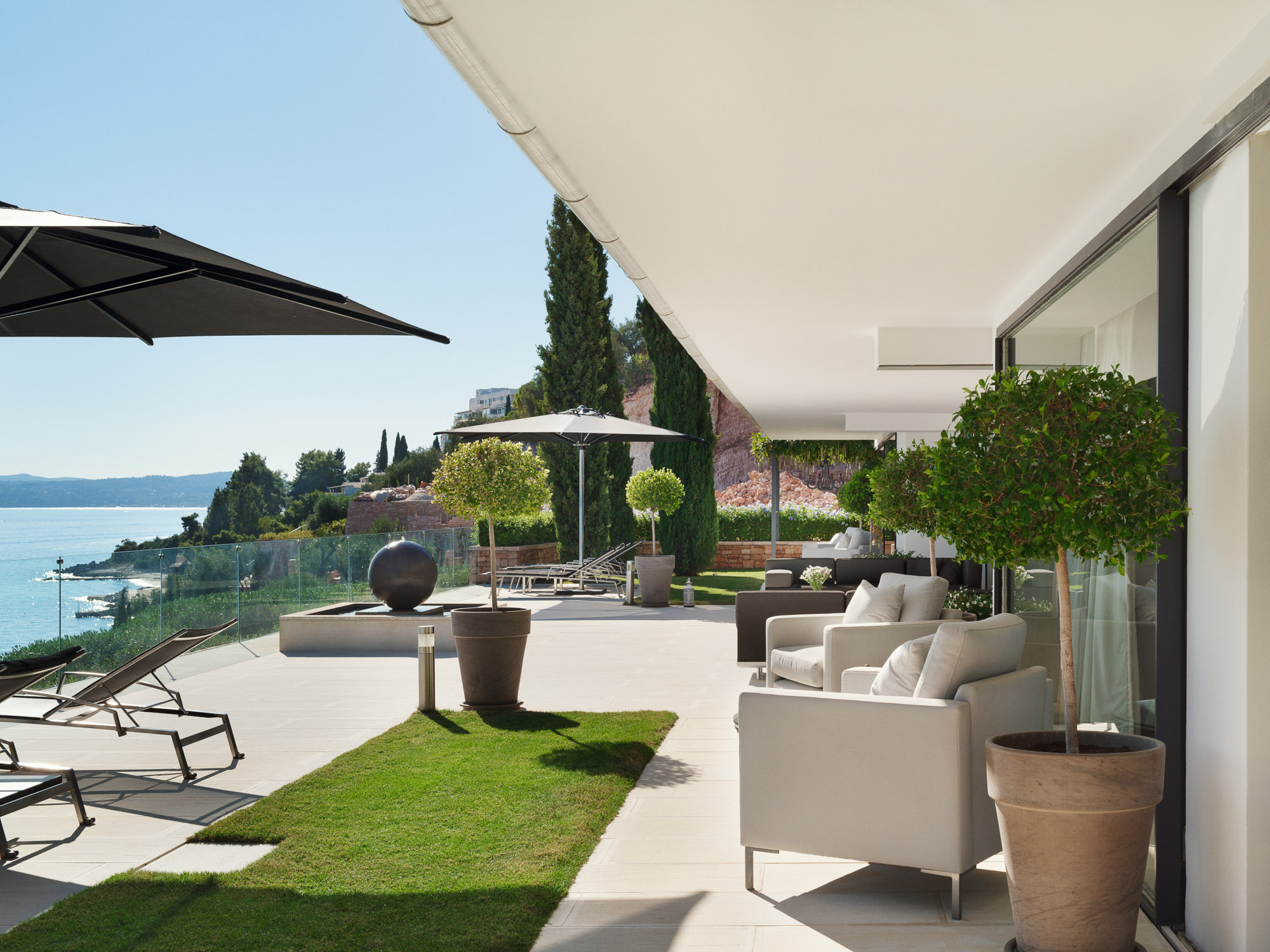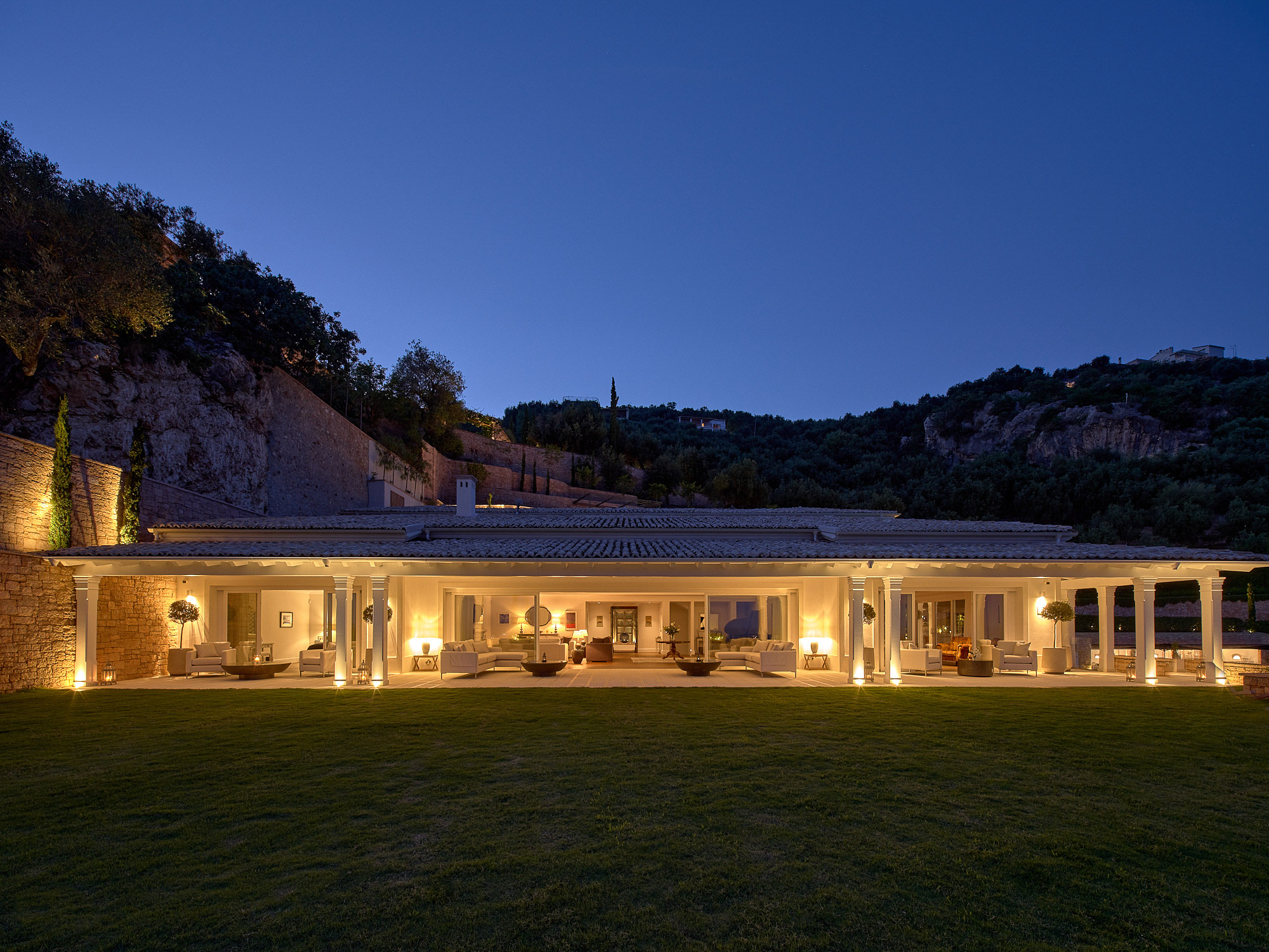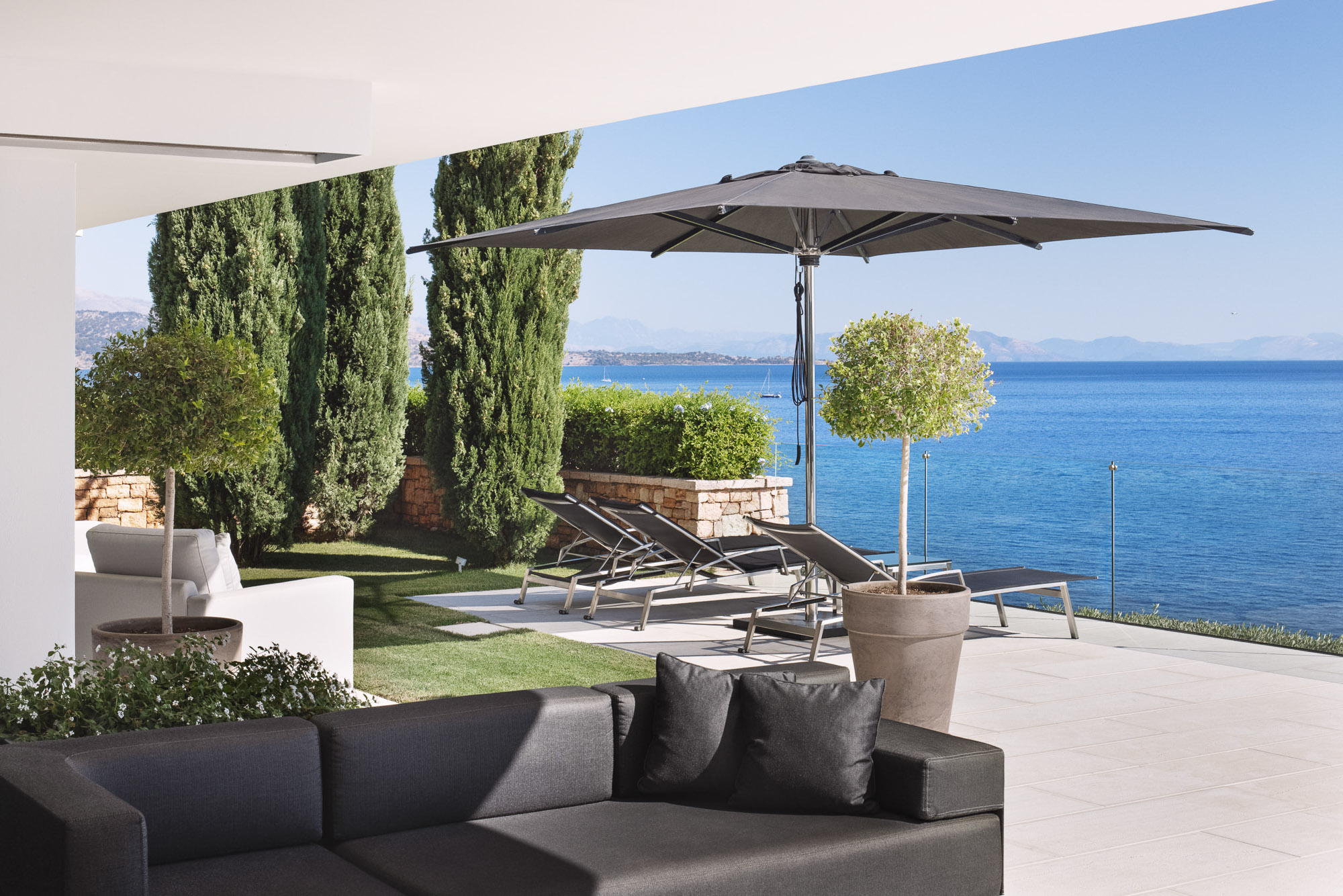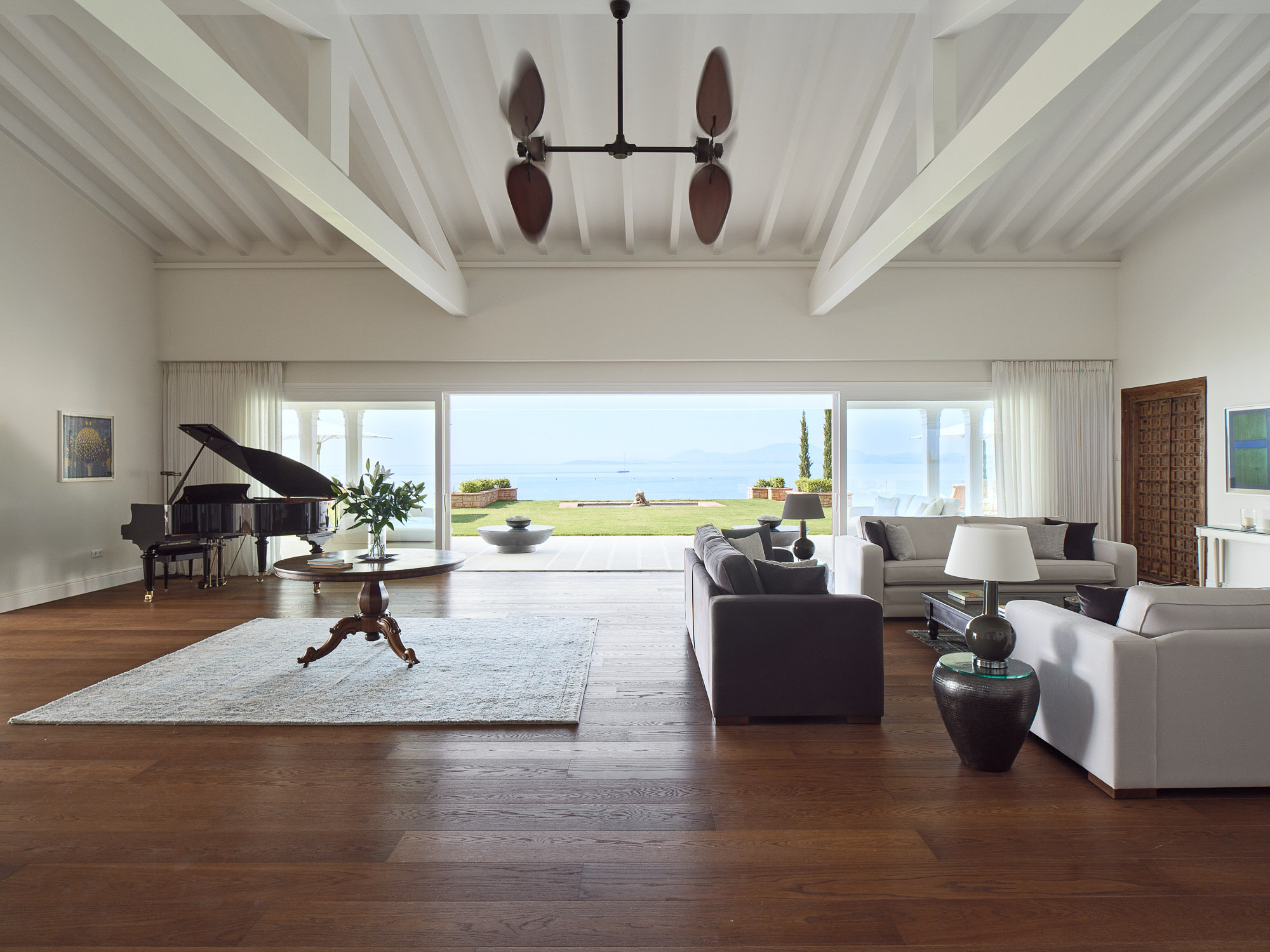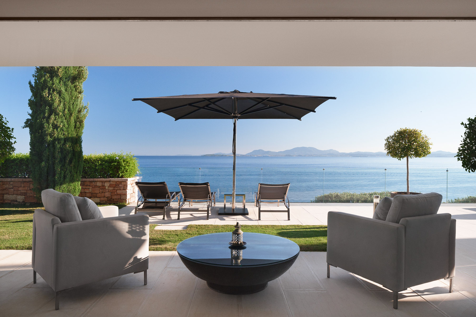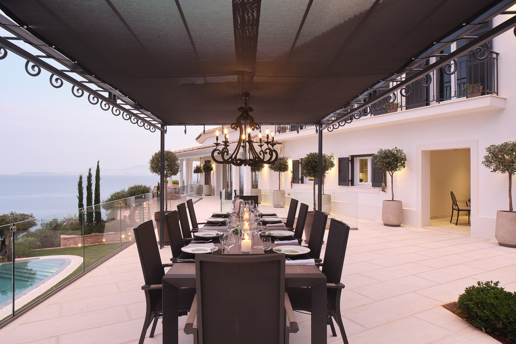 A series of landscaped terraces cascade down to the private seafront and jetty, offering multiple sunbathing decks and peaceful seating nooks. The show-stopping 65m infinity pool faces south, with uninterrupted 180-degree sea views. Above it, an elevated circular plunge pool with built-in seating and a cascading waterfall creates a striking focal point. The pool cabana offers generous alfresco dining, a lounge area, and a well-appointed bar — the perfect setting for long summer lunches or sunset cocktails. Shaded pergolas with plush sunbeds are dotted throughout the estate, ensuring every guest finds their own tranquil corner to unwind.