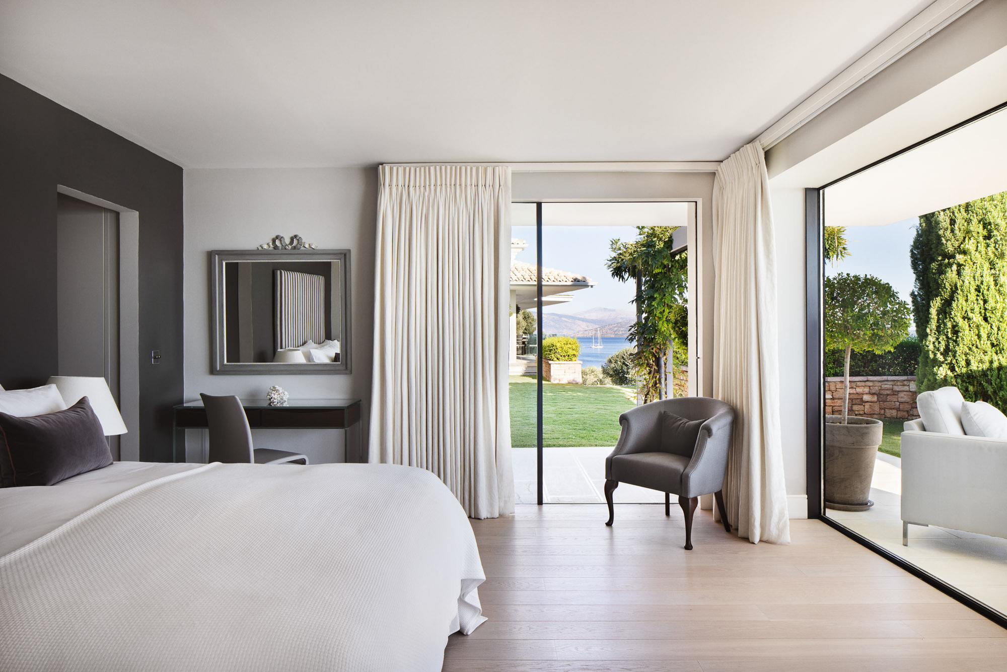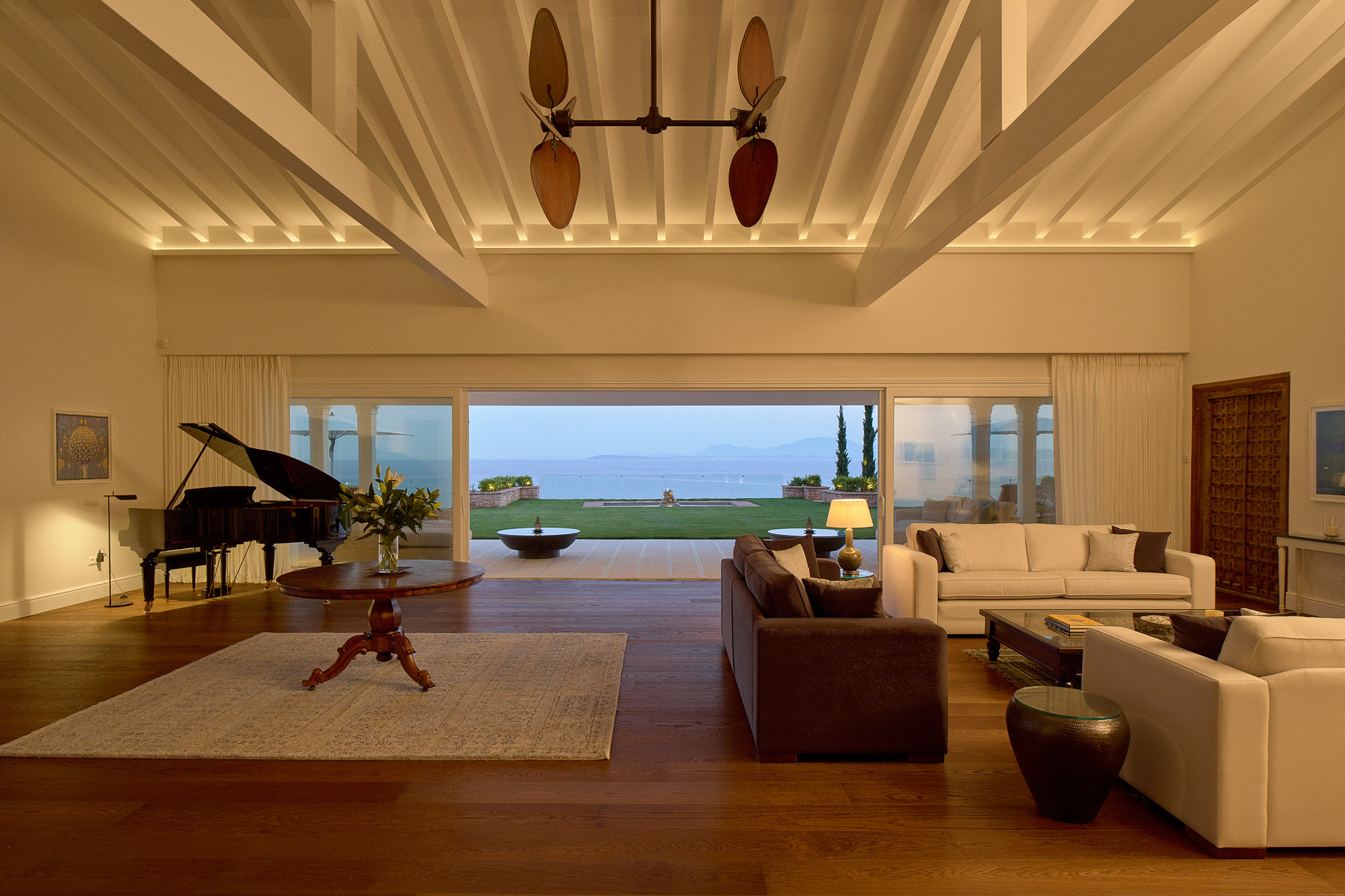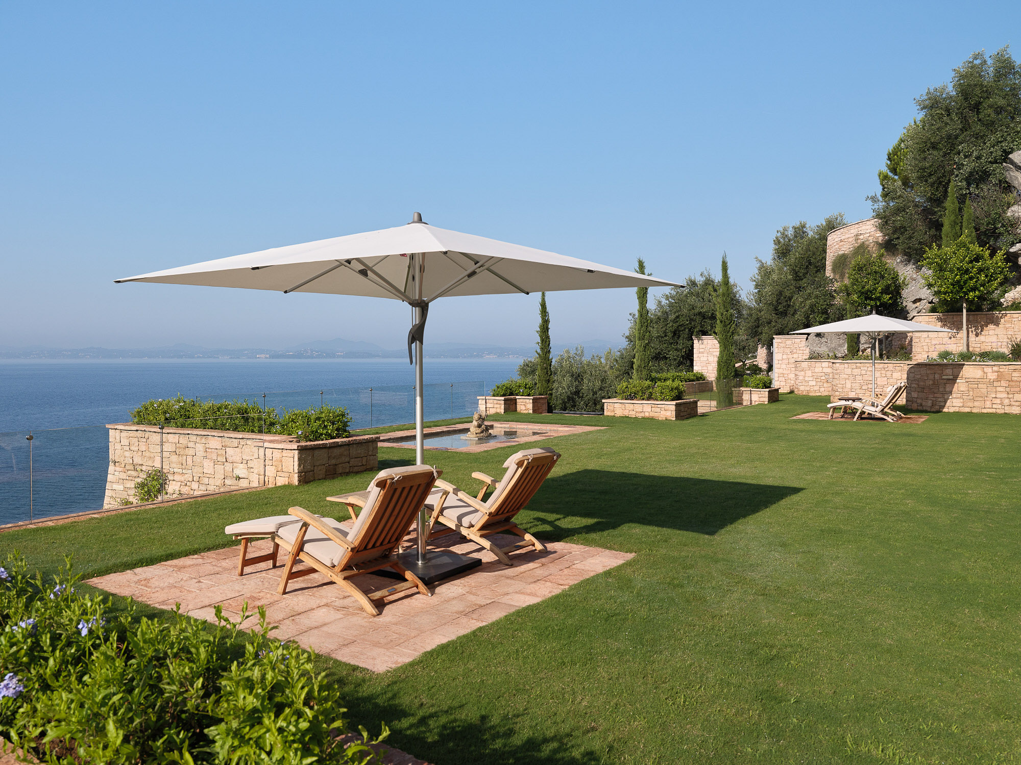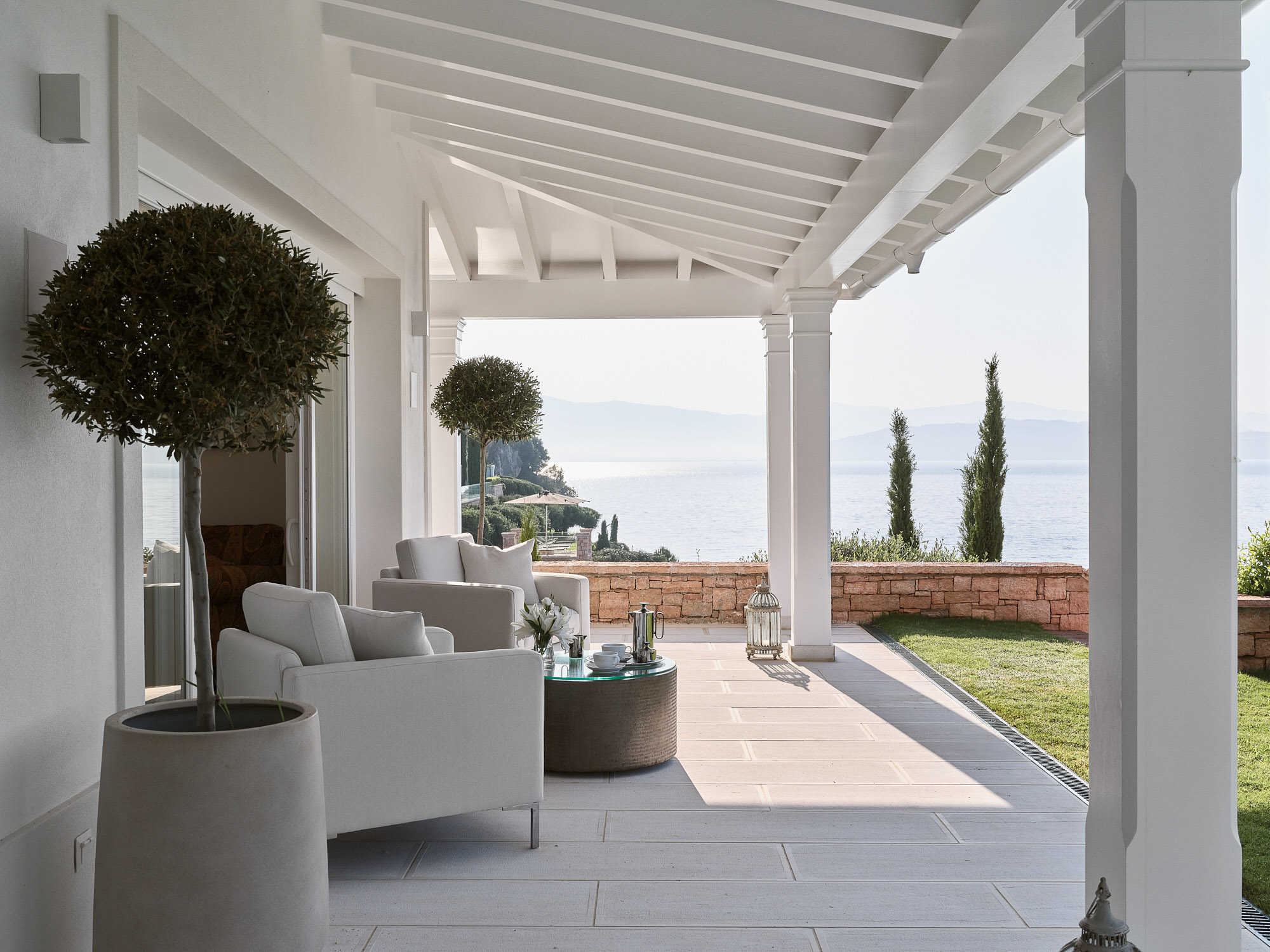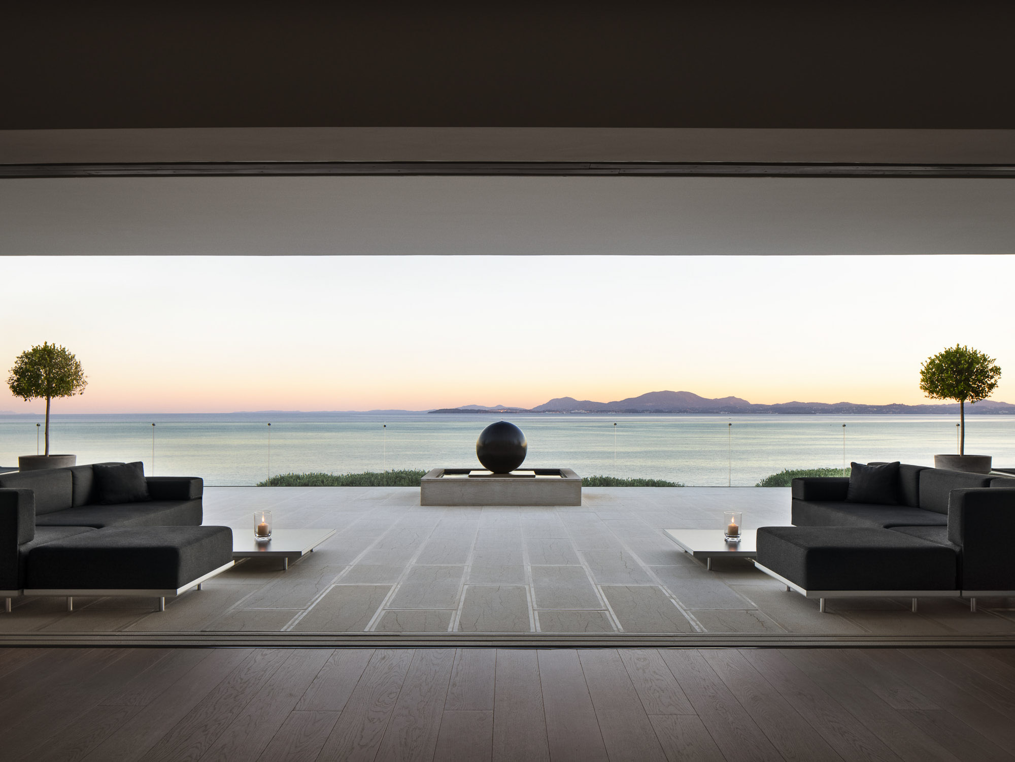 A series of landscaped terraces cascade down to the private seafront and jetty, offering multiple sunbathing decks and peaceful seating nooks. The show-stopping 65m infinity pool faces south, with uninterrupted 180-degree sea views. Above it, an elevated circular plunge pool with built-in seating and a cascading waterfall creates a striking focal point. The pool cabana offers generous alfresco dining, a lounge area, and a well-appointed bar — the perfect setting for long summer lunches or sunset cocktails. Shaded pergolas with plush sunbeds are dotted throughout the estate, ensuring every guest finds their own tranquil corner to unwind.