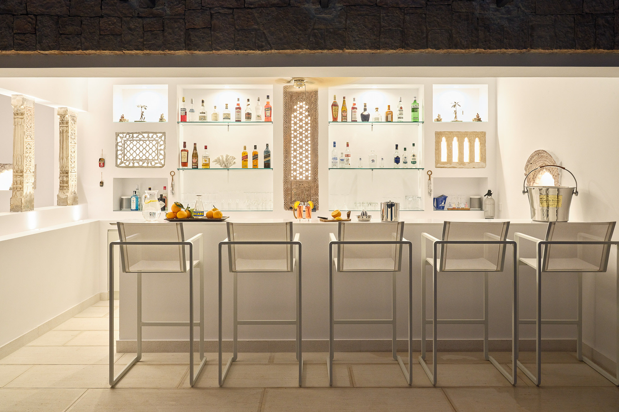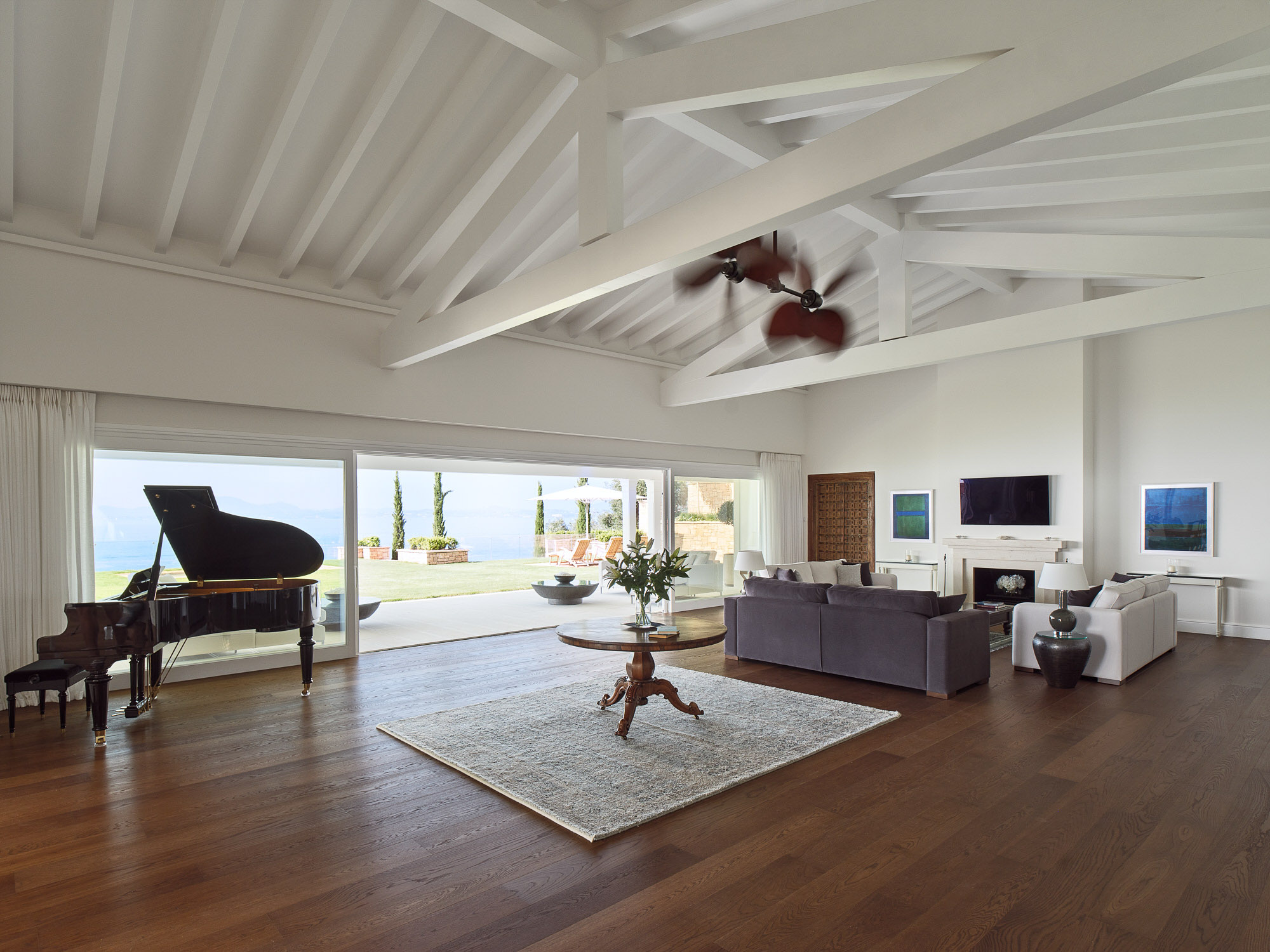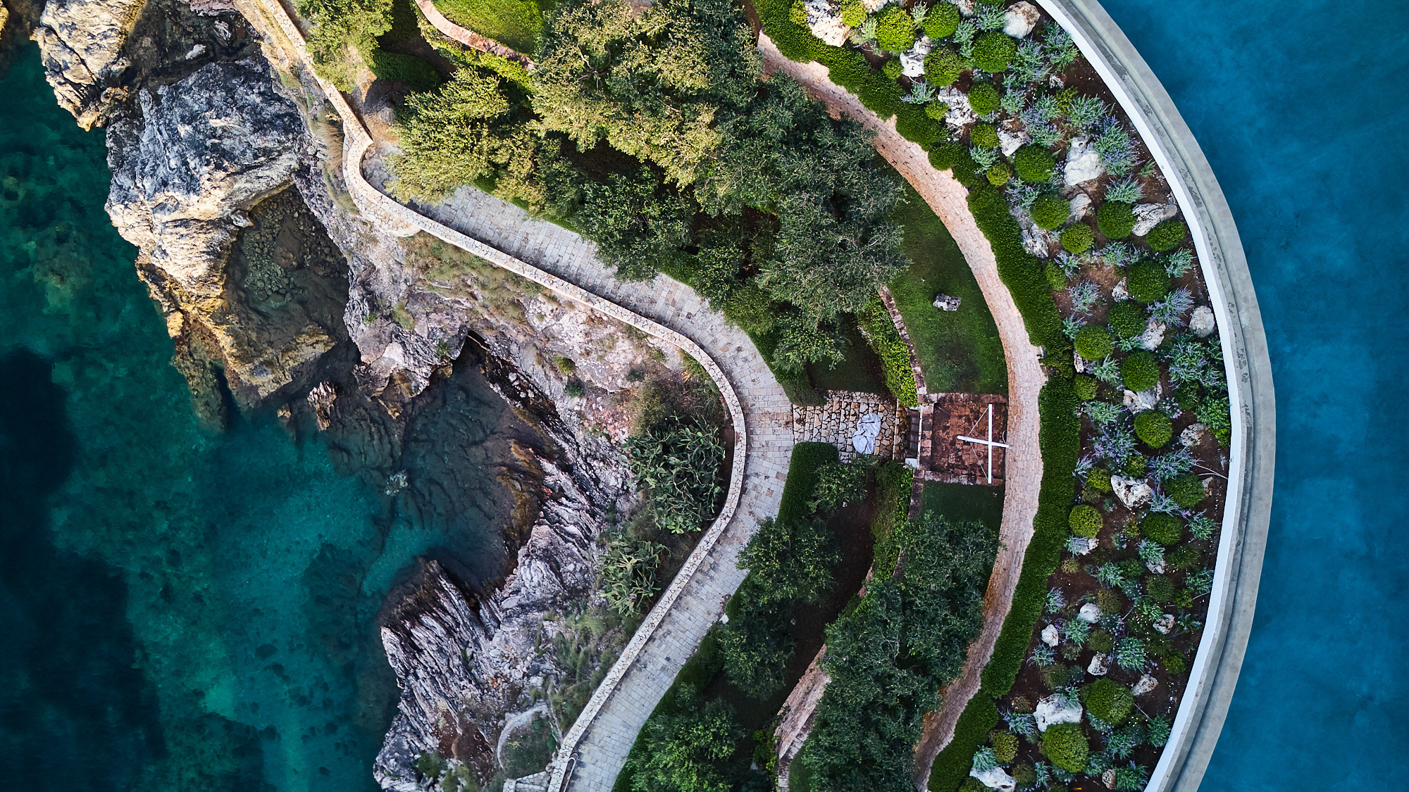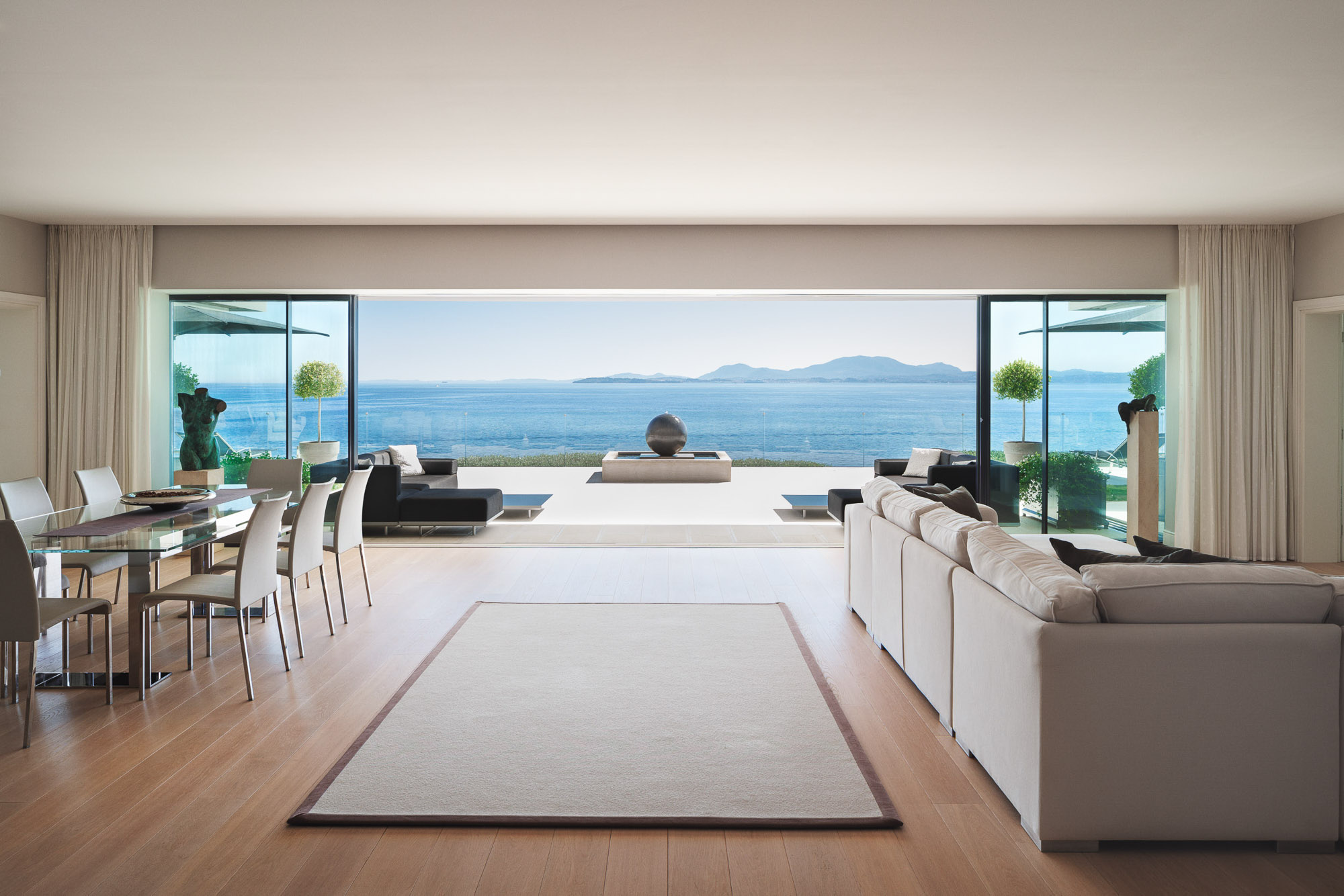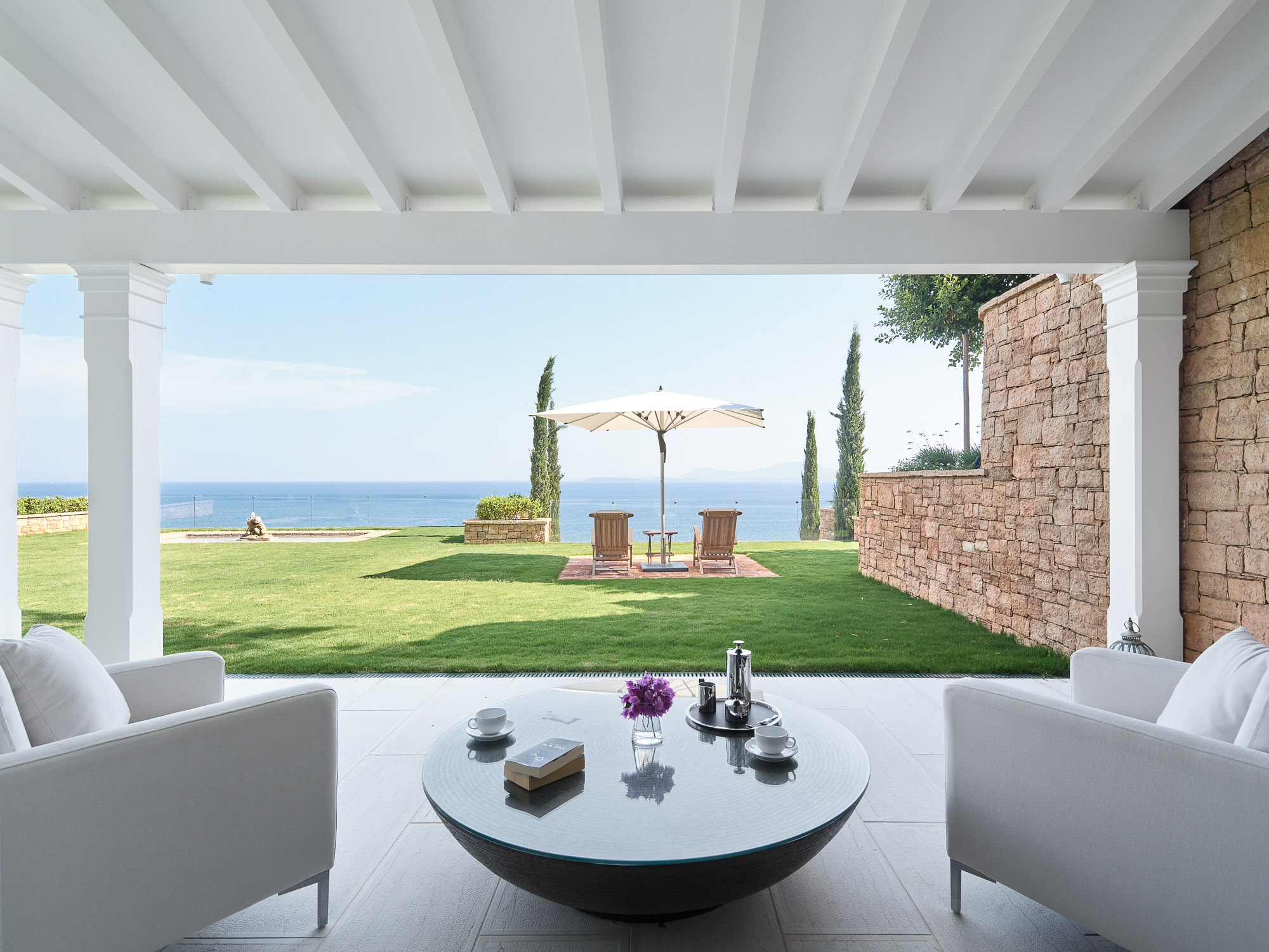 A series of landscaped terraces cascade down to the private seafront and jetty, offering multiple sunbathing decks and peaceful seating nooks. The show-stopping 65m infinity pool faces south, with uninterrupted 180-degree sea views. Above it, an elevated circular plunge pool with built-in seating and a cascading waterfall creates a striking focal point. The pool cabana offers generous alfresco dining, a lounge area, and a well-appointed bar — the perfect setting for long summer lunches or sunset cocktails. Shaded pergolas with plush sunbeds are dotted throughout the estate, ensuring every guest finds their own tranquil corner to unwind.