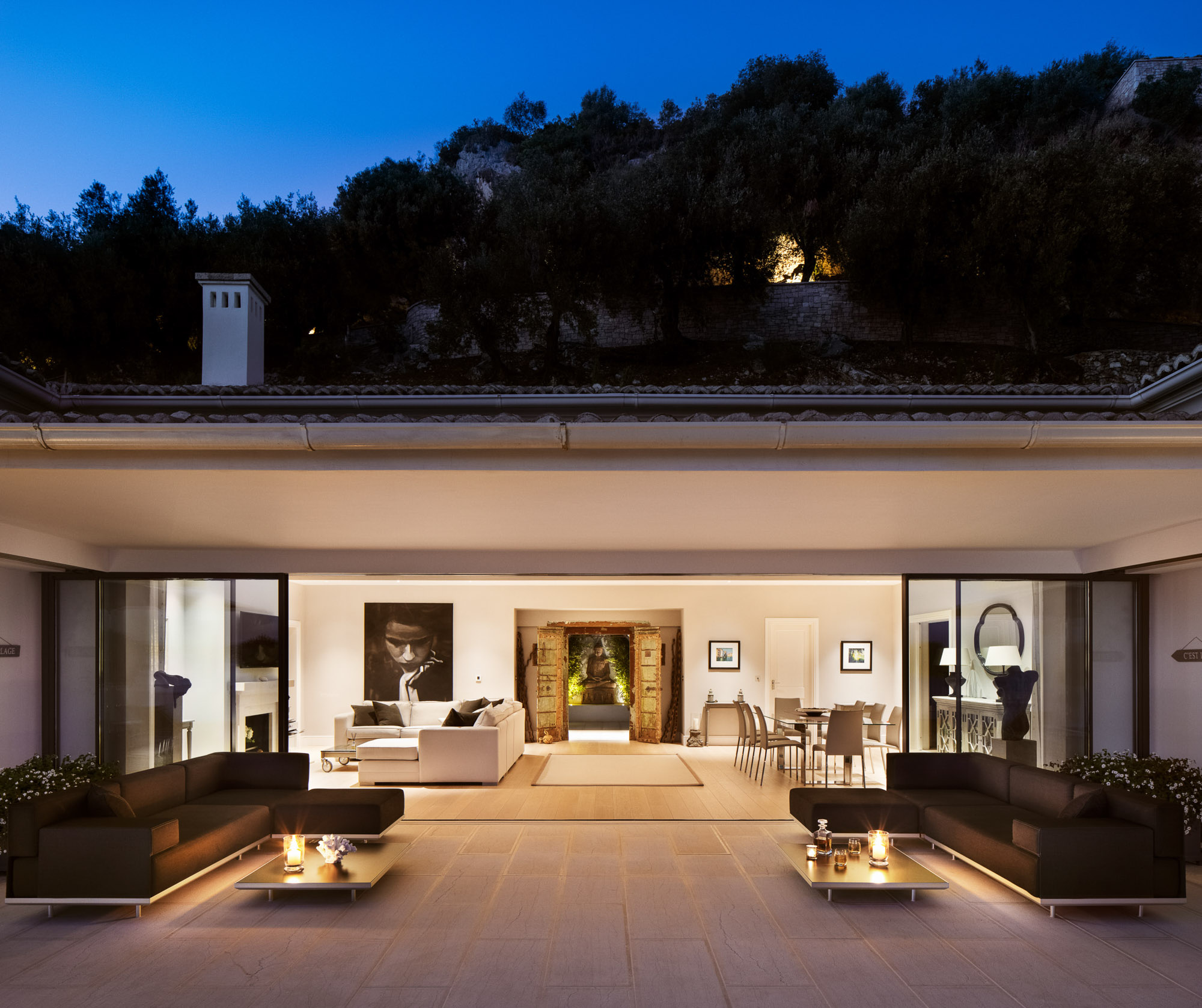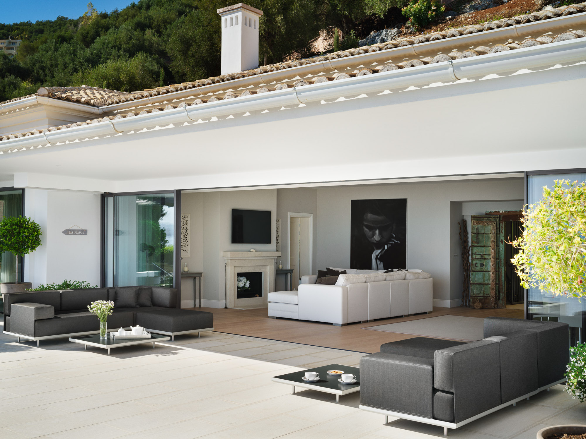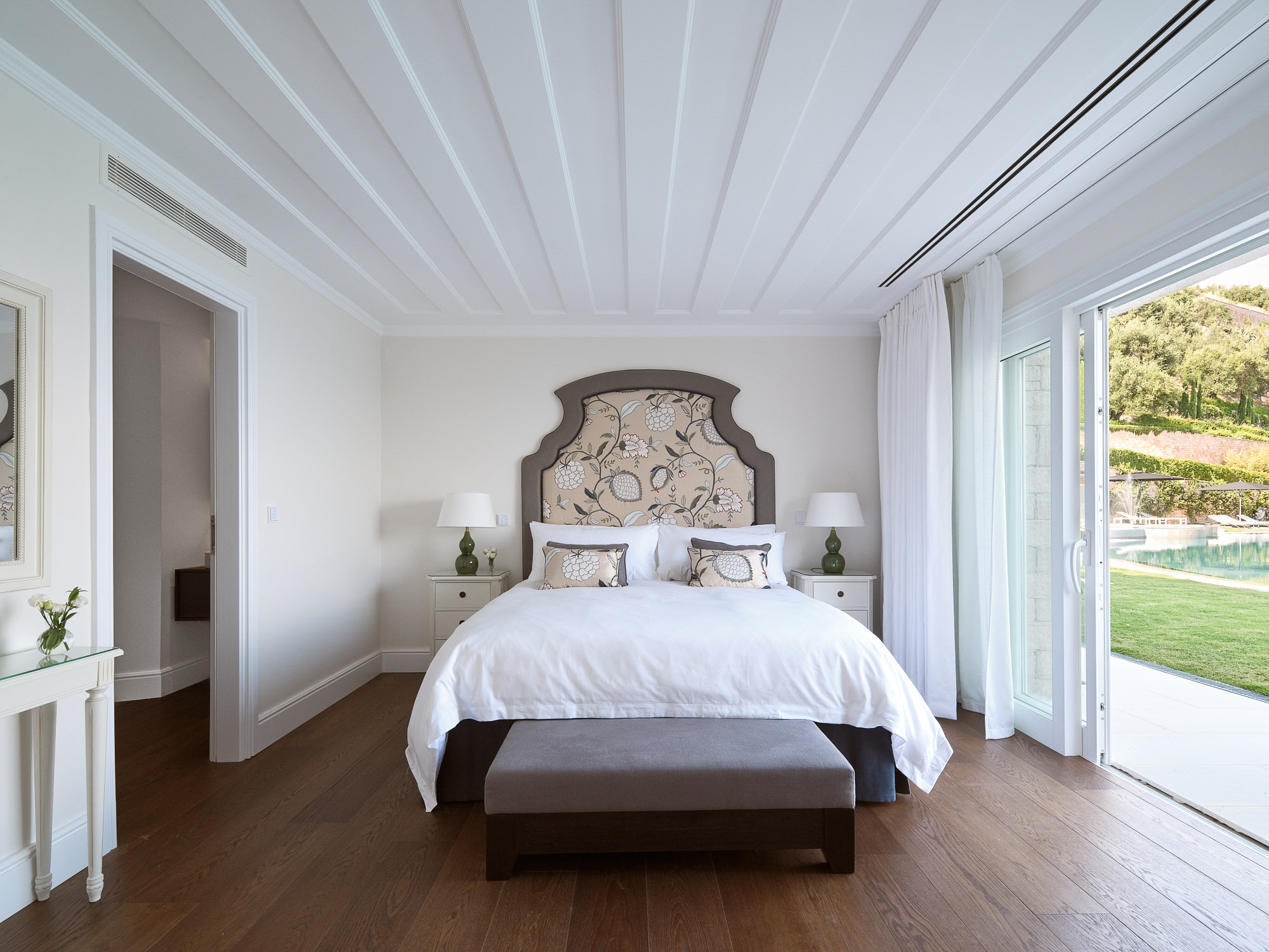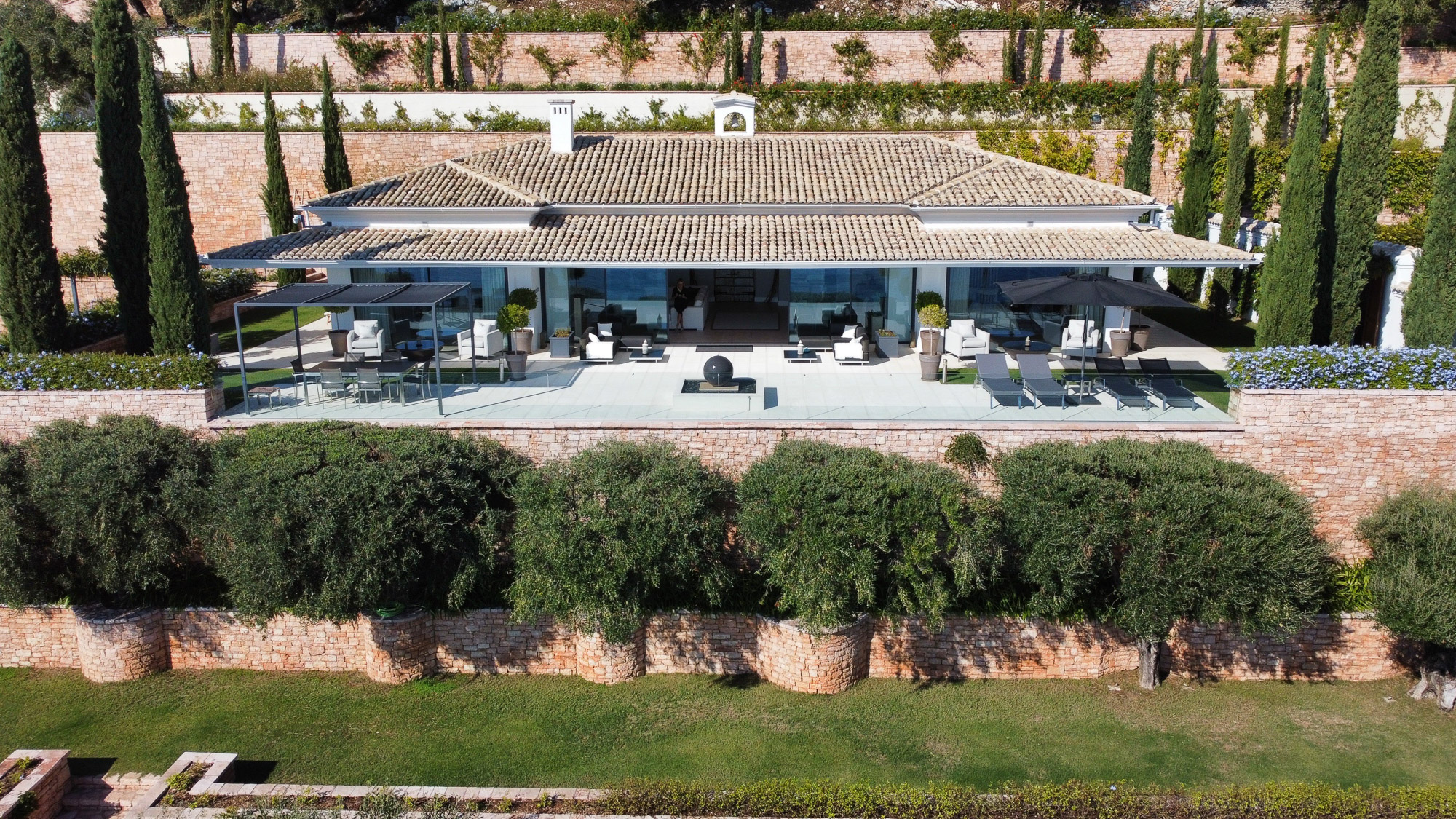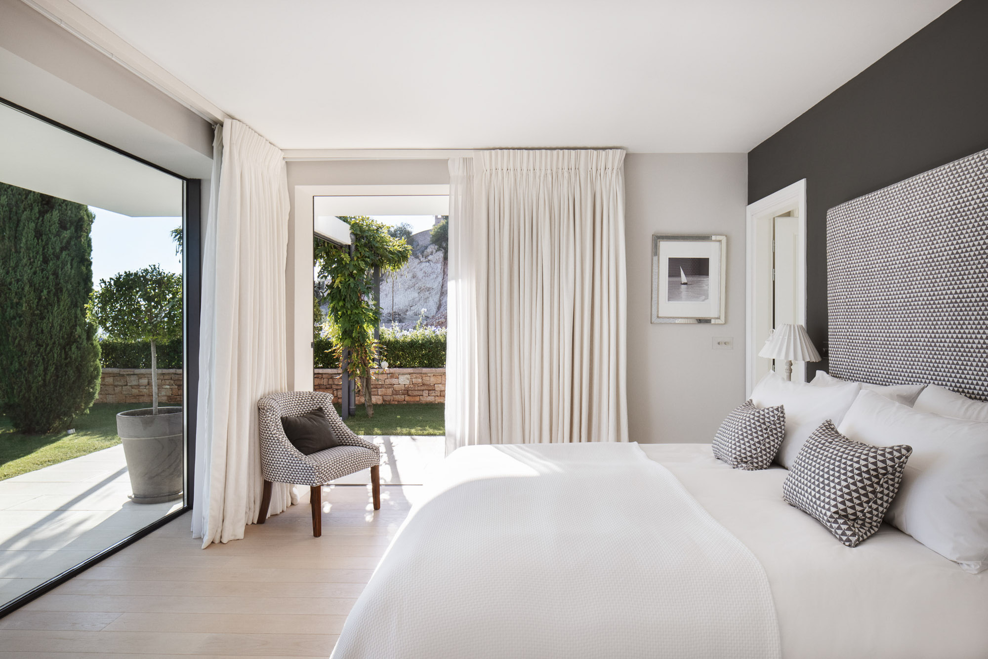 The main villa houses five exquisite bedroom suites. The master bedroom occupies the ground floor, with two further suites on a mezzanine floor. On the lower ground level, two additional bedroom suites overlook the pool and enjoy beautiful sea views. This level also hosts a private cinema, a curated library, a gym, and a large indoor bar with a cosy TV snug. The separate guest house comprises three further en suite bedrooms, a spacious open-plan living/dining space, and a sleek, modern kitchen — all flowing seamlessly onto a panoramic south-facing terrace.
