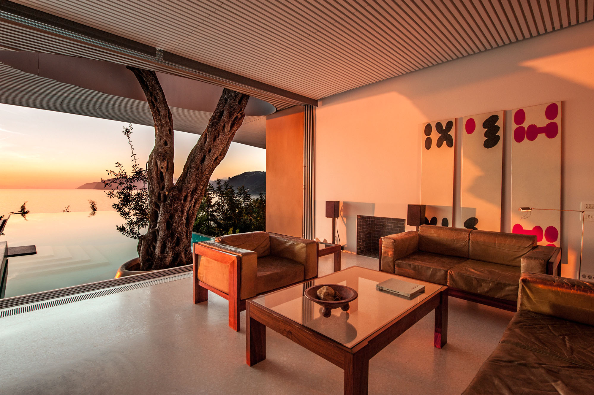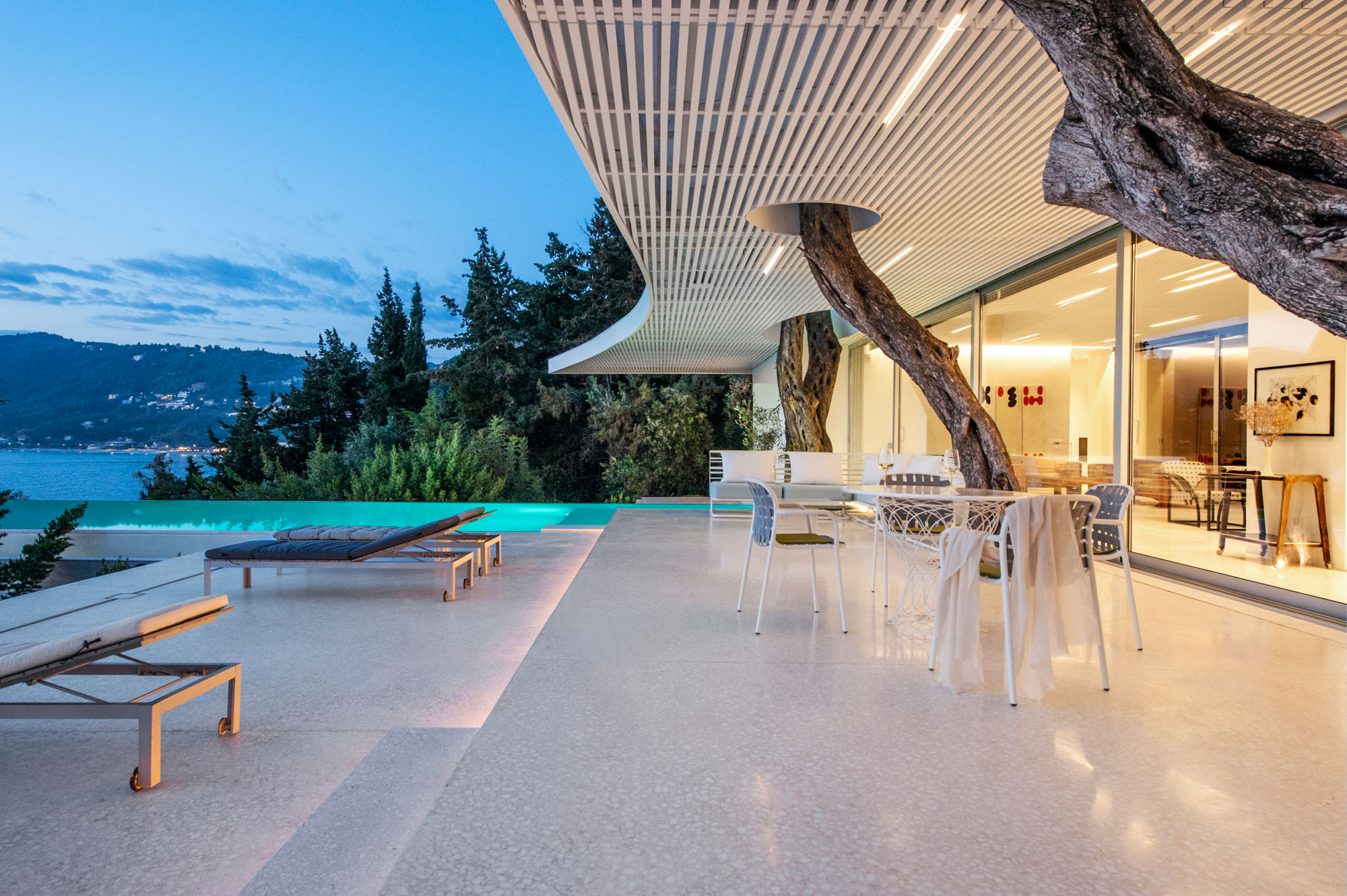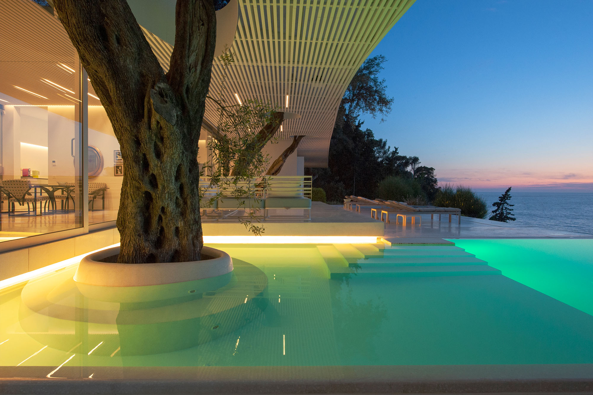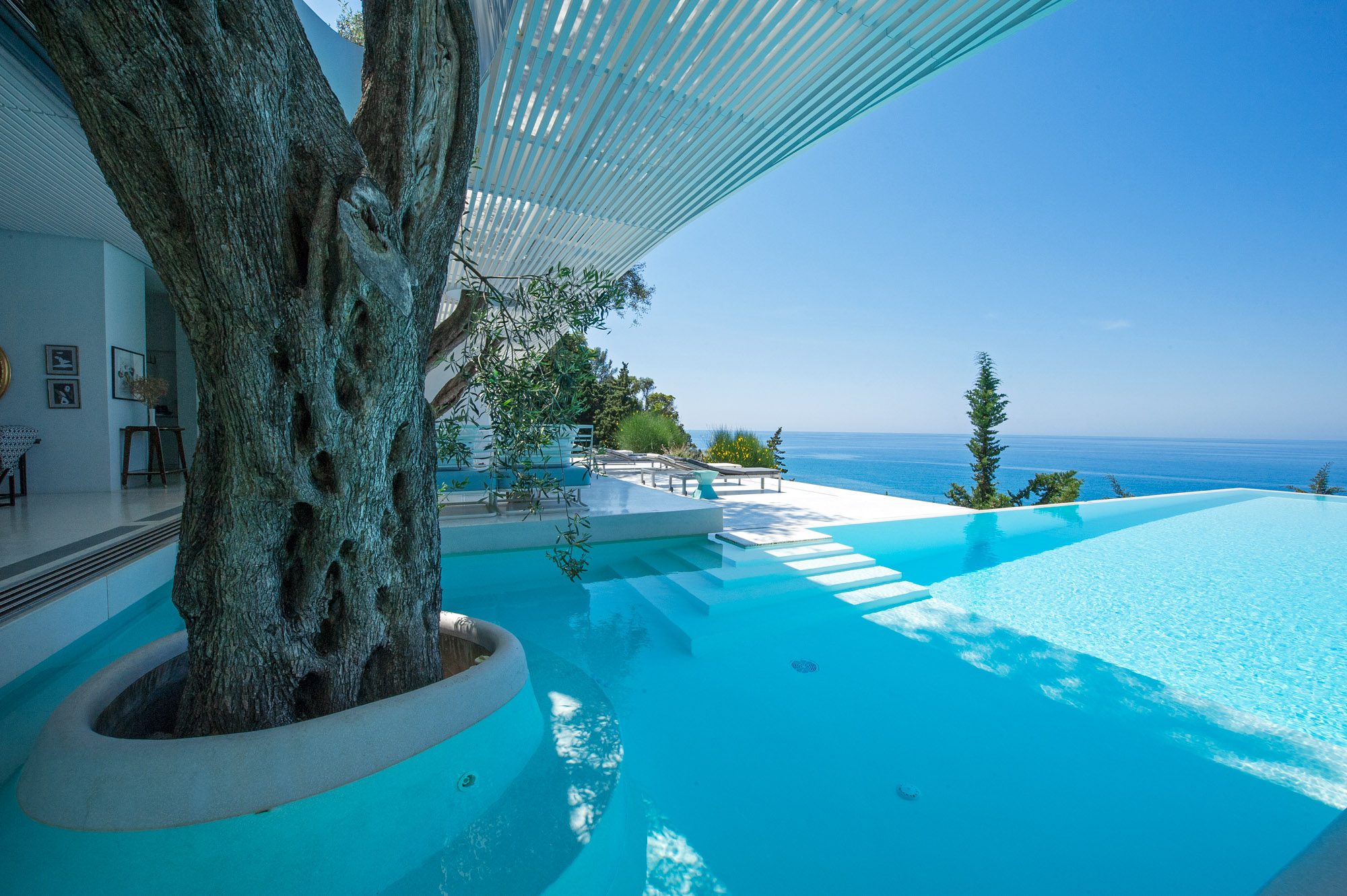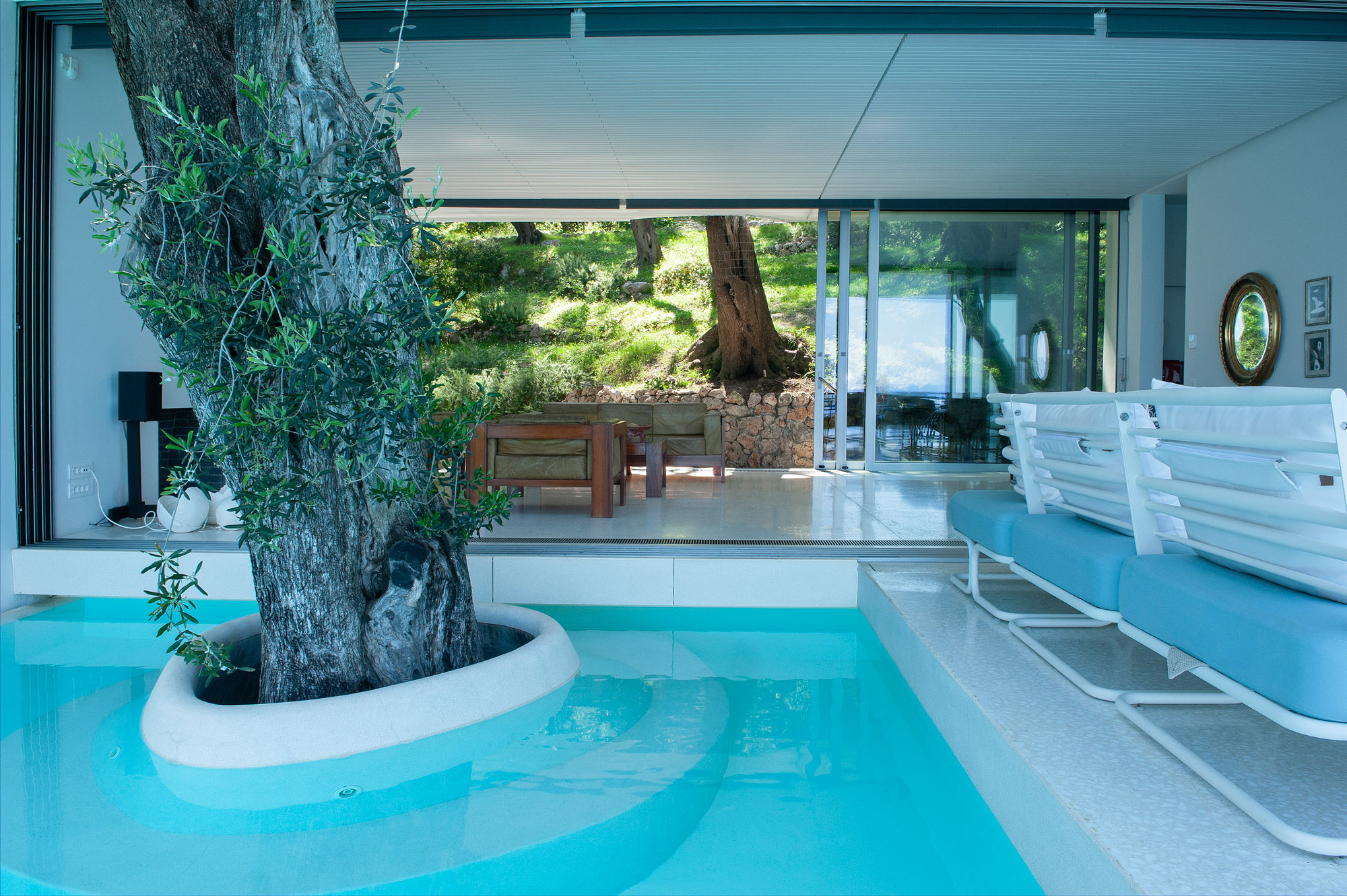 Featuring a striking cantilevered pool that seemingly floats above the landscape, the expansive terrace is framed by majestic olive trees, their ancient trunks rising elegantly through the roof. A peaceful waterfront pavilion completes the experience, providing an idyllic retreat with sweeping views of the sparkling sea.