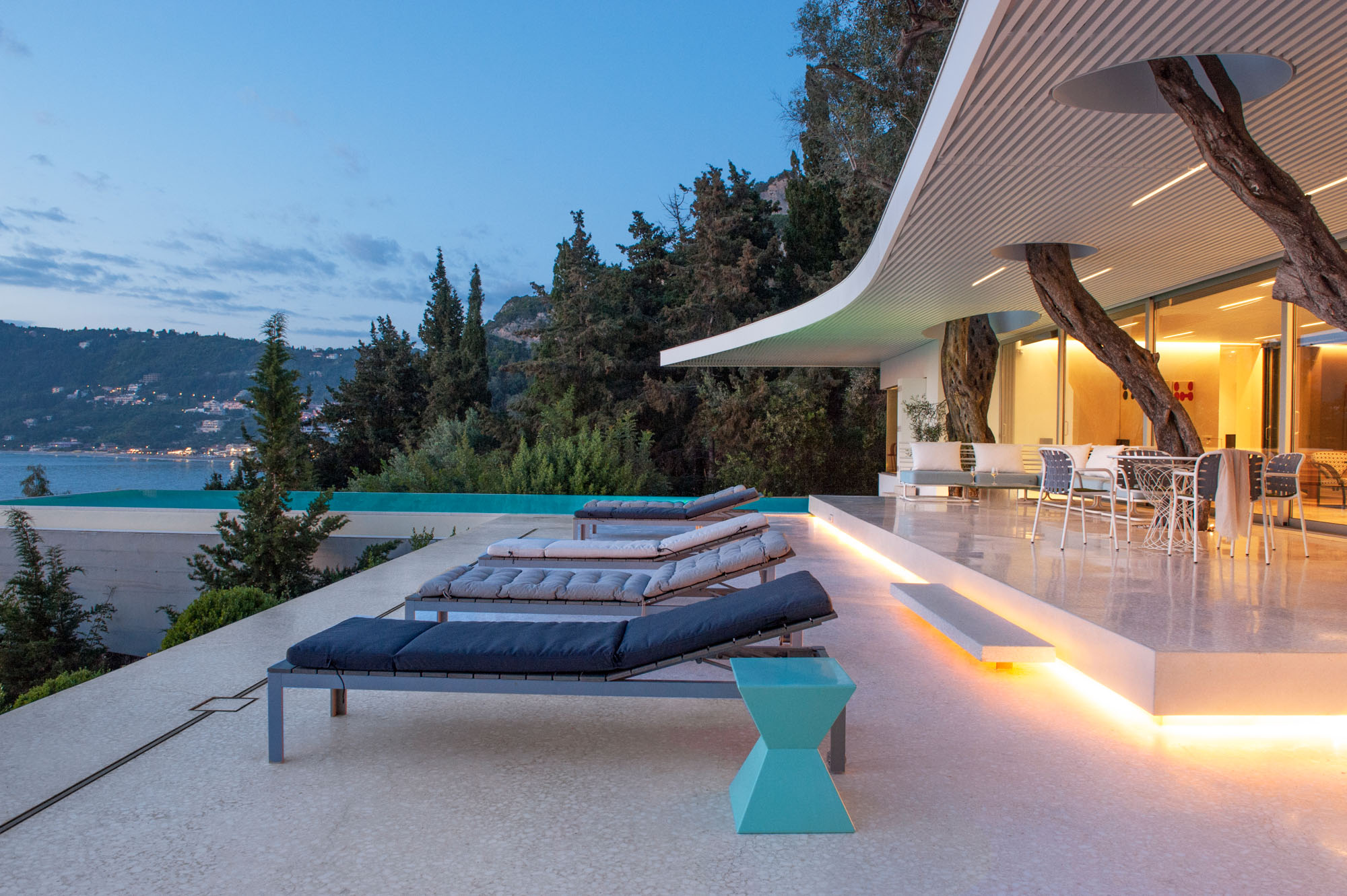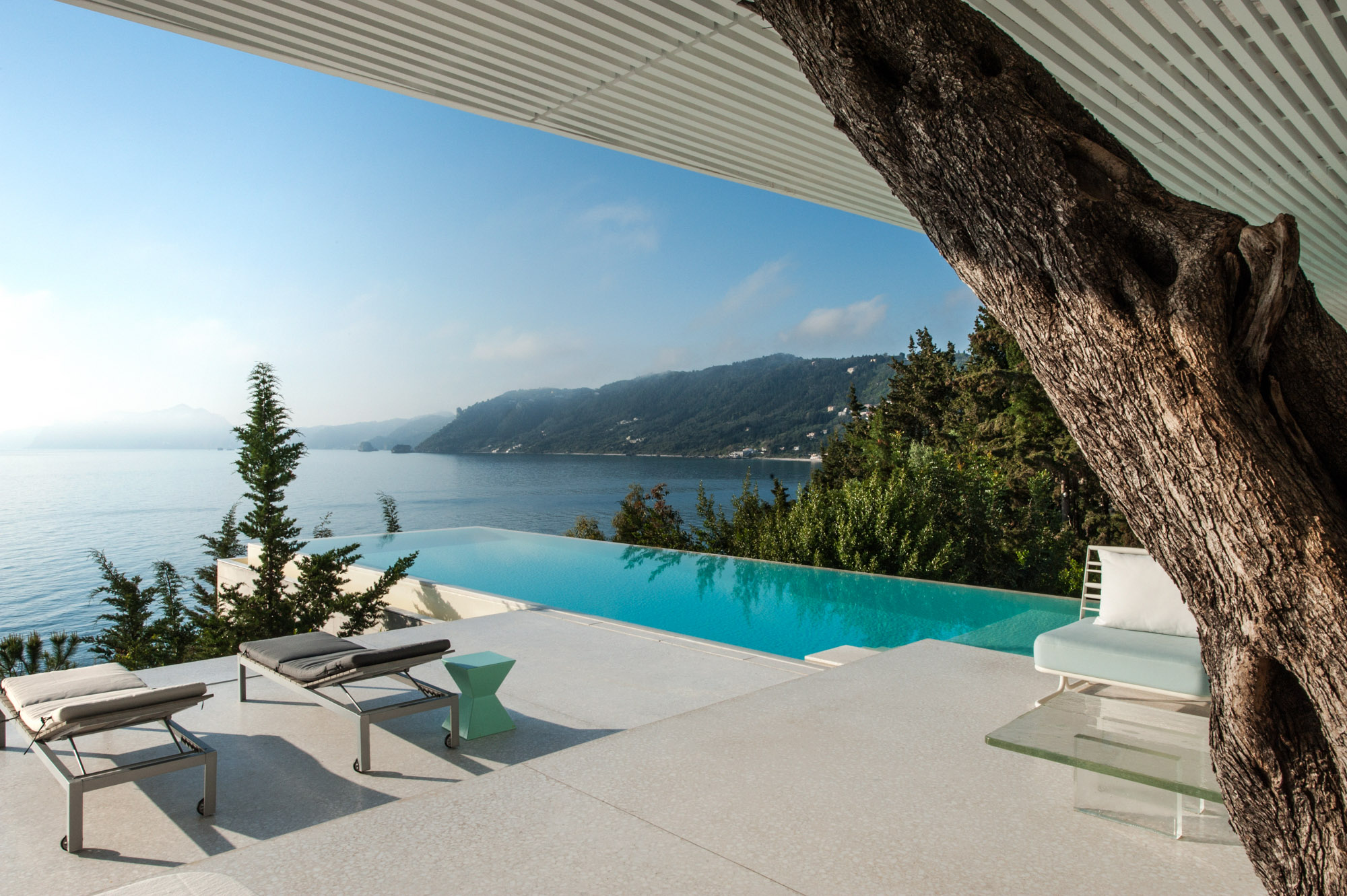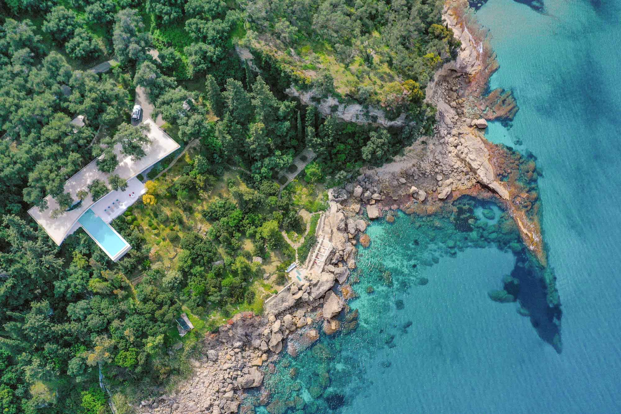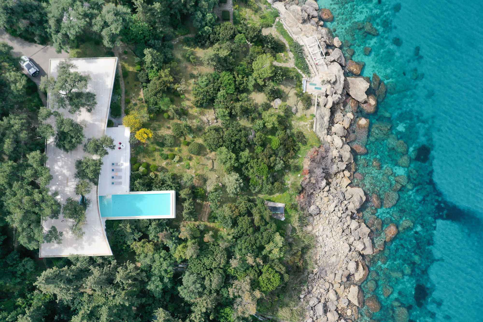 Featuring a striking cantilevered pool that seemingly floats above the landscape, the expansive terrace is framed by majestic olive trees, their ancient trunks rising elegantly through the roof. A peaceful waterfront pavilion completes the experience, providing an idyllic retreat with sweeping views of the sparkling sea.