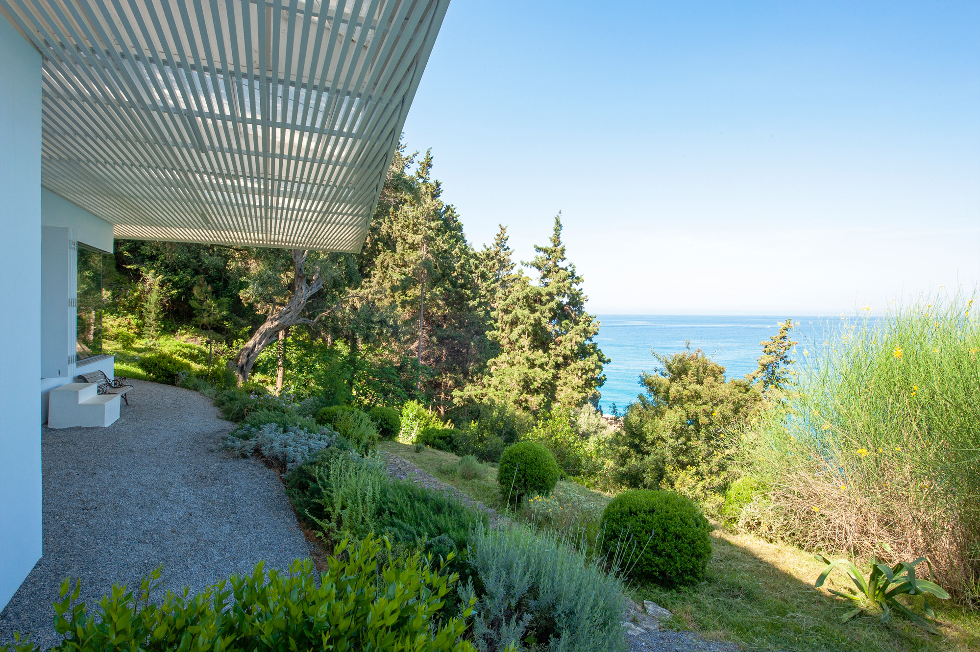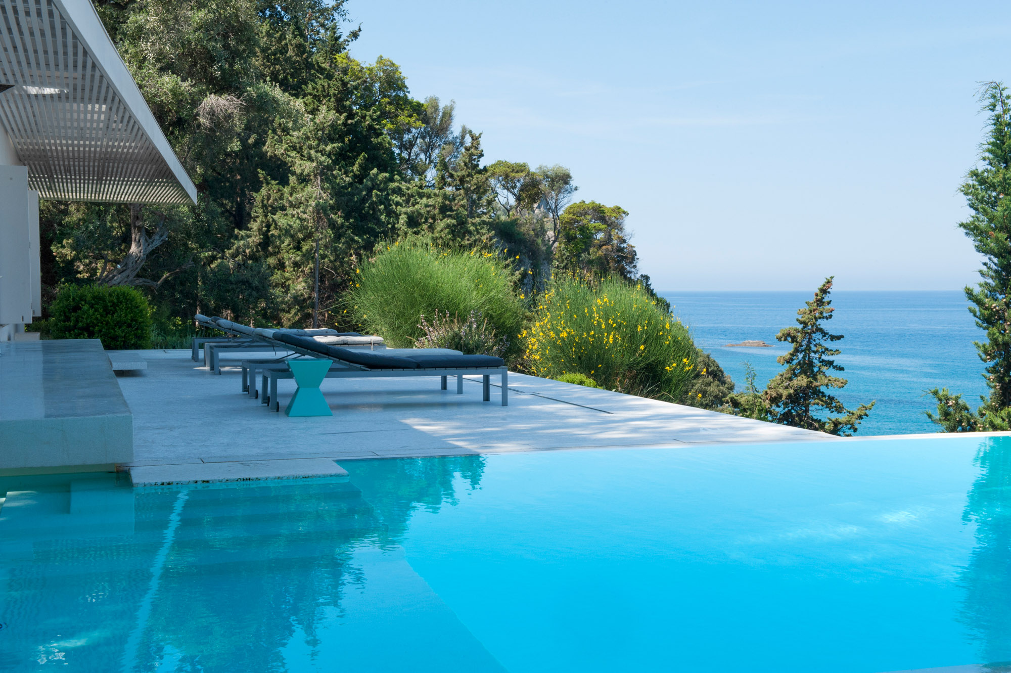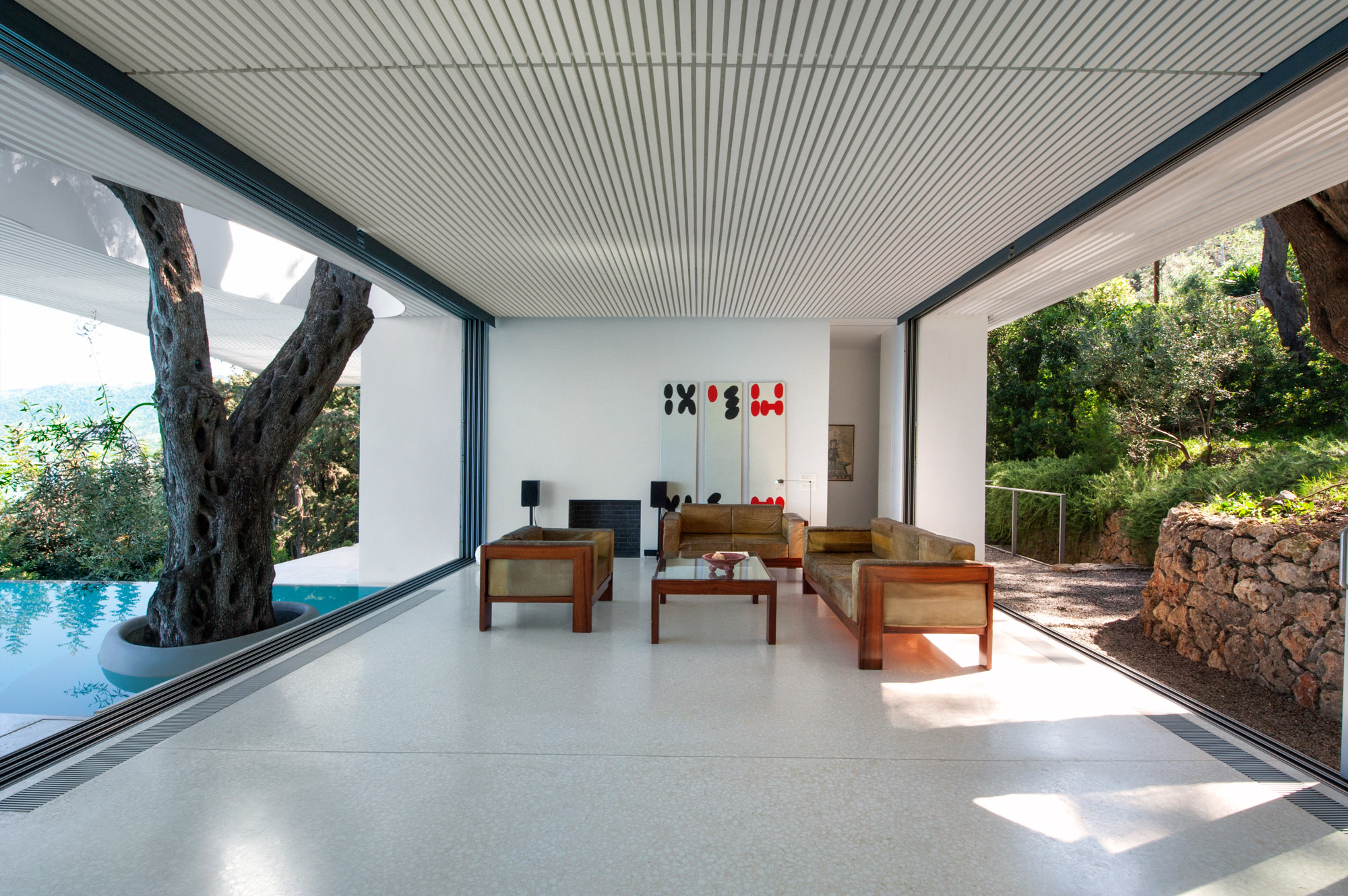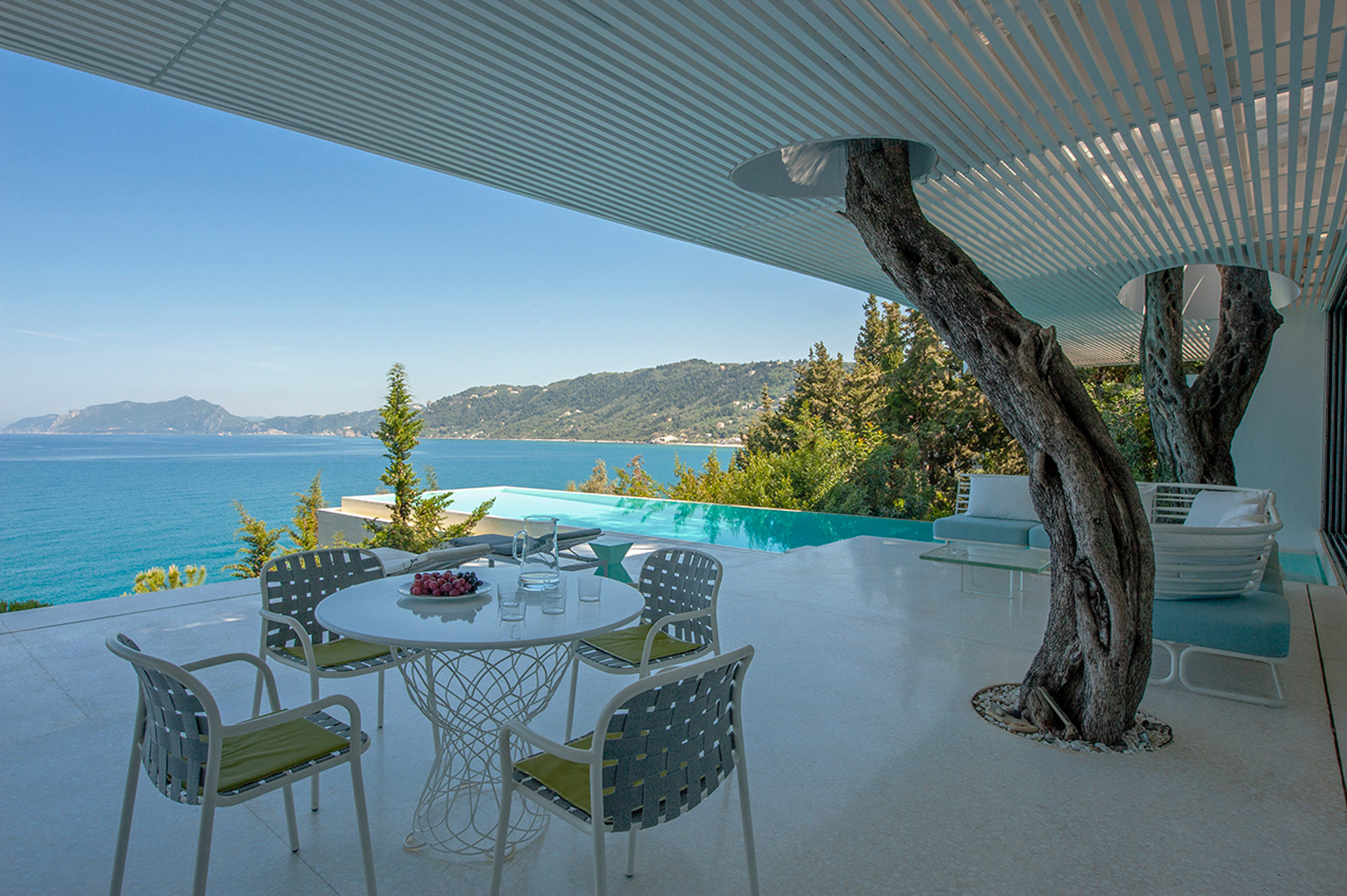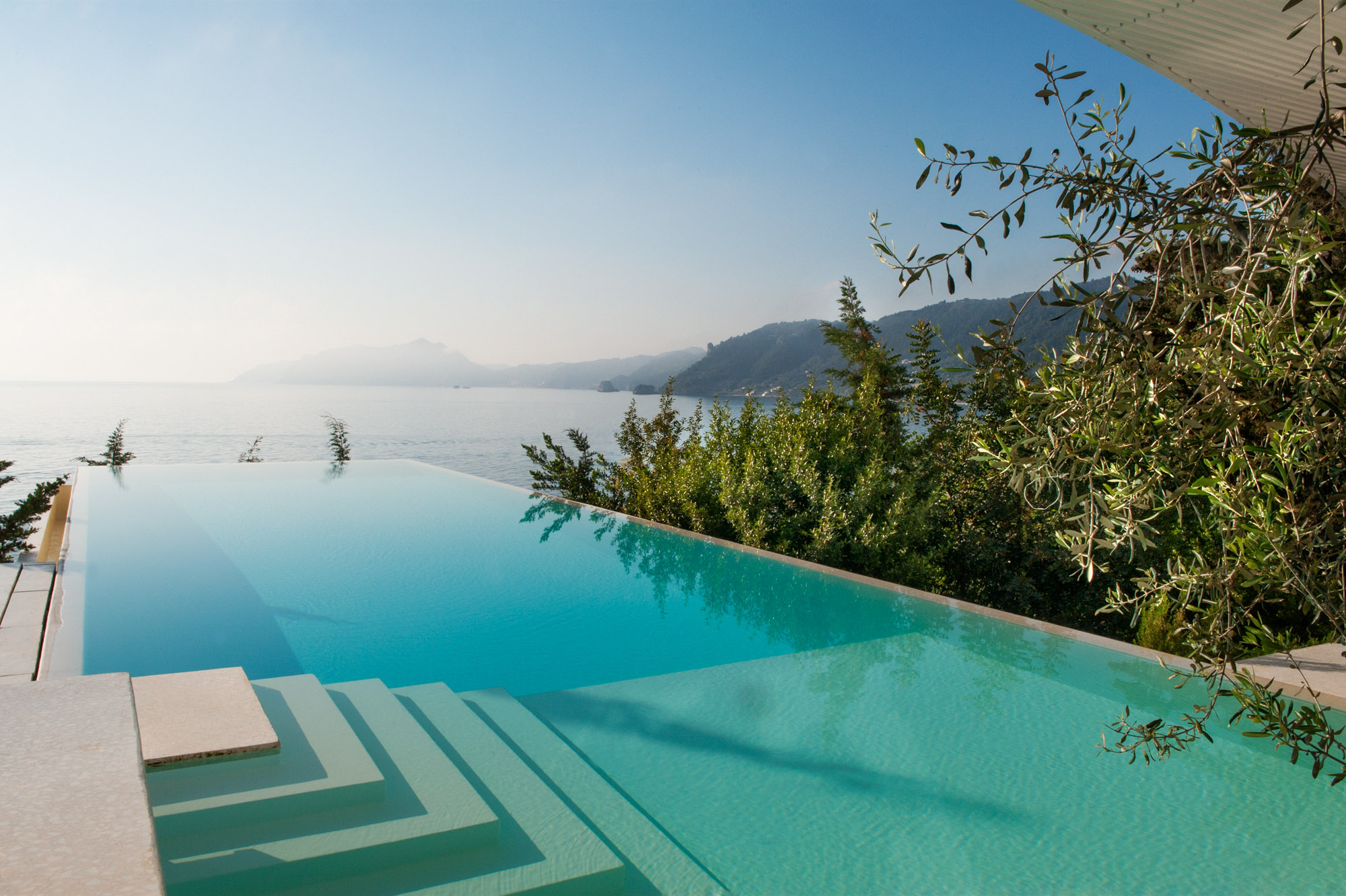 Featuring a striking cantilevered pool that seemingly floats above the landscape, the expansive terrace is framed by majestic olive trees, their ancient trunks rising elegantly through the roof. A peaceful waterfront pavilion completes the experience, providing an idyllic retreat with sweeping views of the sparkling sea.