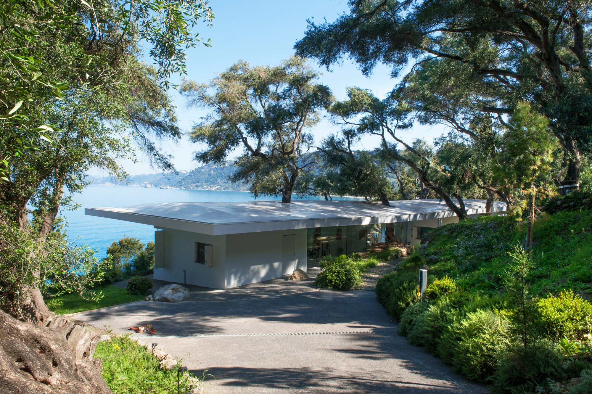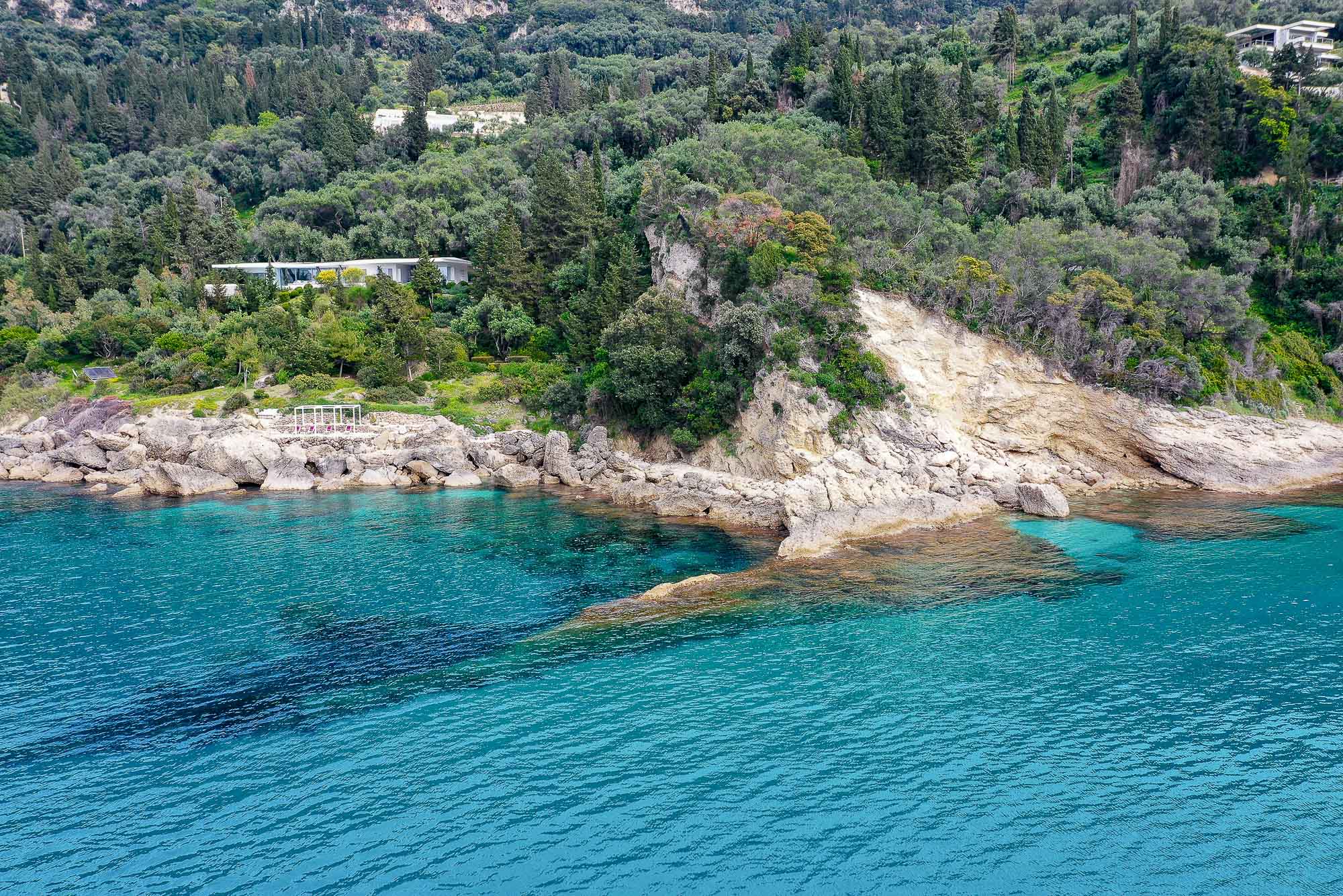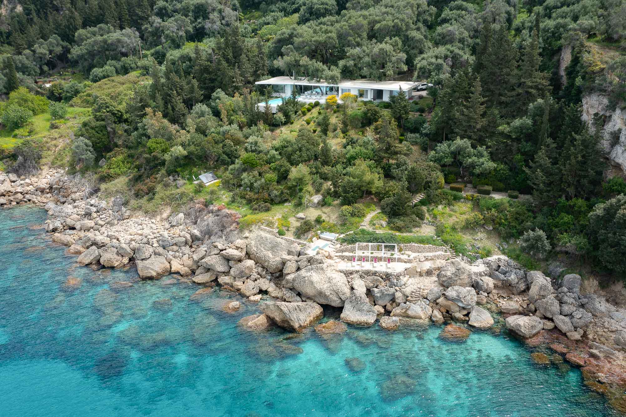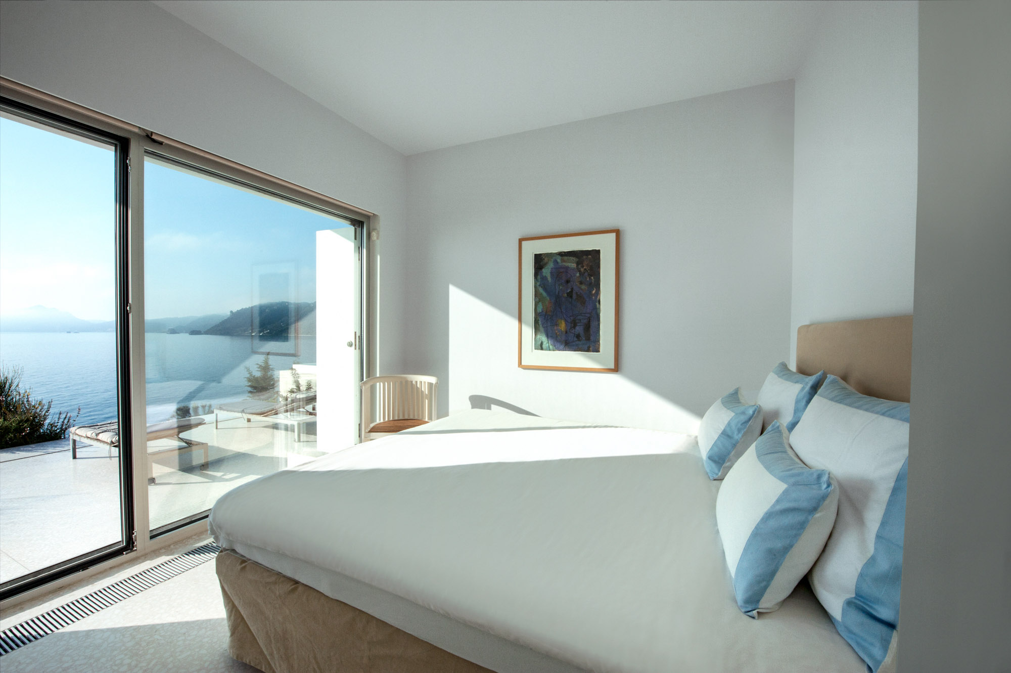 Featuring a striking cantilevered pool that seemingly floats above the landscape, the expansive terrace is framed by majestic olive trees, their ancient trunks rising elegantly through the roof. A peaceful waterfront pavilion completes the experience, providing an idyllic retreat with sweeping views of the sparkling sea.