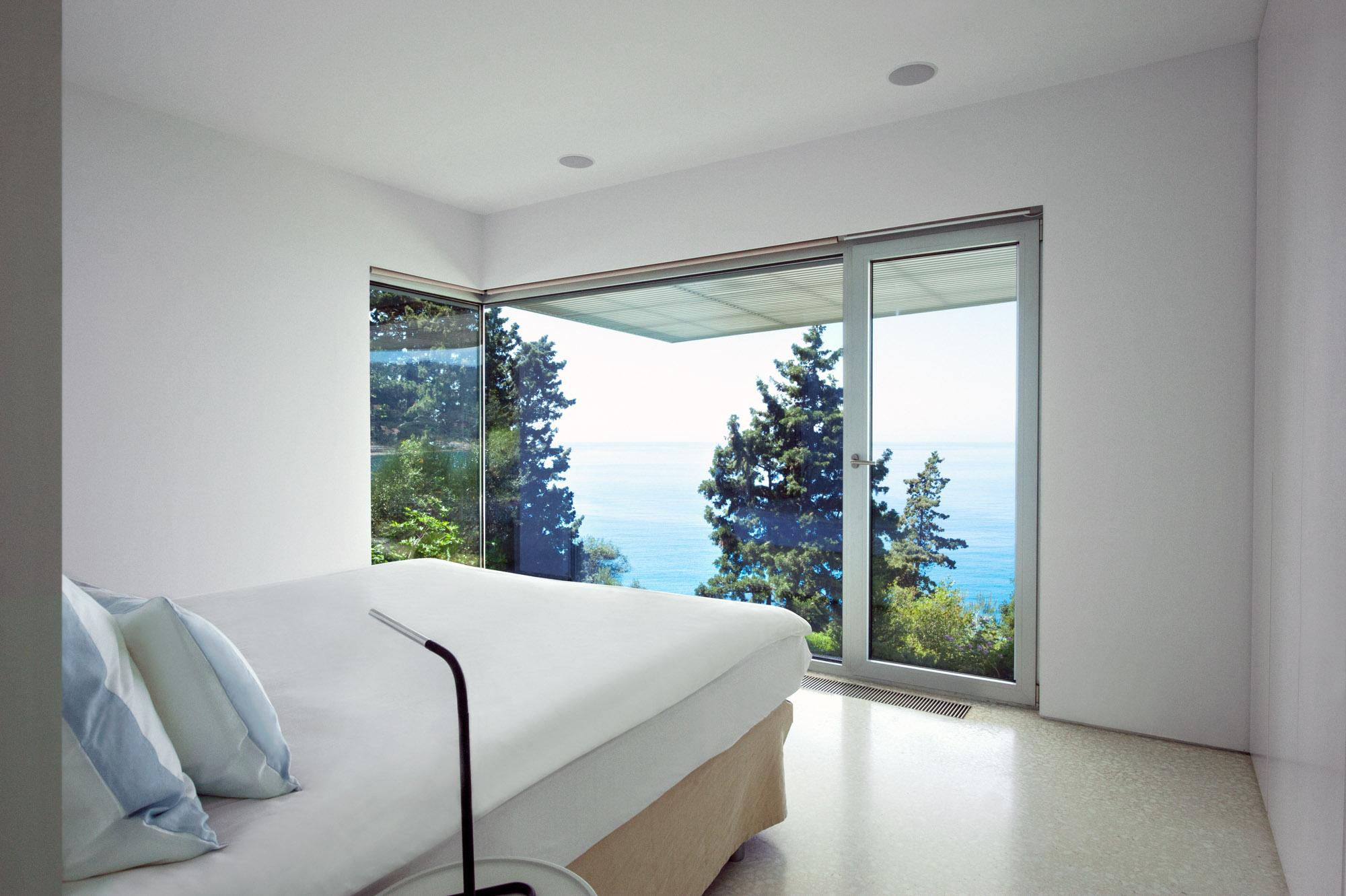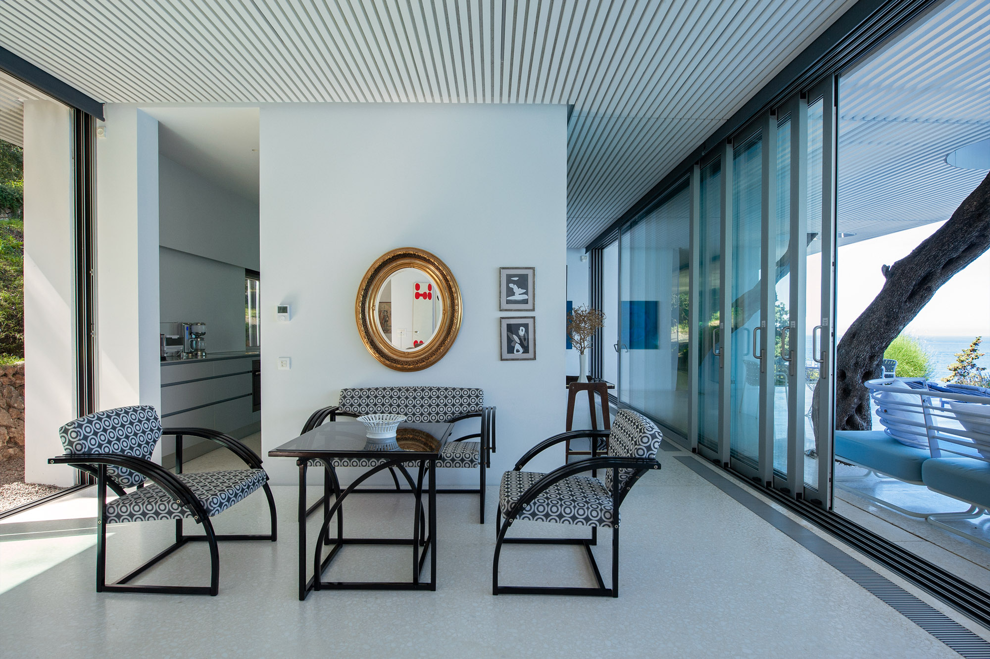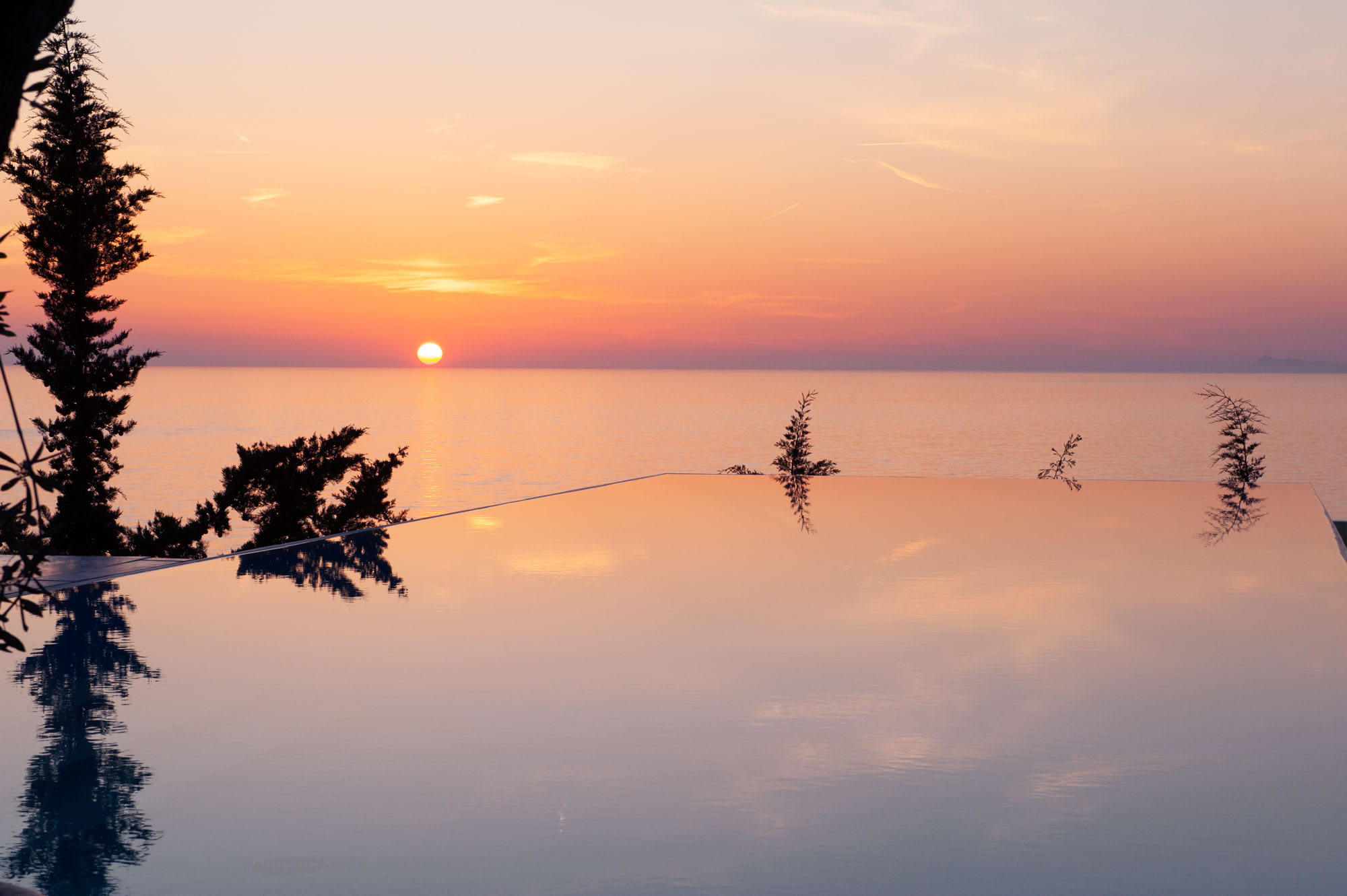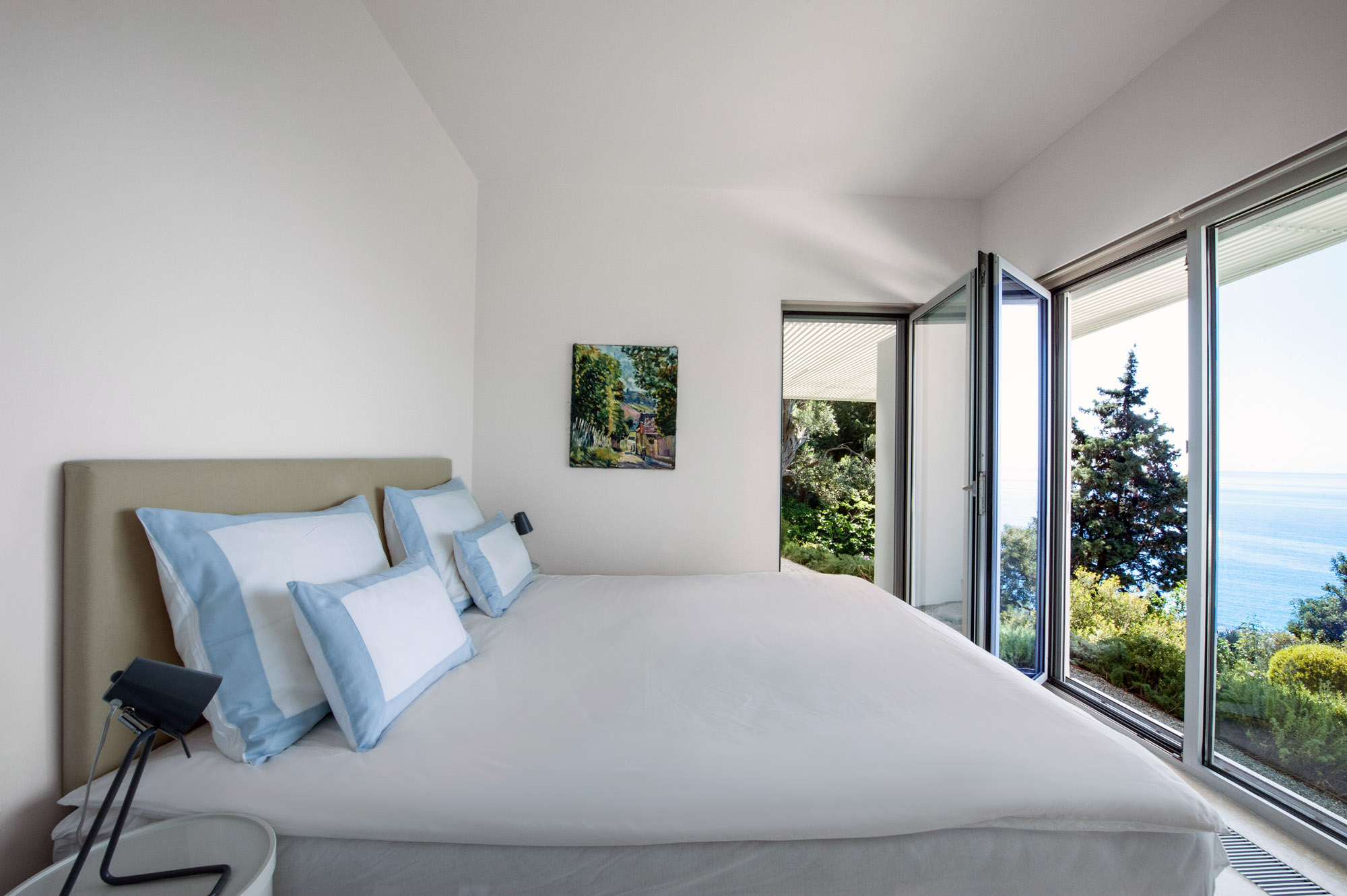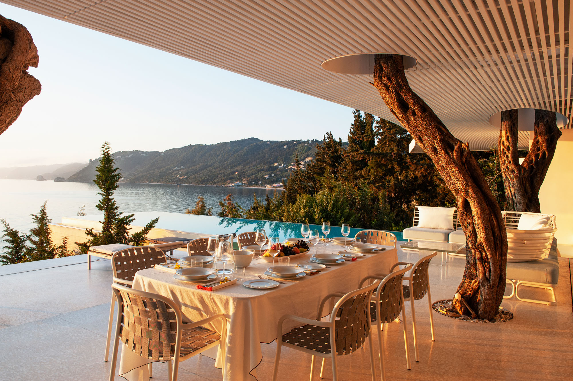 Featuring a striking cantilevered pool that seemingly floats above the landscape, the expansive terrace is framed by majestic olive trees, their ancient trunks rising elegantly through the roof. A peaceful waterfront pavilion completes the experience, providing an idyllic retreat with sweeping views of the sparkling sea.