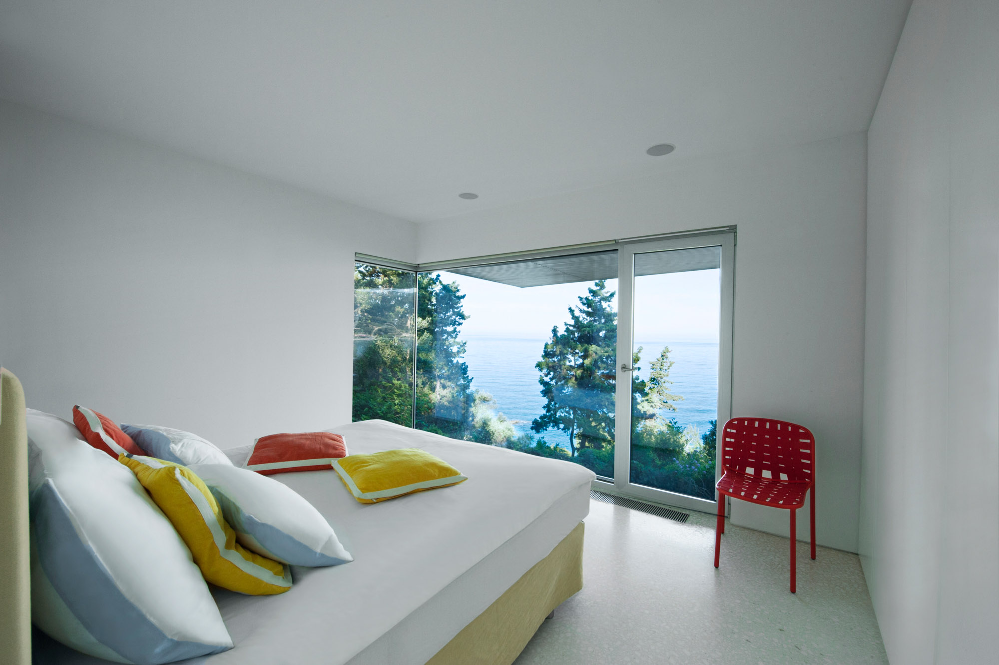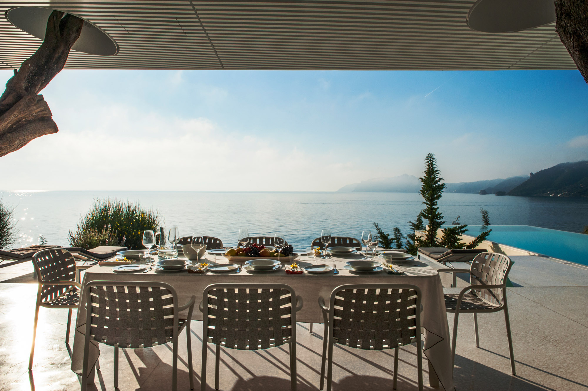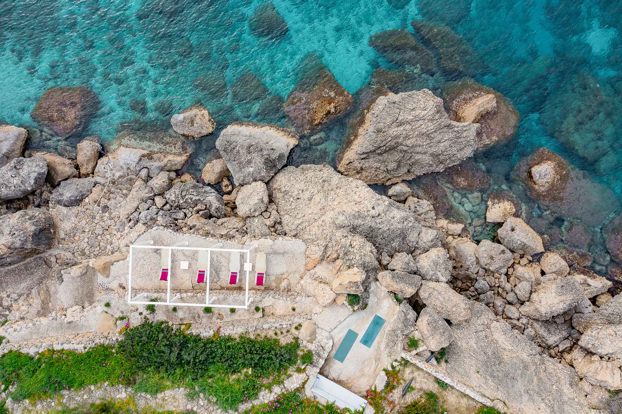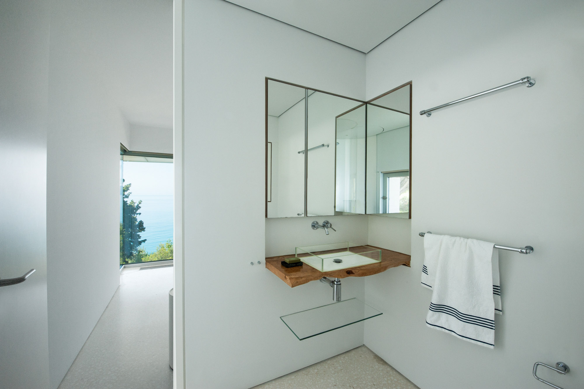 Featuring a striking cantilevered pool that seemingly floats above the landscape, the expansive terrace is framed by majestic olive trees, their ancient trunks rising elegantly through the roof. A peaceful waterfront pavilion completes the experience, providing an idyllic retreat with sweeping views of the sparkling sea.