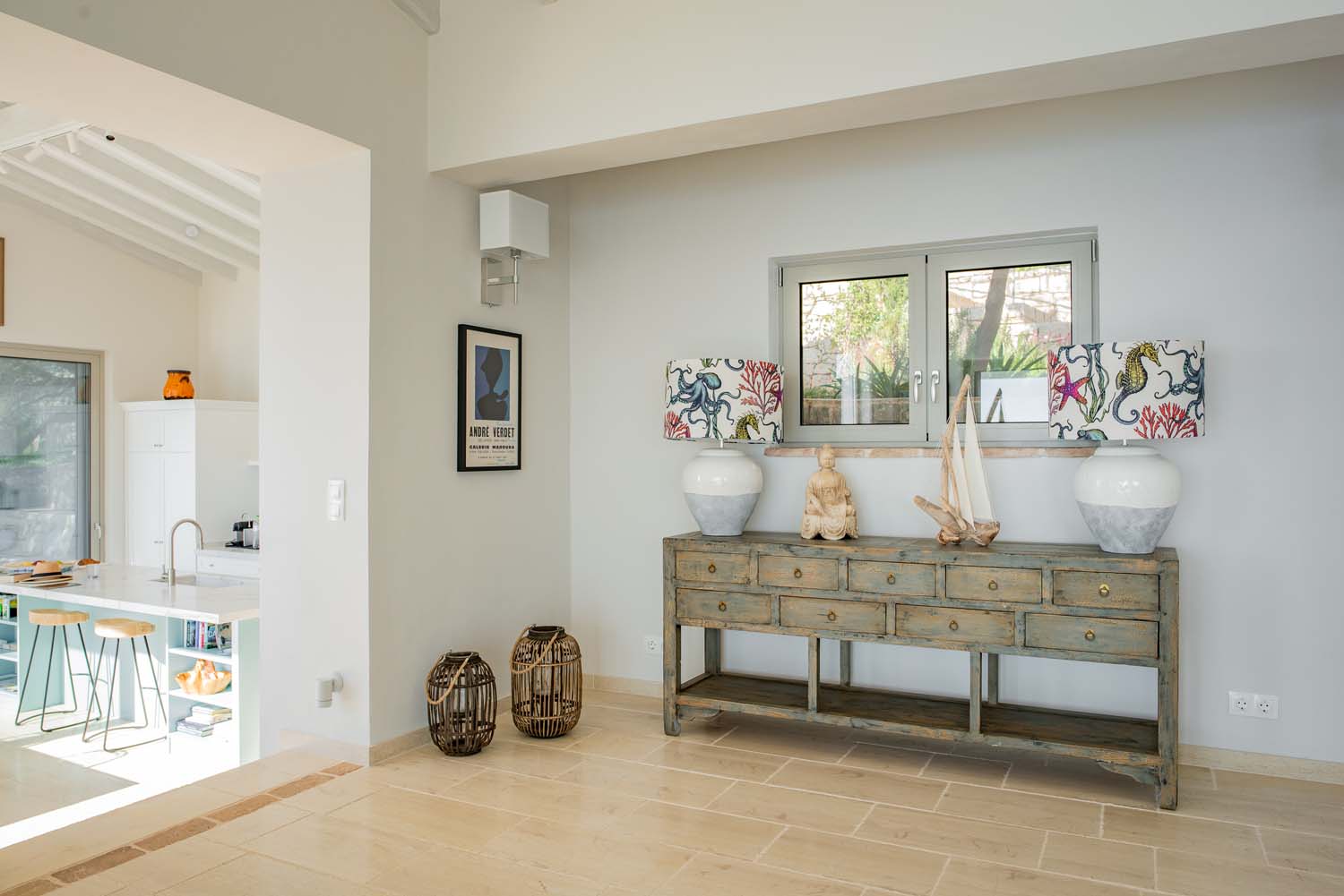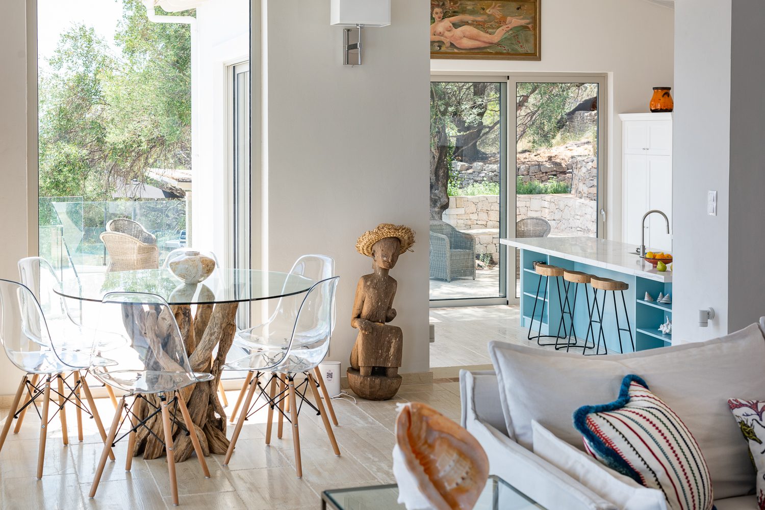 The nearest beach is Krouzeri. It's about a 5-minute walk, has been awarded a Blue Flag and has white pebbles and clear waters. The beach of Kaminaki can be reached on foot in about 10 minutes. It also has small pebbles and very clear blue waters. A rather longer walk along the coastal path, or a short drive, brings you to Agni beach where there are 3 popular tavernas and boat hire. Kassipoi and St Stephano, with its harbour, shops, restaurants, cafes and bars, are less than 20 minutes drive away.