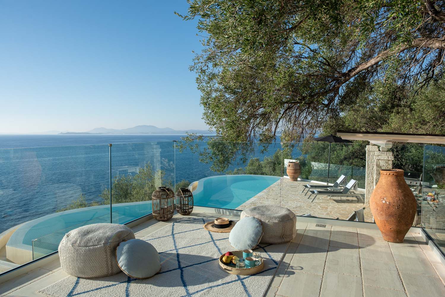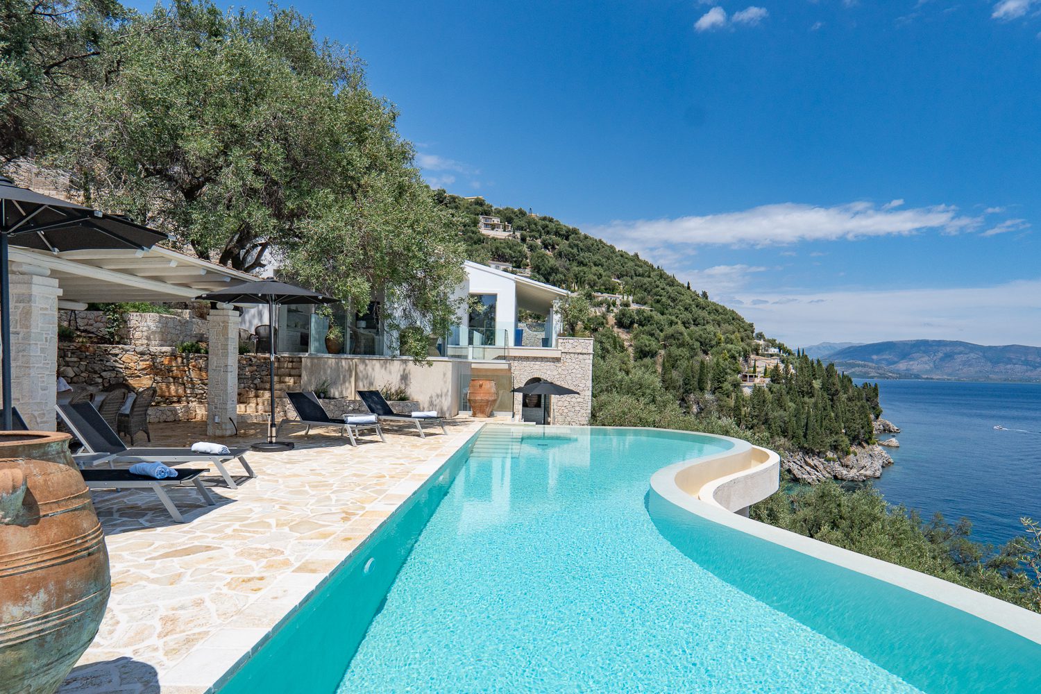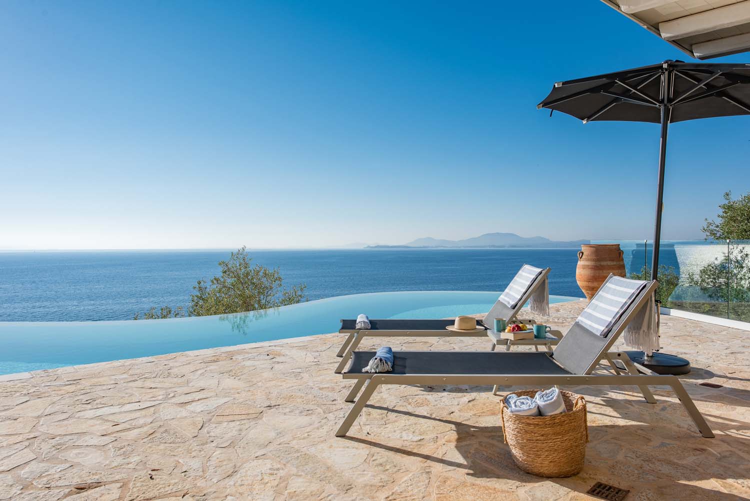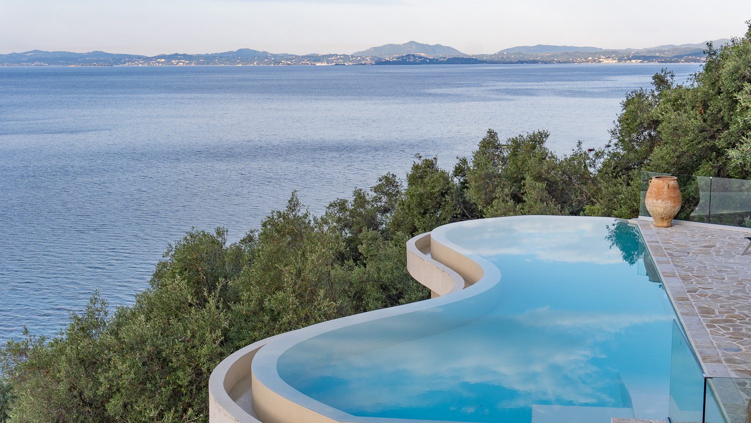 There's a covered dining area for 8, further casual eating space with stone seating built into the terraced wall and covered with plump cushions, well-positioned sun loungers, floor cushions and outdoor rugs for lounging. An eye-catching, sinuously curved, infinity pool appears to balance above the blue waters below and merge with the horizon.