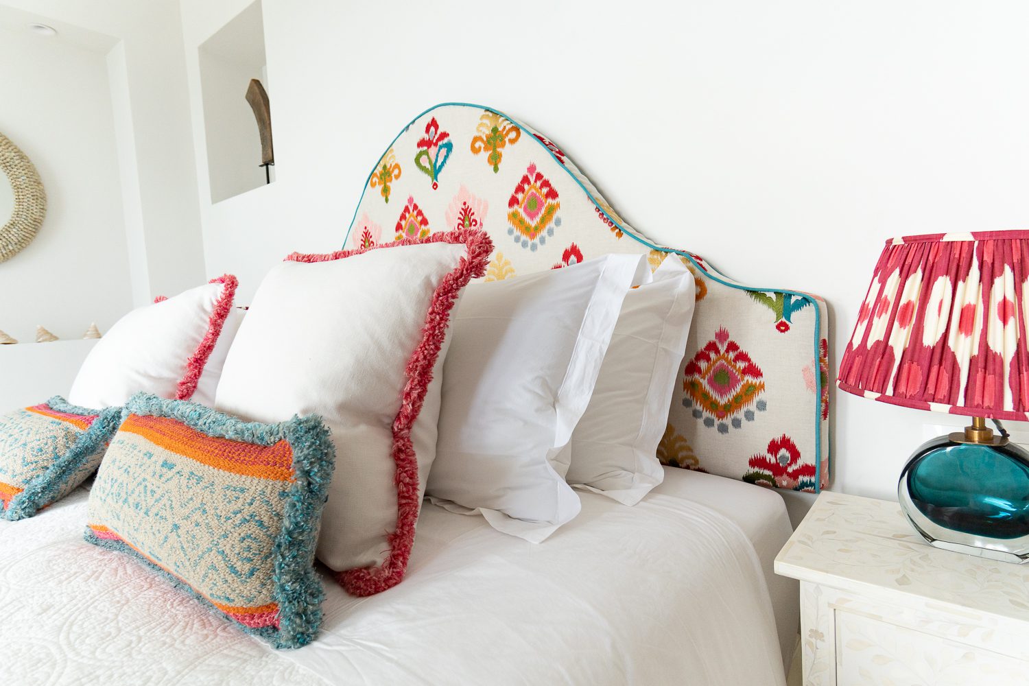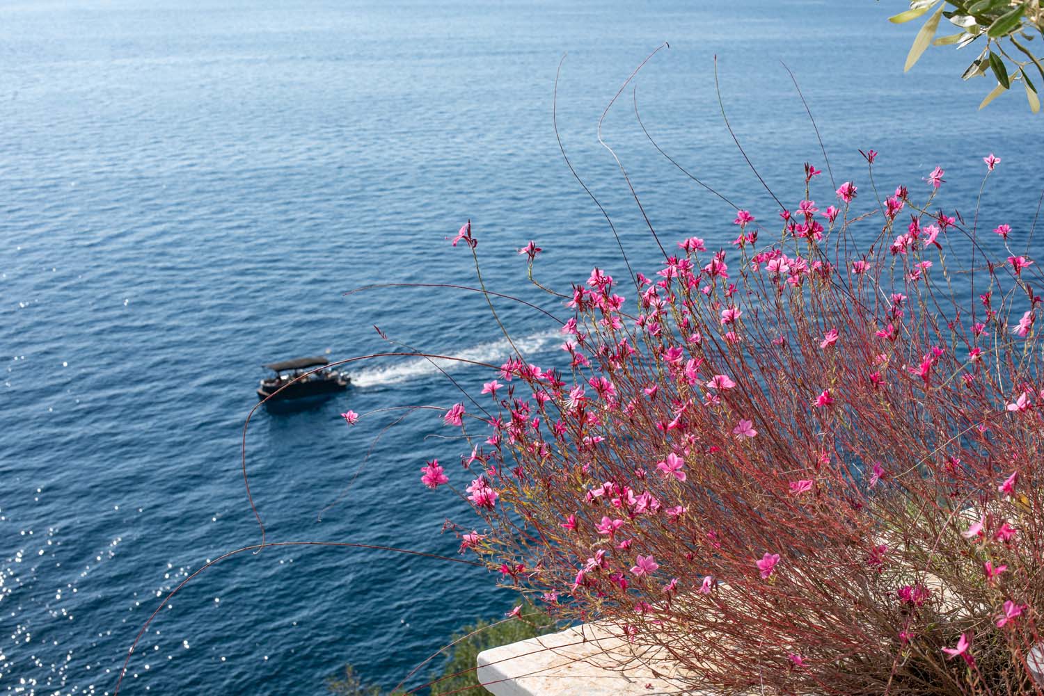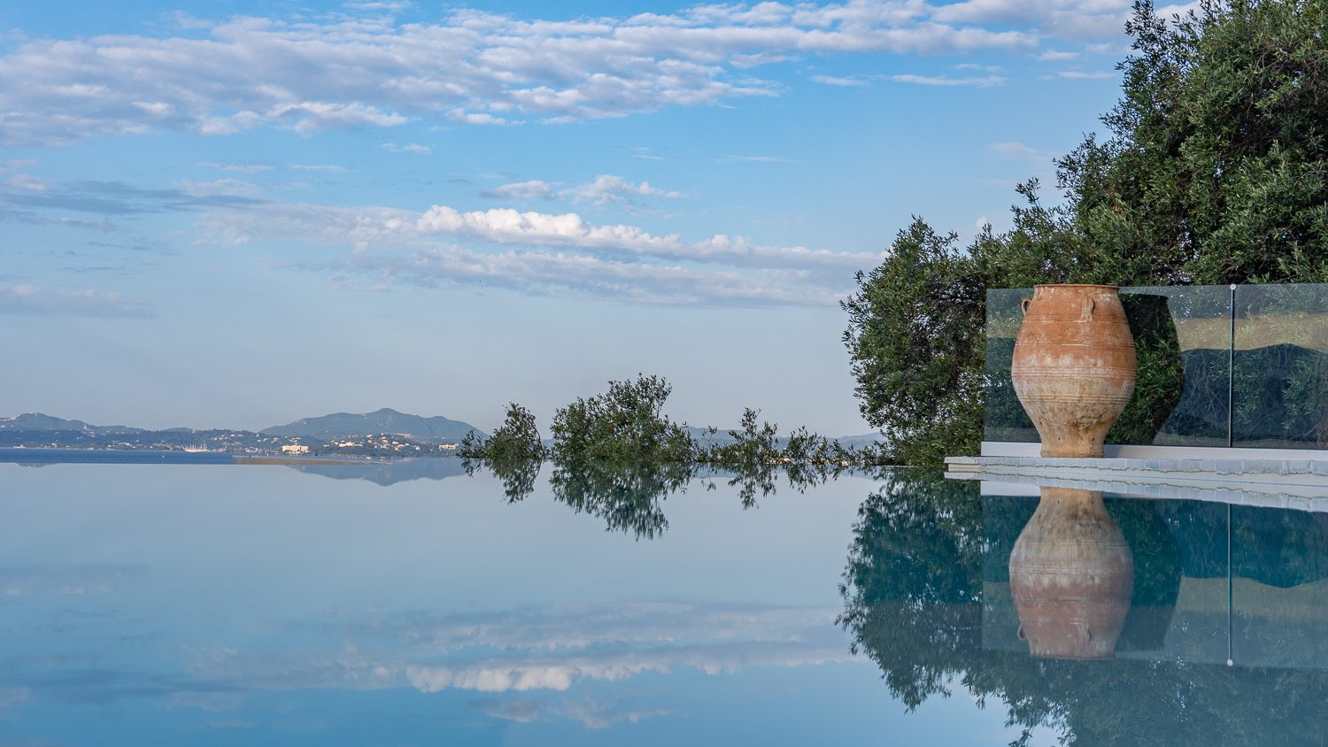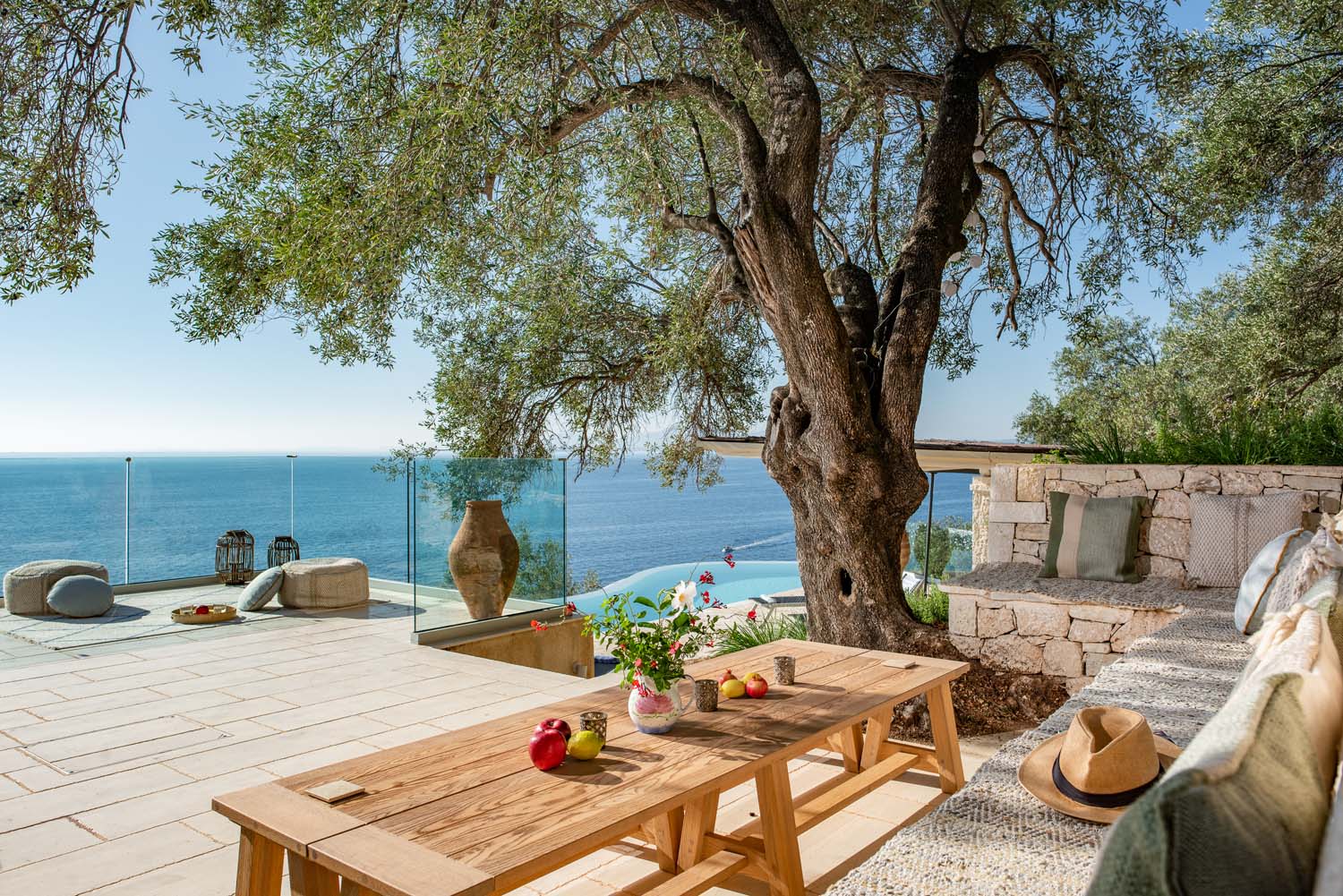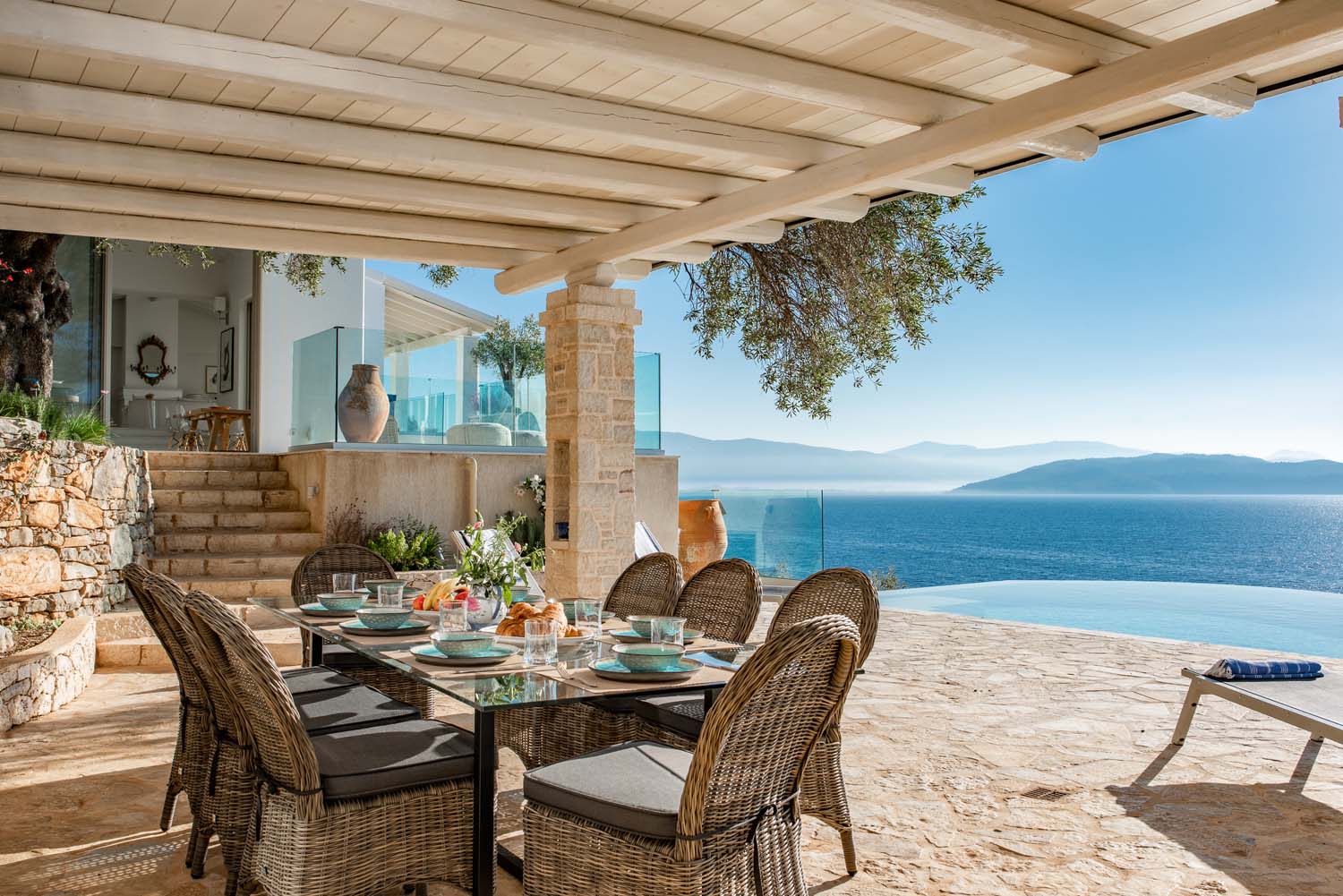 There's a covered dining area for 8, further casual eating space with stone seating built into the terraced wall and covered with plump cushions, well-positioned sun loungers, floor cushions and outdoor rugs for lounging. An eye-catching, sinuously curved, infinity pool appears to balance above the blue waters below and merge with the horizon.