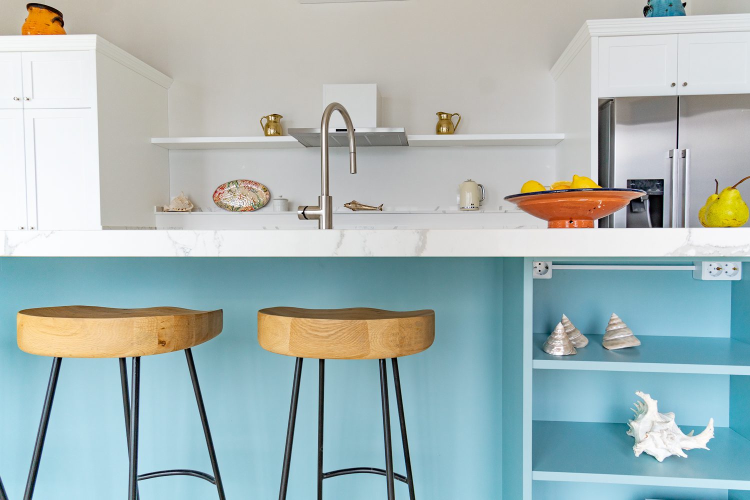 The airy open-plan living-dining room and eat-in kitchen open onto a terrace. The ground-floor master bedroom also has a private terrace, and the three bedrooms on the lower level are accessed externally.