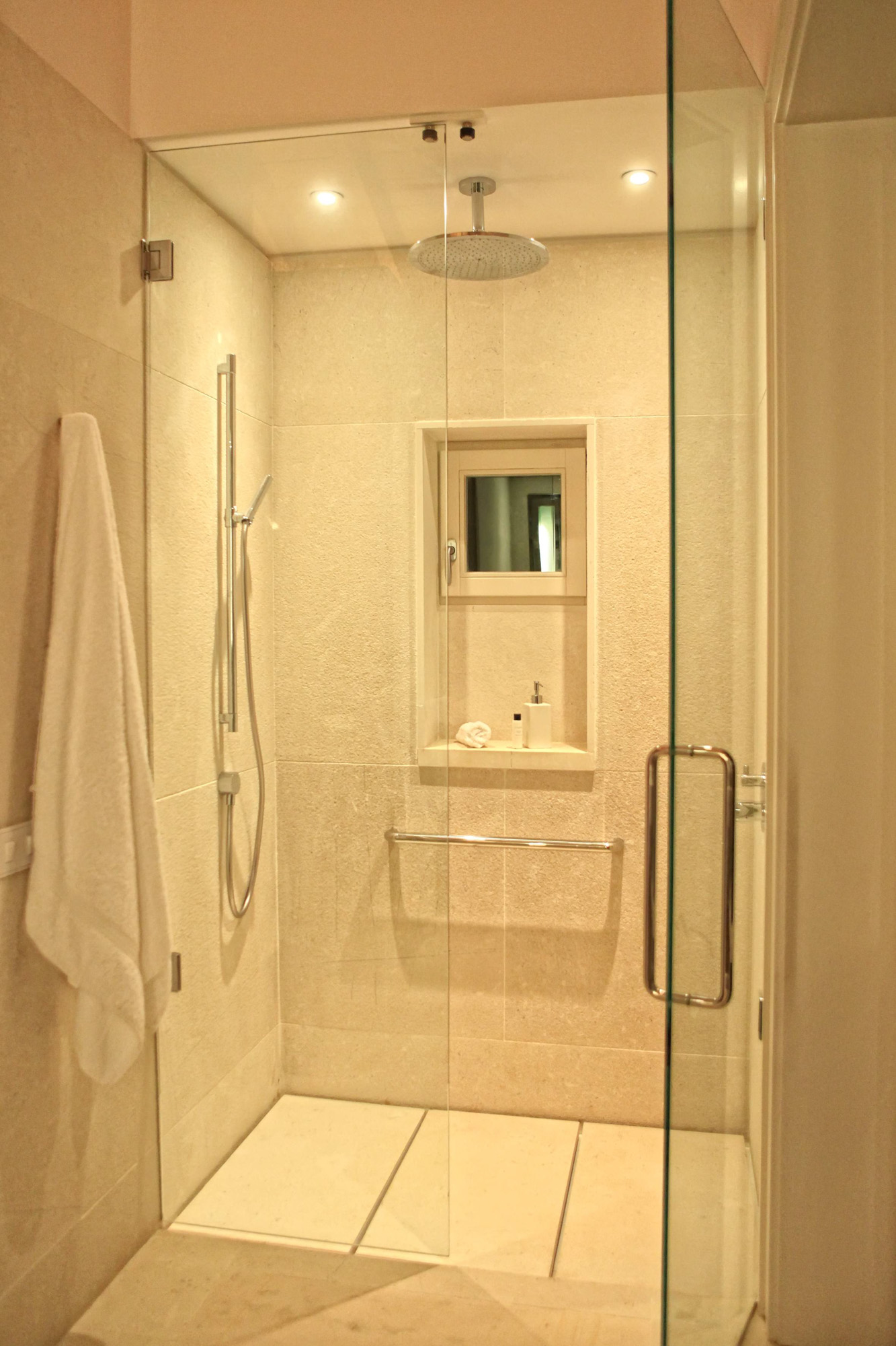 The living and dining areas have high ceilings, big windows and great views. There is plenty of comfortable seating, a dining table seating eight and doors leading onto a balcony overlooking the sea with seating and shade. There is also a fully equipped gym with machines and free weights.