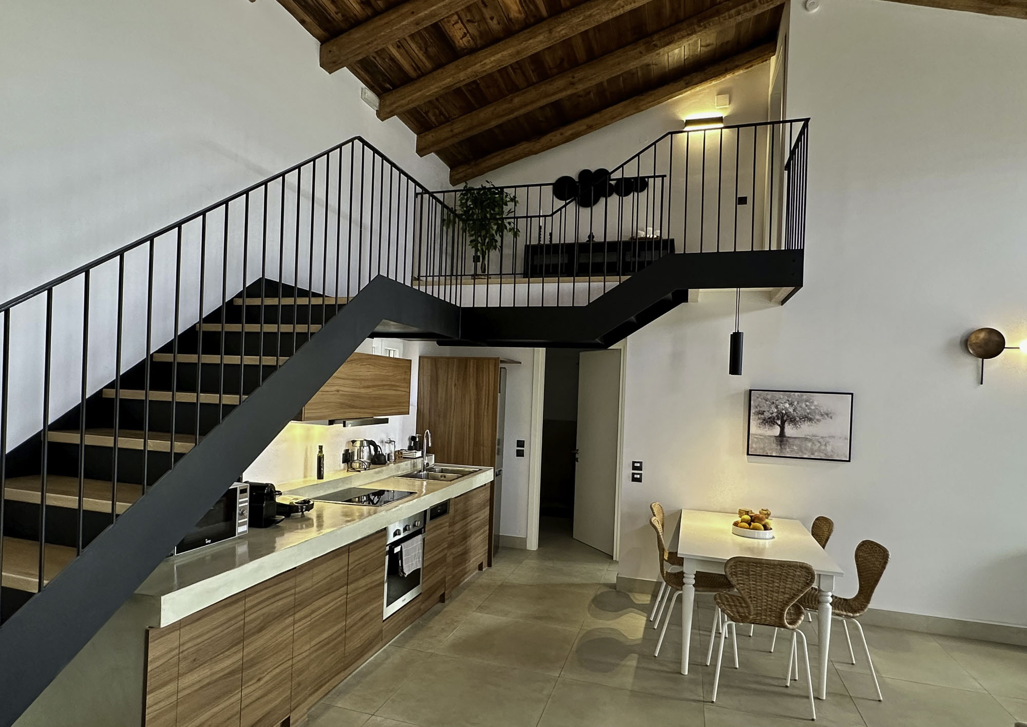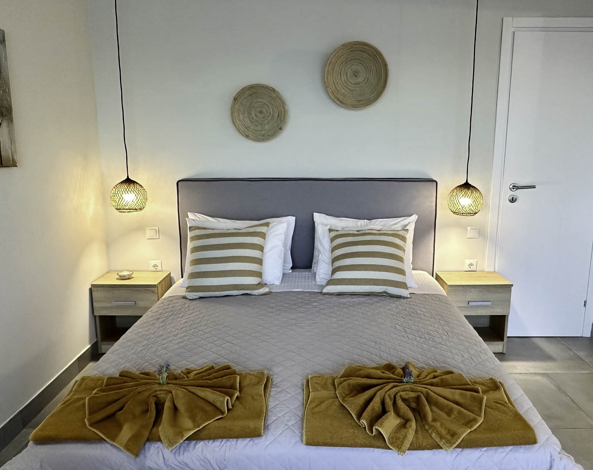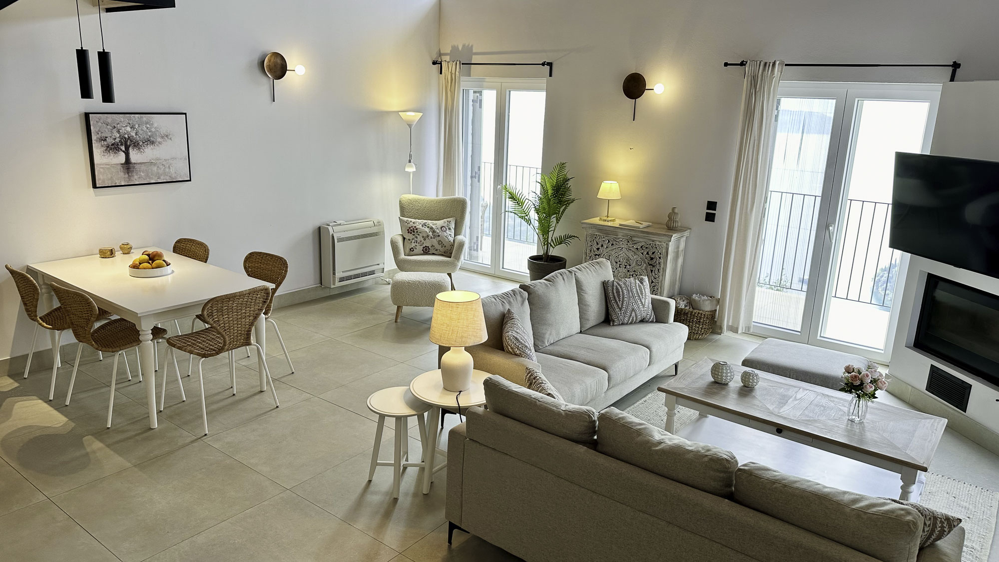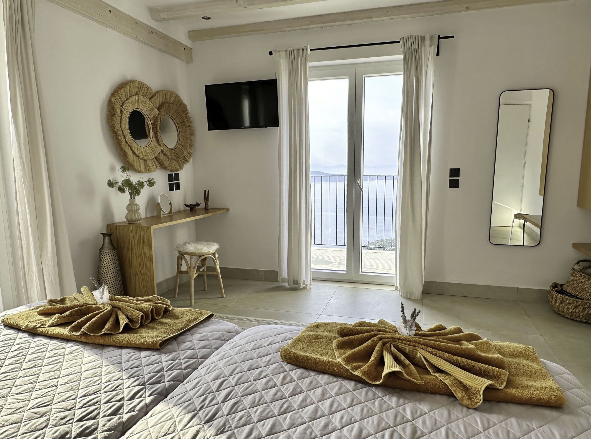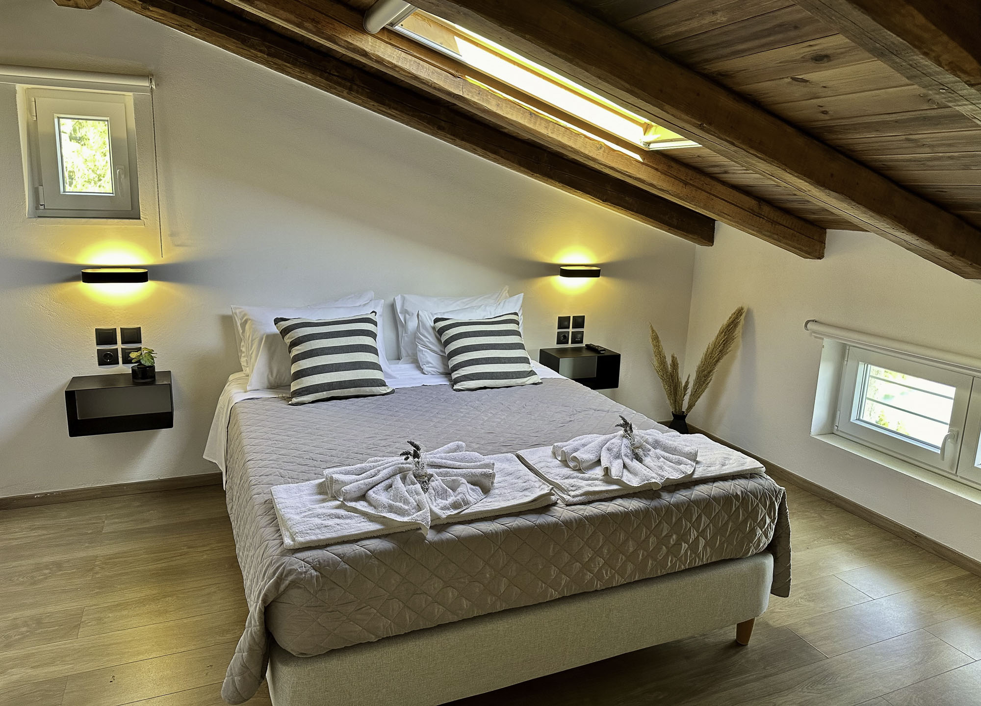 The interiors feature natural wood, rattan, neutral-coloured fabrics and modern furniture. The ground floor open-plan living area has high ceilings with exposed wooden beams, large sets of sliding doors opening to the terrace and framing the views, and big comfortable sofas. The ground-floor bedrooms have a spacious private balcony with seating and glorious sea views. A cast iron staircase leads from the main living area to a mezzanine level where theres a further en suite bedroom.