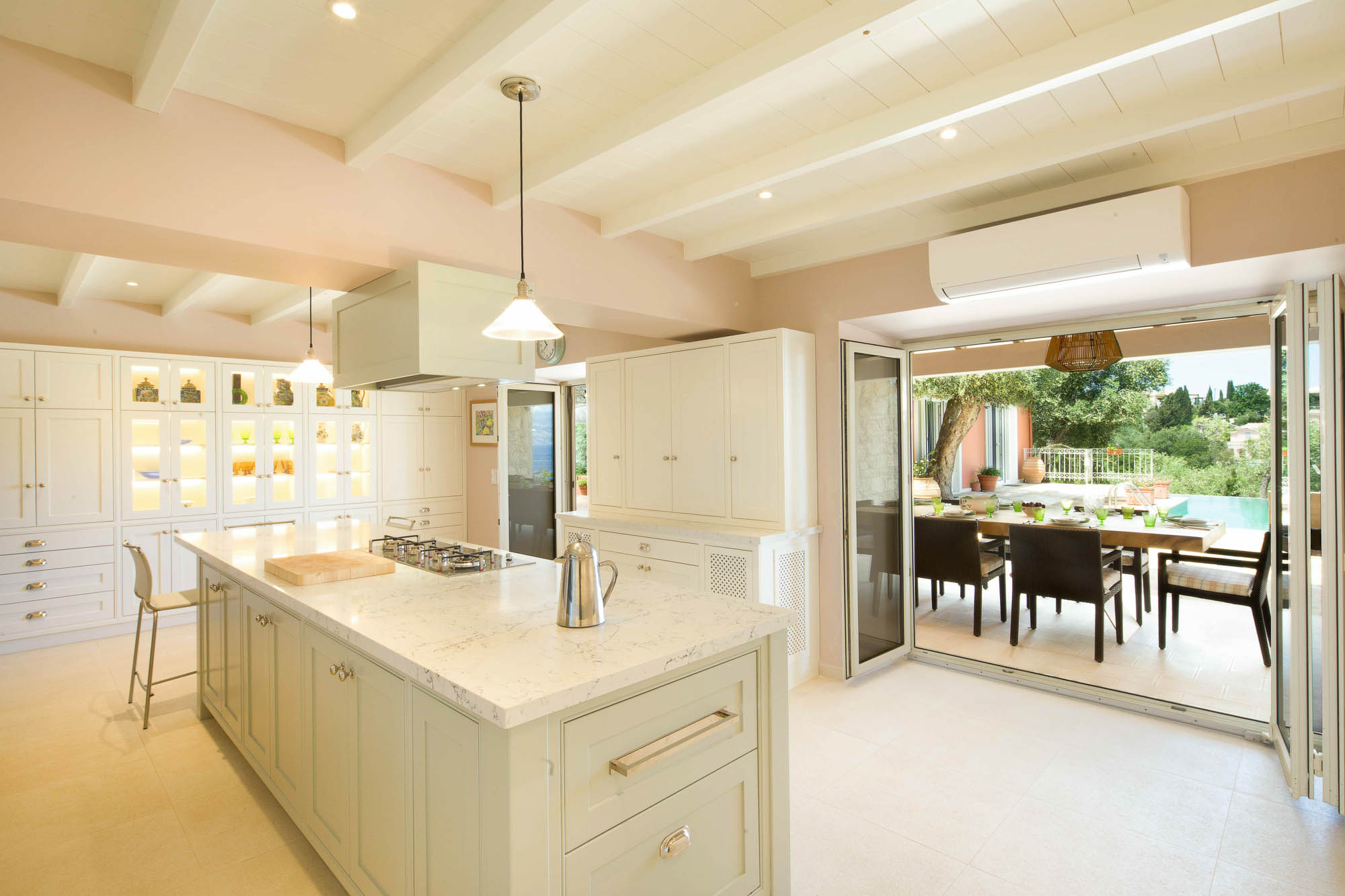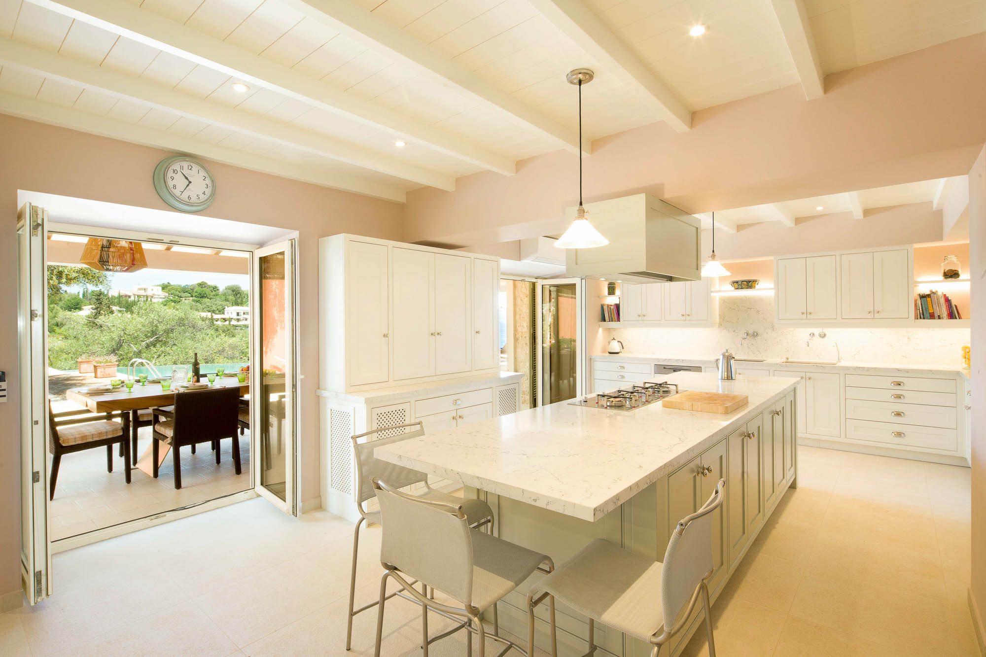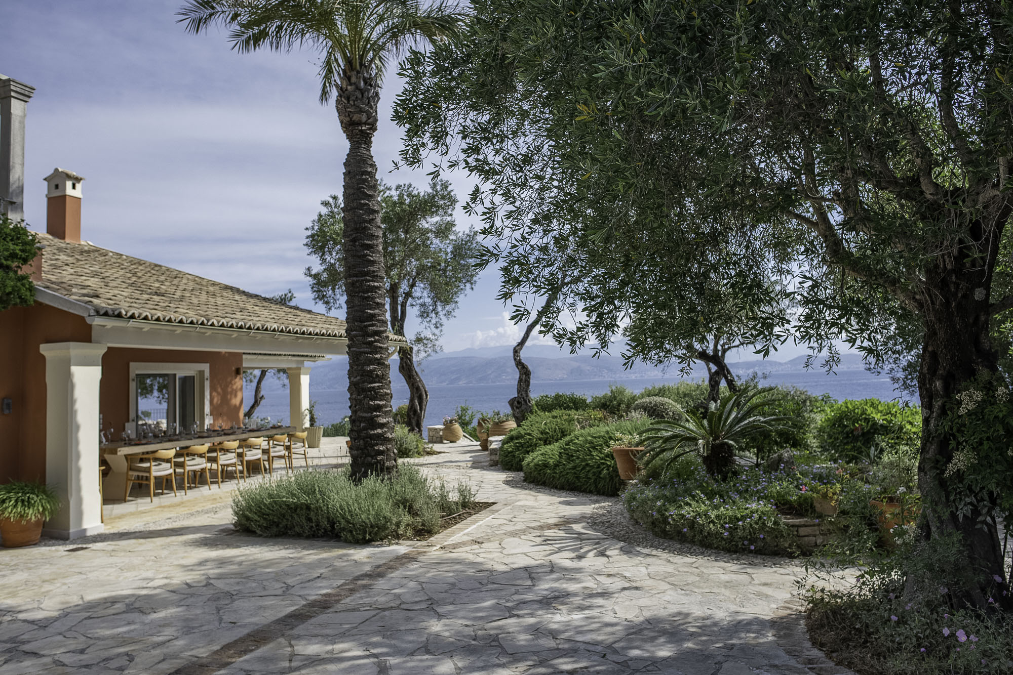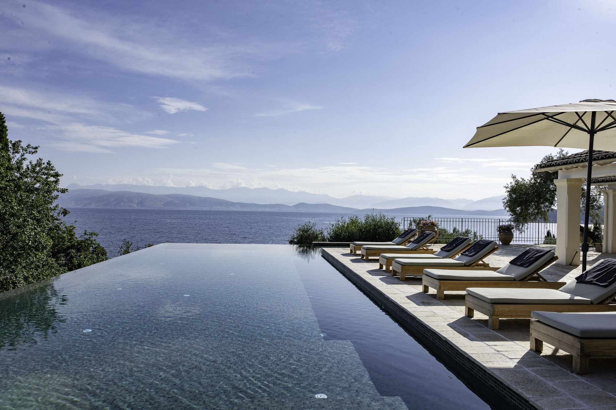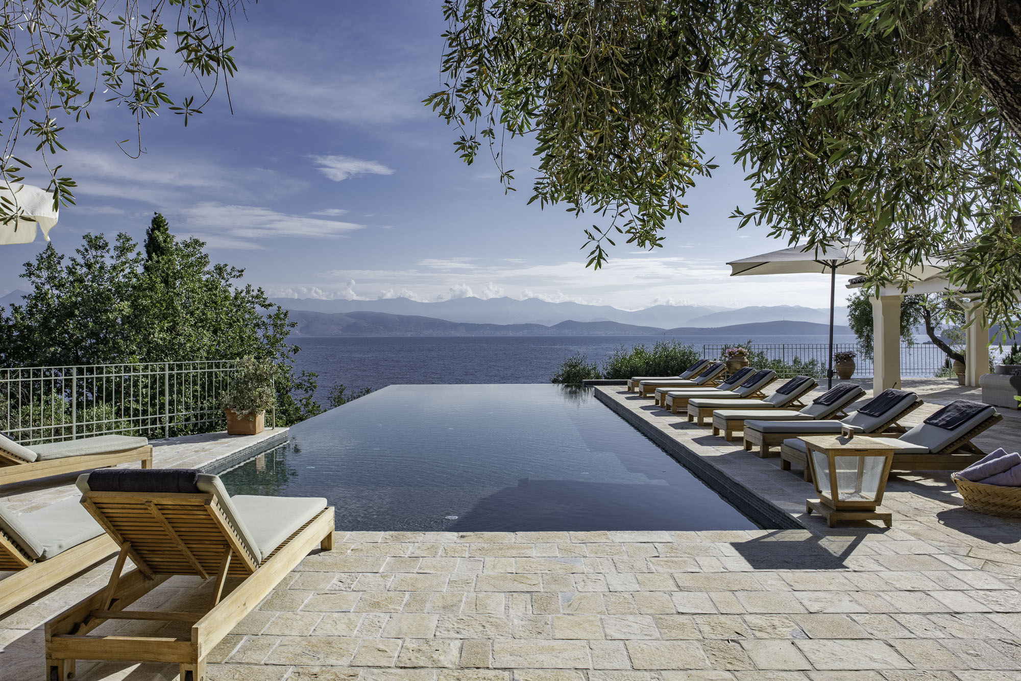 A pergola-covered outdoor kitchen and dining room feature a wood-burning pizza oven and a long dining table for 16. Poolside, another pergola shades a table seating 12 and a gas barbecue. There are numerous places to sit and enjoy the different views and a beautiful infinity pool with views out across the sea to the mainland beyond. From the garden, it’s a short walk down a path to the sea or set off through the olive groves to Kassiopi.
