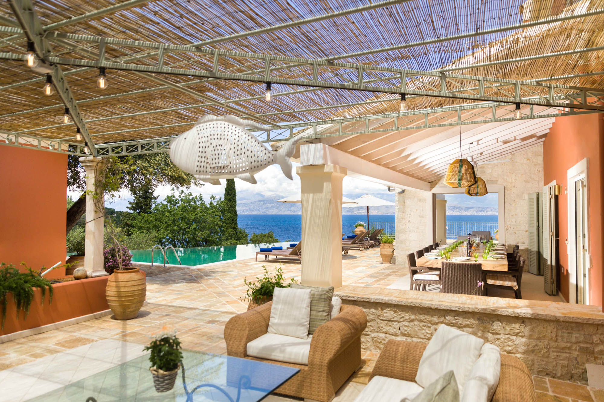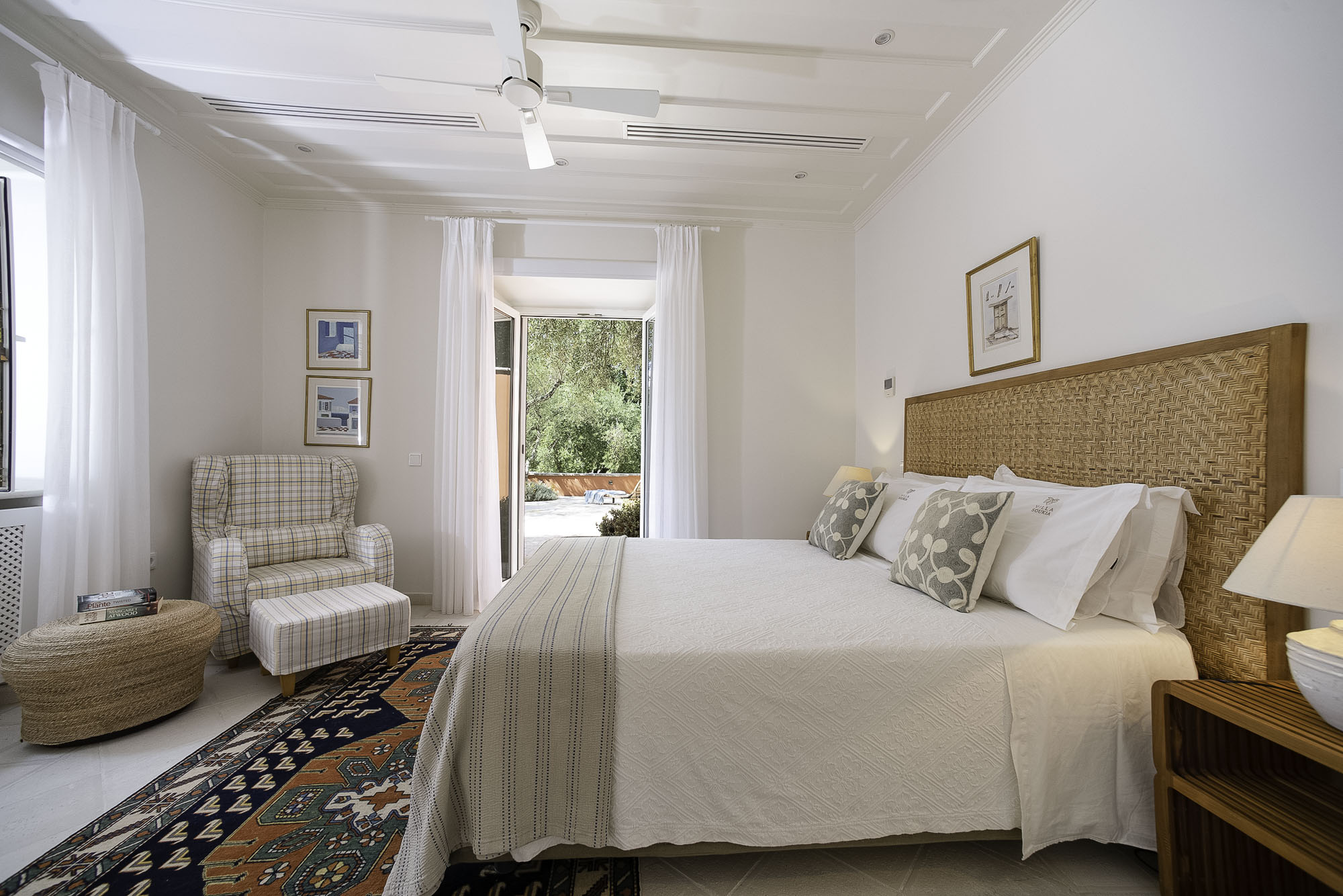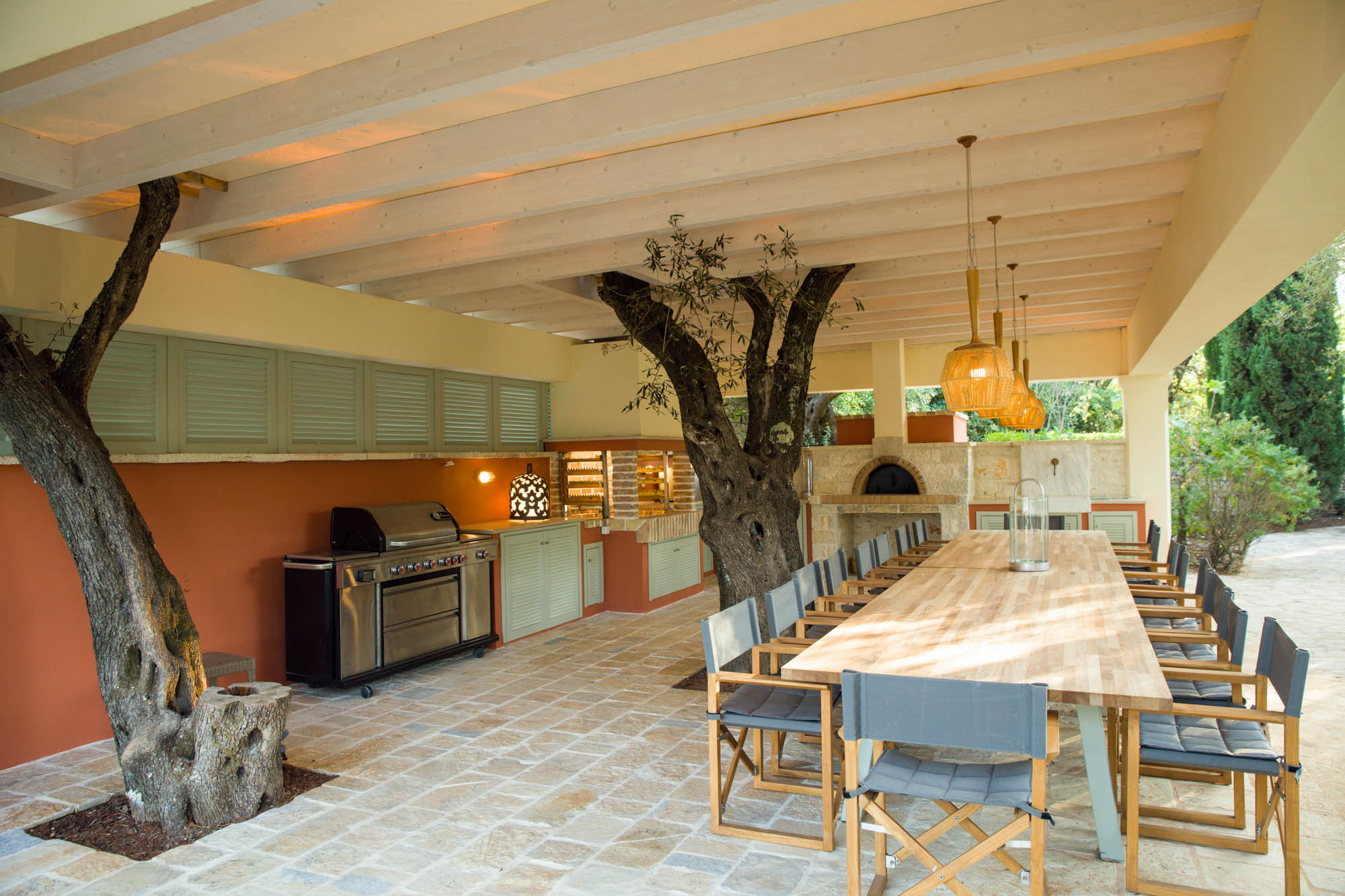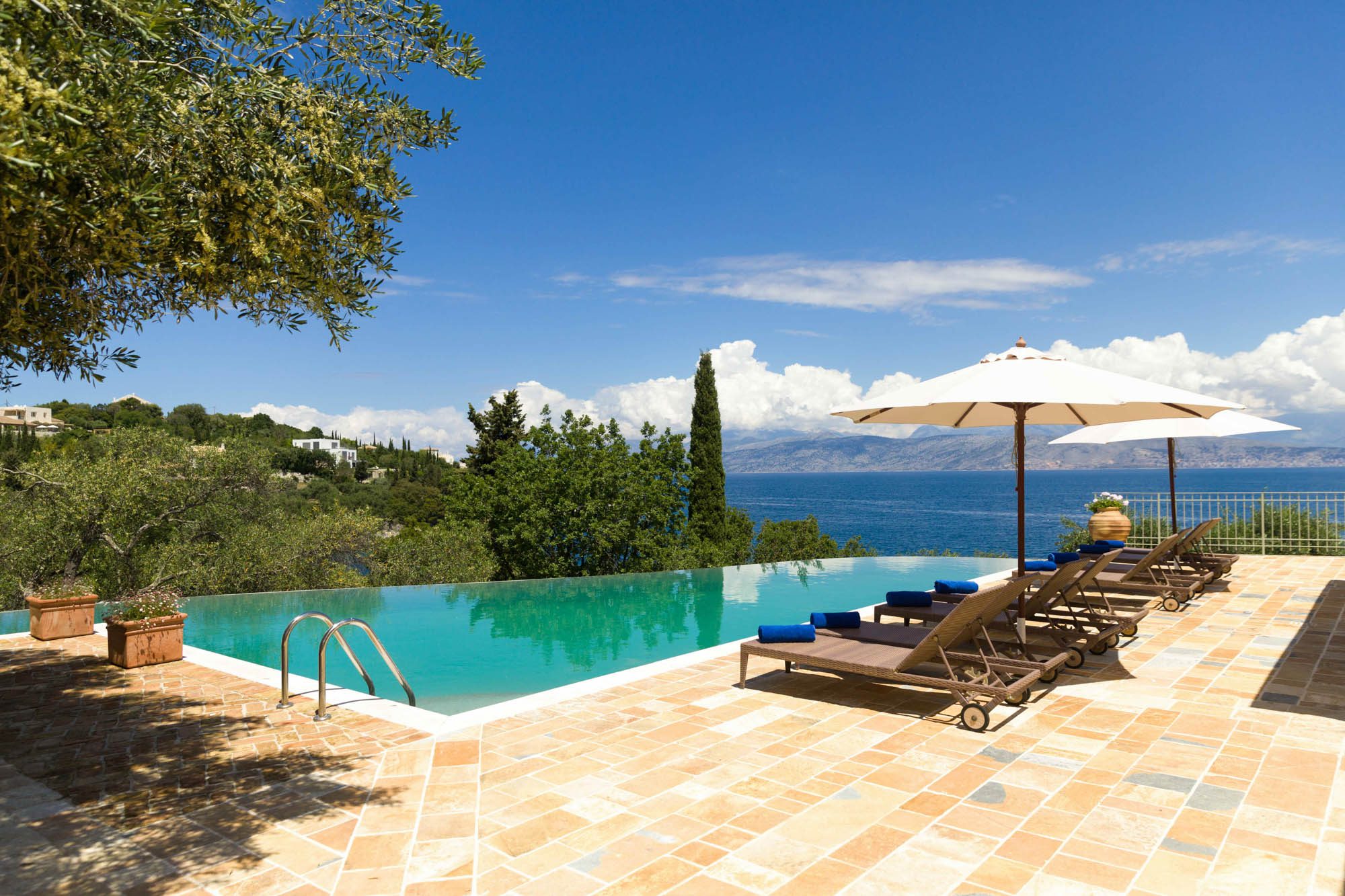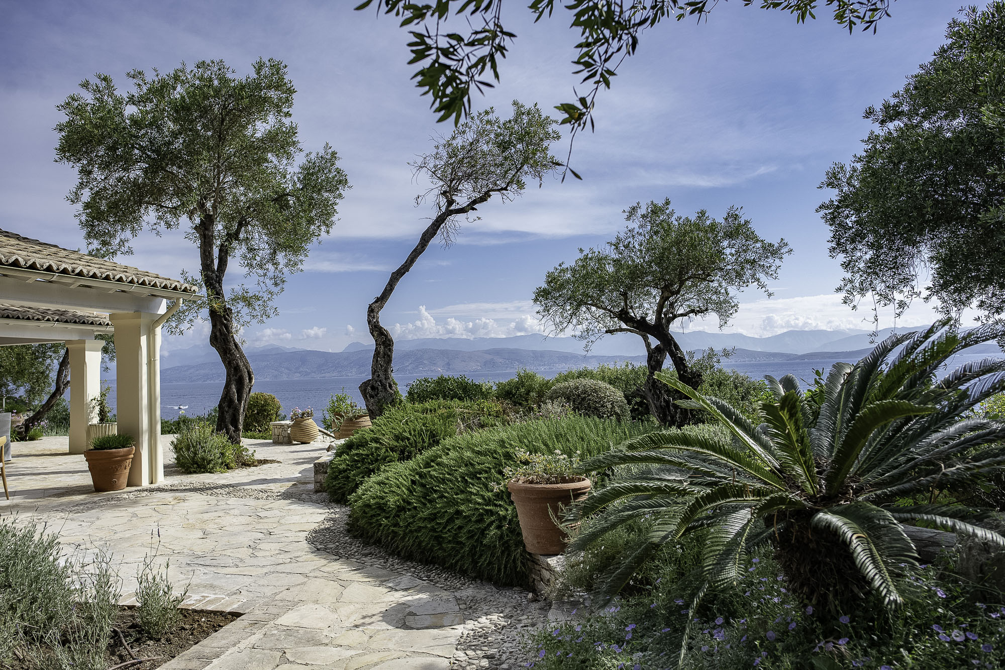 A pergola-covered outdoor kitchen and dining room feature a wood-burning pizza oven and a long dining table for 16. Poolside, another pergola shades a table seating 12 and a gas barbecue. There are numerous places to sit and enjoy the different views and a beautiful infinity pool with views out across the sea to the mainland beyond. From the garden, it’s a short walk down a path to the sea or set off through the olive groves to Kassiopi.