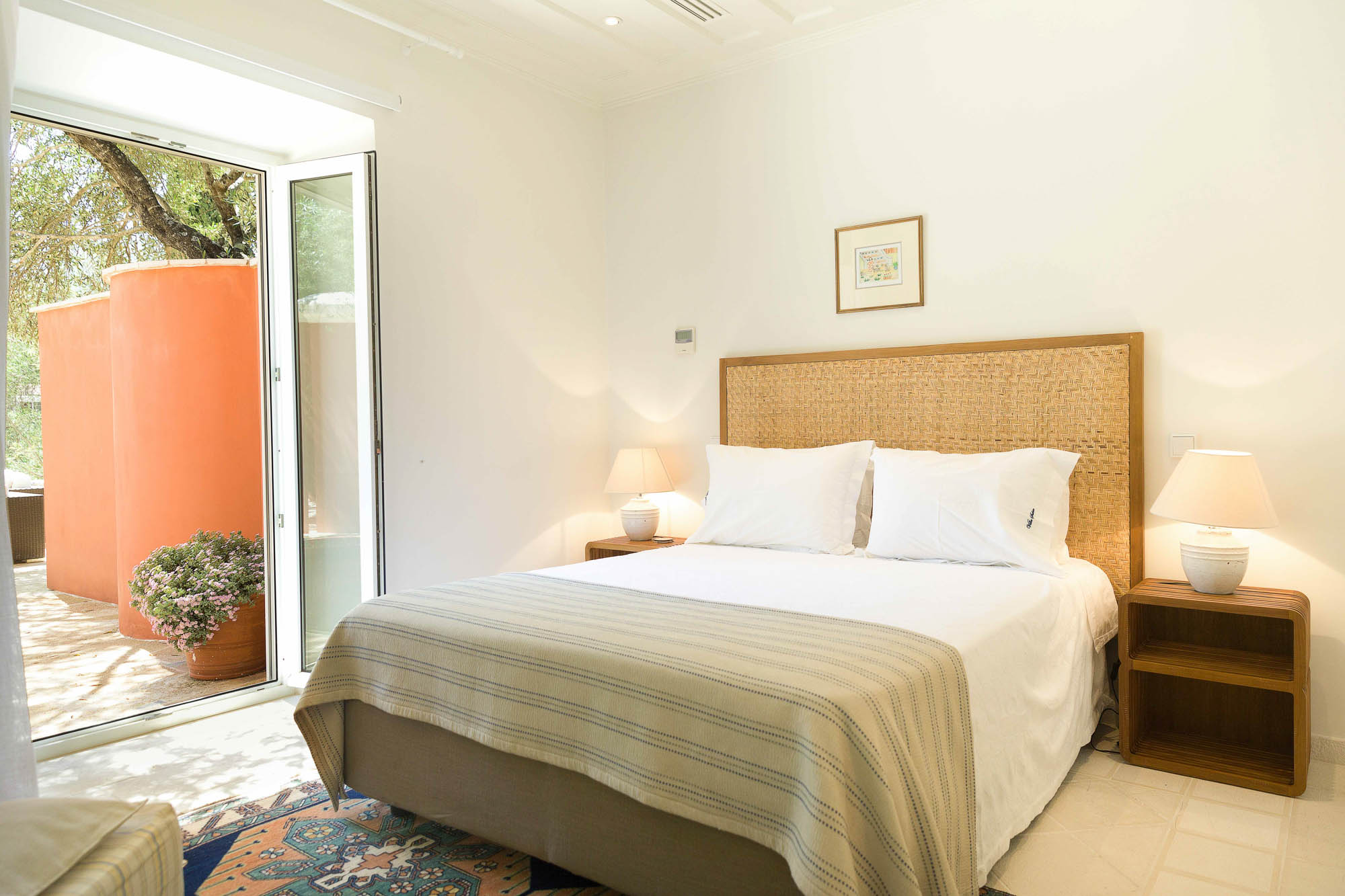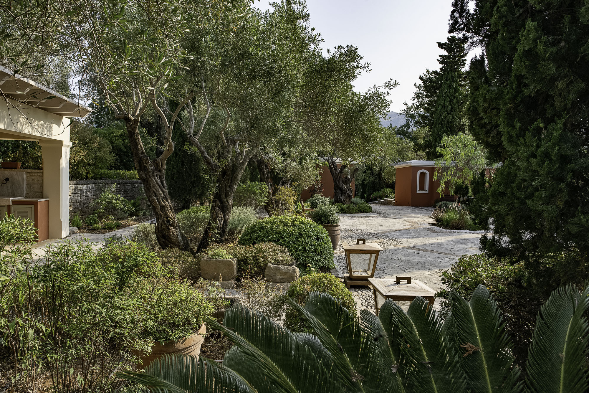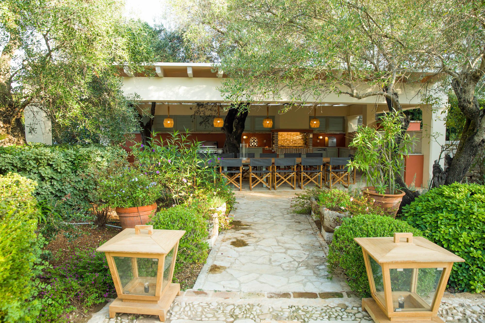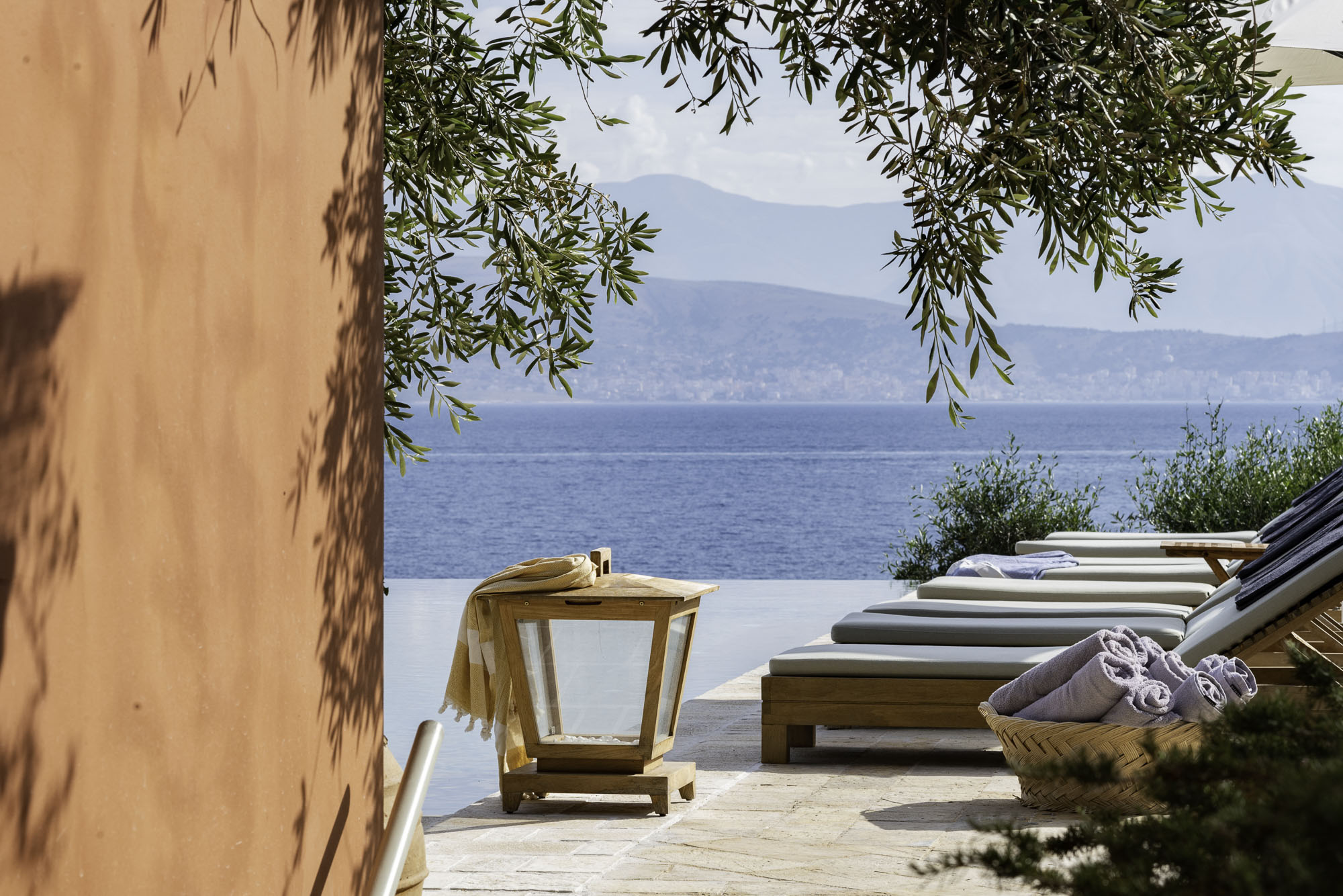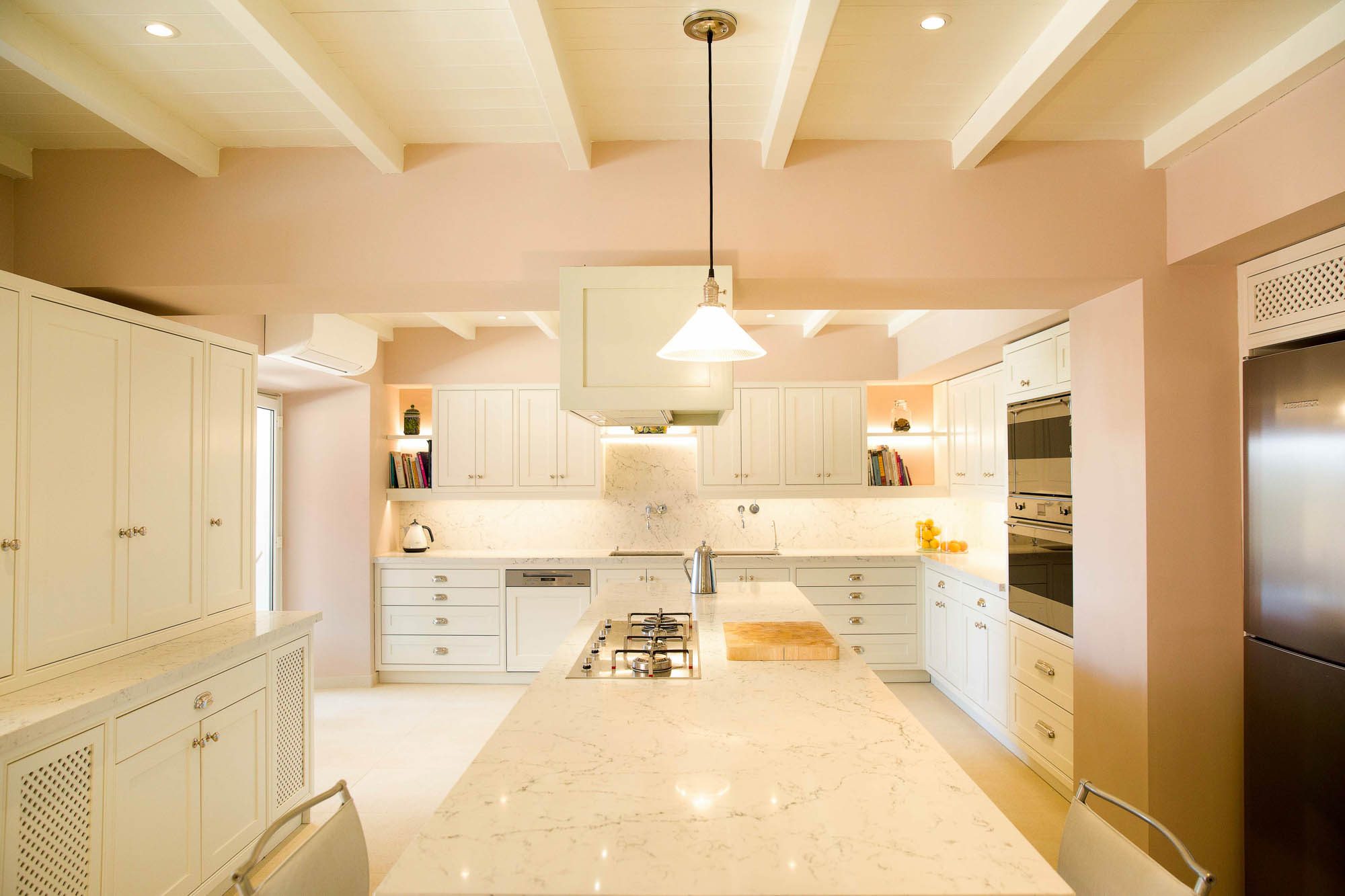 A pergola-covered outdoor kitchen and dining room feature a wood-burning pizza oven and a long dining table for 16. Poolside, another pergola shades a table seating 12 and a gas barbecue. There are numerous places to sit and enjoy the different views and a beautiful infinity pool with views out across the sea to the mainland beyond. From the garden, it’s a short walk down a path to the sea or set off through the olive groves to Kassiopi.