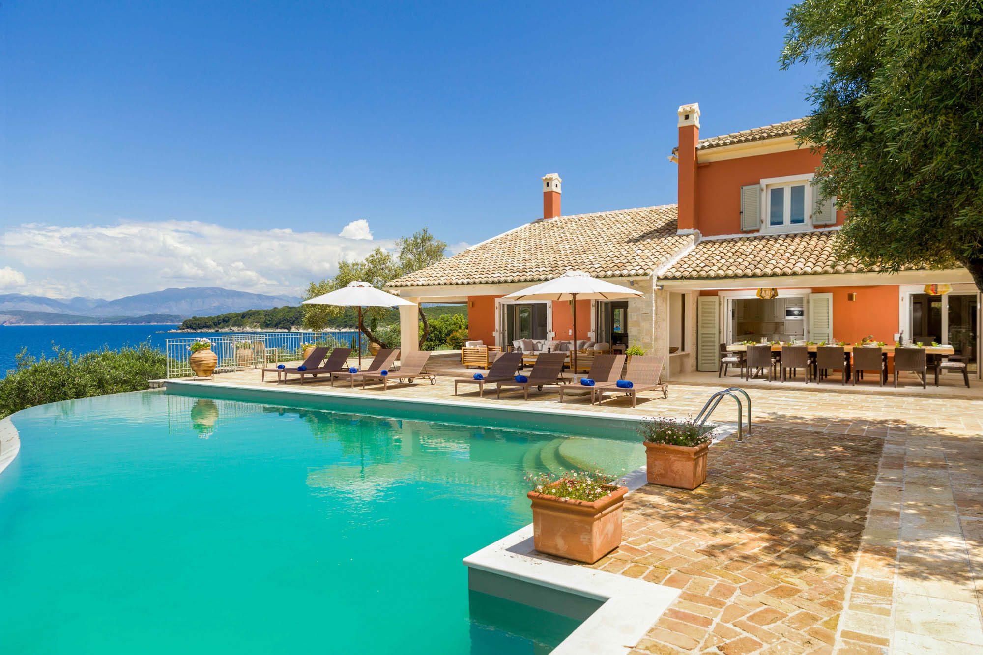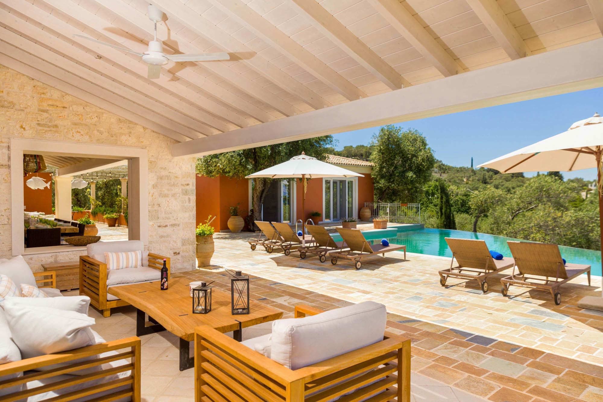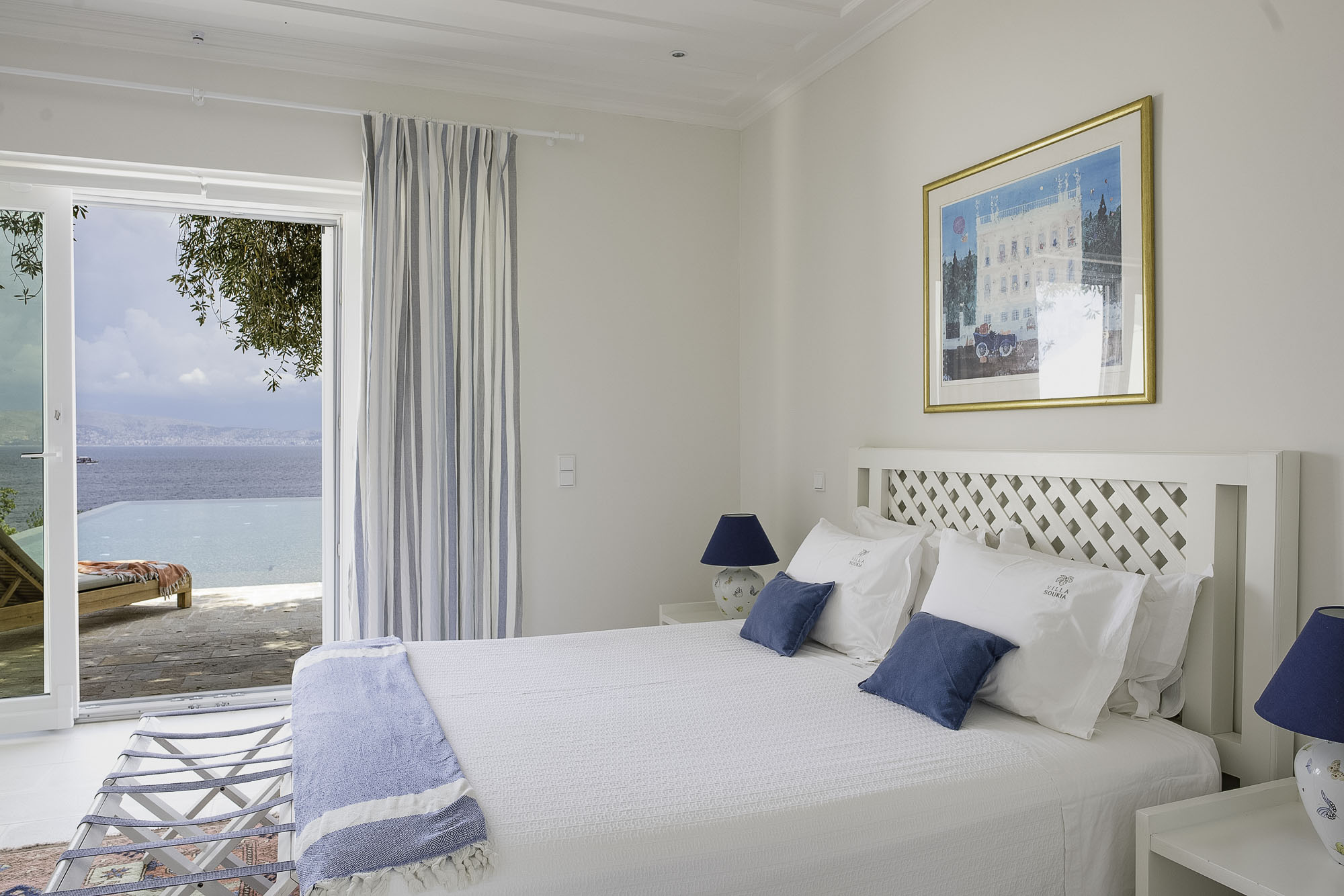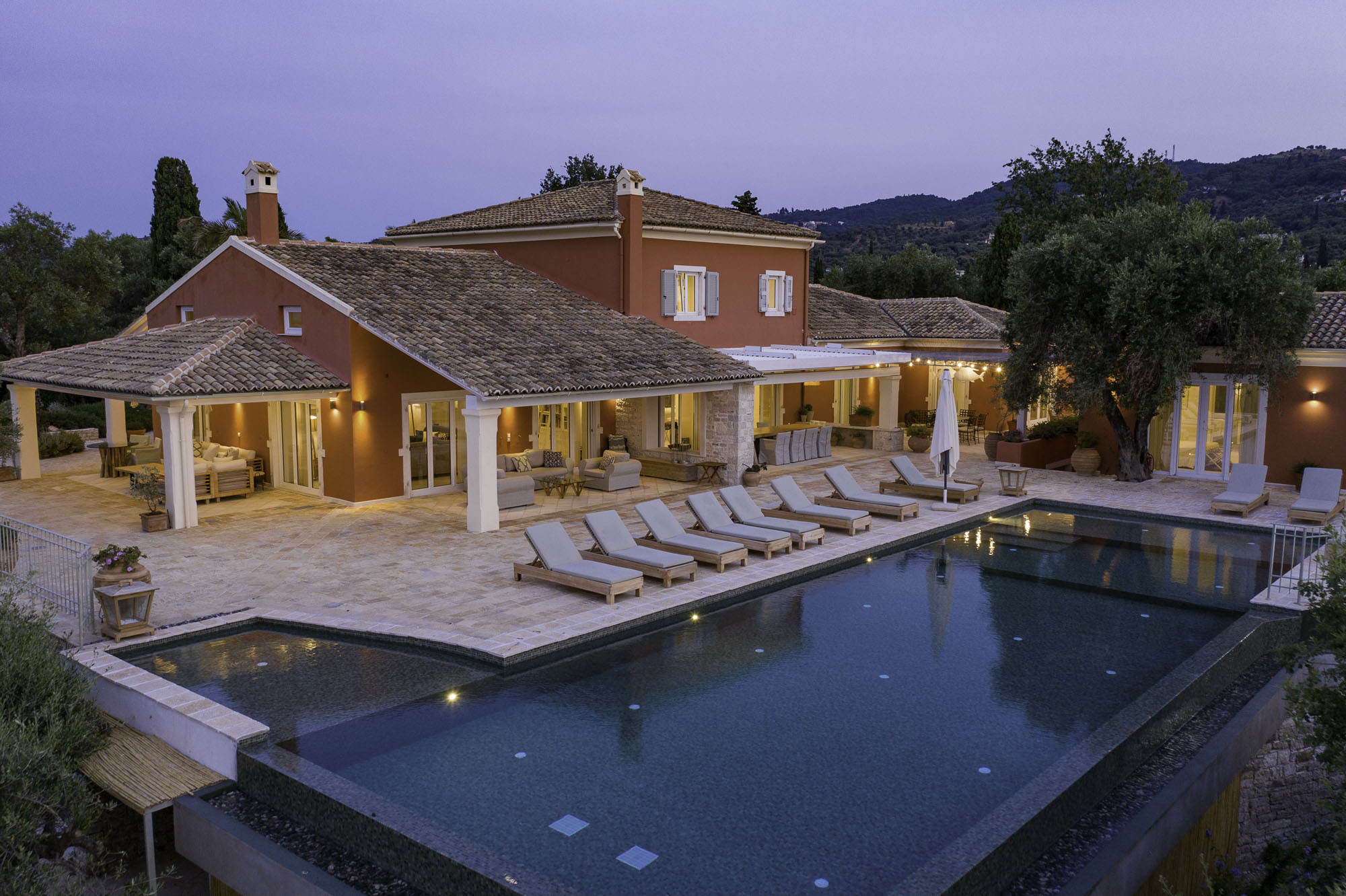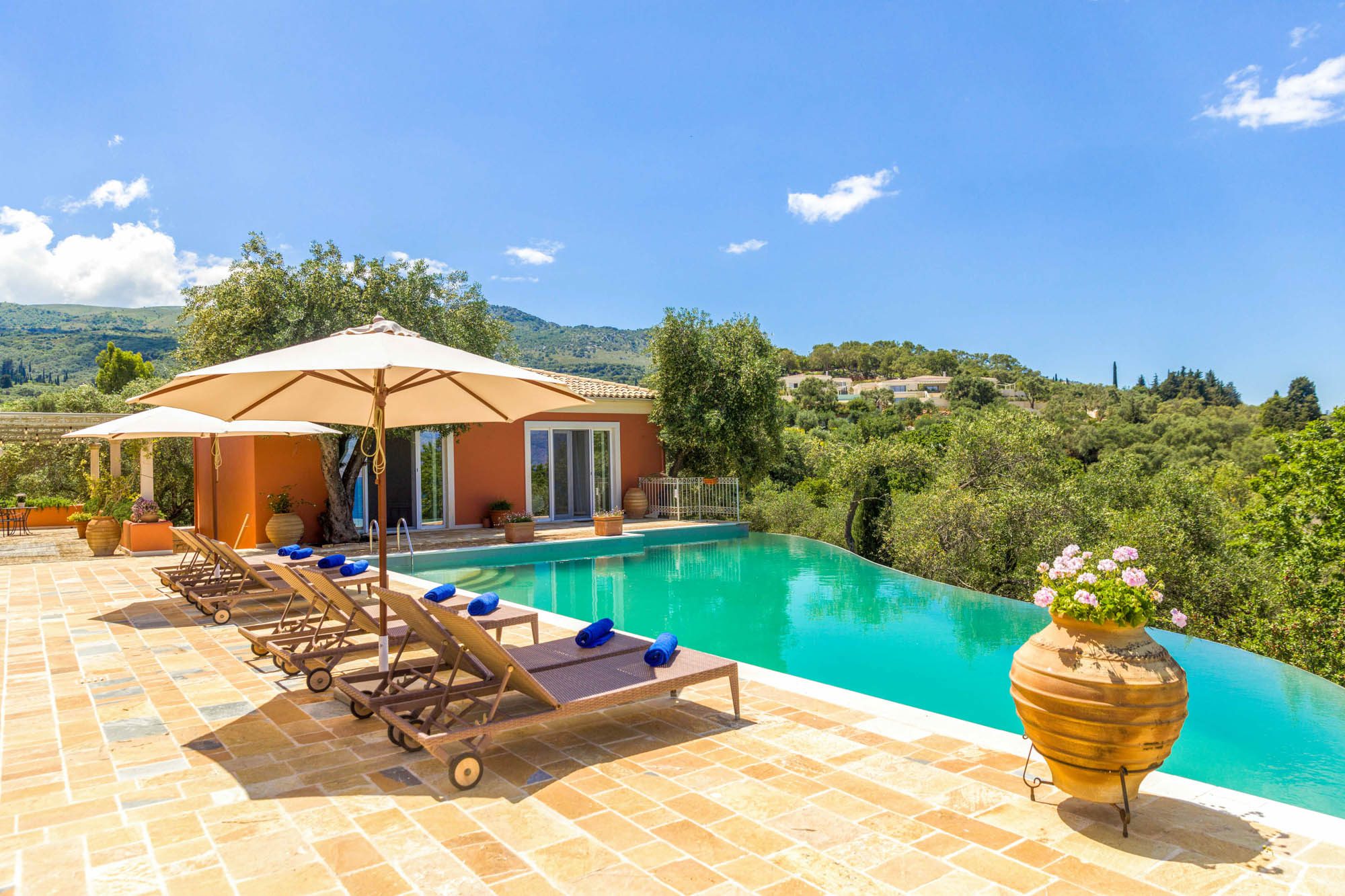 A pergola-covered outdoor kitchen and dining room feature a wood-burning pizza oven and a long dining table for 16. Poolside, another pergola shades a table seating 12 and a gas barbecue. There are numerous places to sit and enjoy the different views and a beautiful infinity pool with views out across the sea to the mainland beyond. From the garden, it’s a short walk down a path to the sea or set off through the olive groves to Kassiopi.